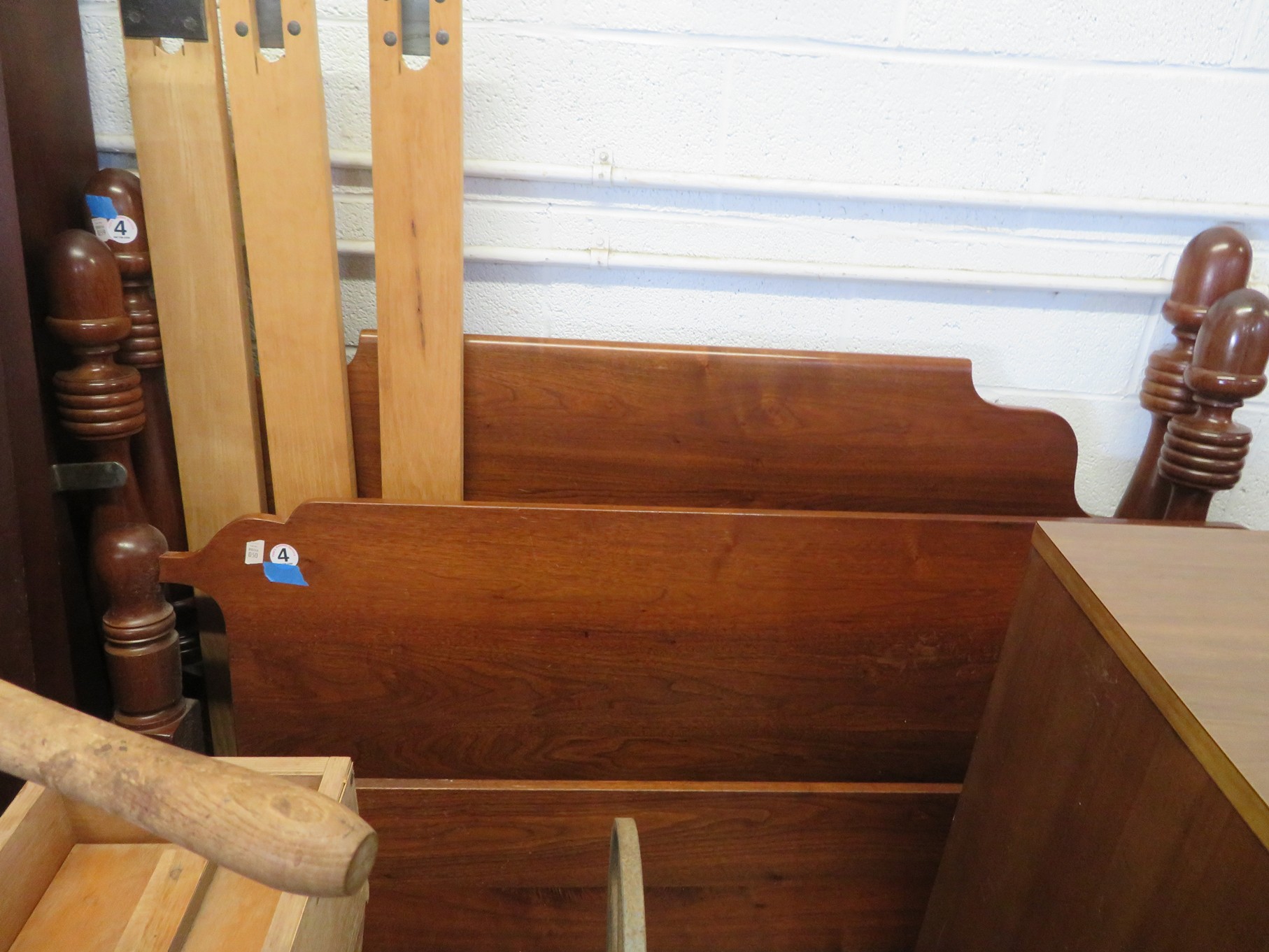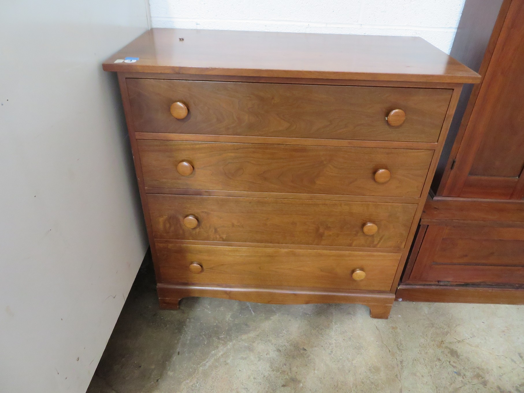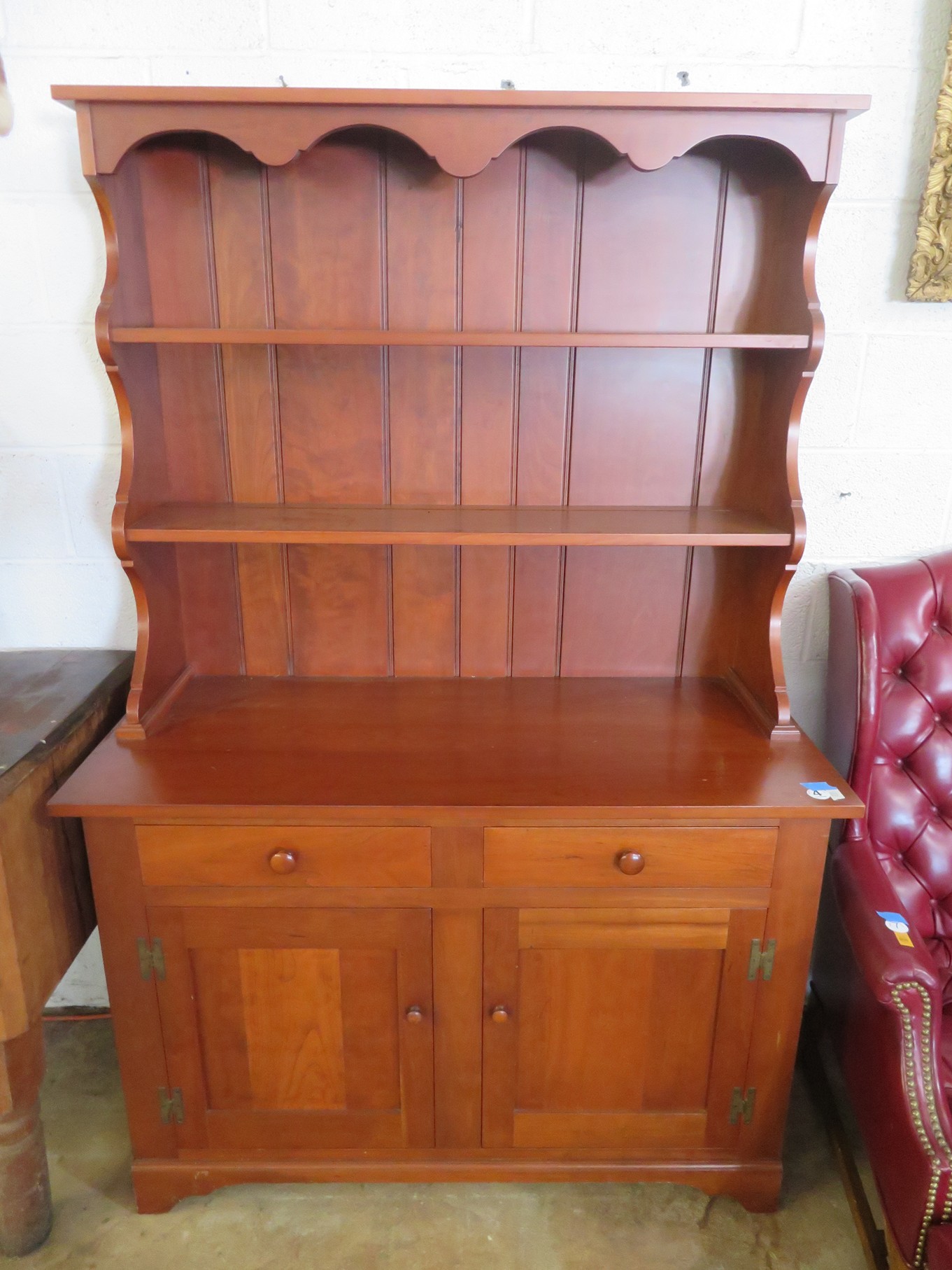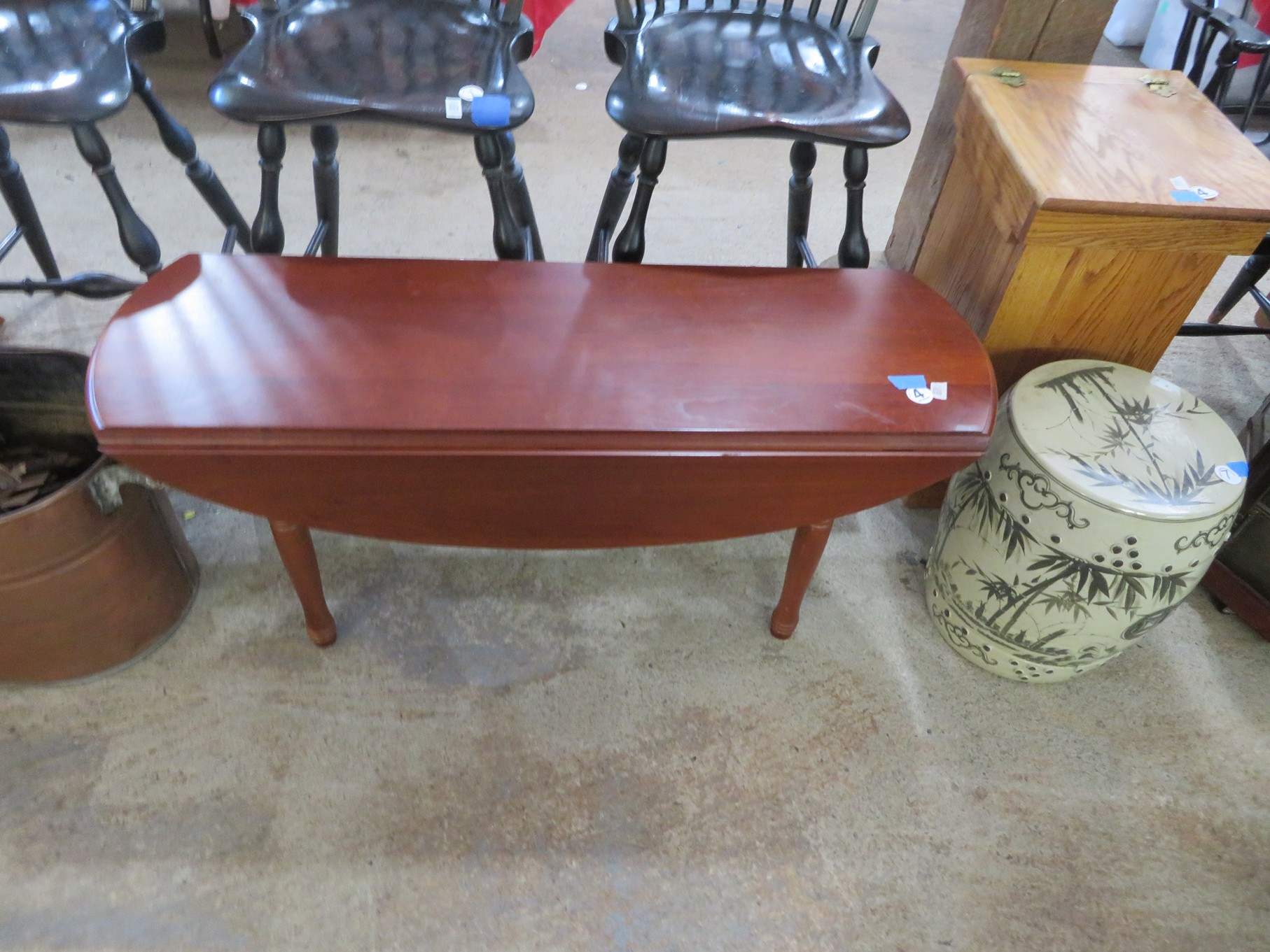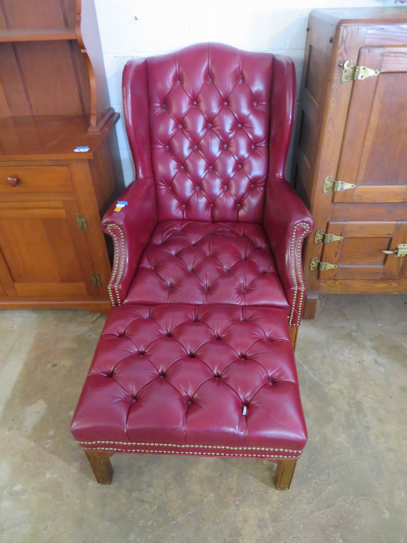 Tufted red leather chair with matching ottoman & nail-head trim; Wine storage unit; 2 drawer side table; Mid-century 4 drawer dresser; Drop front secretary; Nice pair of deacon’s benches; Chest of drawers; Windsor chair; Oriental decorated box; Bar seats; Drop side coffee table; Ceramic garden seat; Quilt rack; Metal banded trunk; Brass floor candle holders; Bar stools; Night stand;