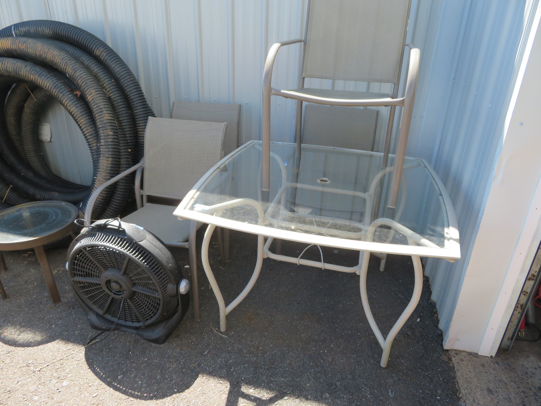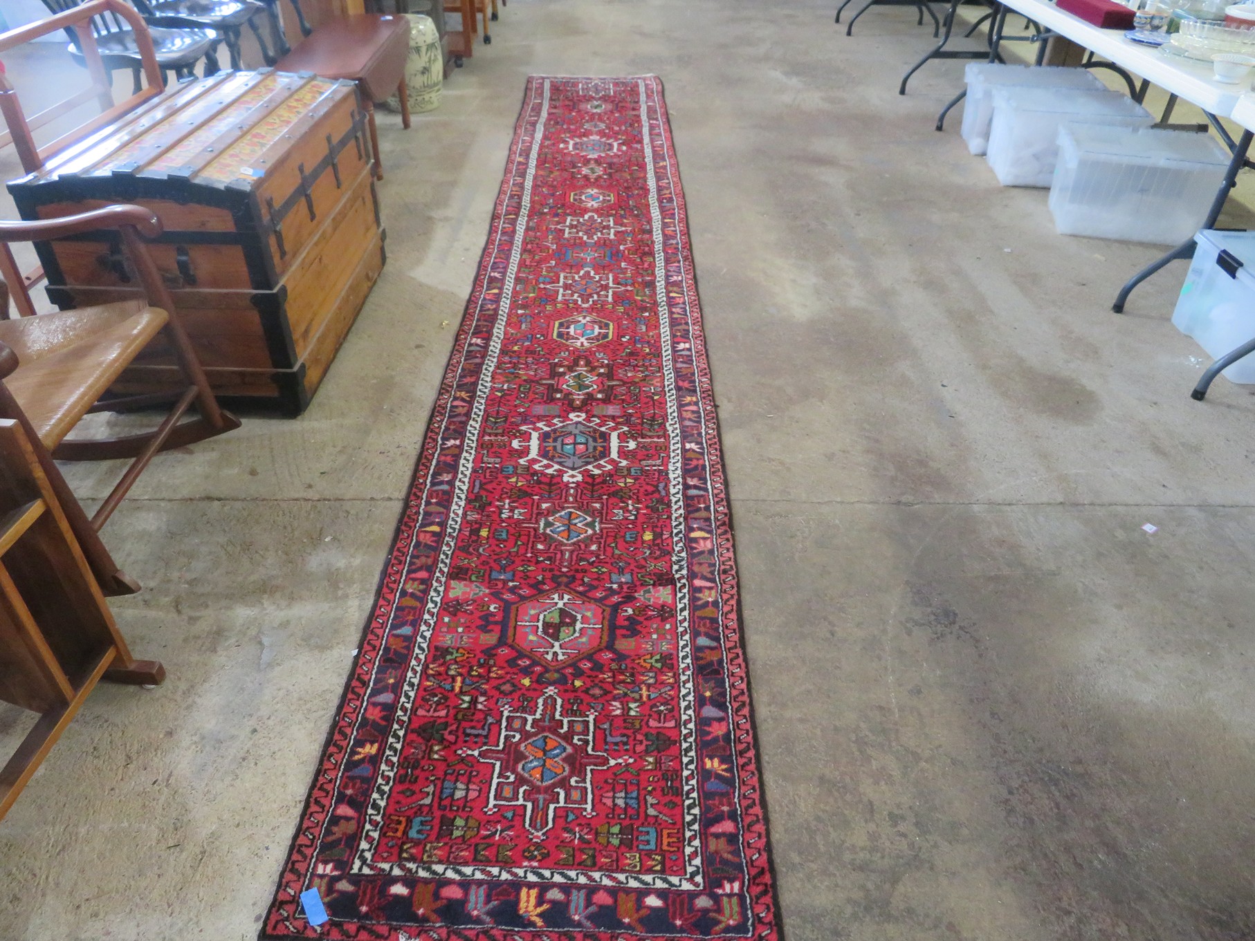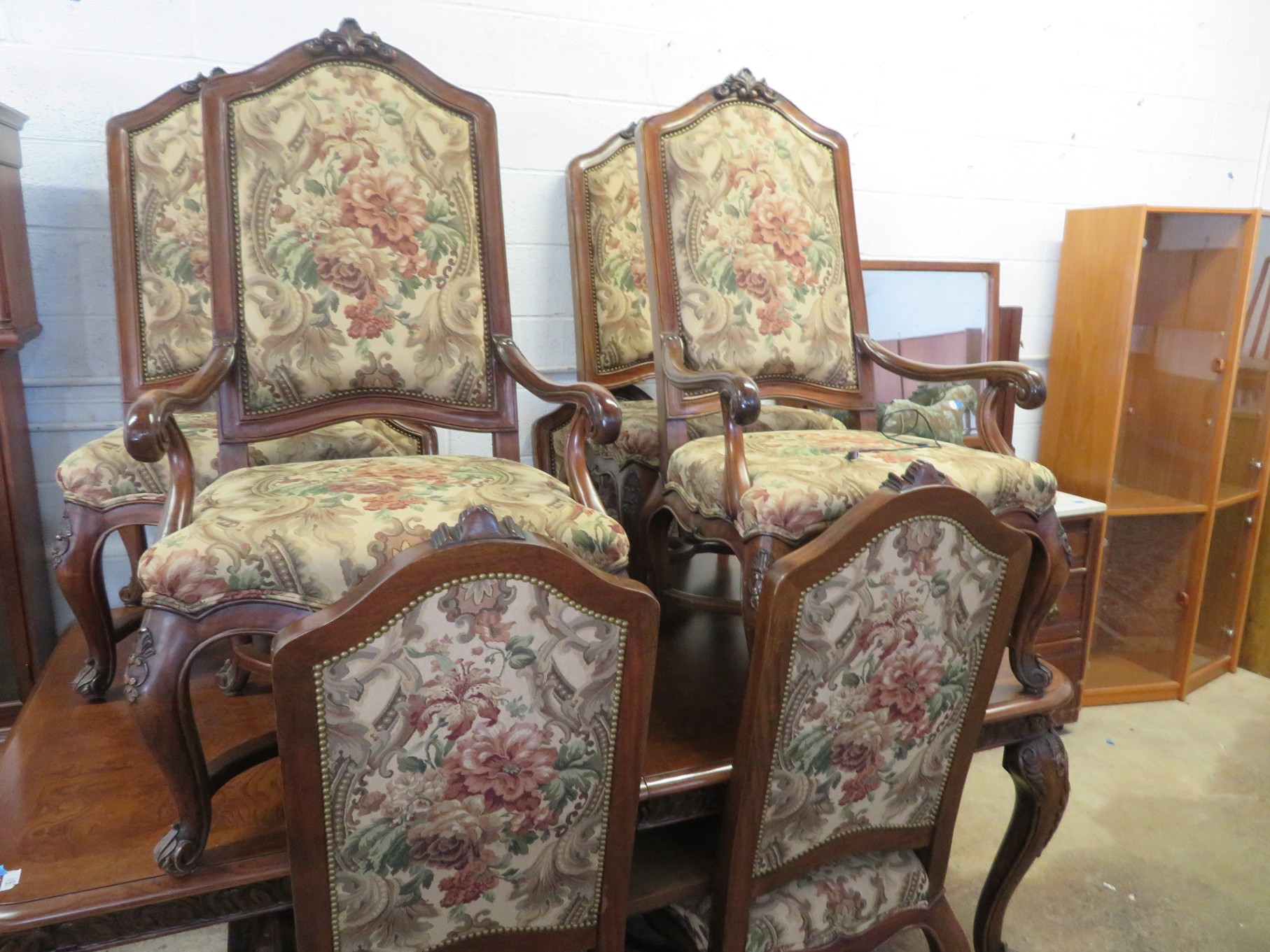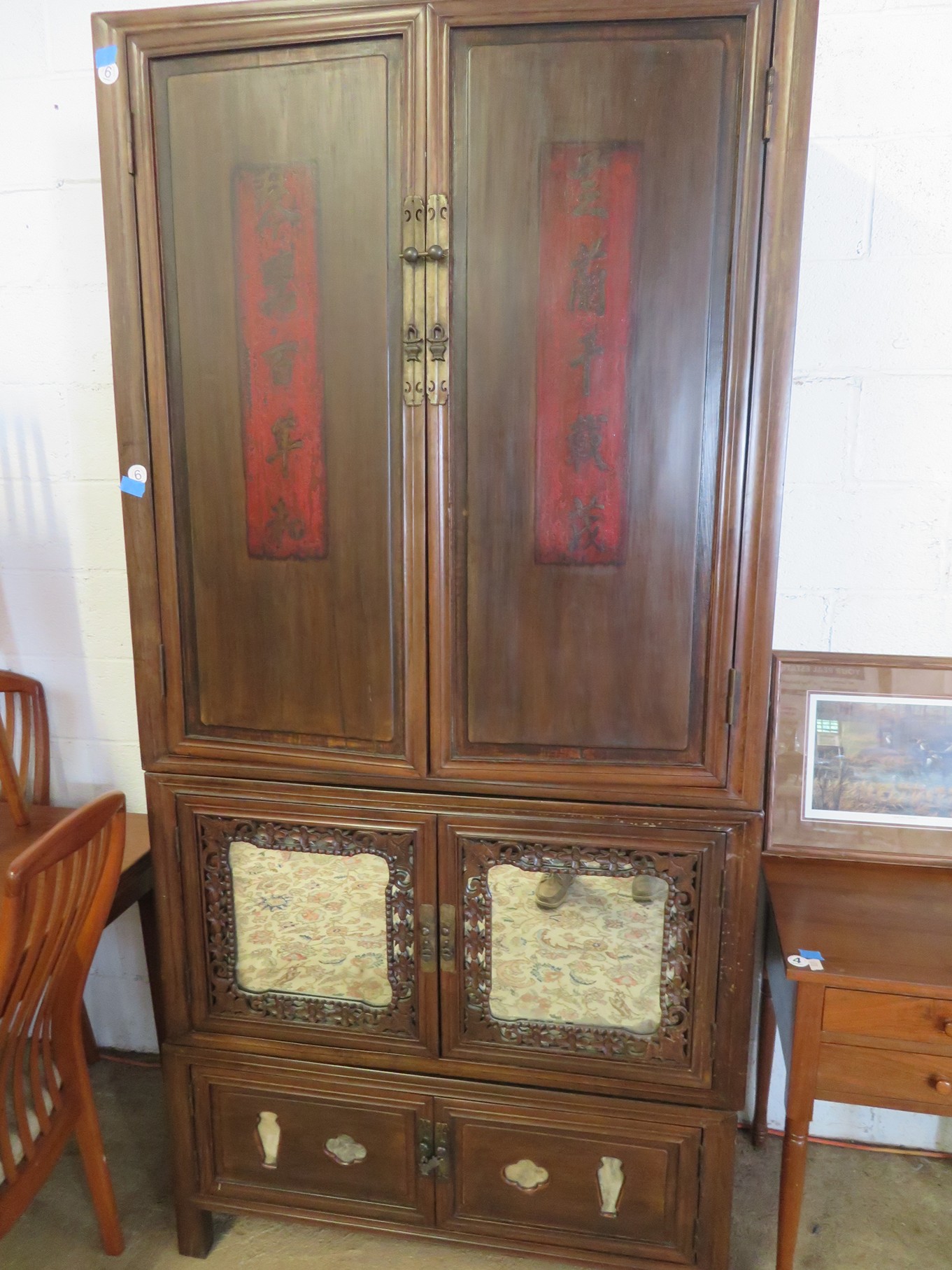 Oriental painted wardrobe; Banded edge dining table with 8 padded chairs (2 arm); Grandfather clock with visible pendulum; Filigree folding room screen; Decorated enamel top kitchen table; Wooden table lamp; Wall mirror in fancy frame; Decorator accents; Metal lunch carrier with multiple sections; Marble top fern stand; Washstand with towel bar; Leaded glass shade lamp with chrome base; Pair of lamps with decorations; Great Long Oriental runner and more!