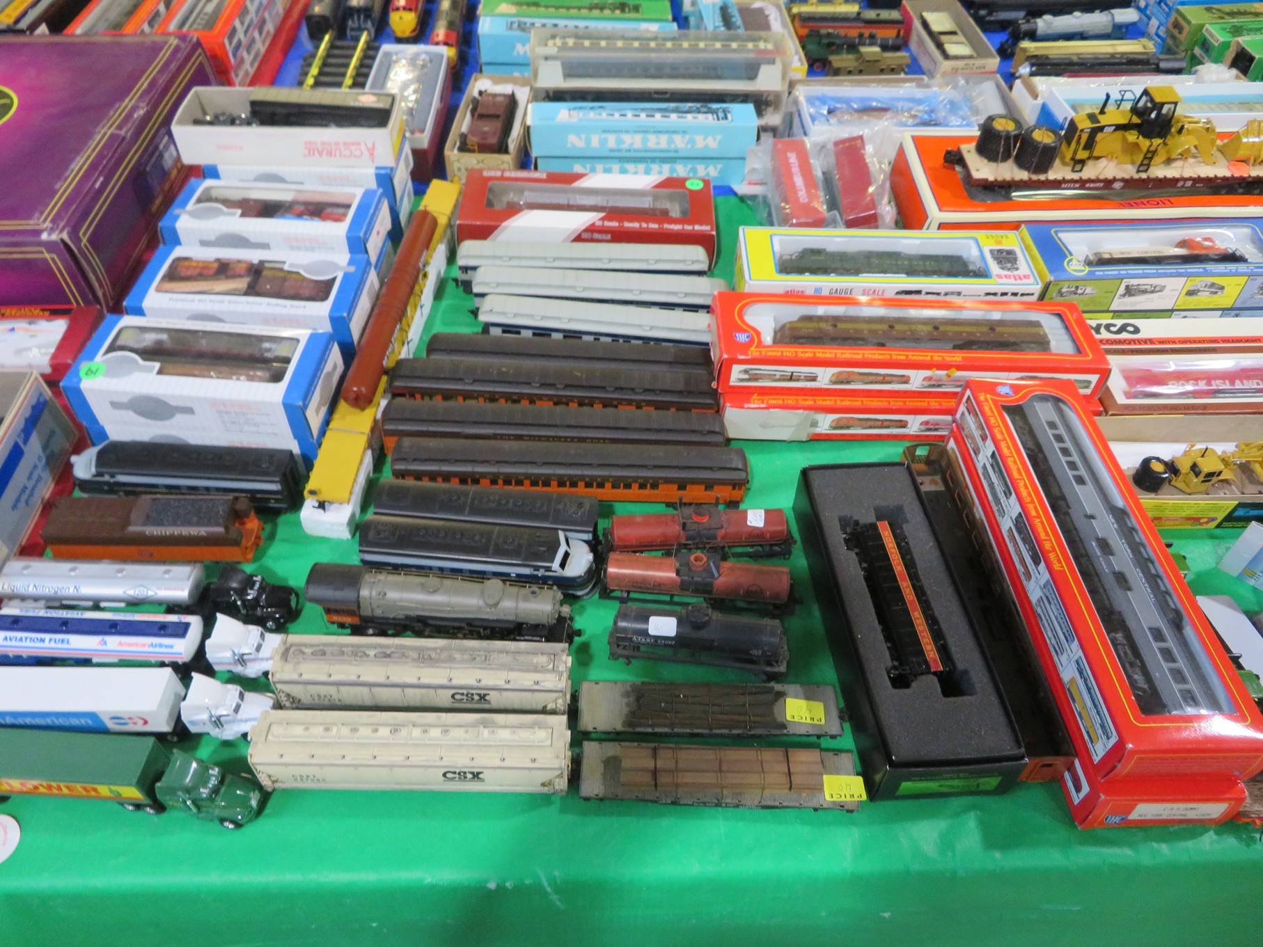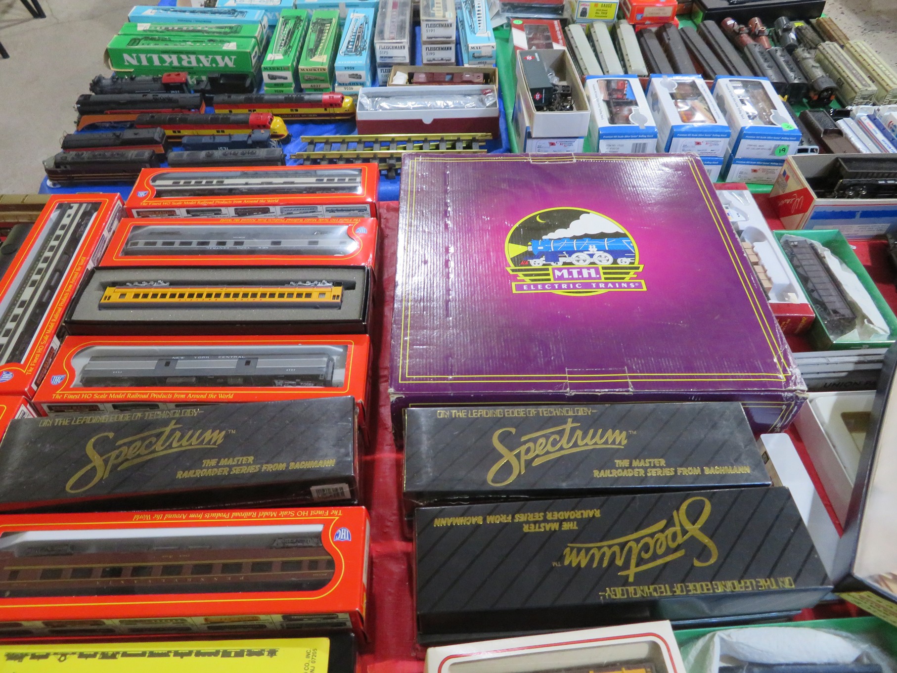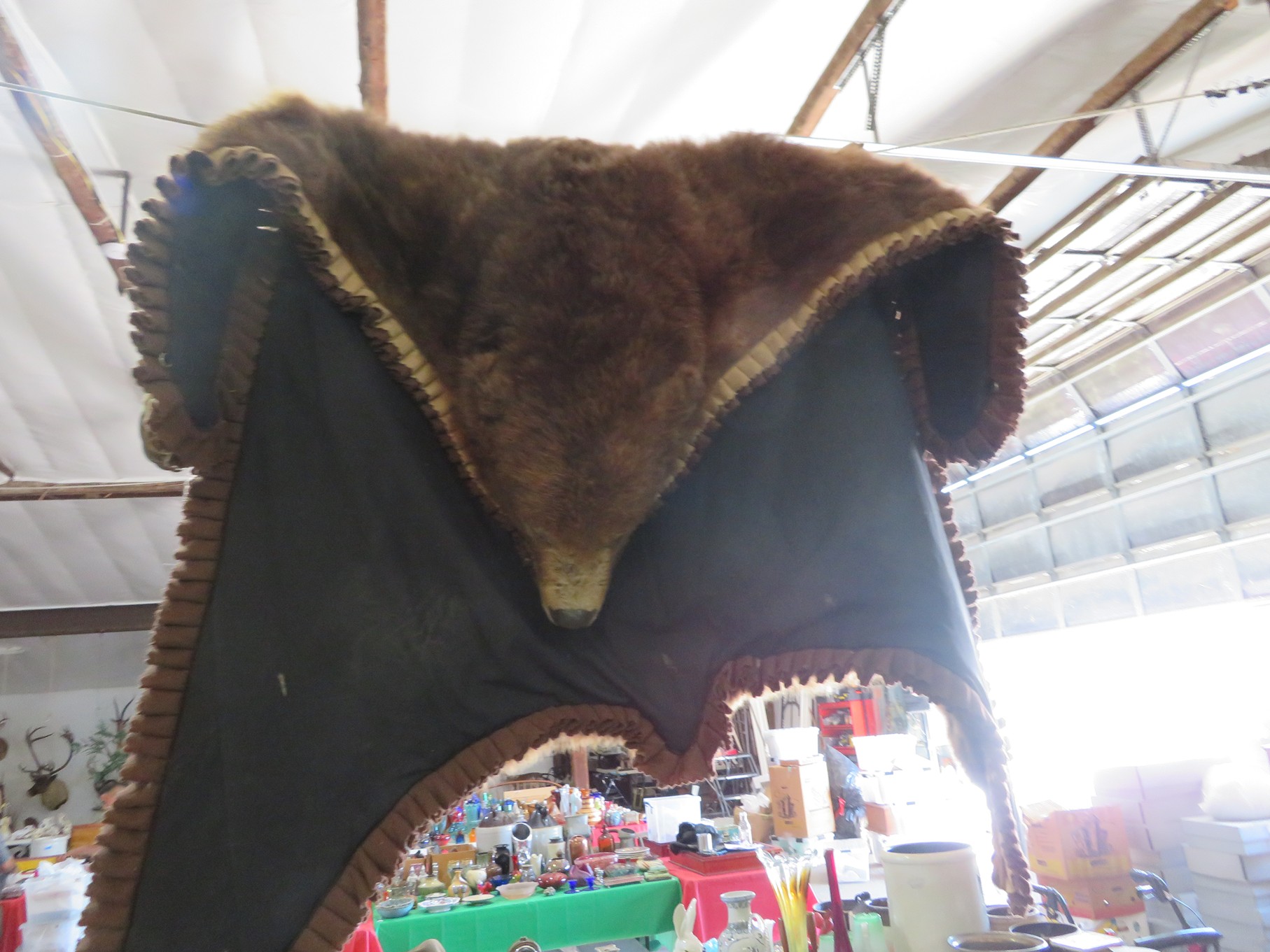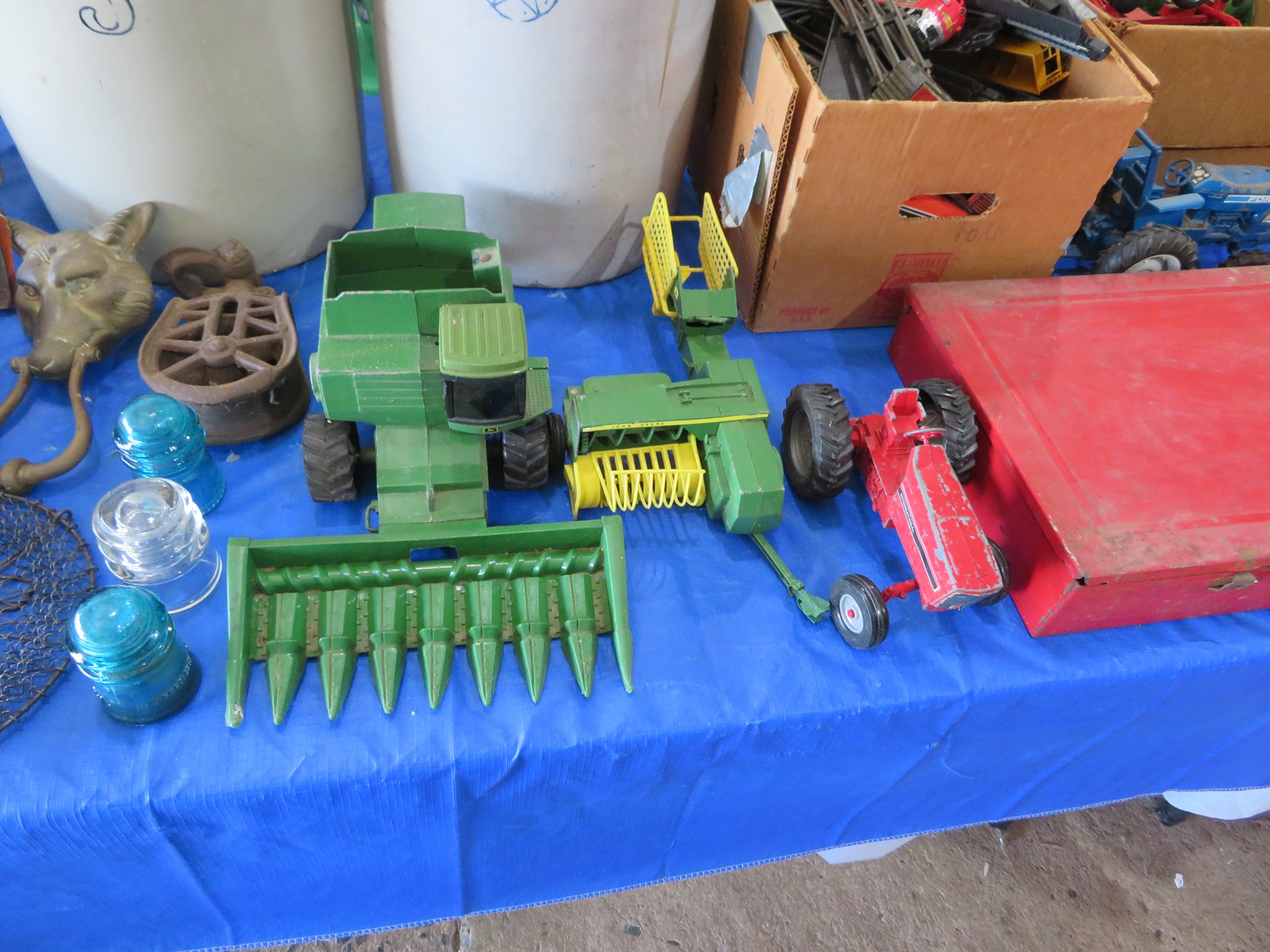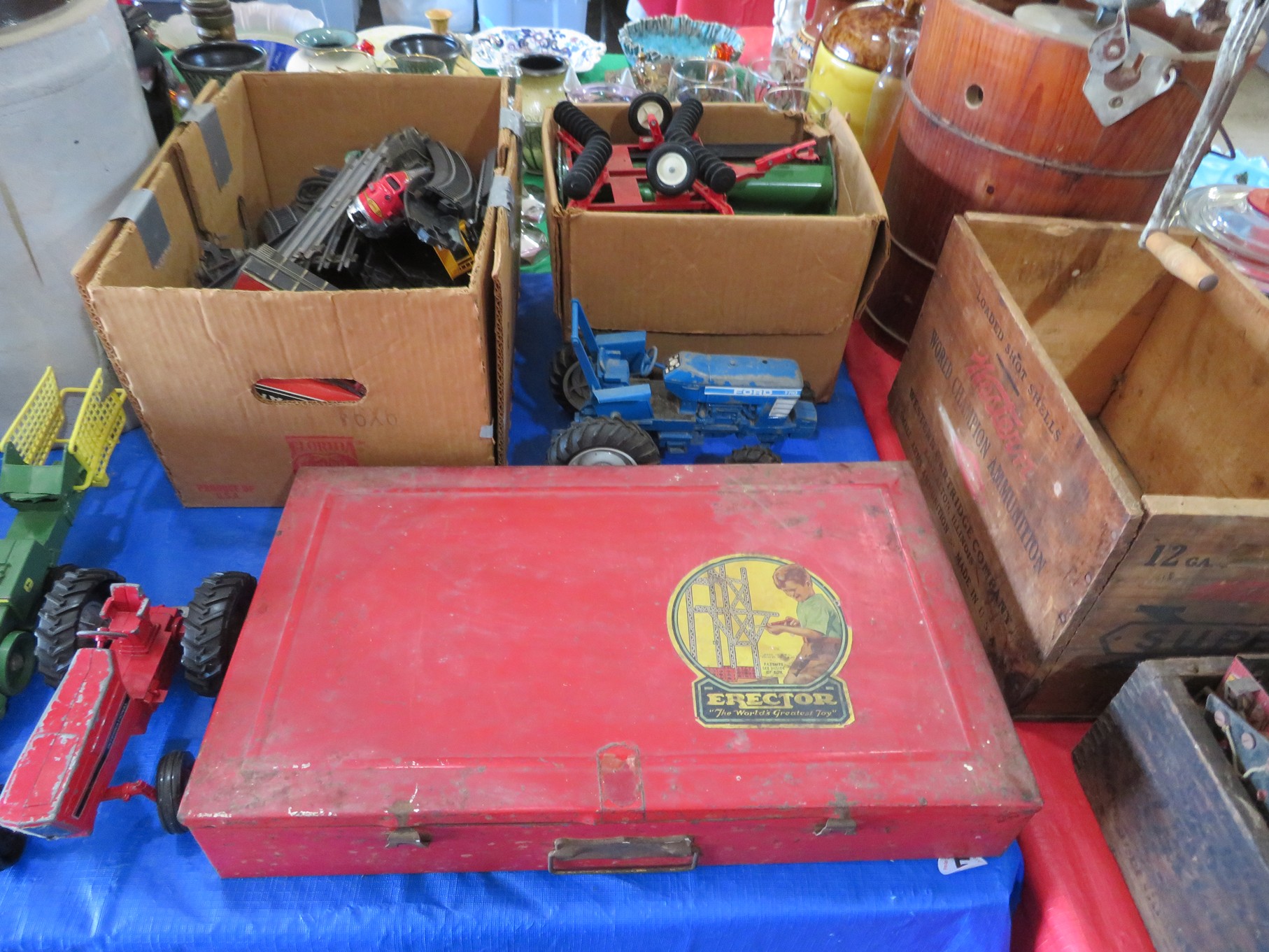 Bear rug; Mounted quail in display case; Mounted salmon; Western Shot Shell wood crate; Copper weathervane horse mounted for display; Old toy tractors & implements; Boxes of old toys; Erector set in box; Tables of toy RR; Clorox bottle; Insulators; Stereo view; Oil can; Brass fox head door knocker; Old metal pulley; Brass candlesticks; Tobacco tins; Liquor decanters;