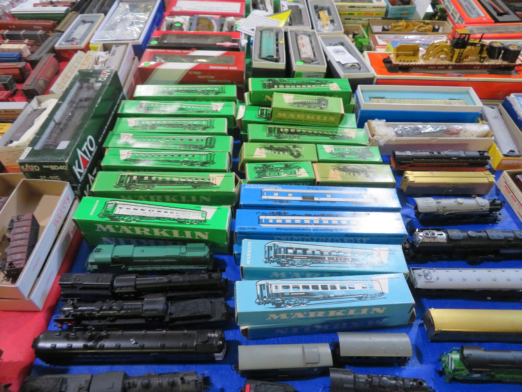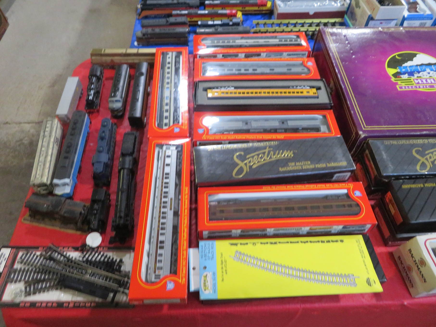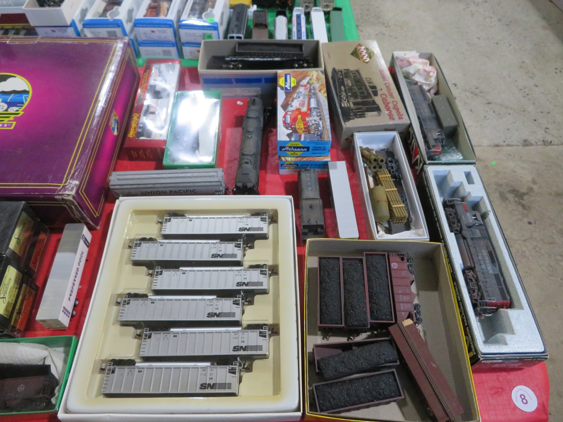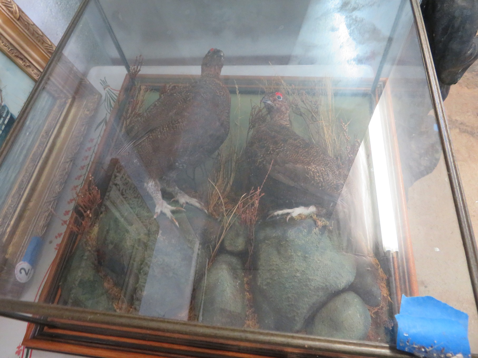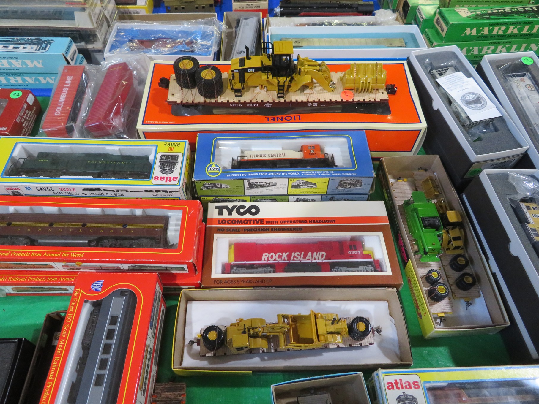 Bear rug; Mounted quail in display case; Mounted salmon; Western Shot Shell wood crate; Copper weathervane horse mounted for display; Old toy tractors & implements; Boxes of old toys; Erector set in box; Tables of toy RR; Clorox bottle; Insulators; Stereo view; Oil can; Brass fox head door knocker; Old metal pulley; Brass candlesticks; Tobacco tins; Liquor decanters;