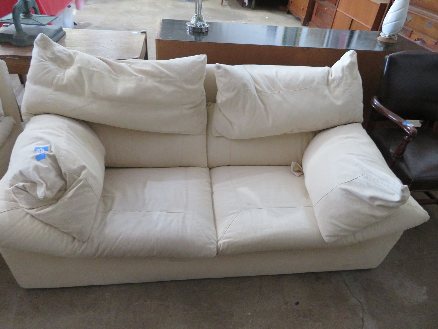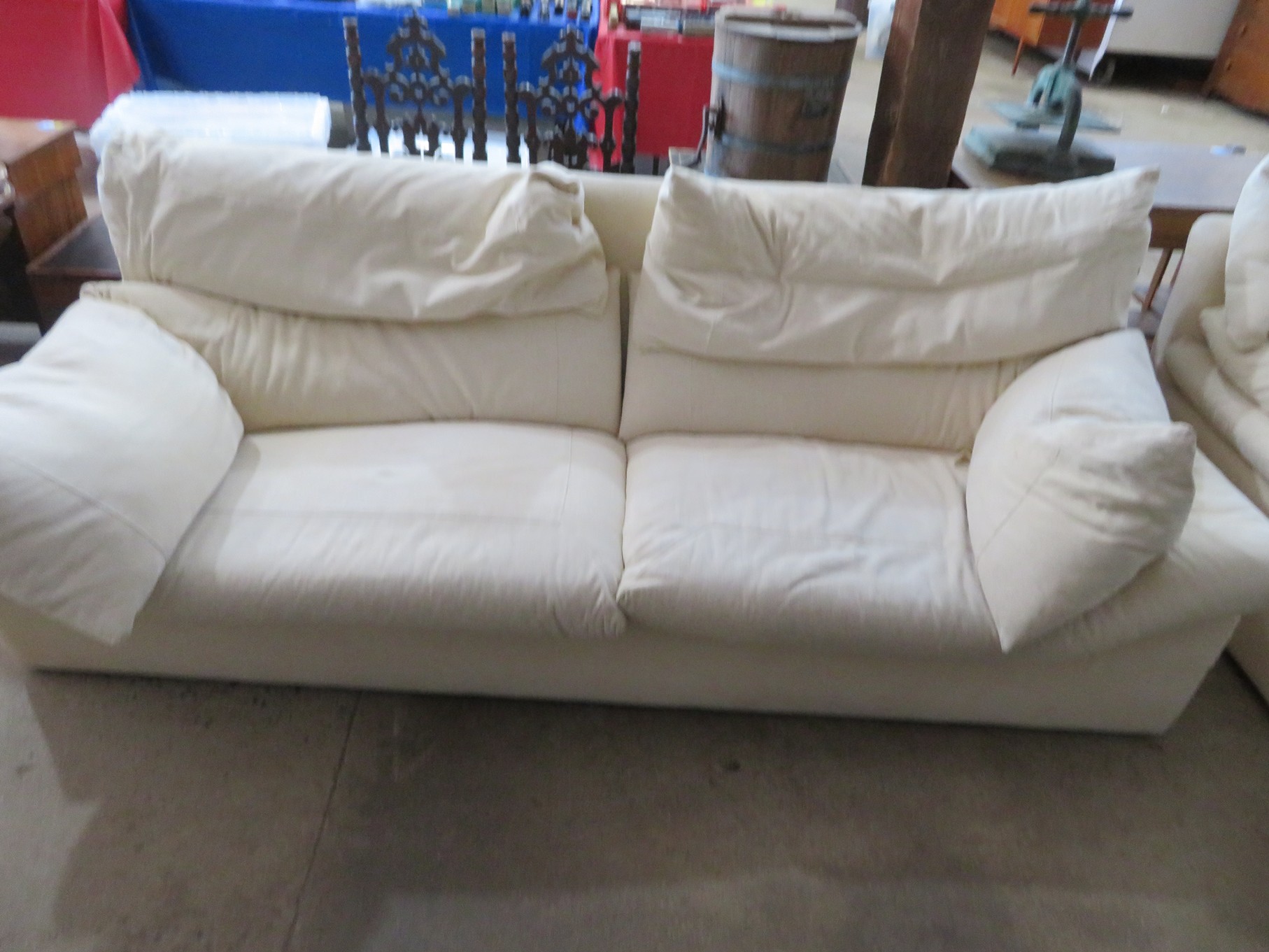 MCM! Wonderful buffet with overhead sliding door storage unit; Dining table with 8 curved back chairs; Marble top server with 4 drawers and 2 compartments; Large sliding door buffet; Glass door display cabinet with pointed front; 5 drawer chest; Set of 3 dining chairs; Mid-century modern tea cart; End table with magazine holder; MCM book rack; Arts & crafts desk; Midcentury buffet with matching server; Beautiful pair of white loveseats by n. ailersan a/s, Denmark; Nice pair of MCM table lamps;