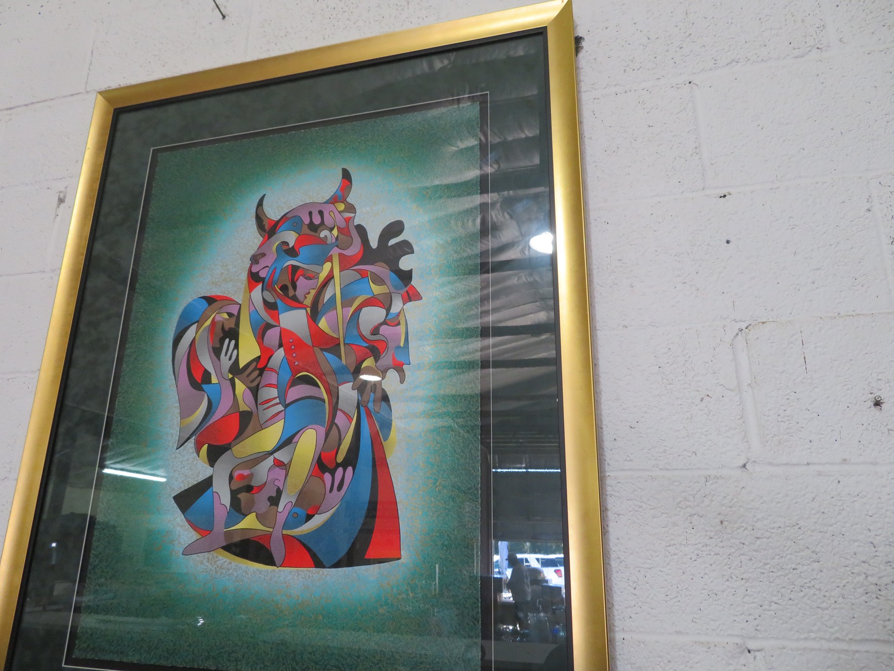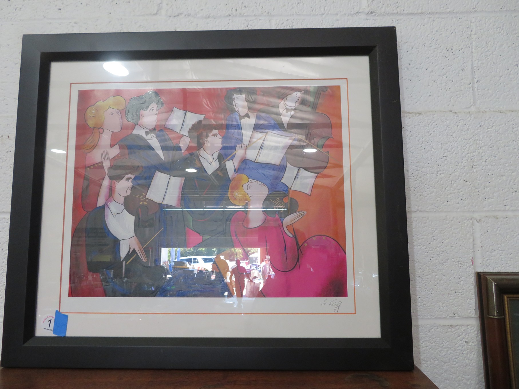 ART & METALS: Military print; Modern print of musicians; Colorful modern print of animal cloaked person; Signed original art of lighthouse & ship at sea; Copper weathervane horse mounted for display; Lladro nuns; Lladro statues; Buddhas; tabletop statues; Cherubs; Angels; Rooster;