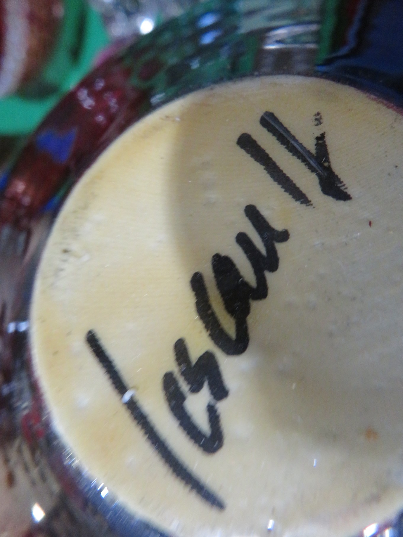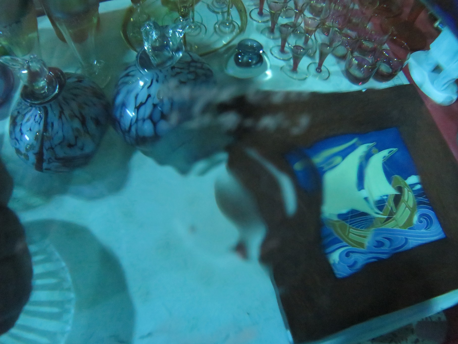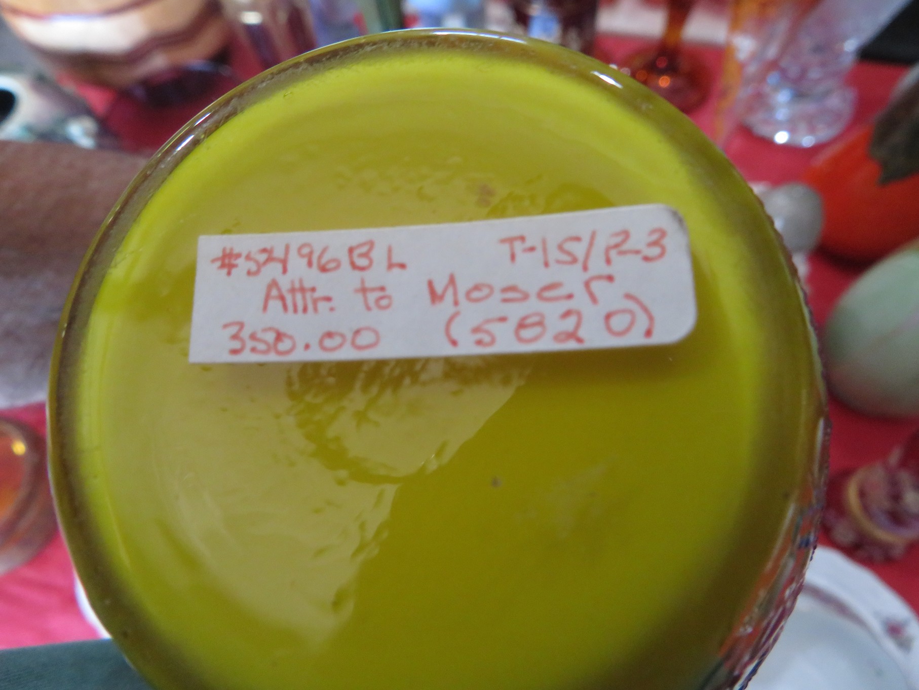 CHINA & GLASS: Tremendous collection of Great Glass & More! Gold decorated pokal with ruby panels; Yellow glass pitcher with enameling; Yellow over white decorated vase attributed to Moser; Goblets with colored medallions & gold; Amber glass candlesticks with metal bands showing mythological figures; Enamel decorated hair receiver; Sets of decorated glasses; 6 decorated wine glasses; Red glass vase with lots of swirling enamel decoration; Enamel decorated trinket boxes; Art glass pieces; Green glass with gold & enamel artwork; Bohemian ruby glass vase with gold; Cobalt goblets on silver bases; Light blue decorated tumbler set; Etched vase; Large ovoid paperweight with mermaid; Decanters; Colored cut to clear goblets;