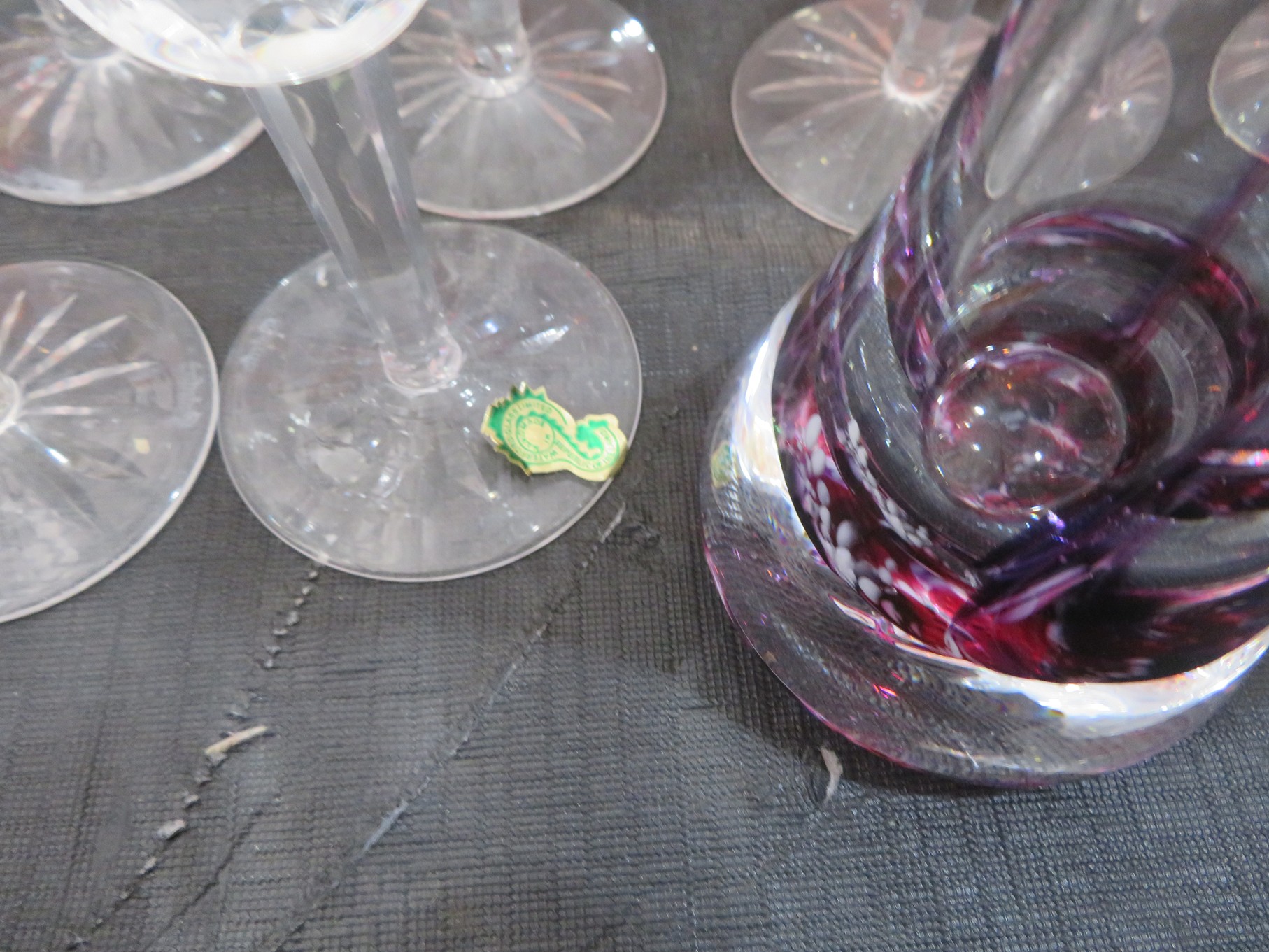 Waterford; Footed bowl; Crystal vases; Nappy; Candlesticks; Paperweights; Compotes; Cut glass pieces; Waterford ruby cut to clear tumblers; Pitchers; Large amber perfume bottle; Large art glass wases; Art glass charger; Decanter & cordials set on tray; Decanter & multiple size matching stemware; Large leaf platters; Pyrex bowls & measuring cup; Pyrex casseroles & storage; Fostoria candlesticks; Carnival glass hen on nest; Opalescent blue hobnail ruffled edge vase; Lemonade pitcher & glasses; Divided serving platter; Glass basket; Candlewick; Punch set & more!