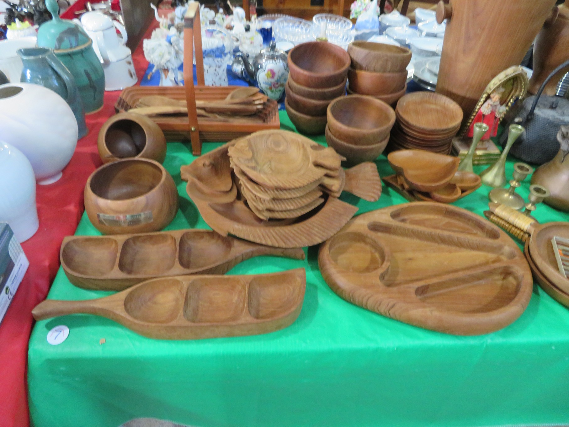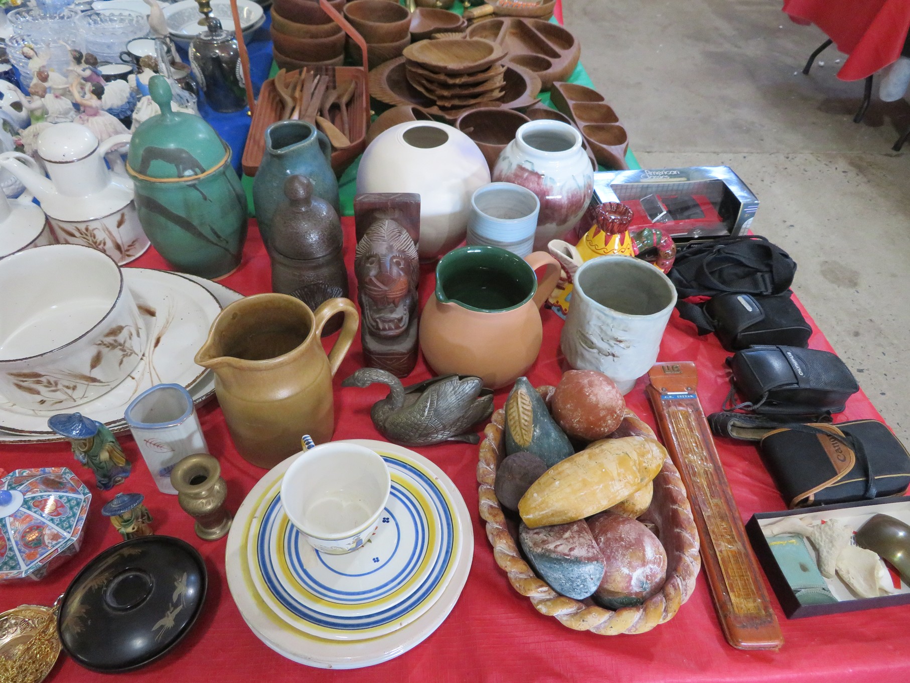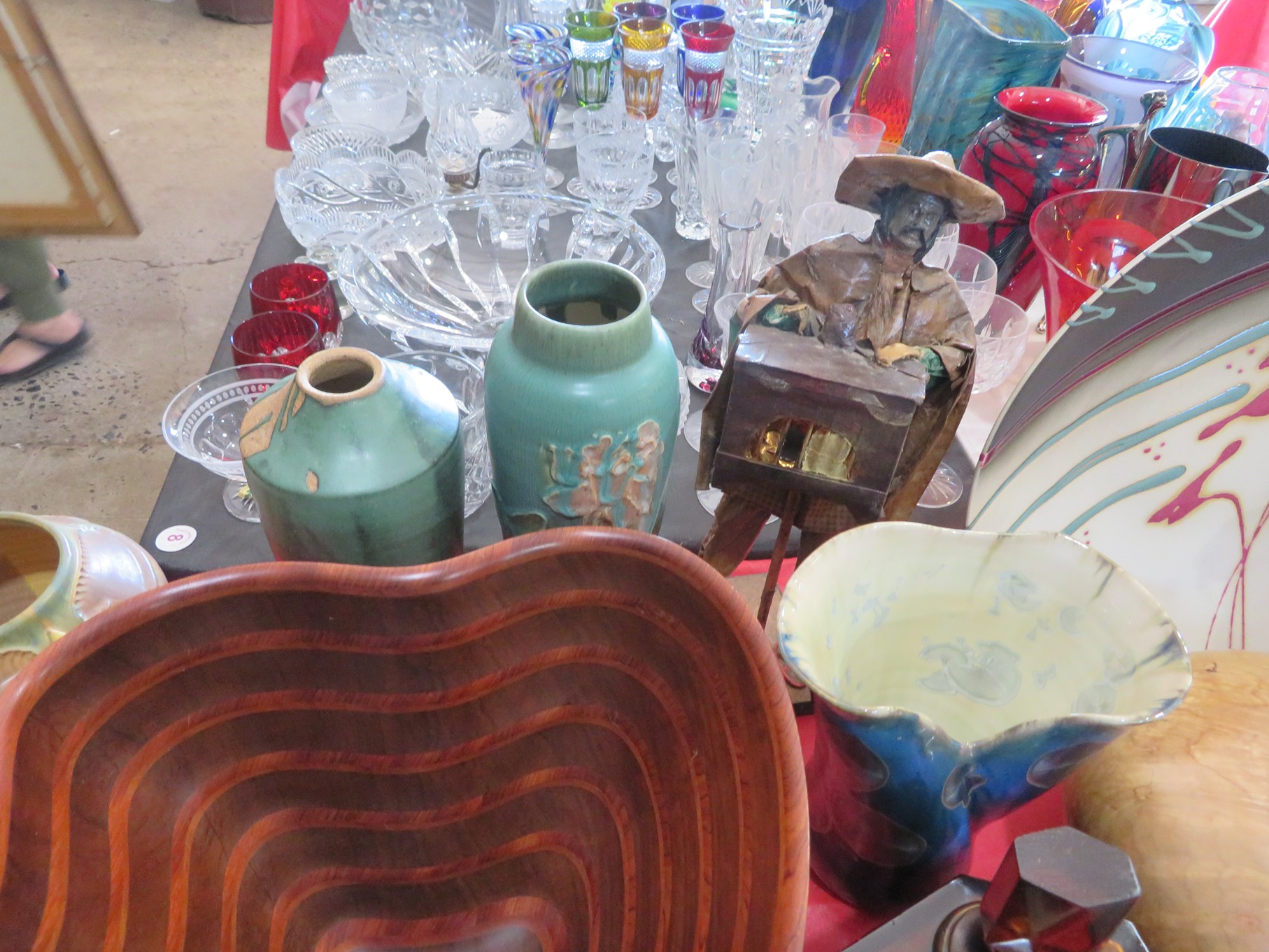 Large wooden artist made vase; Large artist wooden bowl; Live edge burl bowl; More artist woodenware; Stone slab; Pyrite specimen; Faux fruit & vegetables; Christmas tree photo frame in box; Old cameras; Monkey wood carvings; Jewelry box; Wooden ice bucket; Crocodile skull; Steins; Batik printing block; Ammo boxes; Large sad irons; Smal anvil; Driftwood; Napkin rings;