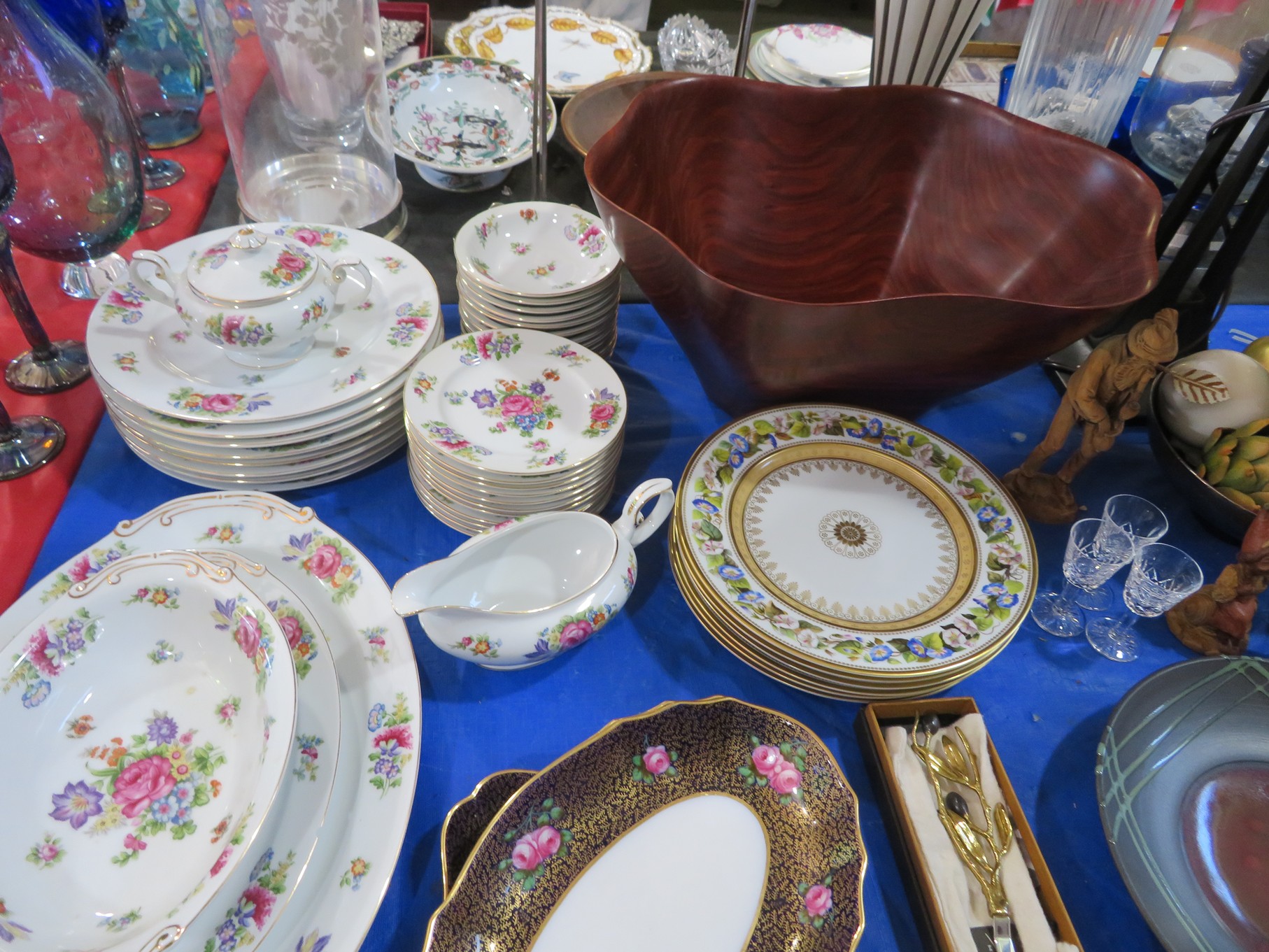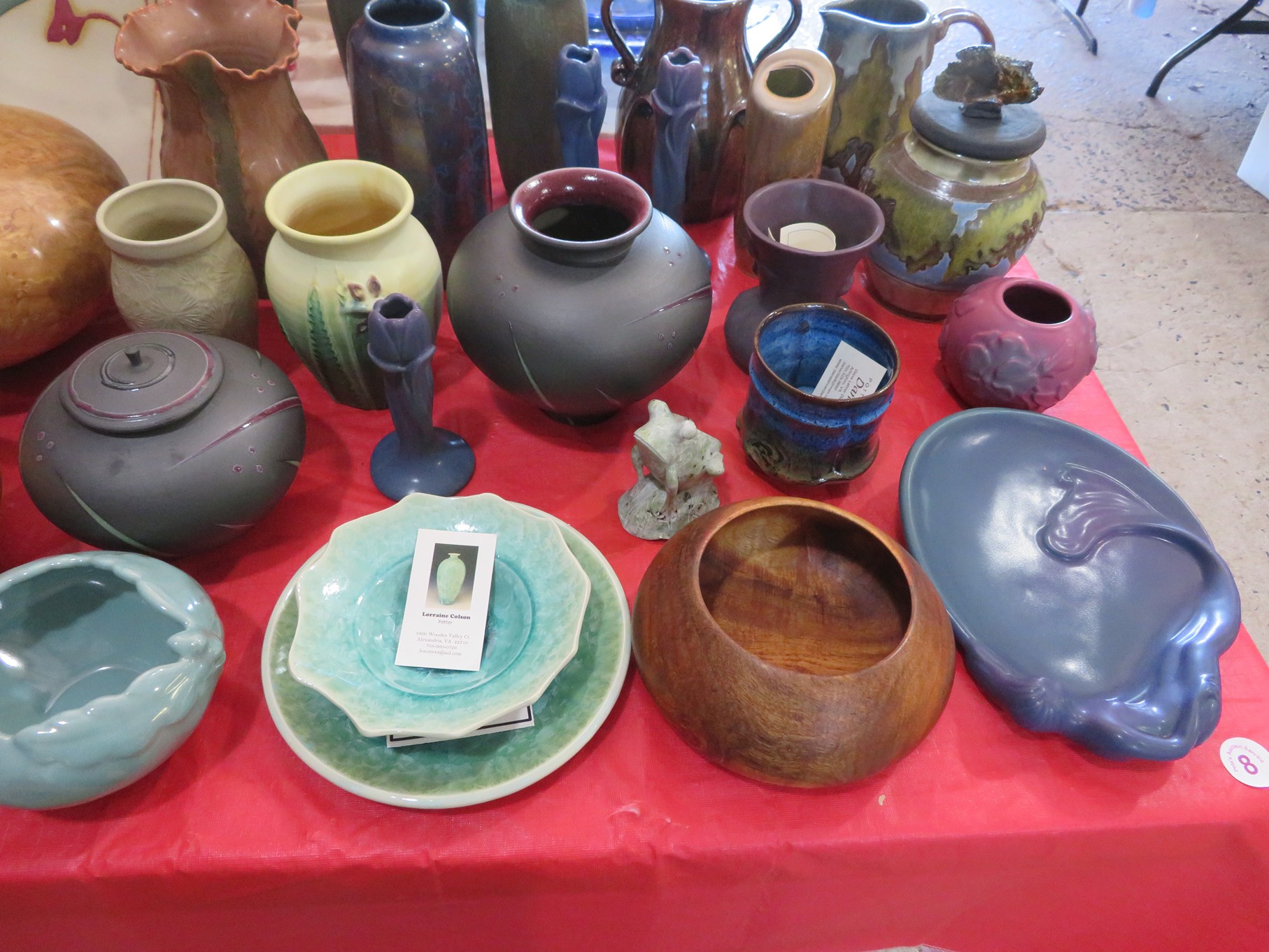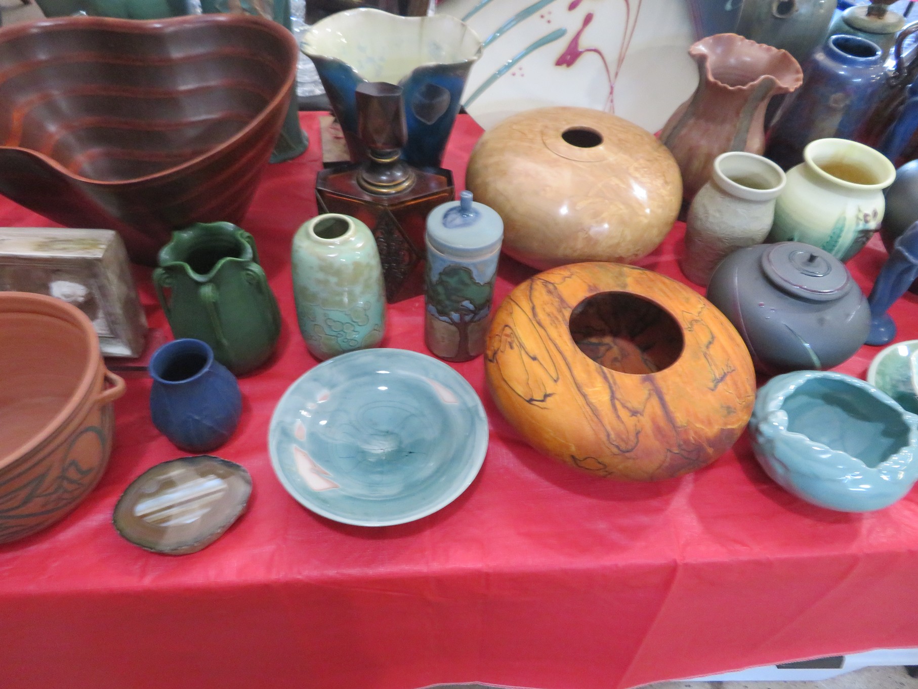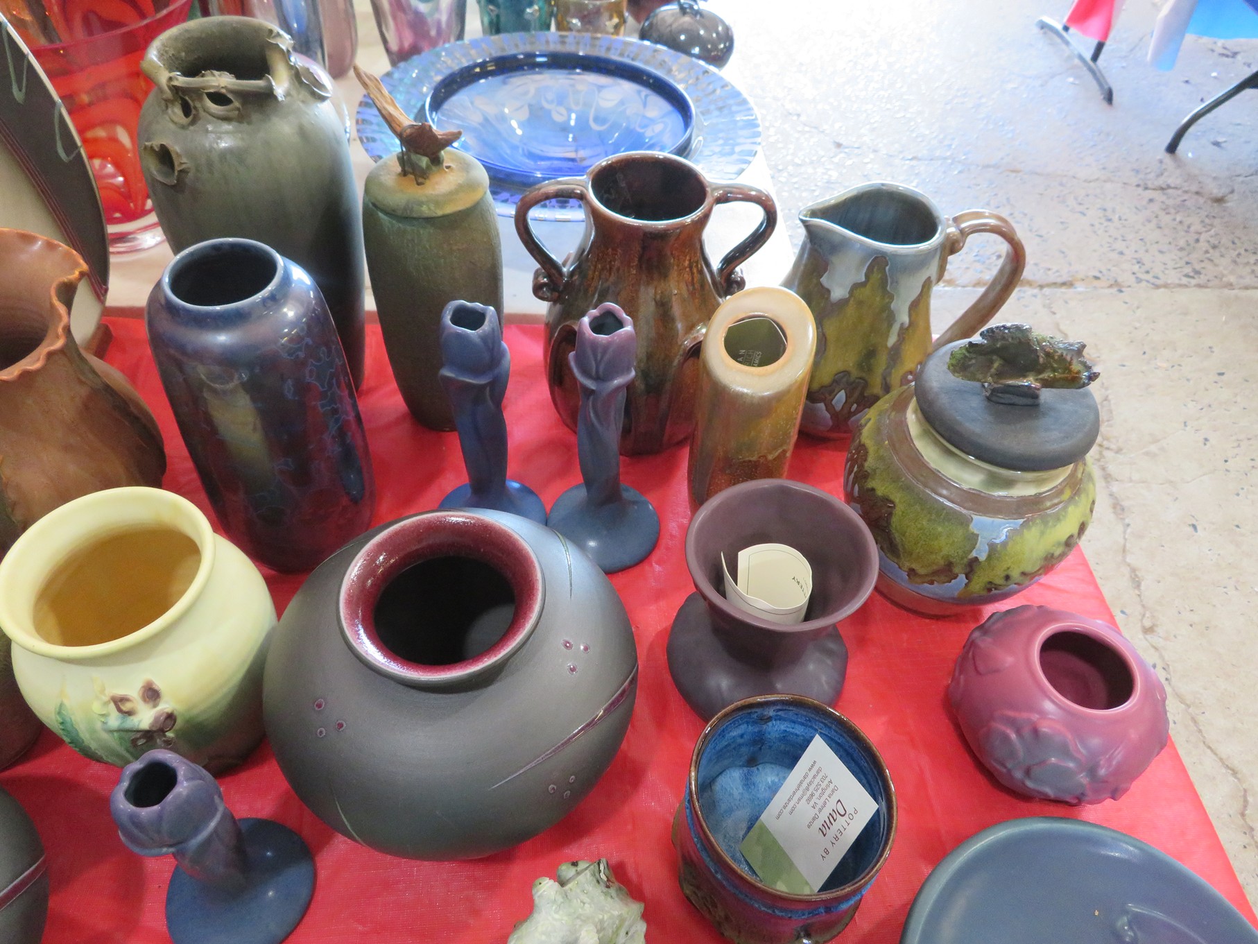 Van Briggle vases; Vase with 3D Doll’s eye plant decorations; Studio pottery; Van Briggle candlesticks; Ceramic garden seat; Lladro figurines; Collectible cups & saucers; Art pottery; Hand-painted plates; Tiles; Lenox; Carpet balls; Cardinal figurine; Fine dinnerware set; Teapots; Noritake “Naples” dinnerware collection; Dresden figurines; Capodimonte flowers; Basket; Tea set; Blue & white pottery; Rabbits; Washbowl & pitcher set; Angel figurines; Dutch girl cookie jar; Turkey planter; Coffee set; Piano baby & much much more!