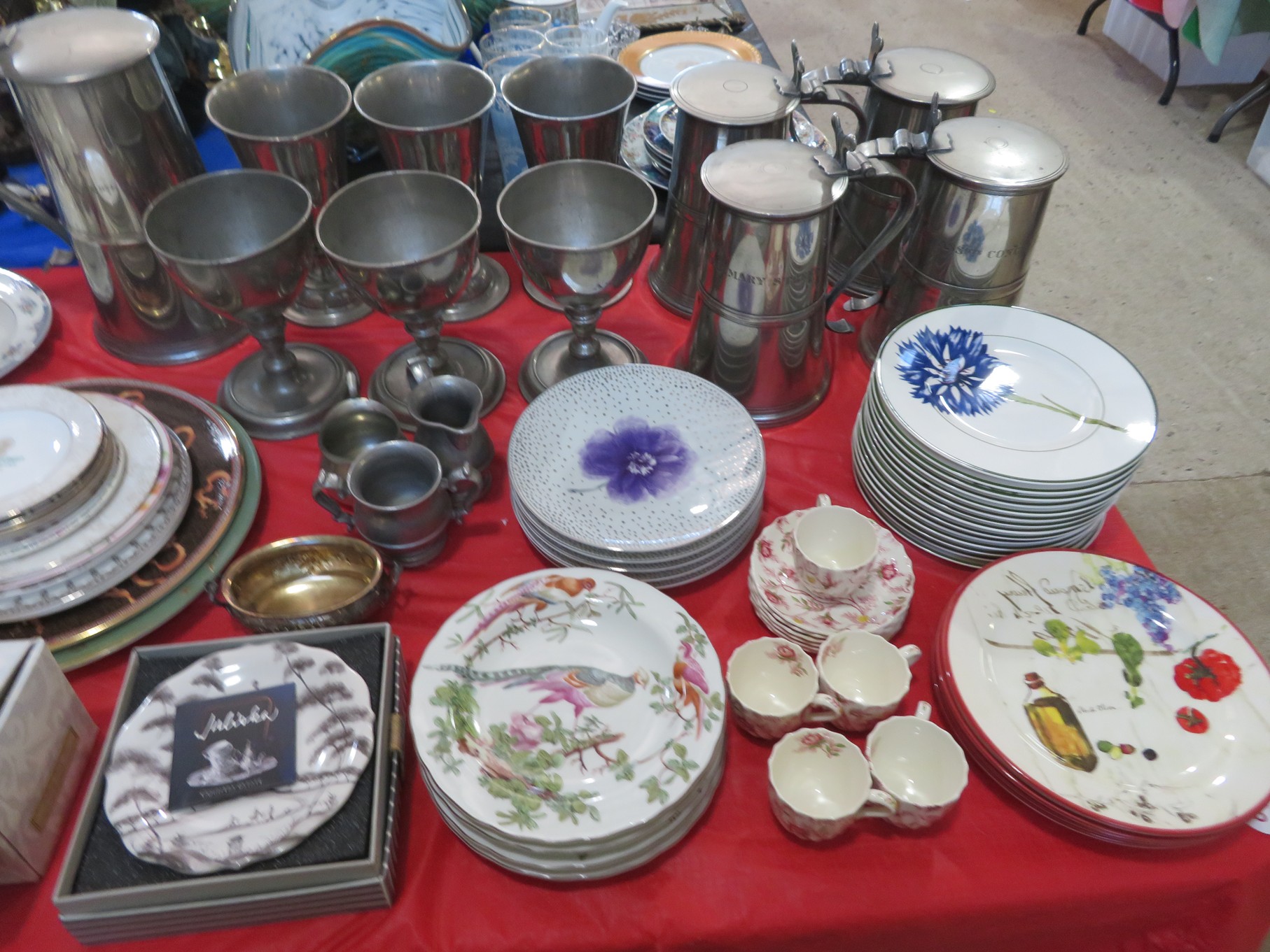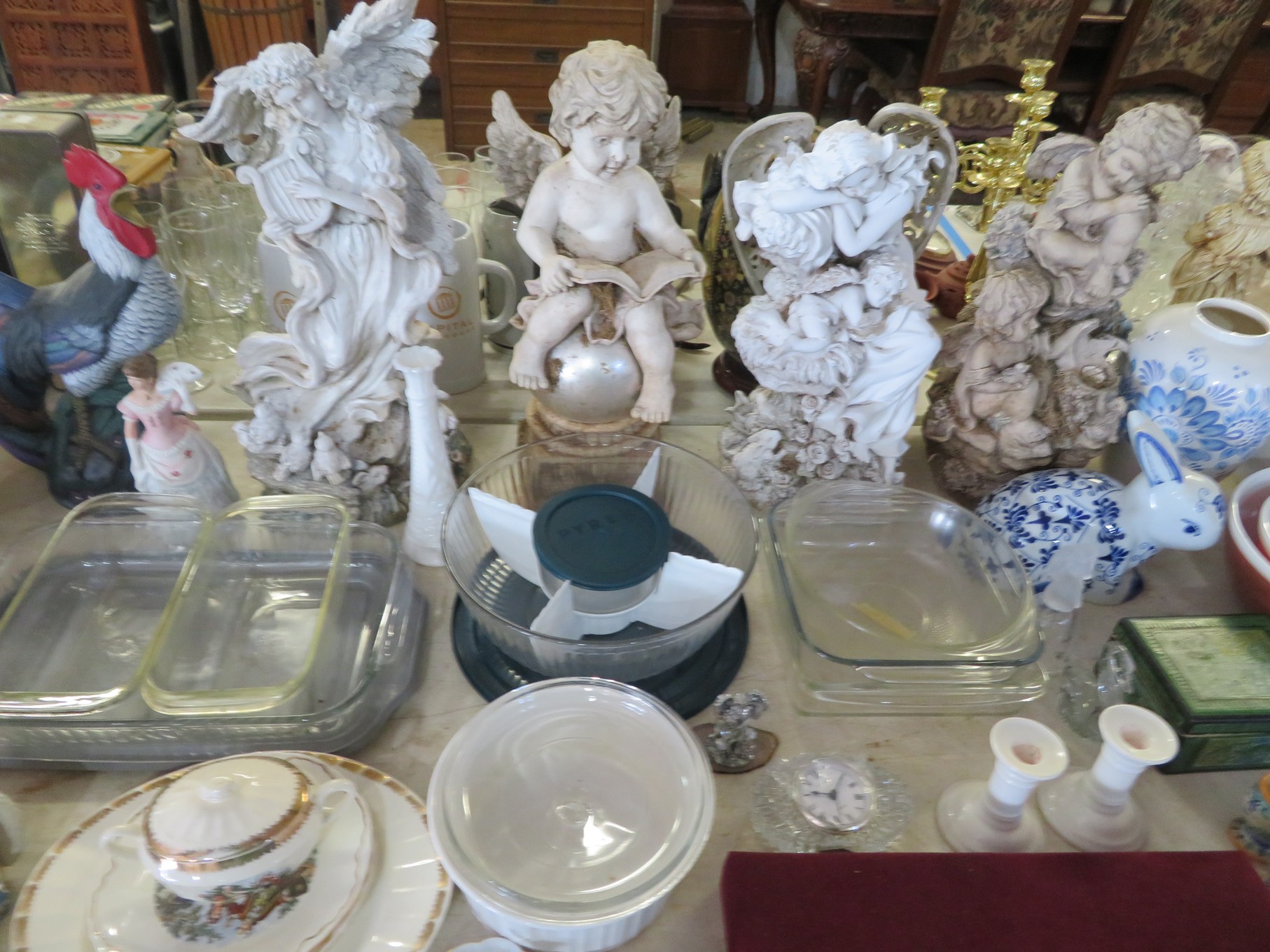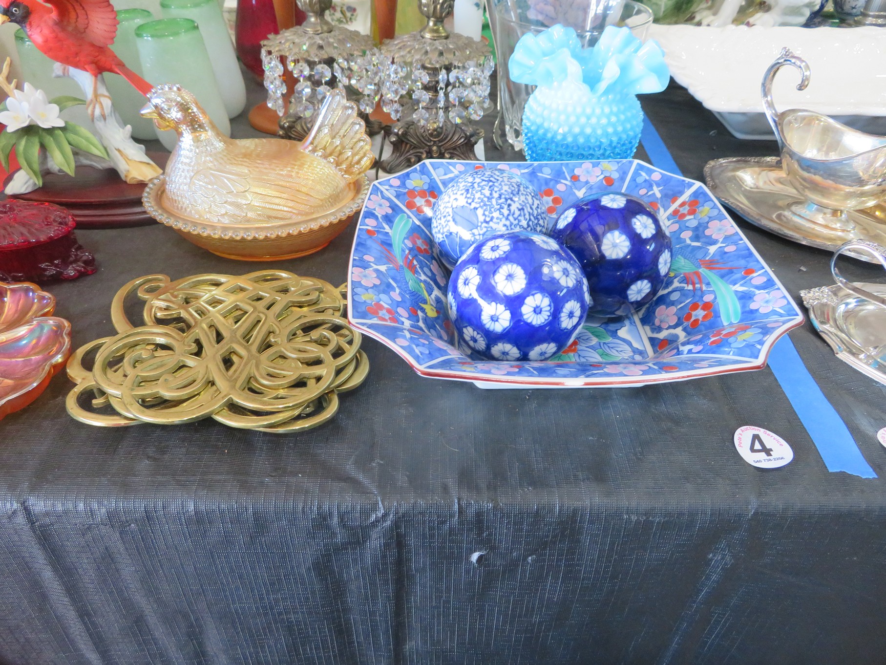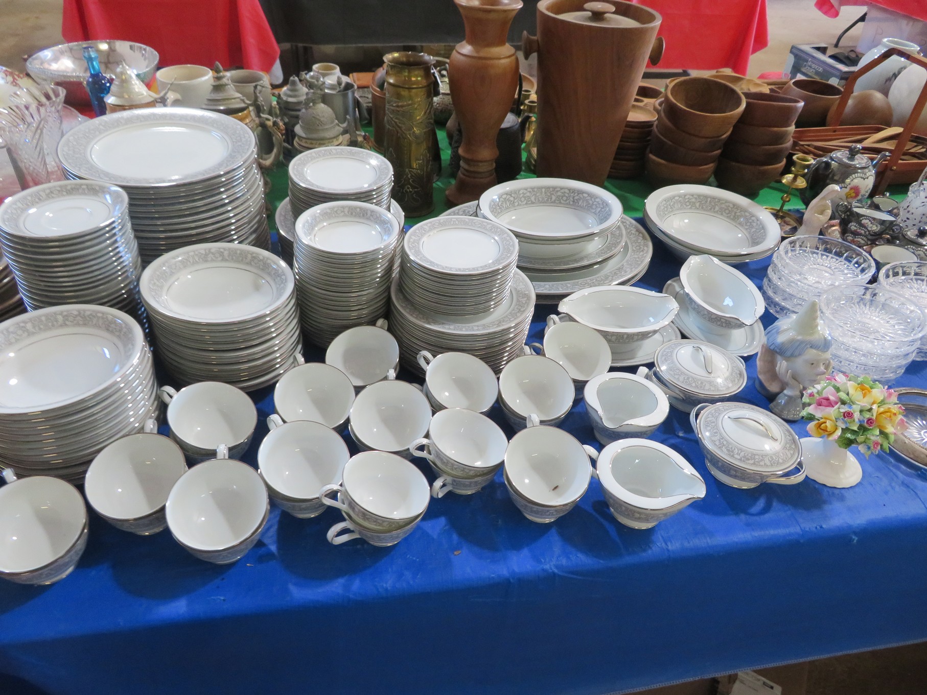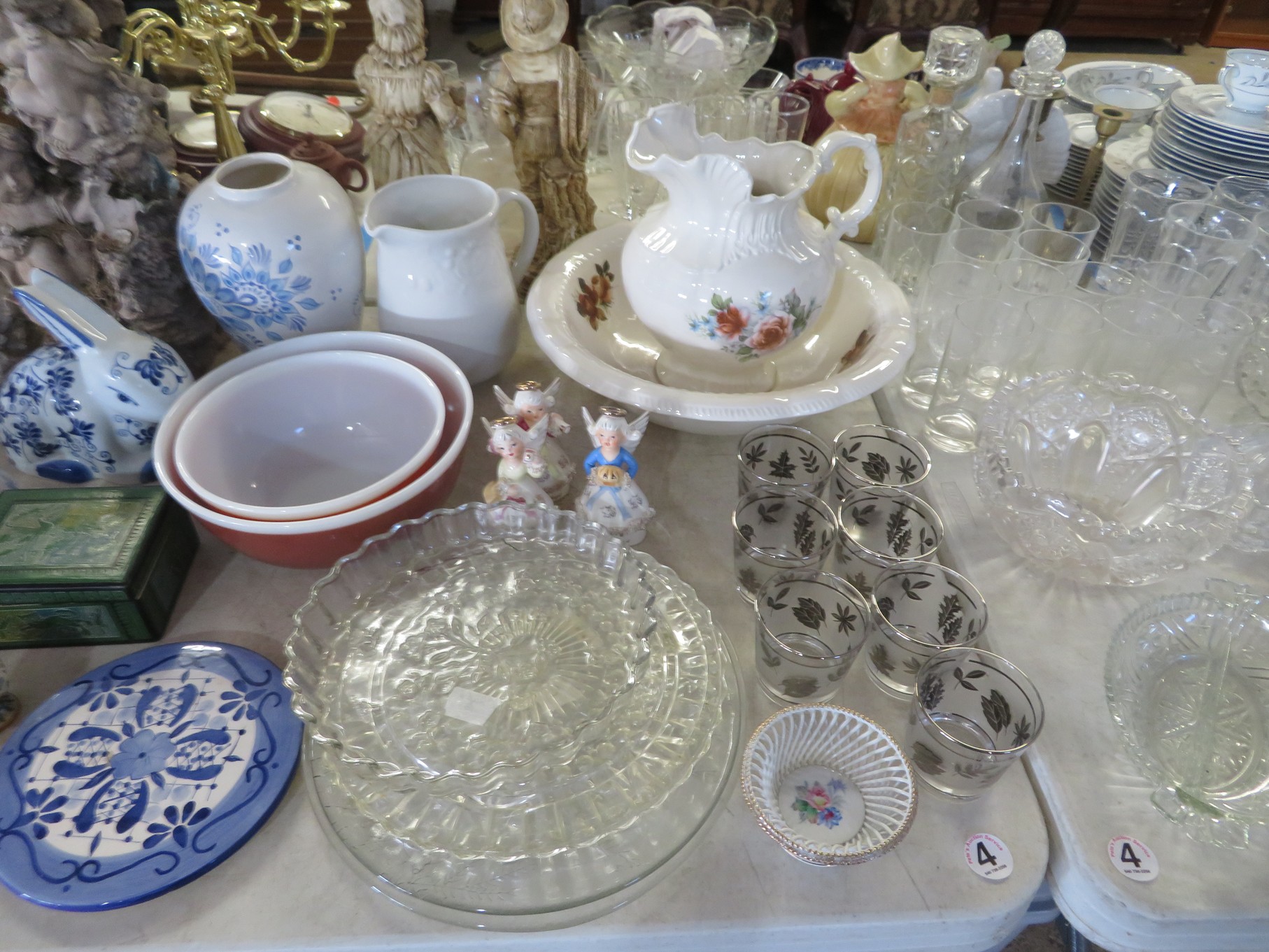 Van Briggle vases; Vase with 3D Doll’s eye plant decorations; Studio pottery; Van Briggle candlesticks; Ceramic garden seat; Lladro figurines; Collectible cups & saucers; Art pottery; Hand-painted plates; Tiles; Lenox; Carpet balls; Cardinal figurine; Fine dinnerware set; Teapots; Noritake “Naples” dinnerware collection; Dresden figurines; Capodimonte flowers; Basket; Tea set; Blue & white pottery; Rabbits; Washbowl & pitcher set; Angel figurines; Dutch girl cookie jar; Turkey planter; Coffee set; Piano baby & much much more!