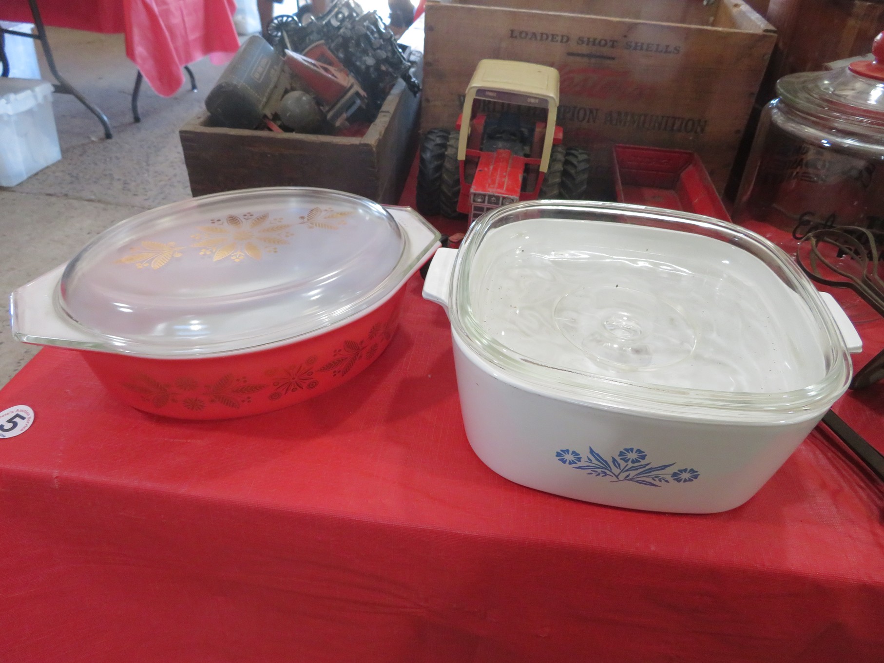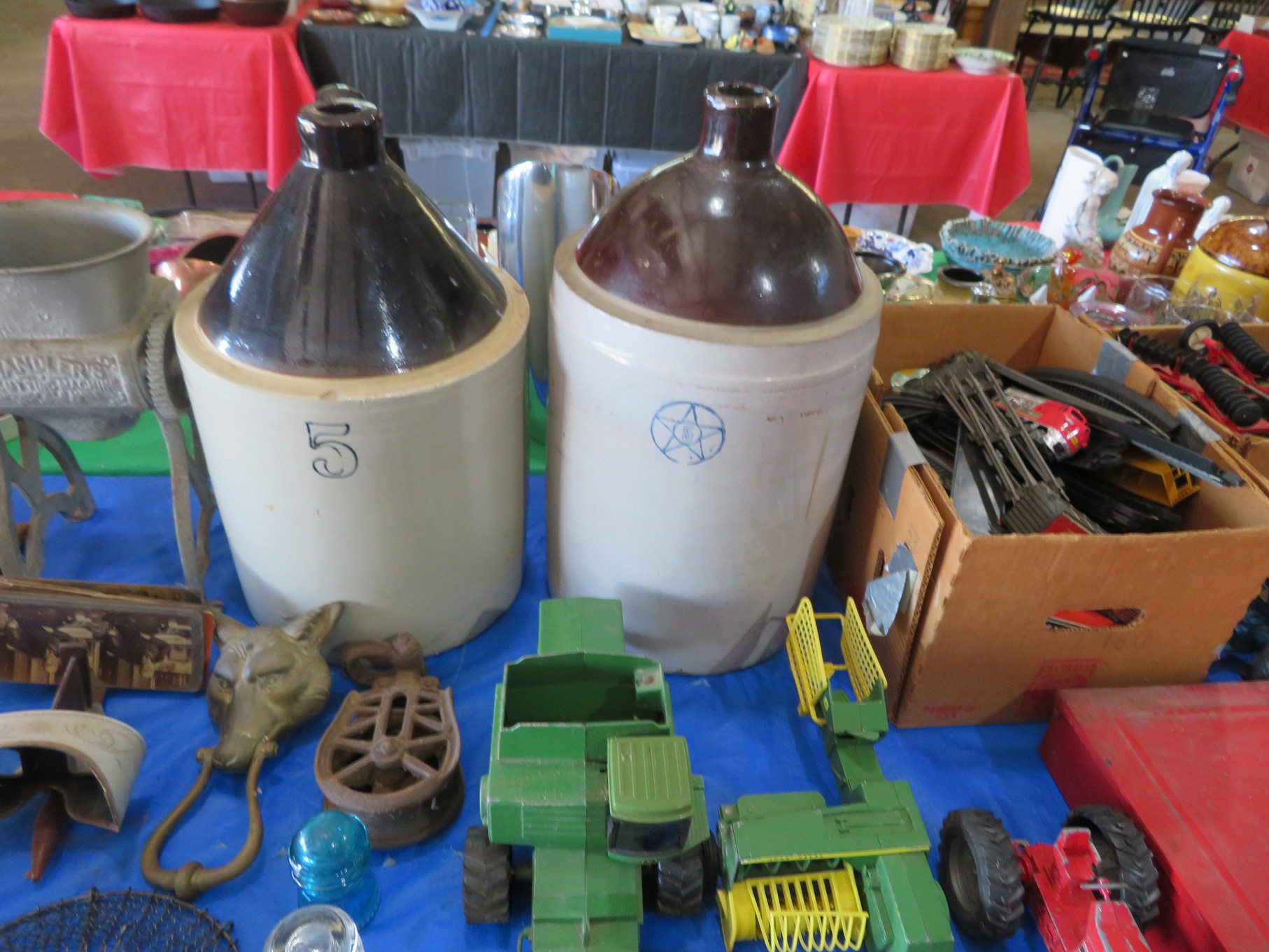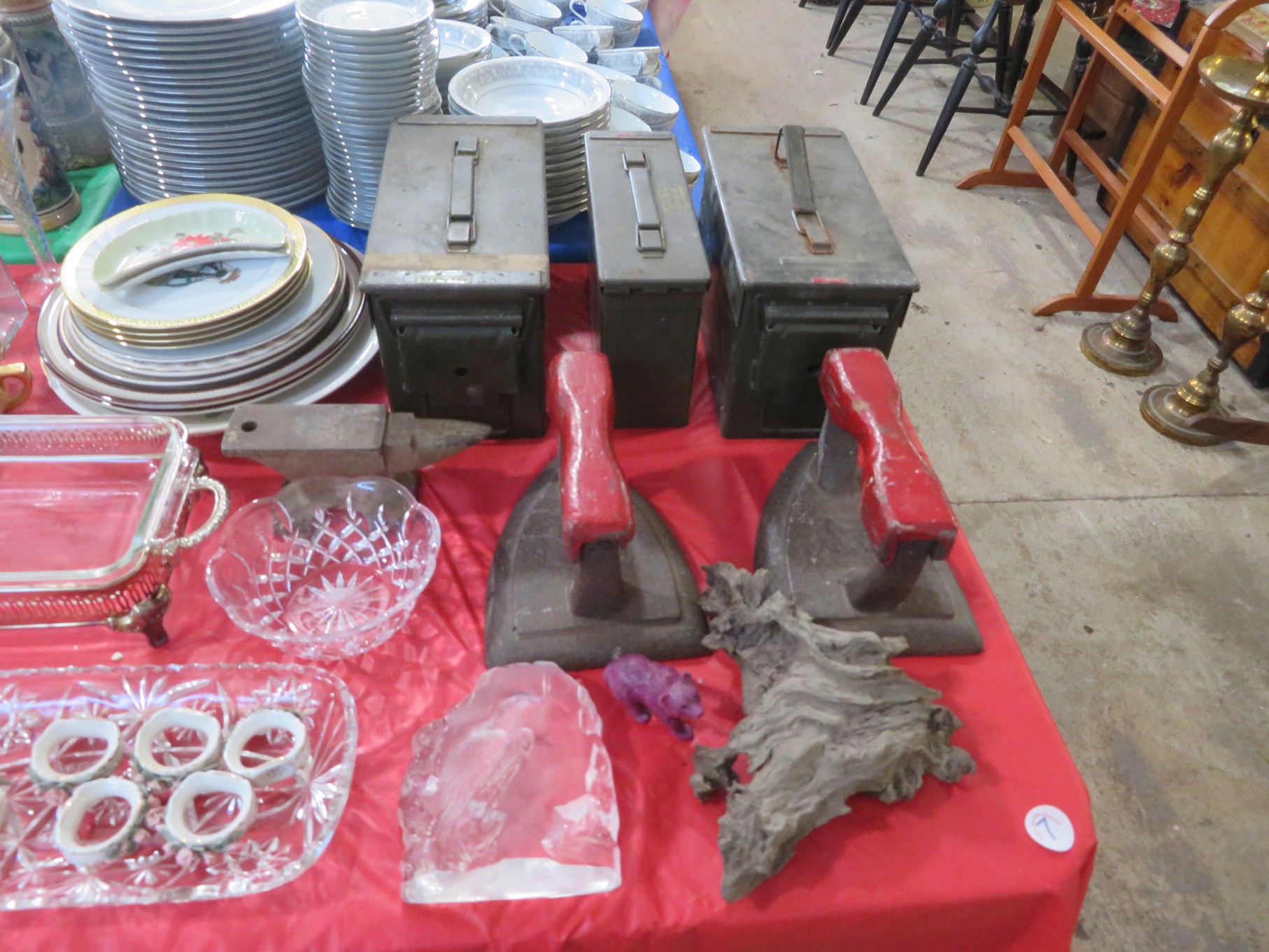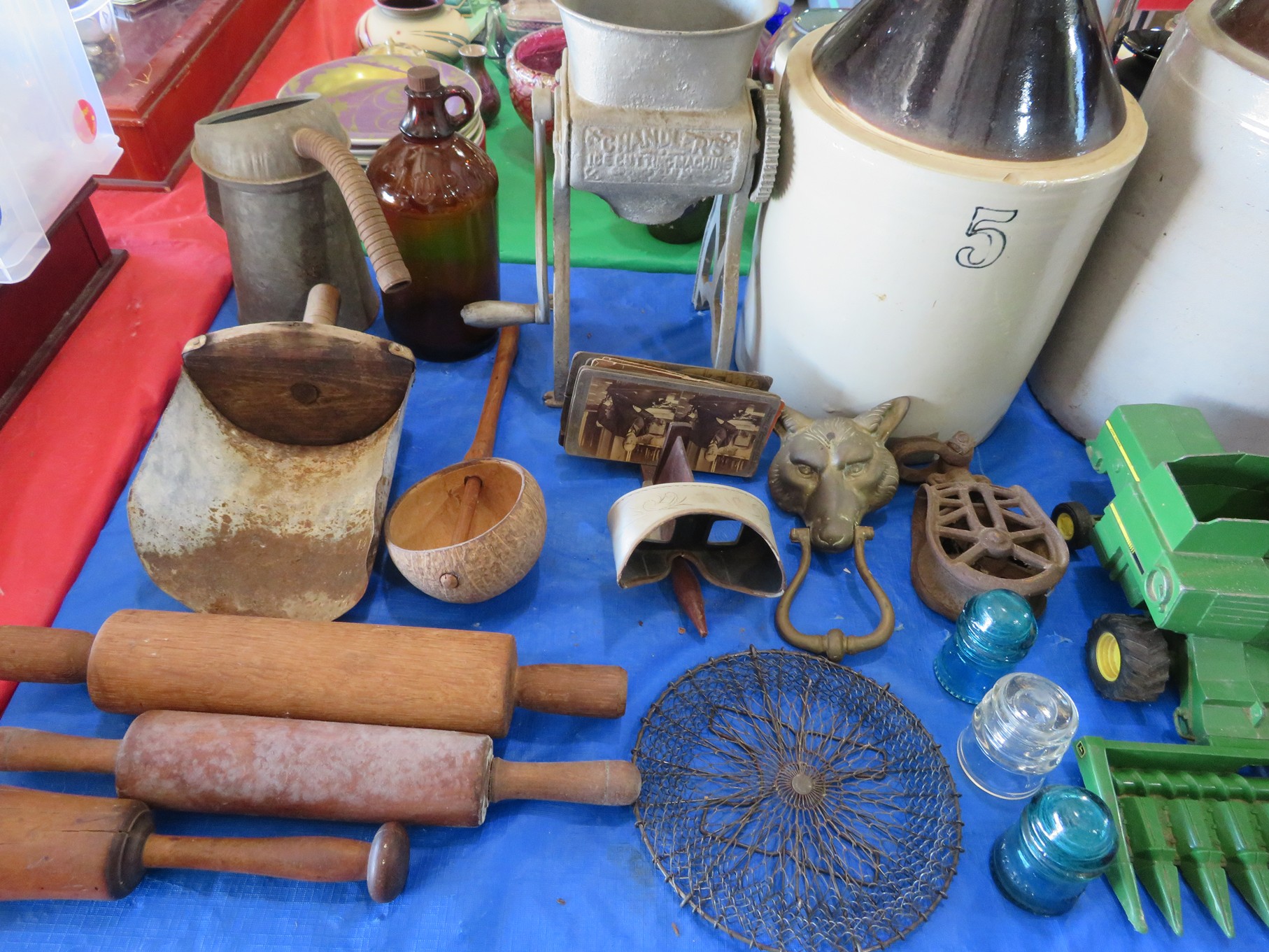 MORE: Large fruit press; Pickling crock; Copper ham boiler; Book press; LeCreuset cookware; Cast iron fry pans; Stoneware mixing bowl; Stoneware jug; Stoneware crocks; Large pickling crock with American Eagle; Smaller crock with Eagle & stars & stripes; Spongeware casserole; Wooden rolling pin; Old bottles; Brass spittoon; Pyrex glassware; Kitchen scales; Granite ware roaster; Guardian ware; Corning ware casserole with lid; Eggbeaters; Tom’s Roasted peanuts jar; Meat grinder; Ice cream maker; Brass cipher trivets; Chandler’s Ice Cutting Machine; Kraut pounder; Wire basket; Scoop; Gourd ladle; Copper sieve;