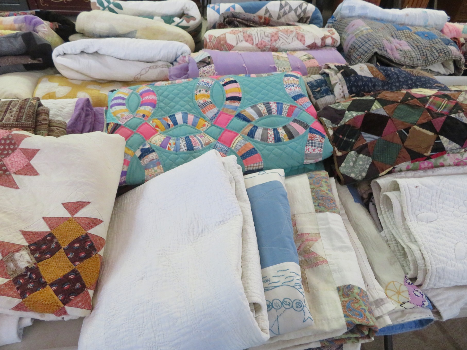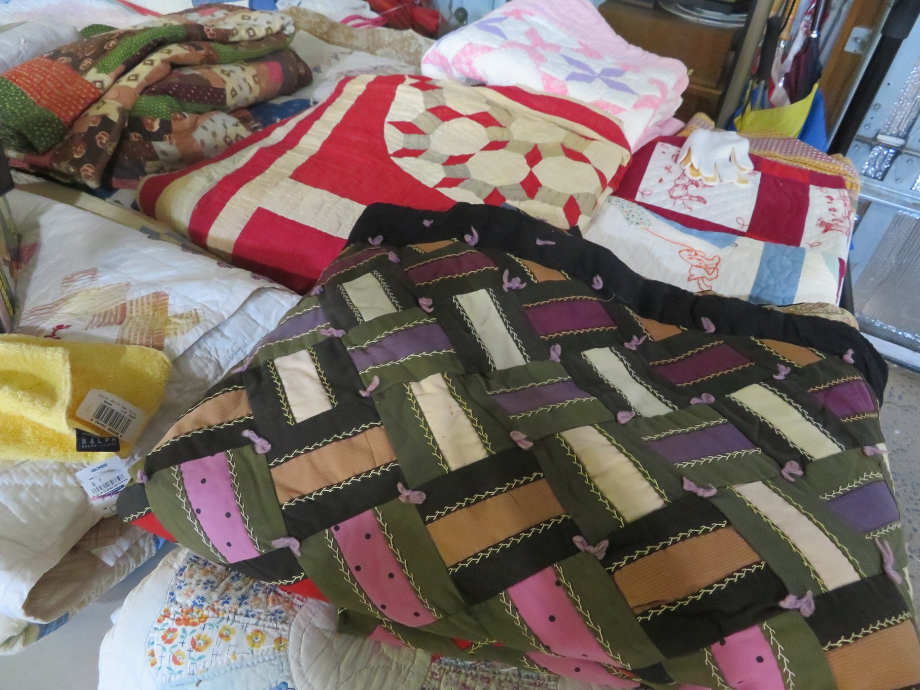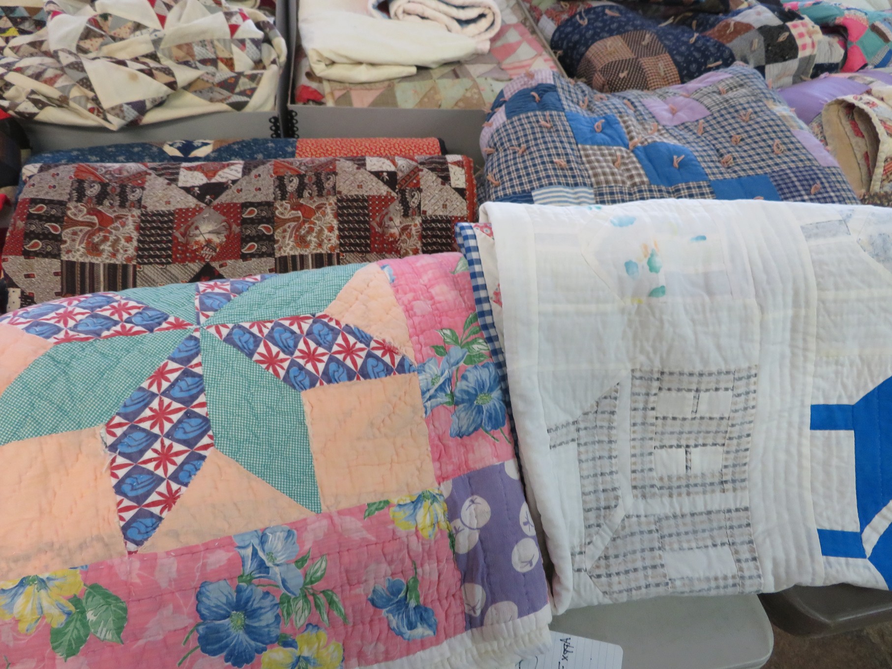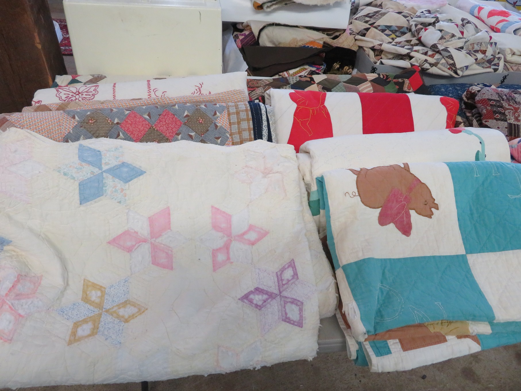 Old quilts; Holly Hobby quilt; Redwork quilt; Patchwork quilts; Applique quilts; Log Cabin quilt; Double Wedding ring quilt; Comforts; Dozens of old quilts! Quilt tops; Other old linens & embroideries; Sewing machine; Patio furniture; Drainage pipe; Floor fan; Garden statues; Long handled tools; Post hole diggers; Sledge; Rakes; Tiki torches; Small ladder; Hedge trimmers; Patio umbrella; Shovels; Brush ax; Lopers; Fishing poles; Wrought iron bench; Safes; Craftsman rolling tool chest; Sawzall; Stainless teel shelving; Dolly; Grinder on stand; Bird cages; Cooler; Wheelbarrow; Wooden keg; Galvanized tub; Trash can; Troy-bilt tiller & Much more!