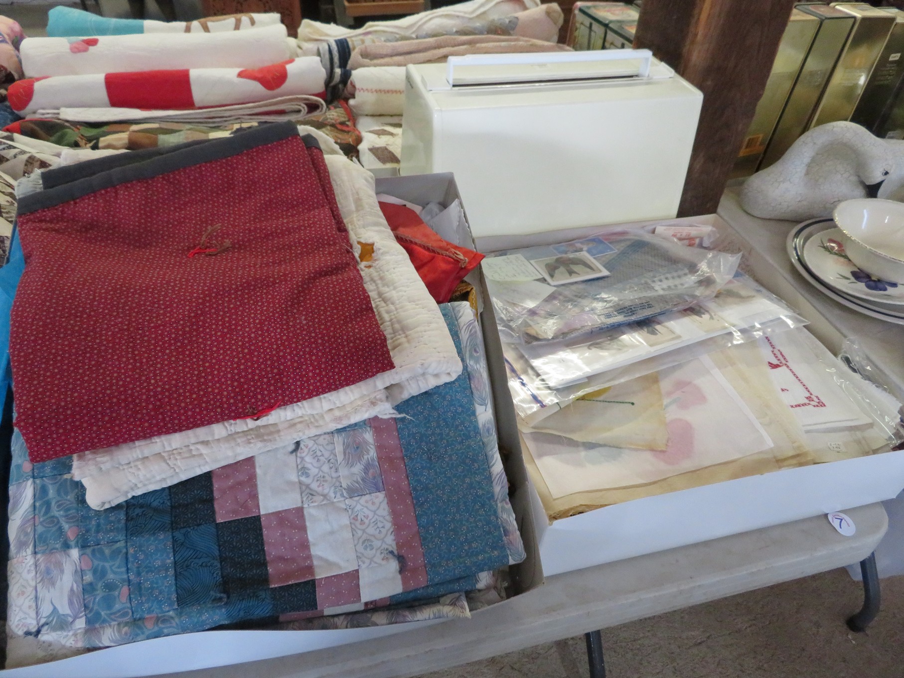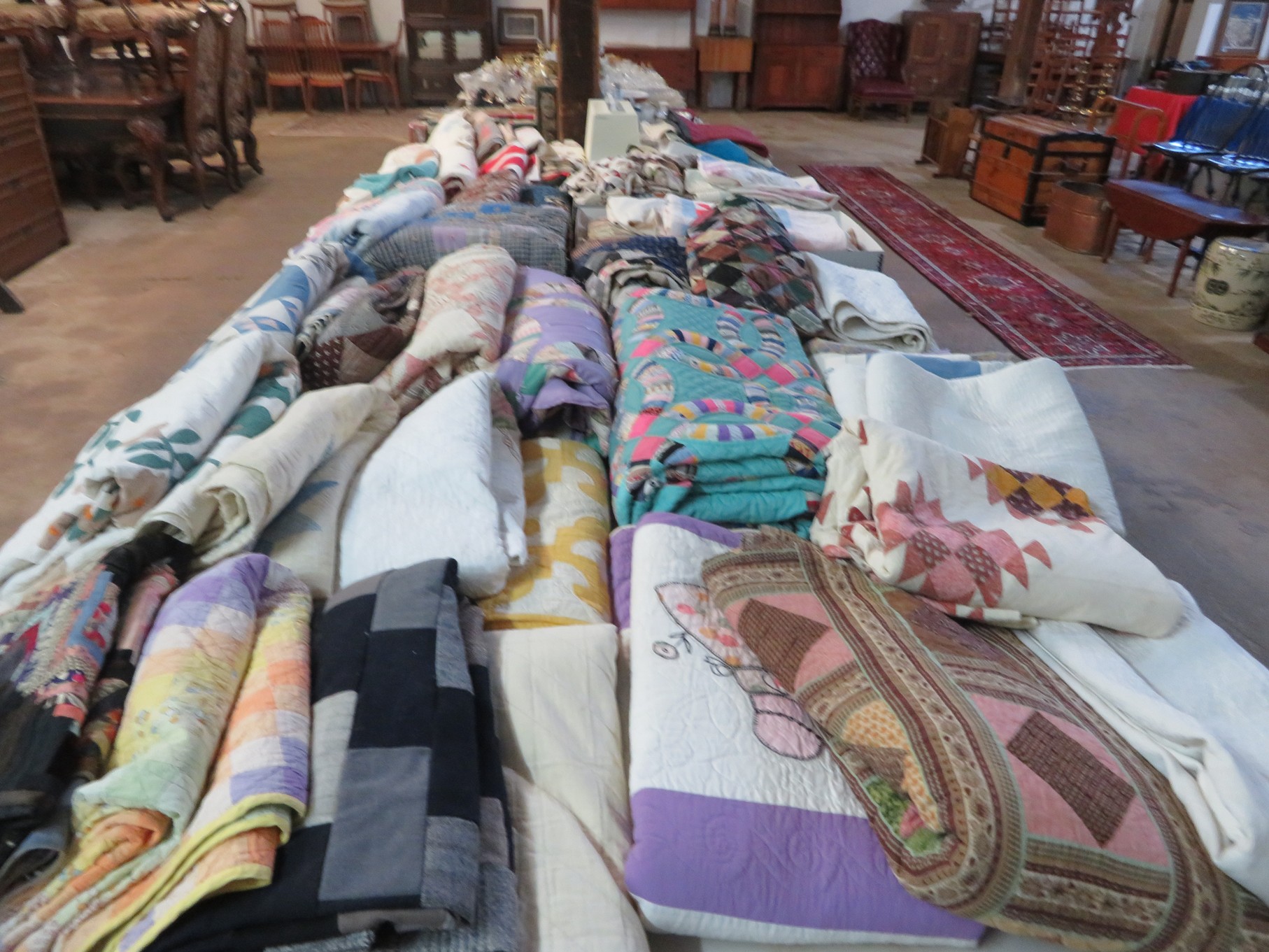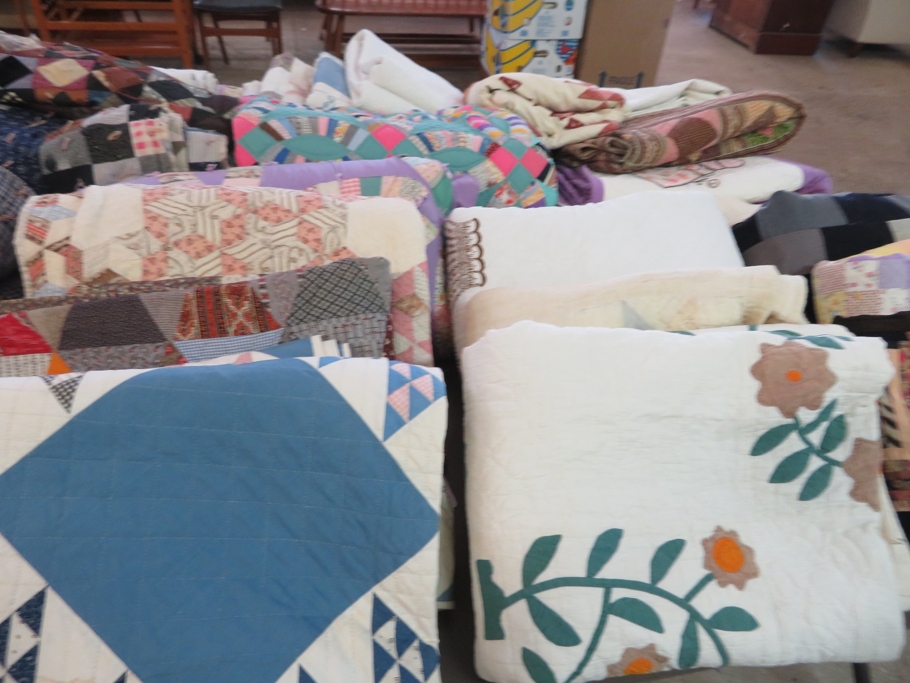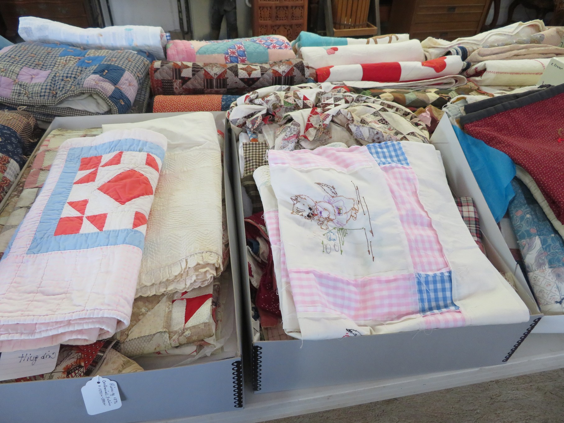 Old quilts; Holly Hobby quilt; Redwork quilt; Patchwork quilts; Applique quilts; Log Cabin quilt; Double Wedding ring quilt; Comforts; Dozens of old quilts! Quilt tops; Other old linens & embroideries; Sewing machine; Patio furniture; Drainage pipe; Floor fan; Garden statues; Long handled tools; Post hole diggers; Sledge; Rakes; Tiki torches; Small ladder; Hedge trimmers; Patio umbrella; Shovels; Brush ax; Lopers; Fishing poles; Wrought iron bench; Safes; Craftsman rolling tool chest; Sawzall; Stainless teel shelving; Dolly; Grinder on stand; Bird cages; Cooler; Wheelbarrow; Wooden keg; Galvanized tub; Trash can; Troy-bilt tiller & Much more!