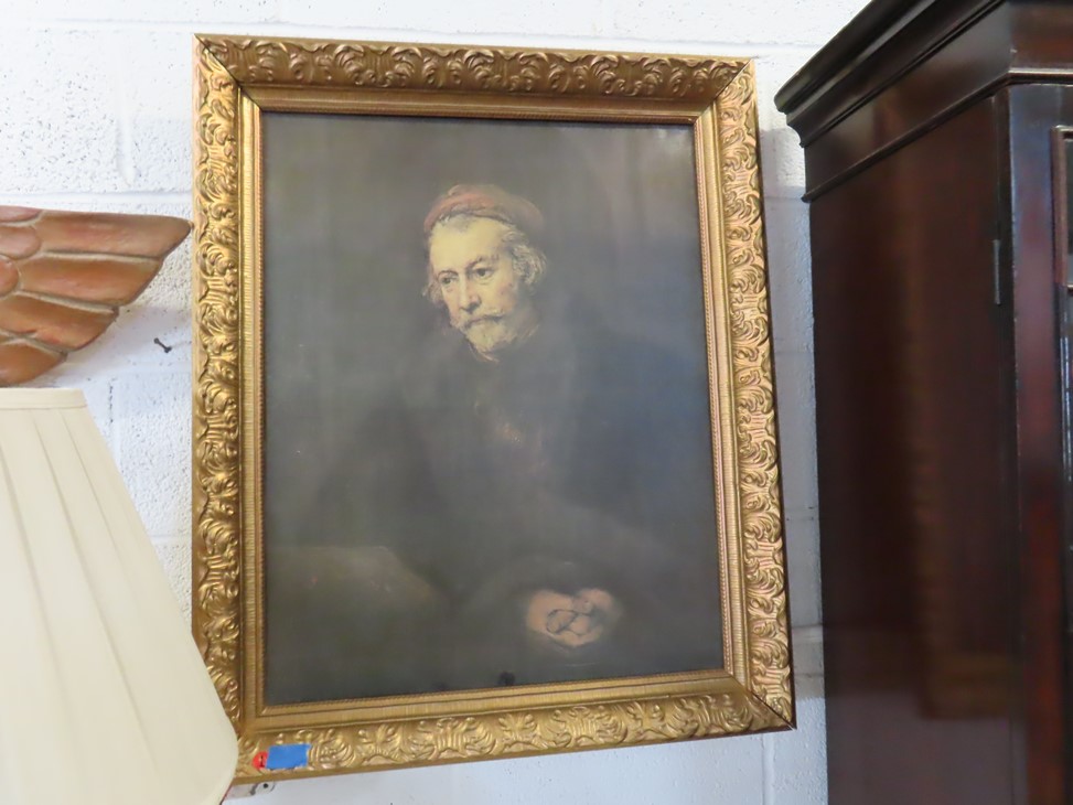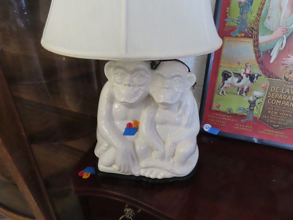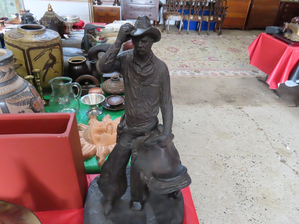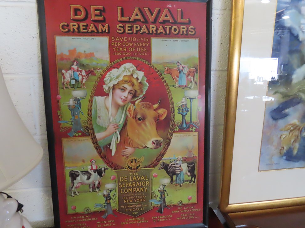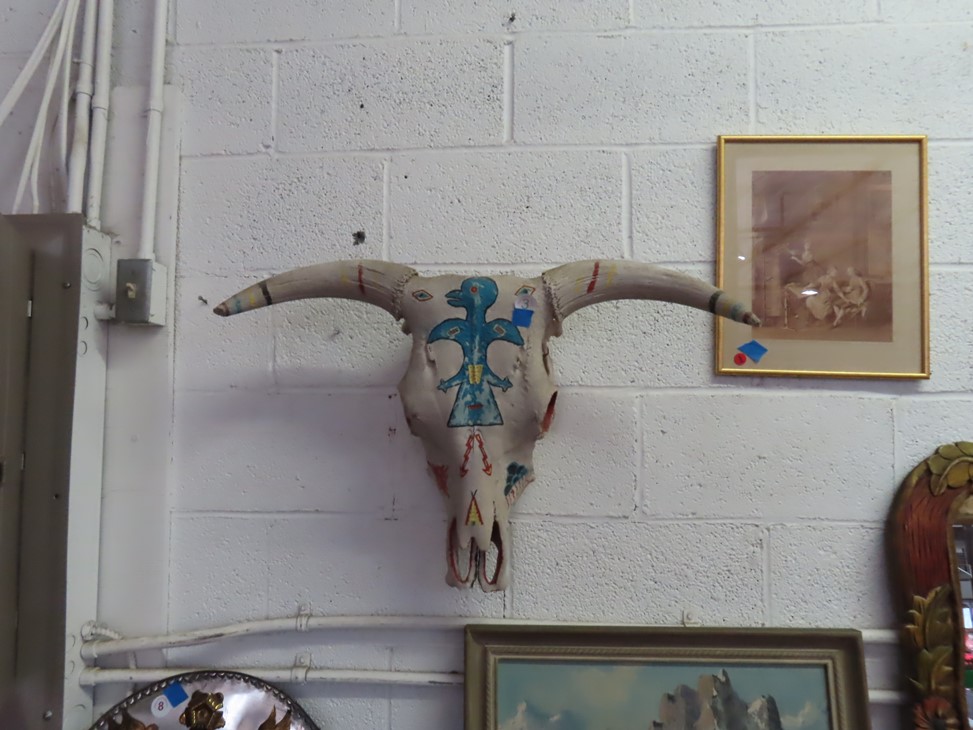 ART & SILVER: Wonderfully decorated cattle skull; Colorful print of ladies lounging (with paperwork); Sailing ship & rowboats artwork; Mountain scene; 3 cherub heads wall hanging; Large floor easel; Rembrandt style portrait; Framed; DeLaval advertising poster; Nice watercolor; Floral artworks; Original painting of young lady in ruffled collar with accent lamp; Colonial young man portrait; Sandalwood carving; Blanc de chine ballet dancers figurine; Dolphins carving; Winter moonlight scene; Mountain cabin scene; Buffalo, Bear & turtle carvings; Tabletop cowboy sculpture; Buddha; Angels; Lladro figures; Carousel horses; Nude statue; Giraffe; Tabletop size statues; Pewter candlestick pair; Silver creamer; Marmalade jars; Condiment set in holder; Serving pieces; Pitcher; Compotes; Bowls; Scallop tray; Trays; Compotes; Knife; Pewter steins; Gravy boat & much more!
