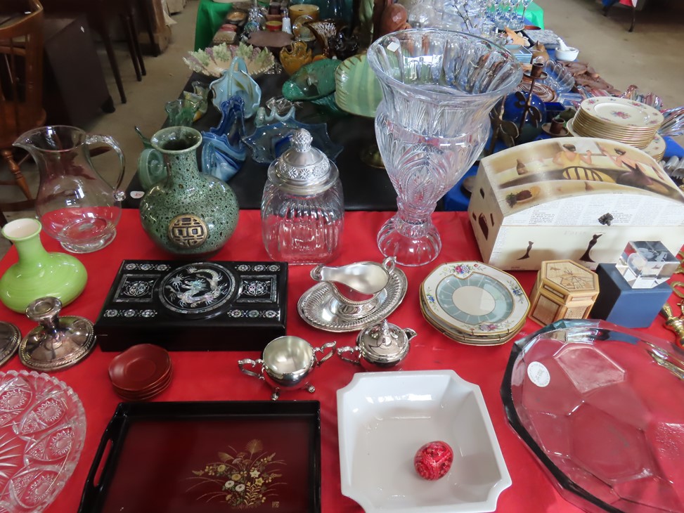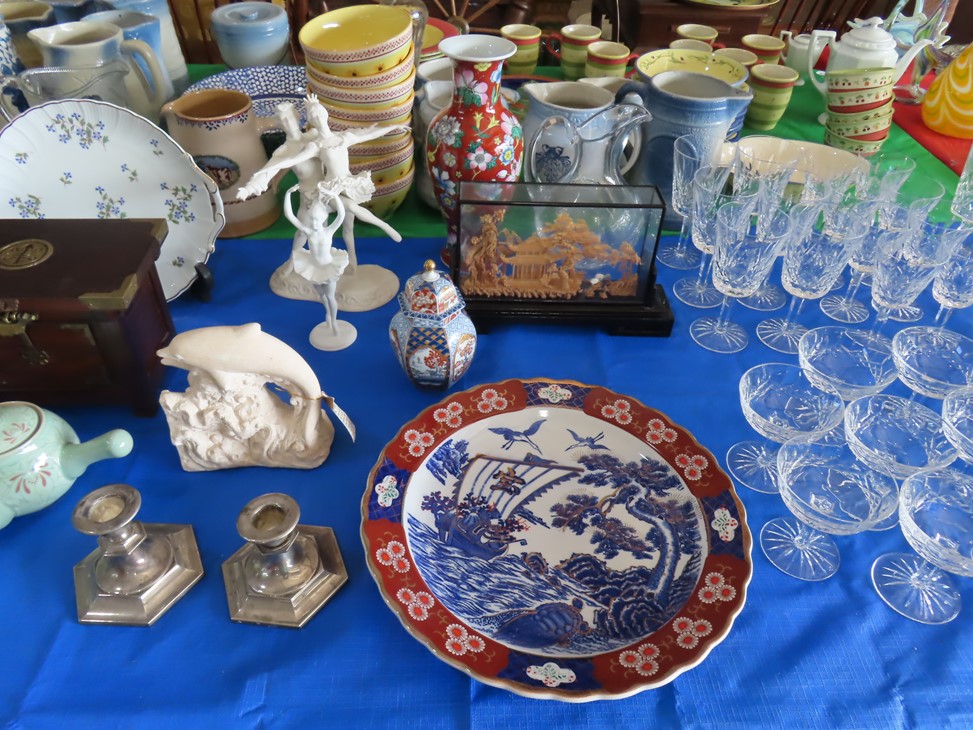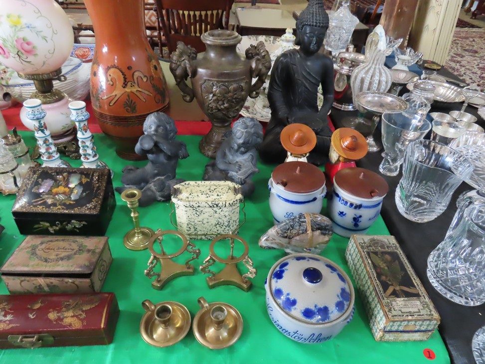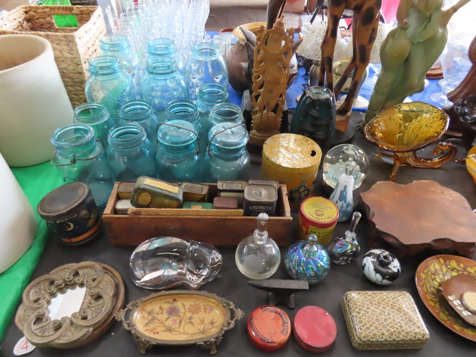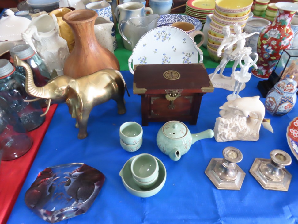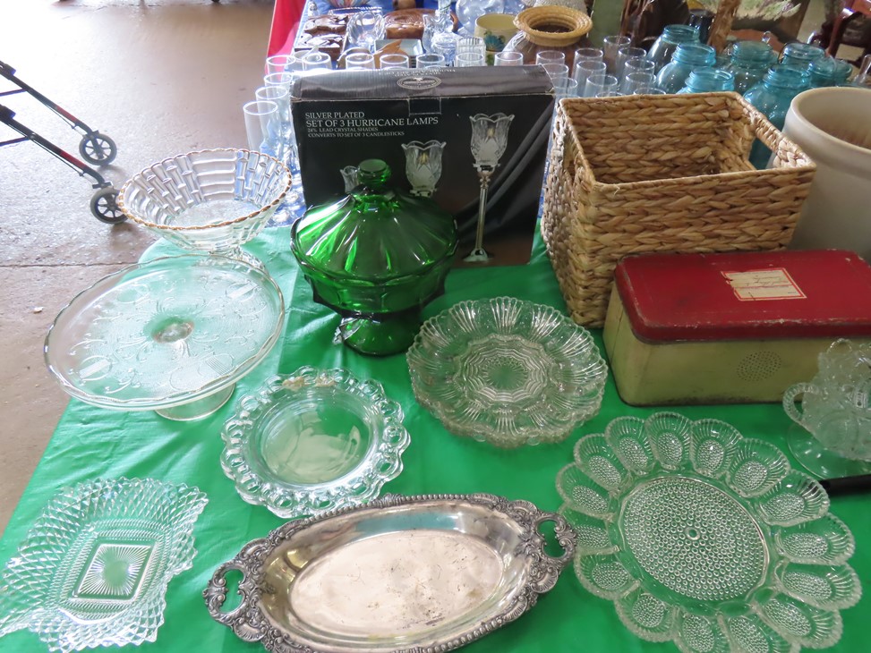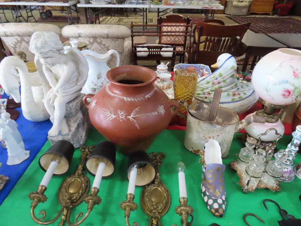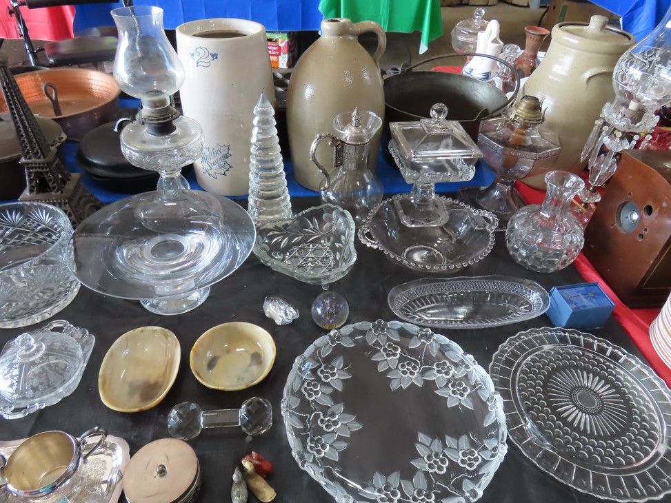 CHINA & GLASS: Lots of really nice Oriental ceramic table lamps; Large pair of Oriental vases; Red & blue Oriental charger; Blue & white stoneware pitchers; Yellow ware pitcher; Blue & white lard canister; Small lidded ginger jar; Tea set with offset handle teapot; Bennington glaze pitchers; Decorated pitchers; Large water pitchers; Cow & elephant figurines; Native American wedding vase; White tea set; Nice set of Turner’s Patent dishes; Ceramic shoe vase; Blue & white cheese dish with lid; Leaf dish; Studio pottery; Native American pots & bowls; Limoges France dinnerware; Porcelain candlesticks; Elephant garden seat; Cheese tray & knife; Collectible teacups & saucers; Washbowl & pitcher set; Belleek; Colorful dinnerware set with fruits & vegetables; Waterford clocks with boxes; Fine crystal cake stand; Pitcher; Conch shell paperweight; Sugar & creamer on tray; Lidded candy dish; Waterford stemware sets; Cambridge cordial stemware in purple glass; Colorful art glass pulled stem vases; Orange & white swirl ruffled edge vase; Crystal pitcher; Large art glass vase with arrangement; Cobalt spirit lamp; Crystal decanter; Red hurricane shade; Small pitcher; Electrified luster with prisms; Etched depression glass tidbit server; Etched depression bowl; Half cylinder glass bookends; Condiment set; Pyramid glass display case; Yellow depression; Egg plate; Green glassware; Hurricane lamps; Bowls; Perfume bottles; Knife rest; Oil lamp; Vases; Pitchers; Trays; Bowls; Cake plates; Candlewick and more!