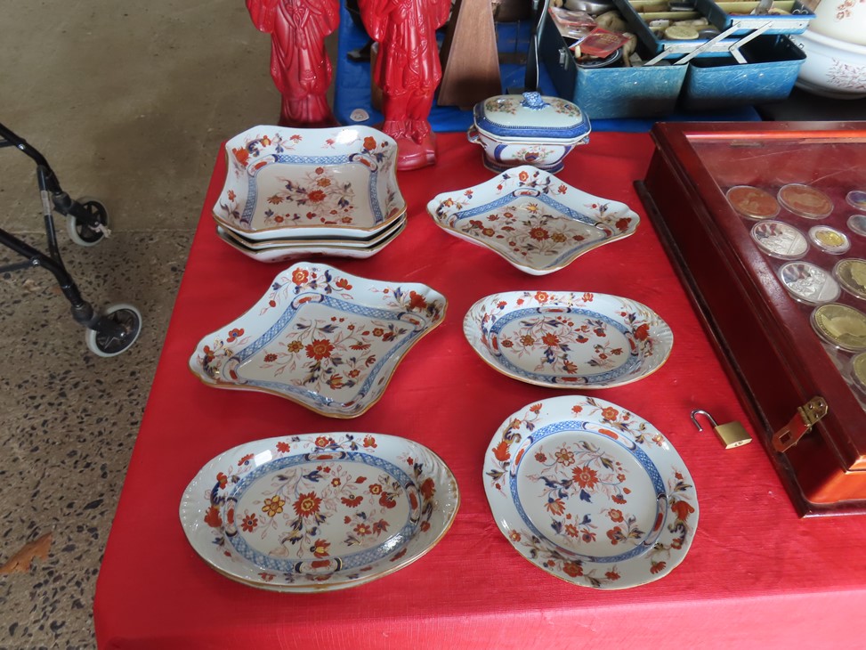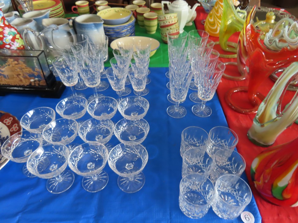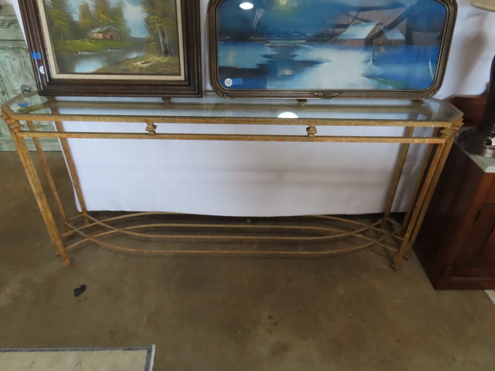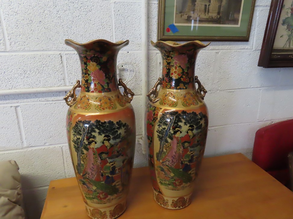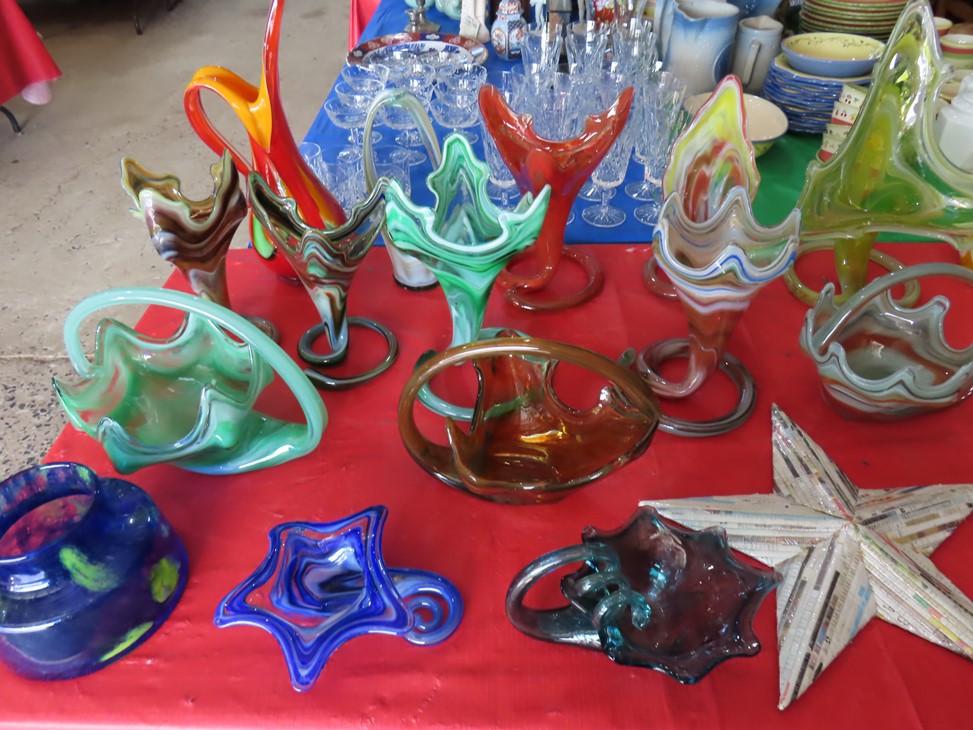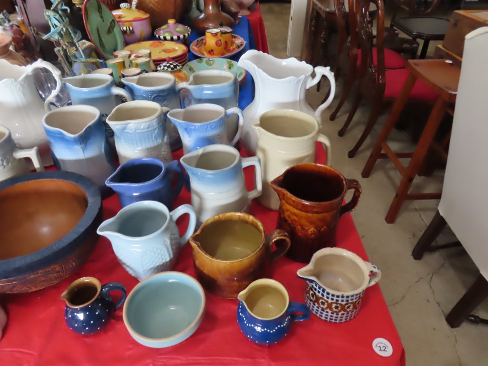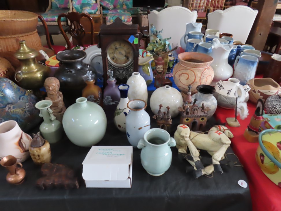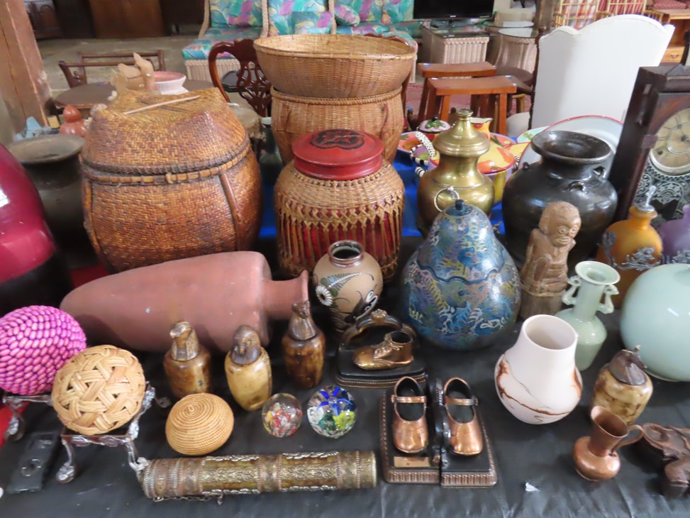 CHINA & GLASS: Lots of really nice Oriental ceramic table lamps; Large pair of Oriental vases; Red & blue Oriental charger; Blue & white stoneware pitchers; Yellow ware pitcher; Blue & white lard canister; Small lidded ginger jar; Tea set with offset handle teapot; Bennington glaze pitchers; Decorated pitchers; Large water pitchers; Cow & elephant figurines; Native American wedding vase; White tea set; Nice set of Turner’s Patent dishes; Ceramic shoe vase; Blue & white cheese dish with lid; Leaf dish; Studio pottery; Native American pots & bowls; Limoges France dinnerware; Porcelain candlesticks; Elephant garden seat; Cheese tray & knife; Collectible teacups & saucers; Washbowl & pitcher set; Belleek; Colorful dinnerware set with fruits & vegetables; Waterford clocks with boxes; Fine crystal cake stand; Pitcher; Conch shell paperweight; Sugar & creamer on tray; Lidded candy dish; Waterford stemware sets; Cambridge cordial stemware in purple glass; Colorful art glass pulled stem vases; Orange & white swirl ruffled edge vase; Crystal pitcher; Large art glass vase with arrangement; Cobalt spirit lamp; Crystal decanter; Red hurricane shade; Small pitcher; Electrified luster with prisms; Etched depression glass tidbit server; Etched depression bowl; Half cylinder glass bookends; Condiment set; Pyramid glass display case; Yellow depression; Egg plate; Green glassware; Hurricane lamps; Bowls; Perfume bottles; Knife rest; Oil lamp; Vases; Pitchers; Trays; Bowls; Cake plates; Candlewick and more!