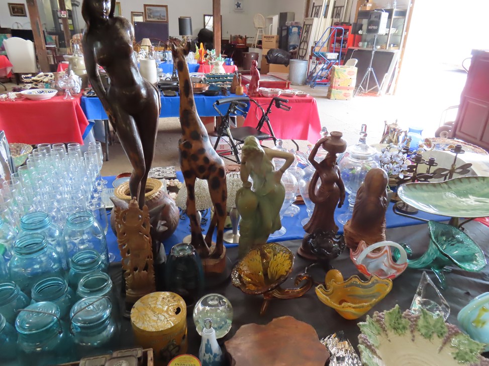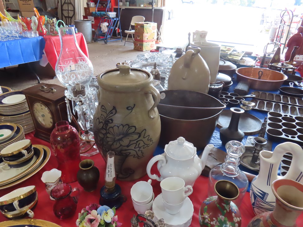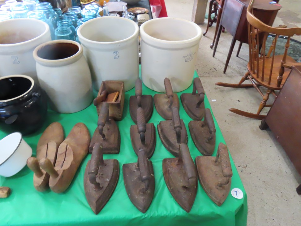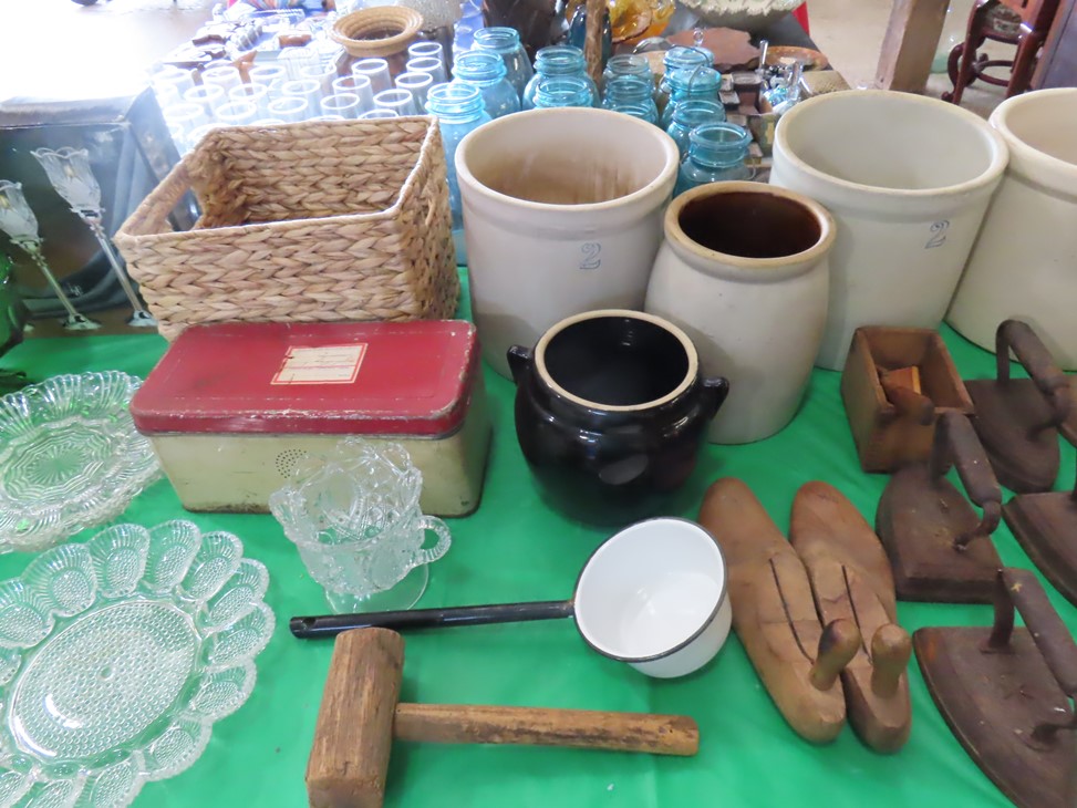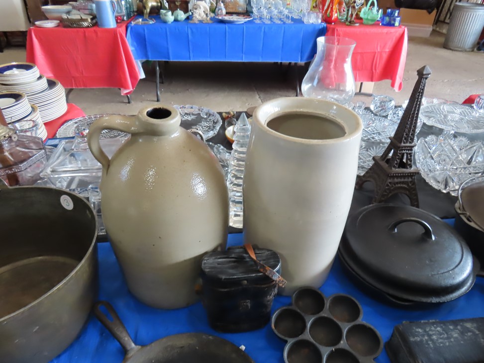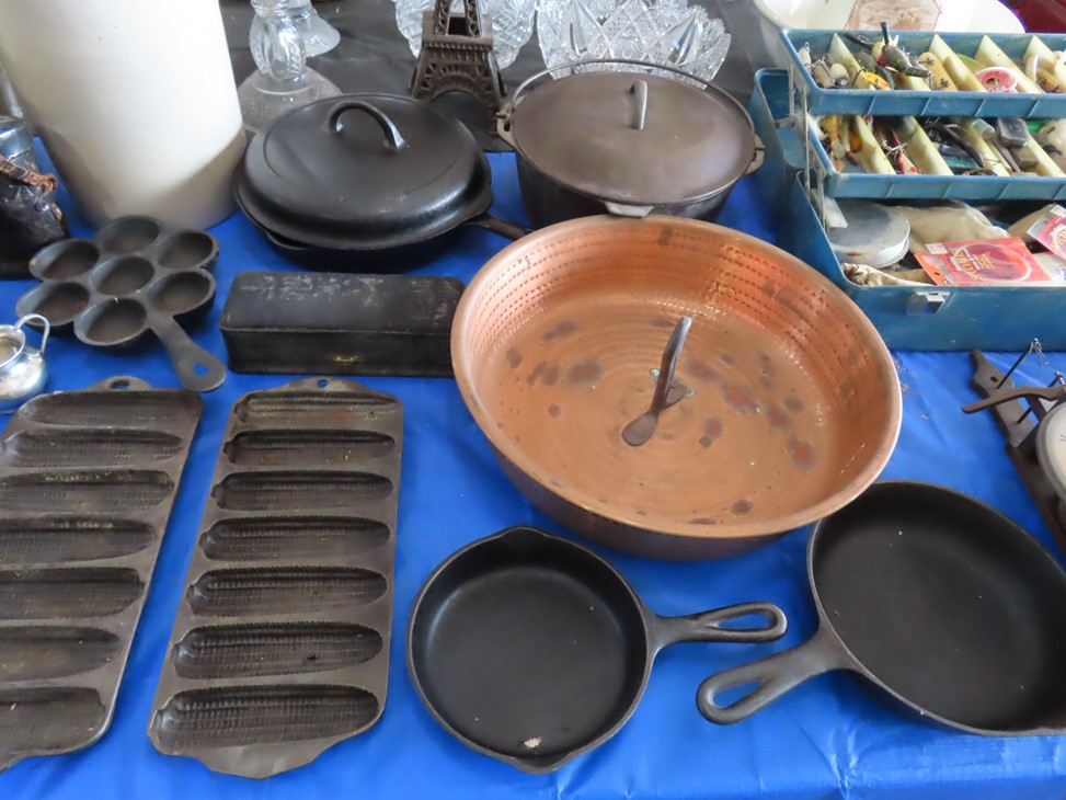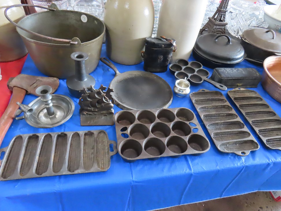 MORE: Nice stoneware crock with blue floral decoration; Stoneware jug; Crock; Brass trivets; Nesting doll; Sundial; Sun face wall hangings; Sad iron collection; Shoe molds; Enamel ware pot; Copper ham boiler; Brass firewood pot with feet; Small advertising tins; Wooden boxes; Mother of pearl inlay box; Oil lamp; Bose radio; Mask; Copper pitchers; Primitive drum; Fine & costume jewelry; Collectible currency; Coins; Cast iron duck boot scraper; Cast iron skillet with lid; Cast iron muffin pan; Cast iron Eiffel tower; Large brass pail with handle; Cornstick pans; Muffin tin; Griddle; Cooking kettle; Frying pans; Copper pan; Wooden masher; Pig doorstop; Chrome coffee pot; Cuisinart can opener; Hatchet; Sailing ship metal bookends; Tackle box & contents; Metronome; Brass candlesticks; Cutlery tray; Wooden cigar roller; Display box with barbershop mementos; Strop; Sad irons; Magnifying glasses; Tobacco tins; RR lantern; Mail holder; Serving tray; Army canteen; Helmet; Router bits; Heat gun; Hedge trimmer; Duck & Goose decoys; Memory Lane Dairy milk truck sign; Decorative star; Blue glass jars with bail & zinc lids; Cloisonne’ vases; Quilt; Trinket & keepsake boxes; Old toy trucks; Army soldiers; Old metal toy trucks; Toy cannons; Army trucks; Push mowers; Bicycles; Ladders; Spreader; Milk cans; Metal gas can; Craftsman snow blower; Edger; Stepladder; Kobalt workbench/tool chest; Lots of Great Outdoor furniture! Cast iron garden set; Teak patio table & chairs; Large patio table & chairs; set; Another teak seat with chairs, bench & table; Urn; Wrought iron set with oval table & chairs; Small hanging shelf; Hanging sun faces; Planters; Shelf units; Yard geese art; Porch rockers; Small tables; Bistro set; Set of 4 tall chairs; Decorations; Decorated bench; Tile top tables; Garden planters; Concrete planters; Garden statuary; and MUCH MUCH MORE!