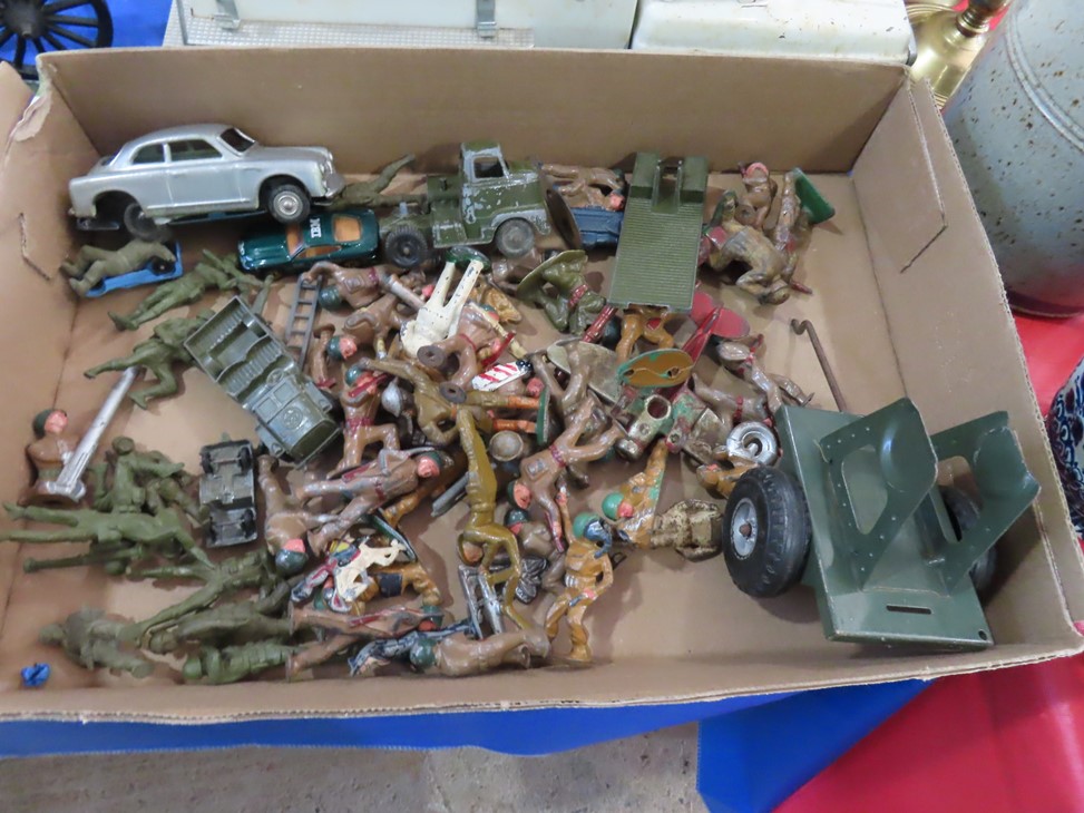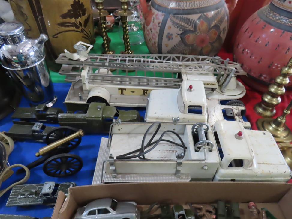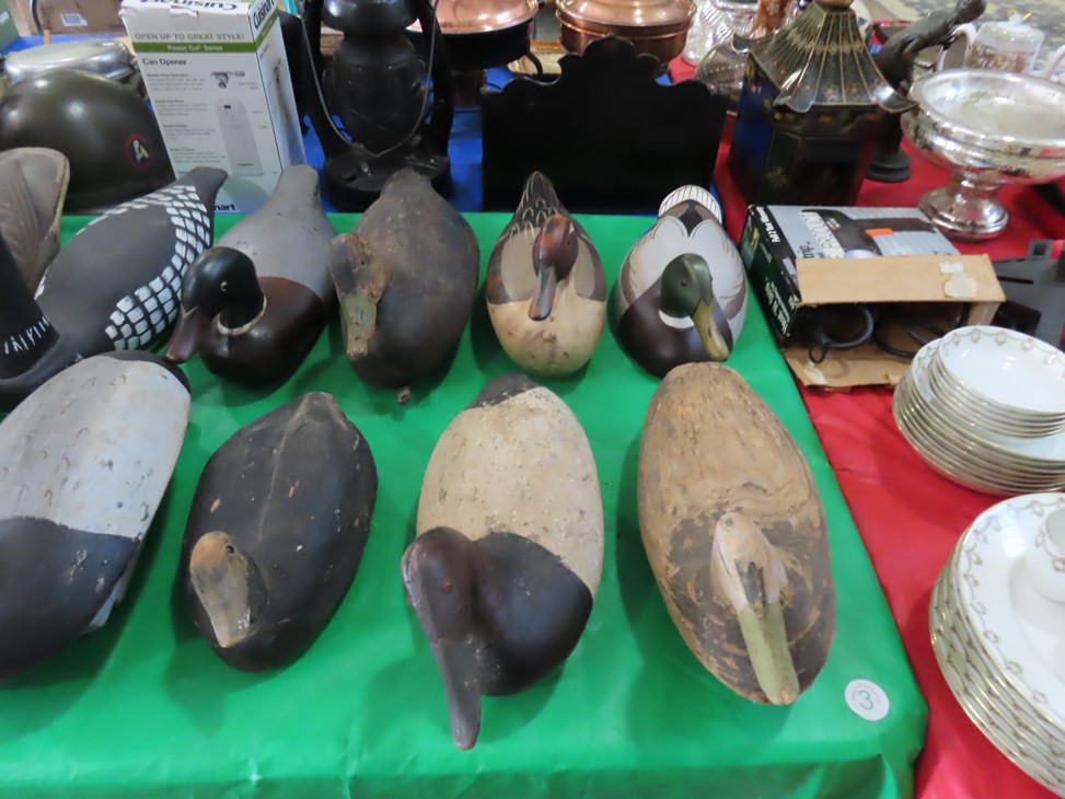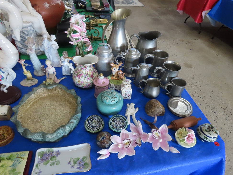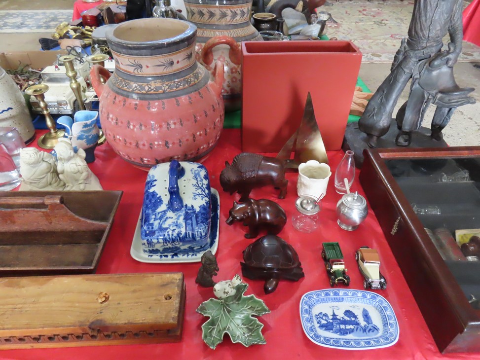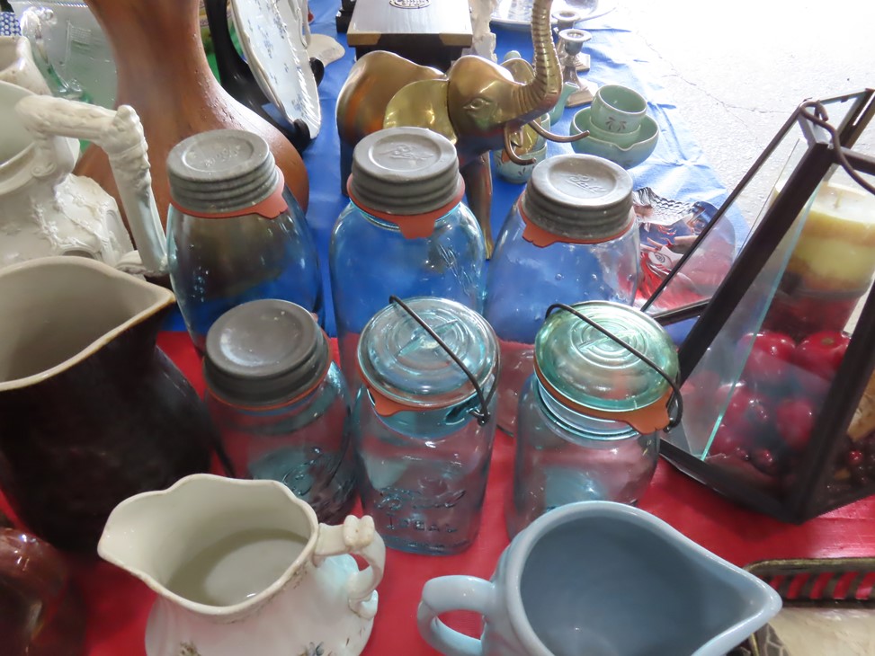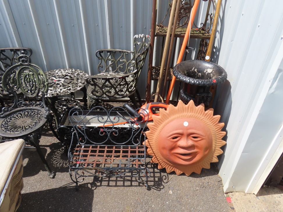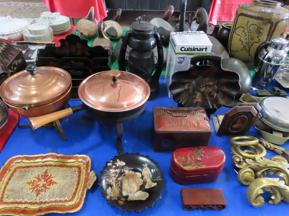 MORE: Nice stoneware crock with blue floral decoration; Stoneware jug; Crock; Brass trivets; Nesting doll; Sundial; Sun face wall hangings; Sad iron collection; Shoe molds; Enamel ware pot; Copper ham boiler; Brass firewood pot with feet; Small advertising tins; Wooden boxes; Mother of pearl inlay box; Oil lamp; Bose radio; Mask; Copper pitchers; Primitive drum; Fine & costume jewelry; Collectible currency; Coins; Cast iron duck boot scraper; Cast iron skillet with lid; Cast iron muffin pan; Cast iron Eiffel tower; Large brass pail with handle; Cornstick pans; Muffin tin; Griddle; Cooking kettle; Frying pans; Copper pan; Wooden masher; Pig doorstop; Chrome coffee pot; Cuisinart can opener; Hatchet; Sailing ship metal bookends; Tackle box & contents; Metronome; Brass candlesticks; Cutlery tray; Wooden cigar roller; Display box with barbershop mementos; Strop; Sad irons; Magnifying glasses; Tobacco tins; RR lantern; Mail holder; Serving tray; Army canteen; Helmet; Router bits; Heat gun; Hedge trimmer; Duck & Goose decoys; Memory Lane Dairy milk truck sign; Decorative star; Blue glass jars with bail & zinc lids; Cloisonne’ vases; Quilt; Trinket & keepsake boxes; Old toy trucks; Army soldiers; Old metal toy trucks; Toy cannons; Army trucks; Push mowers; Bicycles; Ladders; Spreader; Milk cans; Metal gas can; Craftsman snow blower; Edger; Stepladder; Kobalt workbench/tool chest; Lots of Great Outdoor furniture! Cast iron garden set; Teak patio table & chairs; Large patio table & chairs; set; Another teak seat with chairs, bench & table; Urn; Wrought iron set with oval table & chairs; Small hanging shelf; Hanging sun faces; Planters; Shelf units; Yard geese art; Porch rockers; Small tables; Bistro set; Set of 4 tall chairs; Decorations; Decorated bench; Tile top tables; Garden planters; Concrete planters; Garden statuary; and MUCH MUCH MORE!