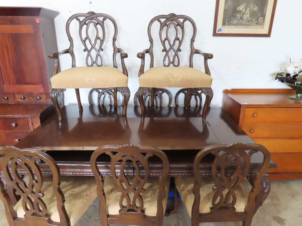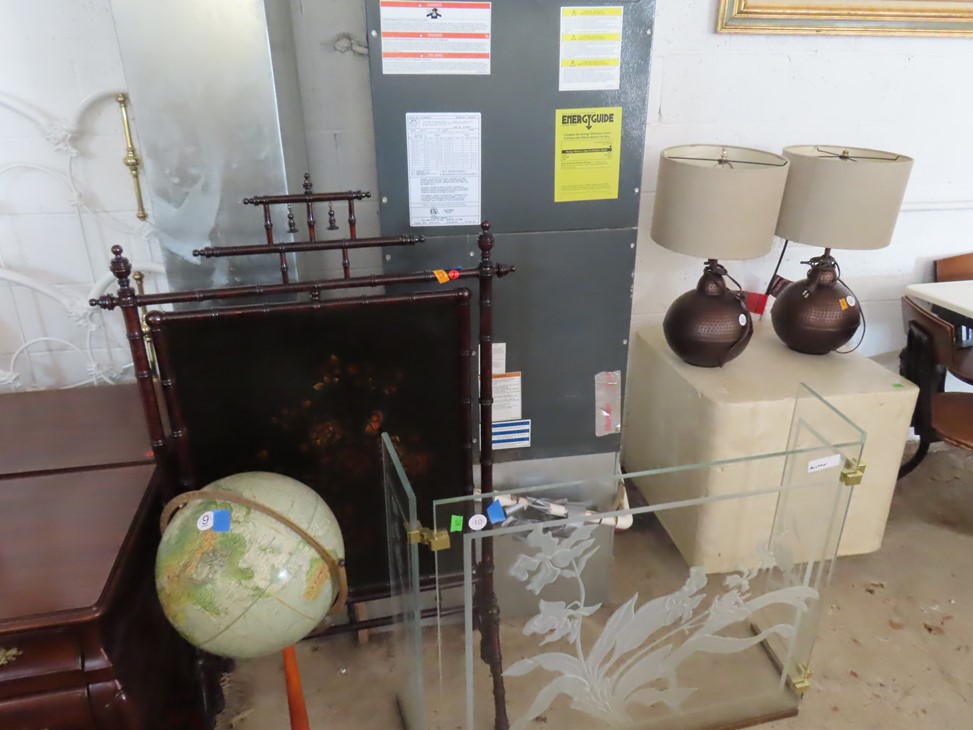 FURNISHINGS: Chest on chest with scallop shell carving; Fanciful display table with mirror; Oak bowfront china cabinet with wooden shelves; Nicely decorated dresser with floral painting, name and 1819 date; Large hall tree with storage seat; Old jelly cupboard; Cheval mirror; Set of 8 dining chairs; Glass top marble hall table; Stepback china cabinet with mullioned glass doors; Oak washstand with towel bar; 2 drawer spool cabinet; Corner cabinet; Cabinet with distressed paint; Good old 3 step-back cupboard with 6 drawers & blind doors; Dining room table with leaves & chairs; Chest on chest with unusual topper; Wonderful washstand with serpentine front & barley twist carvings; Leather recliner with power assist; Chest of drawers; Red leather recliner; Corner open bookshelf; Corner washstand; Chest of drawers with bun feet; Pair of 2 drawer end tables; 4 drawer chest with brass lion head pulls; Hickory Chair furniture; Serpentine front buffet; Rolling kitchen cabinet server with glass doors: Decorated hall cabinet; Glass top metal framed sofa table; Drexel; Dining room tables; Really nice 4 drawer chest; Another nice chest on chest; Fumed oak side by side wardrobe; Paymaster/sorting drop front desk; Great Oriental ceramic table lamps; Wall mirror in leaf decorated frame; Large wall mirror in metal frame with 8 panels; Large floor easel; Ceramic lamp of two monkeys and a pair of ceramic lamps with one monkey; Globe on stand; Marble top washstand; Pair of metal table lamps; Wall mirror with gold frame; Modern dining set; Pair of white ceramic lamps; Small glass door bookcase; Unusual step-back buffet with china display top; Nice dresser with mirror; Pair of bamboo chairs; Small tables; Wagon axle lamp; Flat screen TV; 2 pairs of upholstered chairs; Brass room brazier; MCM footstool; Needlepoint footstool; Fern table; Spinning wheel; Rocking chair; Sconces; Parlor lamp; Trunk; Planter stand; Club chair; Barstools; Set of stacking bamboo trunks; Clore footstool; Quilt racks; Traveling trunk; End tables; Needlepoint vanity seat; Room screens; Drop side end table pair; Coffee table; Nightstands; Ottoman; Wall clock with mother of pearl inlay; Large fishbowl planters; Martha Washington sewing stand; Decorator accents; Baskets; Table with integral swing-out seats; 3 piece Victorian parlor set; Two seat school desk; Stone cube table; Glass fireplace surround with etched orchid; White iron bed with brass accents; Fireplace screen; Really nice large Oriental rugs; Small carpets & runners; 9 piece wicker sunroom set with cushions; Several large sets of patio furniture including teak, cast iron, wrought iron & more; Outside planters, urn, garden art and much, much more!