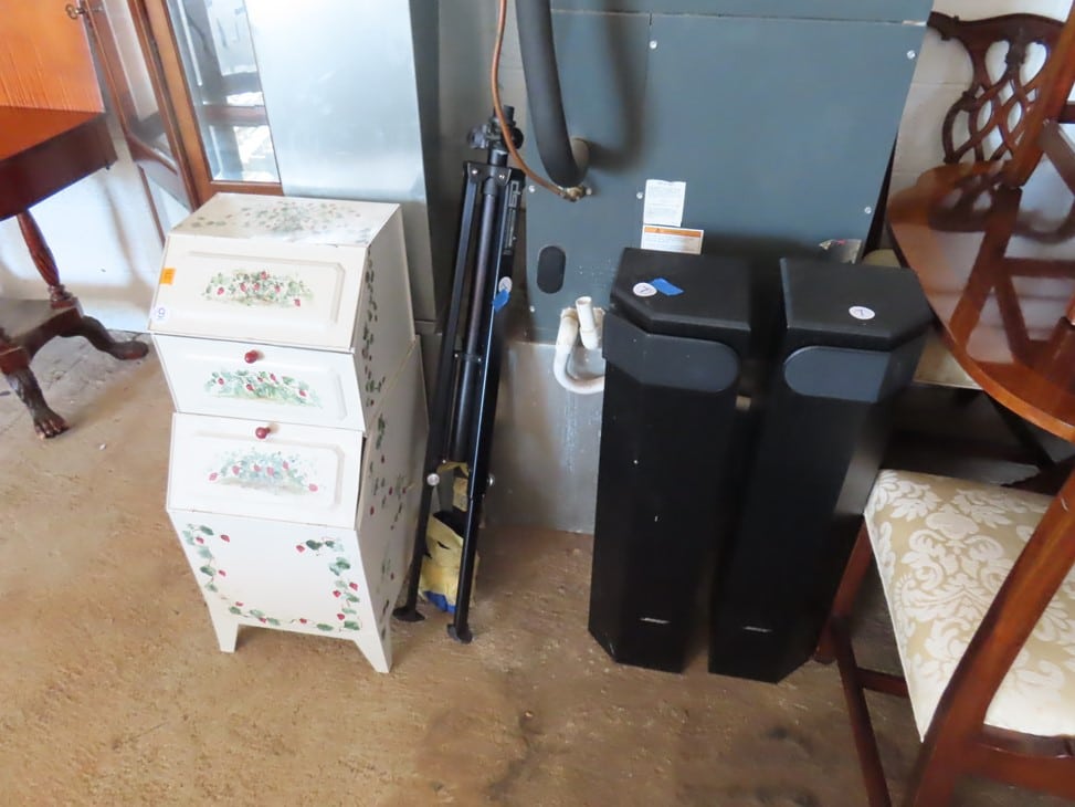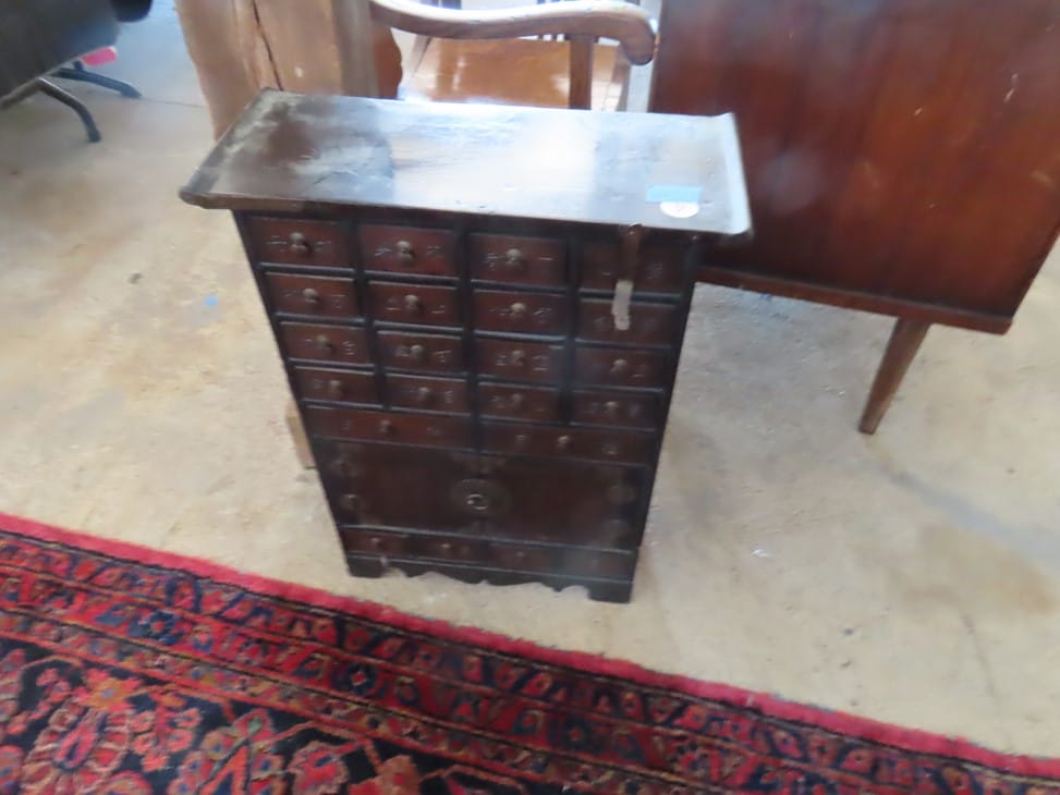 FURNISHINGS: Really super nice seed cabinet! Early pierced 8 tin pie safe; Bowfront china cabinet; Baker dining table & chairs; Stickley dining table with leaf & 6 chairs; Wonderful set of 8 Stickley dining chairs; Splendid early server; Wide board top table; Impressive hall tree with large mirror; Bar cabinet with super nice veneering; Mirrored cabinet; Another super nice bar; Pair of white modern design love seats; Gaming table with wonderful paw feet; Display top table (including rare glass sides); Nicely inlaid pair of round end tables by Baker; Standout cobbler’s bench with storage drawers; Small Pennsylvania Dutch decorated box; Oriental apothecary chest; Double-sided waiting room bench; MCM desk; Leather reclining seating group; MCM end table; MCM nightstand; MCM sofas; Metal bar stools; Floor lamp; Deks with cabriole legs; Chest of drawers with brass pulls & corners; Drop leaf table; Gentleman’s dresser; Pair of upholstered club chairs; Tater & onions cabinet with painted strawberries; Blanket boxes with carved Oriental scene on top; Bed steps; Ottoman; Piecrust edge side table; Hoop back chair; Hitchcock painted rush seat chair; Blue & white elephant garden seat; Throne seat with carved goblin face; Serpentine front banded edge hall table; Chest on chest; Stacking bookcase; Dresser; Quilt rack; Victorian high-back bed; Flip open dining table; Shaving mirror; Decorative newel post; Upholstered chair pair; Pair of padded footstools; Red office chair; Rush seat stools; Pair of unusual corner seats; Nice padded, wooden arm office chair; Yarn winder; Jewelry armoire; Double shelf side table; Hummingbird decorated dresser with matching hanging mirror; Grandfather clock with visible pendulum; Trestle coffee table; 4 drawer chest; Open bookcases; 3 drawer desk; Pair of swivel bar seats & high-top table; Hall tables; Nice pair of Oriental ceramic table lamps; Umbrella; stand with lots of assorted canes; Rocking chair; Rattan chair; Bucket bench; Lots of occasional tables; Chairs of all sorts; Old tool cabinet; Metal lamp with cut out howling wolf; Large crystal lamp; Fine Oriental rugs and carpets; Table lamps with leaded glass shades; Patio furniture; Chandeliers; Hanging lights; TVs; Murphy bed; Brass andiron set; Patio furniture; Tile top table; Lounge chairs and much, much more!