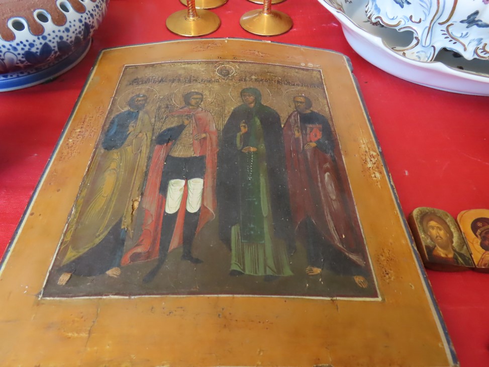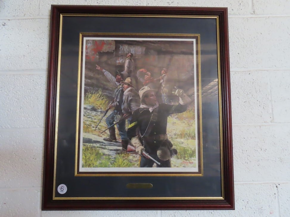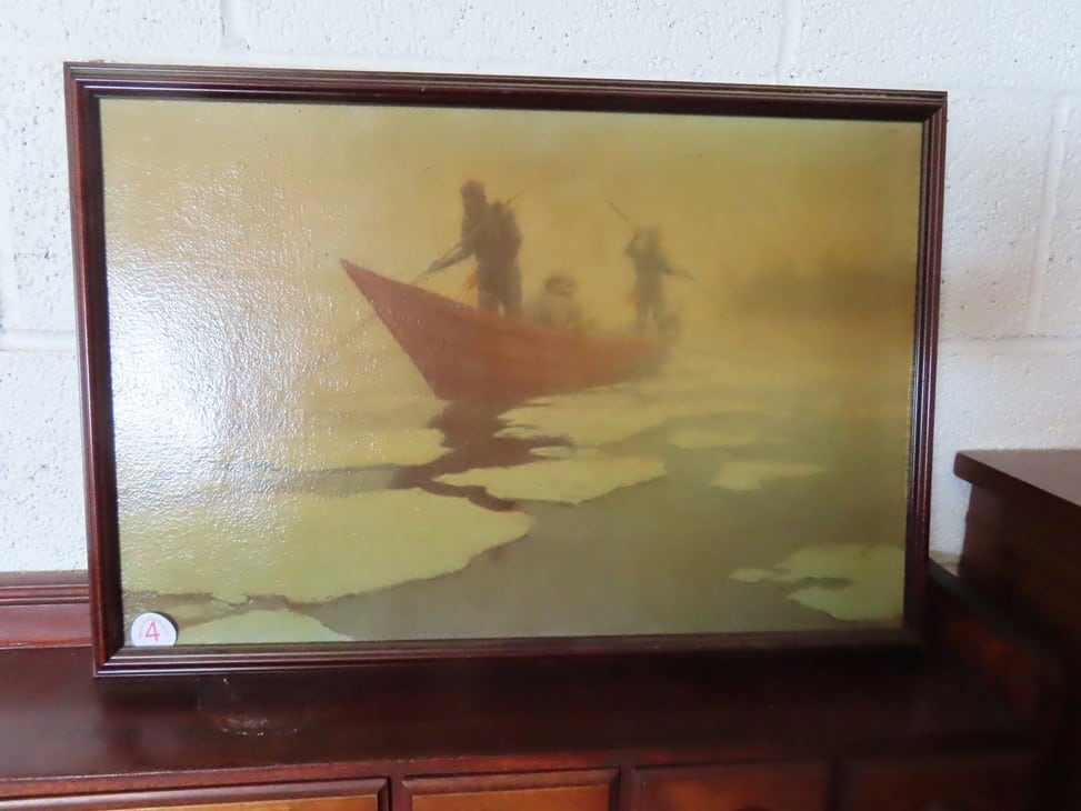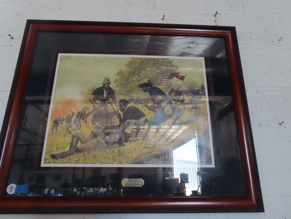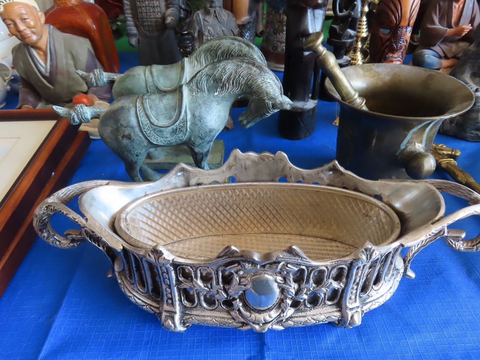 ART & SILVER: Old framed map of Virginia; Buffalo soldiers print; Civil War print “A Day of Honor”; Negro Baseball Leagues framed poster; Pheasant’s print; Bird dog’s print; Remington! Men in boat with ice floes print; Men in birch-bark canoe print; Scenic bridge over creek artwork; Fruit still life in super ornate frame; Political cartoon; Sailing schooner artwork; Icons; Stone carving in shadow box; Hillbilly gnome carvings; Large icons; Small icon triptych; Bone carving; Jade carvings; Multiple image icons; Brass horses; Indonesian carving of man & woman; Soapstone carving of mother & child in backpack; Chinese tomb warrior statues; Oriental wise men statues; Ornate silver centerpiece holder; Silver candlesticks; Flatware sets; Trinket box; Single ashtray; Candlesticks; Serving tray; Salt & pepper shakers; Compotes; Candelabra; Pitcher; Coffee pot; Covered serving dish & much more!