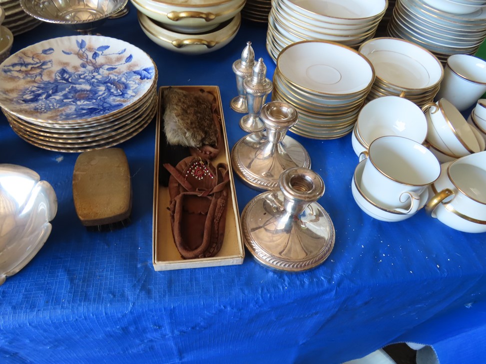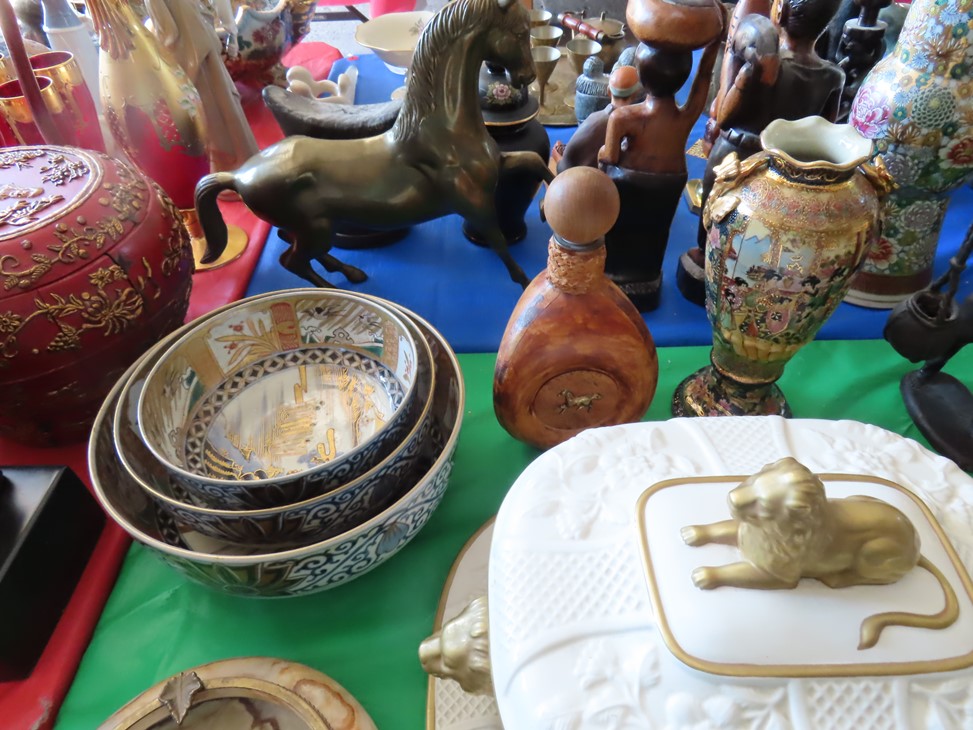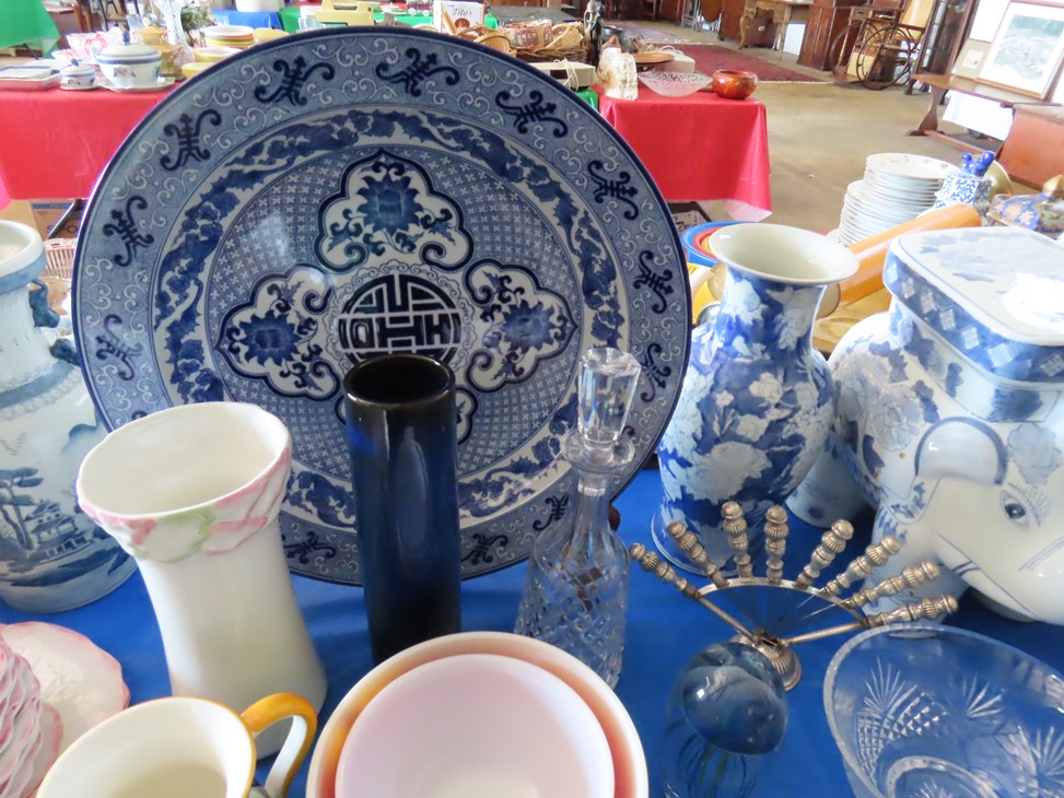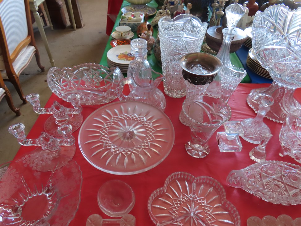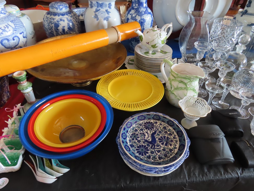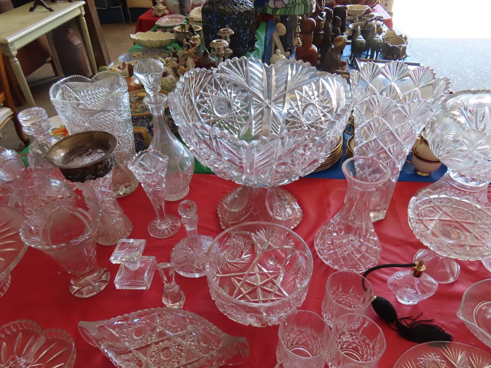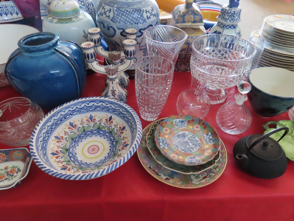 CHINA & GLASS: Oyster plate set; Jefferson pattern dinnerware set by Lenox; Lladro figurines; Large lidded tureen with underplate and lemon finial; Pair of floral decorated vases; Royal Doulton figurines; Dresden figures; Sake set in box; Large ewer with gold accents; Capodimonte flowers; Blue & white pierced ceramic censer; Large bowl with gold edging and great decorating; Ginger jar with lid; Cheese keeper; Footed bowl; Coffee set with flower sprigs; Colorful soup tureen; Set of nested decorated bowls; Really nice covered serving tureen with underplate and lion finial; Serving tray; Lenox; Blue & white chargers; Blue & white vases; Teapots; Covered bowls; Trinket boxes; Elephant garden seats; Lots more blue & white ceramics; Lots of ginger jars; Large bowls; Urns; Candelabras; Native American & Mexican pottery; Butter keeper; Fine dinnerware set; Hummels; Wedgwood; Ice bucket; Wedgwood Queen’s ware set; Teapot set; Sets of plates; Mugs; Rose Medallion cup & saucer; Two tables of Pyrex glass! Cinderella bowl set; Casseroles with lids; Mixing bowls; Square serving bowl; Cereal bowls; Rectangular baking dishes; Butter dish; Lots of different patterns; Ruby red square dishes; Cobalt glasses; Etched stemware sets; Really neat art glass ashtray; Large crystal biscuit jar; Waterford crystal; Red glass tall decanter and glasses set with enamel flowers and lots of gold overlay; Large crystal vase; Powder jar; Reamer; Leather covered decanters; Orange glass ashtray; Lots & lots of good crystal! Nappy, Punch bowl, Vases, Tumblers, Perfume atomizer, Cruets, Celery dish, Candelabras, Knife rests, Cake plate & lots more! Pink Depression glass bowl; Opalescent ruffled edge bowl & tumblers; Iris & Herringbone bowl; Etched glassware; Paperweight; Glass apple; Cake stands; Red cut to clear stemware; Green glasses with gold overlay and more!