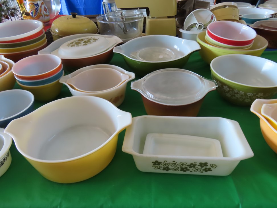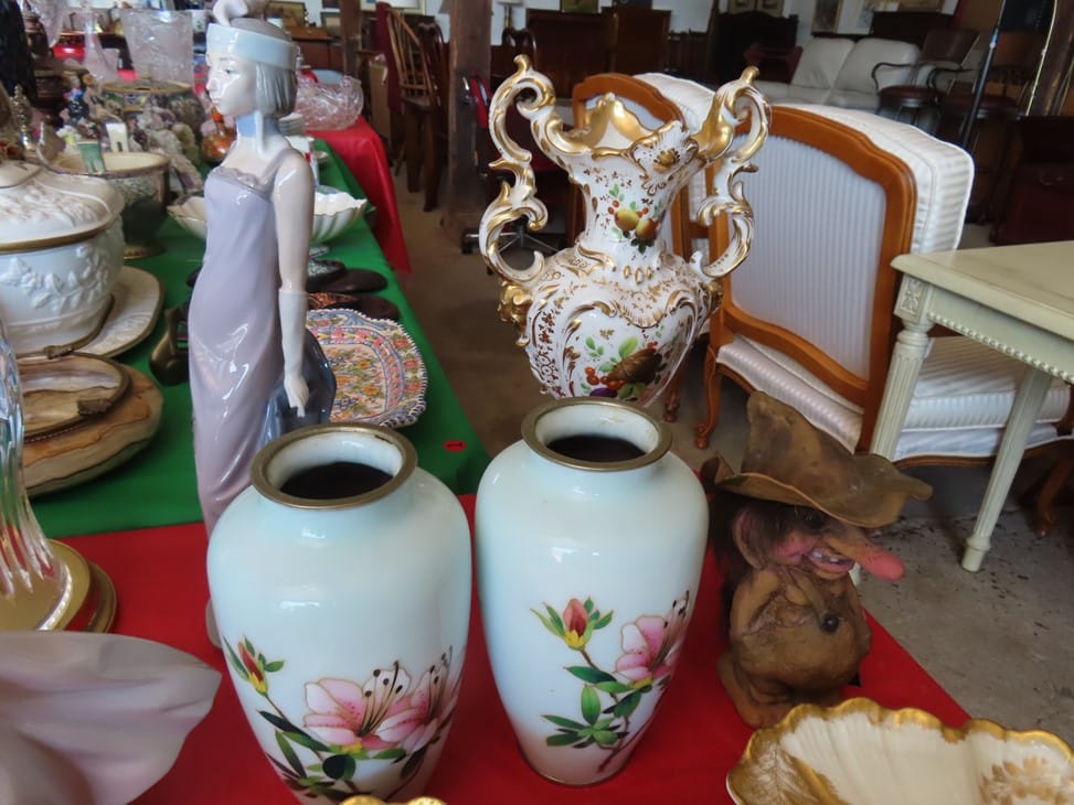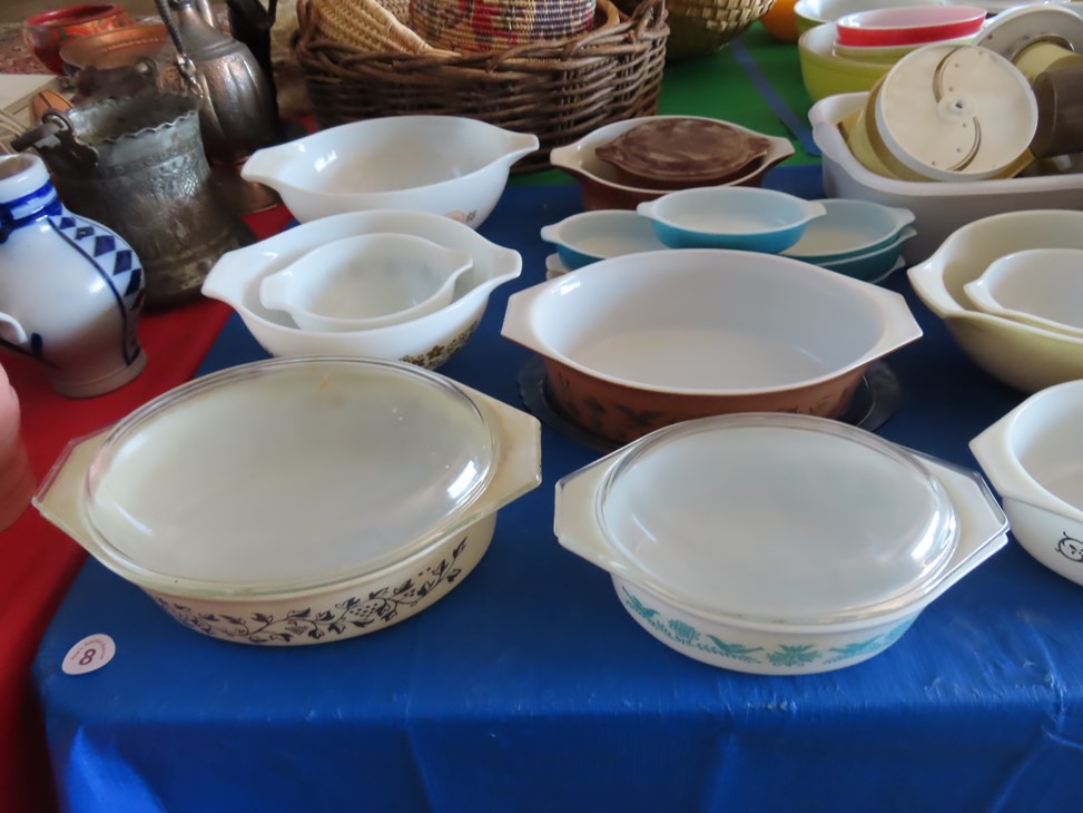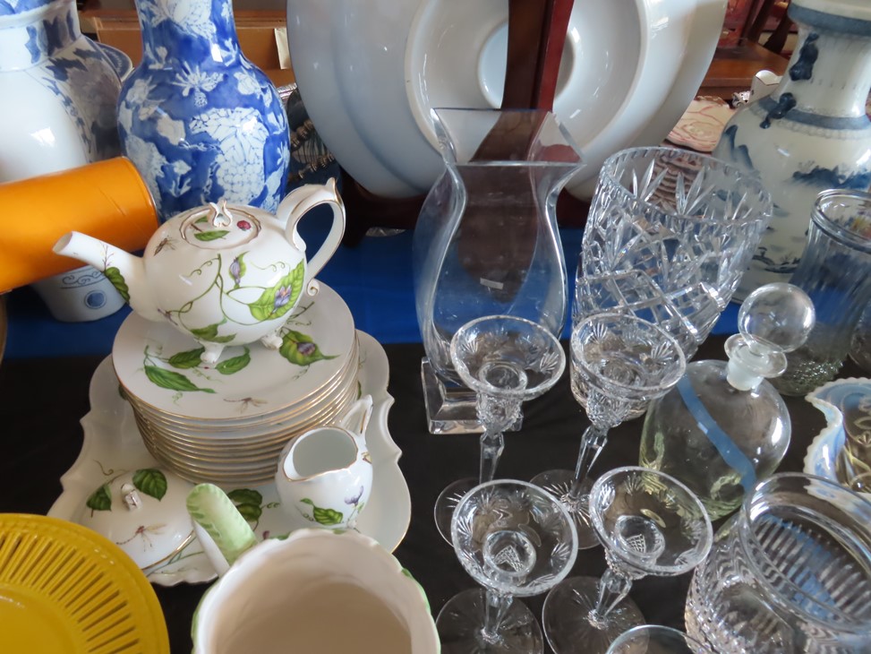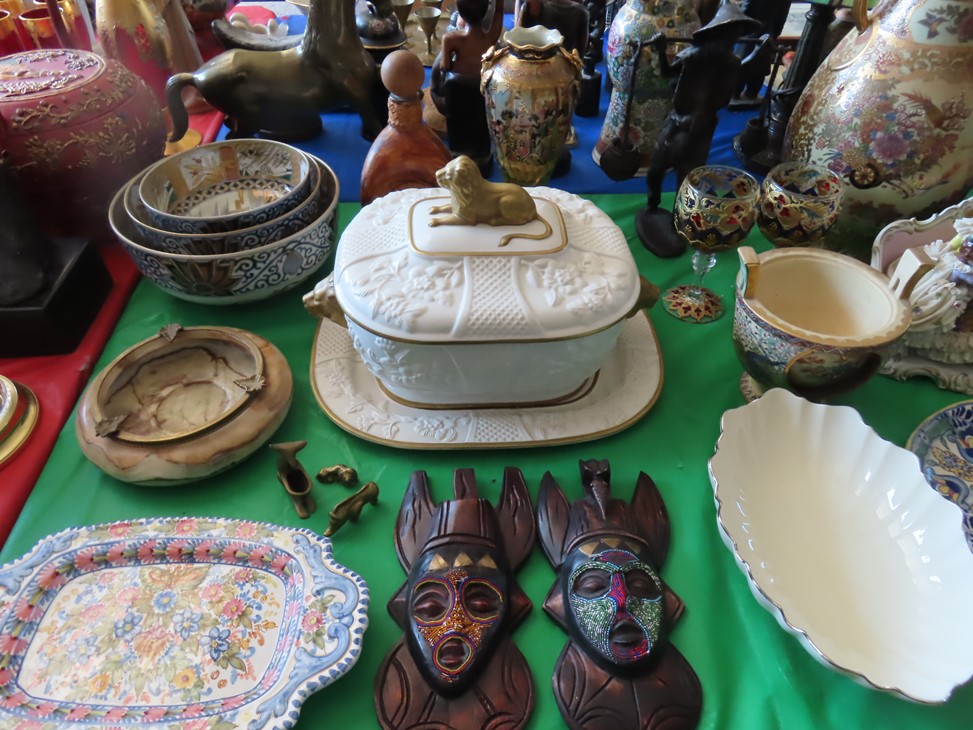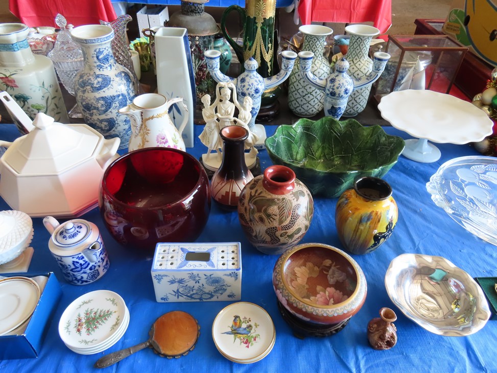 CHINA & GLASS: Oyster plate set; Jefferson pattern dinnerware set by Lenox; Lladro figurines; Large lidded tureen with underplate and lemon finial; Pair of floral decorated vases; Royal Doulton figurines; Dresden figures; Sake set in box; Large ewer with gold accents; Capodimonte flowers; Blue & white pierced ceramic censer; Large bowl with gold edging and great decorating; Ginger jar with lid; Cheese keeper; Footed bowl; Coffee set with flower sprigs; Colorful soup tureen; Set of nested decorated bowls; Really nice covered serving tureen with underplate and lion finial; Serving tray; Lenox; Blue & white chargers; Blue & white vases; Teapots; Covered bowls; Trinket boxes; Elephant garden seats; Lots more blue & white ceramics; Lots of ginger jars; Large bowls; Urns; Candelabras; Native American & Mexican pottery; Butter keeper; Fine dinnerware set; Hummels; Wedgwood; Ice bucket; Wedgwood Queen’s ware set; Teapot set; Sets of plates; Mugs; Rose Medallion cup & saucer; Two tables of Pyrex glass! Cinderella bowl set; Casseroles with lids; Mixing bowls; Square serving bowl; Cereal bowls; Rectangular baking dishes; Butter dish; Lots of different patterns; Ruby red square dishes; Cobalt glasses; Etched stemware sets; Really neat art glass ashtray; Large crystal biscuit jar; Waterford crystal; Red glass tall decanter and glasses set with enamel flowers and lots of gold overlay; Large crystal vase; Powder jar; Reamer; Leather covered decanters; Orange glass ashtray; Lots & lots of good crystal! Nappy, Punch bowl, Vases, Tumblers, Perfume atomizer, Cruets, Celery dish, Candelabras, Knife rests, Cake plate & lots more! Pink Depression glass bowl; Opalescent ruffled edge bowl & tumblers; Iris & Herringbone bowl; Etched glassware; Paperweight; Glass apple; Cake stands; Red cut to clear stemware; Green glasses with gold overlay and more!
