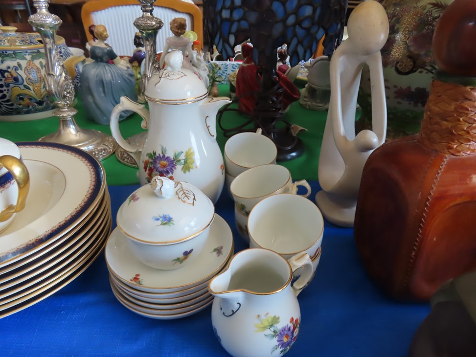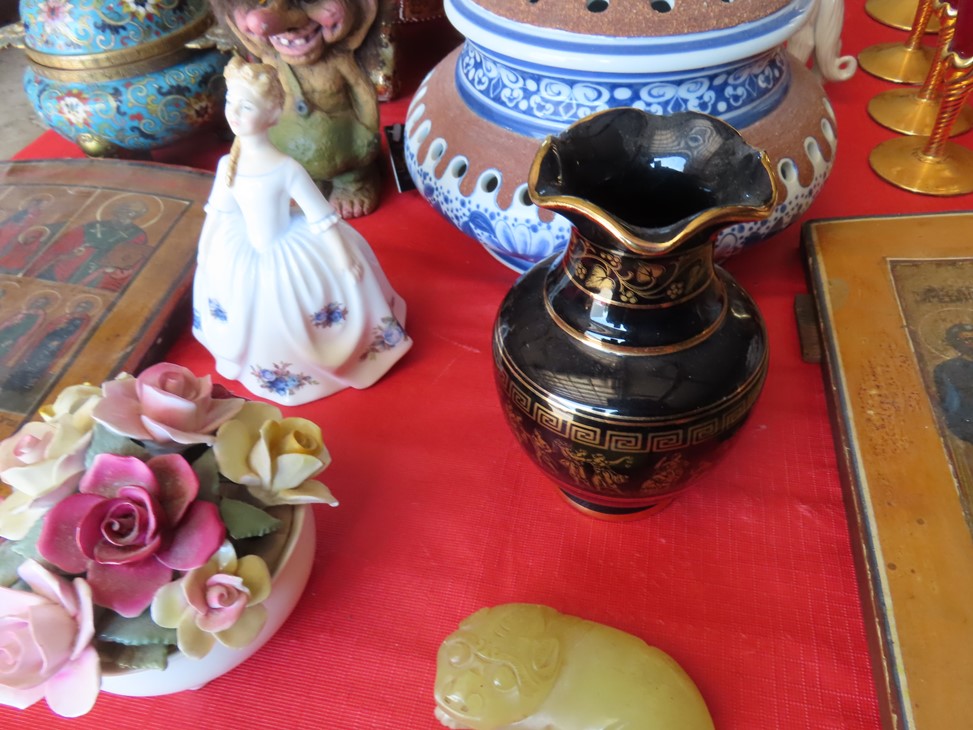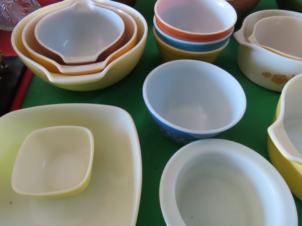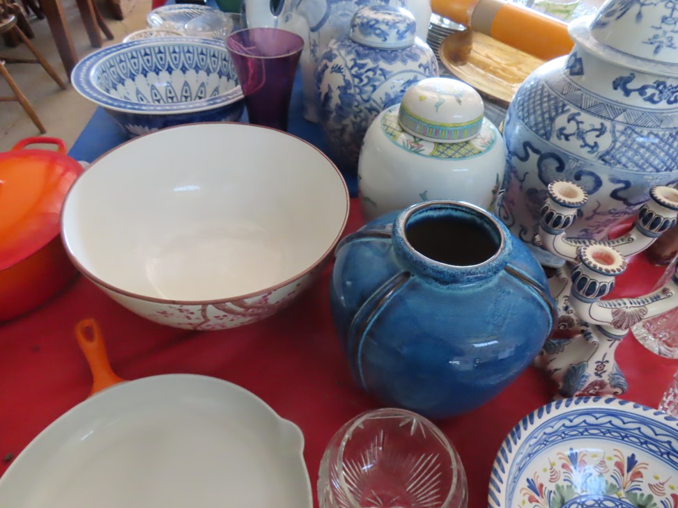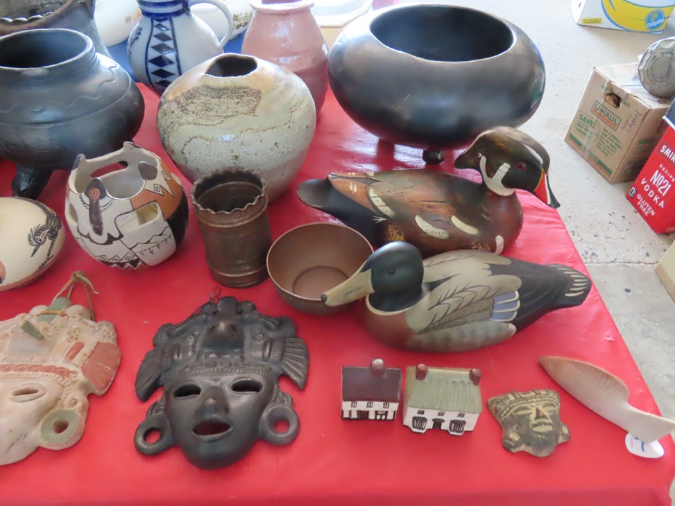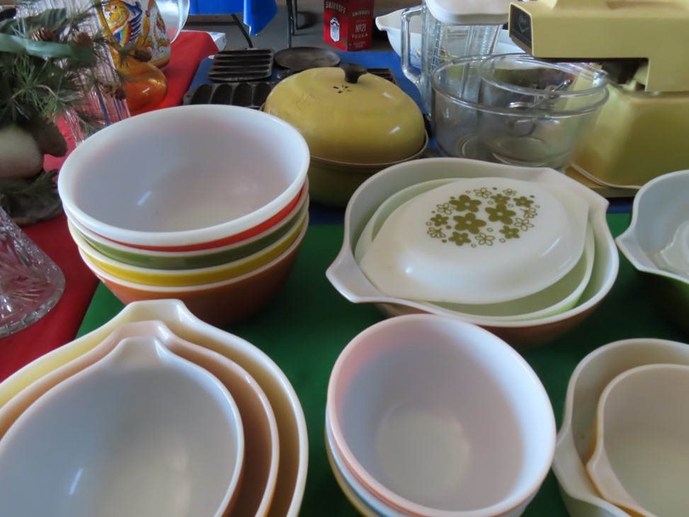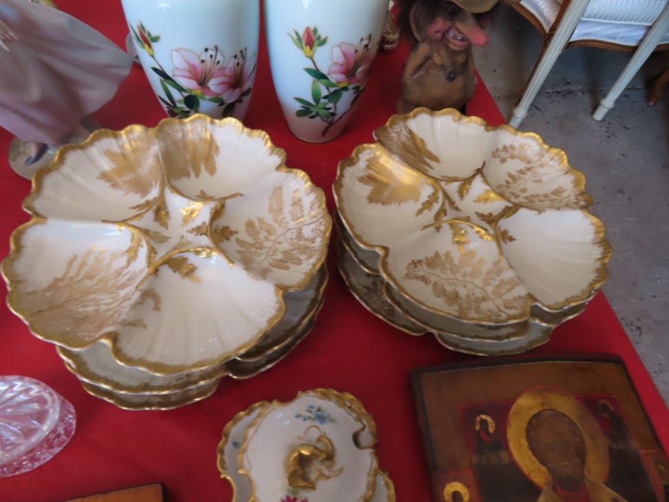 CHINA & GLASS: Oyster plate set; Jefferson pattern dinnerware set by Lenox; Lladro figurines; Large lidded tureen with underplate and lemon finial; Pair of floral decorated vases; Royal Doulton figurines; Dresden figures; Sake set in box; Large ewer with gold accents; Capodimonte flowers; Blue & white pierced ceramic censer; Large bowl with gold edging and great decorating; Ginger jar with lid; Cheese keeper; Footed bowl; Coffee set with flower sprigs; Colorful soup tureen; Set of nested decorated bowls; Really nice covered serving tureen with underplate and lion finial; Serving tray; Lenox; Blue & white chargers; Blue & white vases; Teapots; Covered bowls; Trinket boxes; Elephant garden seats; Lots more blue & white ceramics; Lots of ginger jars; Large bowls; Urns; Candelabras; Native American & Mexican pottery; Butter keeper; Fine dinnerware set; Hummels; Wedgwood; Ice bucket; Wedgwood Queen’s ware set; Teapot set; Sets of plates; Mugs; Rose Medallion cup & saucer; Two tables of Pyrex glass! Cinderella bowl set; Casseroles with lids; Mixing bowls; Square serving bowl; Cereal bowls; Rectangular baking dishes; Butter dish; Lots of different patterns; Ruby red square dishes; Cobalt glasses; Etched stemware sets; Really neat art glass ashtray; Large crystal biscuit jar; Waterford crystal; Red glass tall decanter and glasses set with enamel flowers and lots of gold overlay; Large crystal vase; Powder jar; Reamer; Leather covered decanters; Orange glass ashtray; Lots & lots of good crystal! Nappy, Punch bowl, Vases, Tumblers, Perfume atomizer, Cruets, Celery dish, Candelabras, Knife rests, Cake plate & lots more! Pink Depression glass bowl; Opalescent ruffled edge bowl & tumblers; Iris & Herringbone bowl; Etched glassware; Paperweight; Glass apple; Cake stands; Red cut to clear stemware; Green glasses with gold overlay and more!