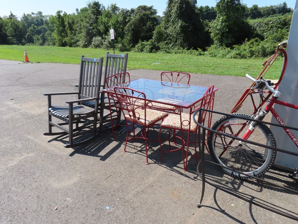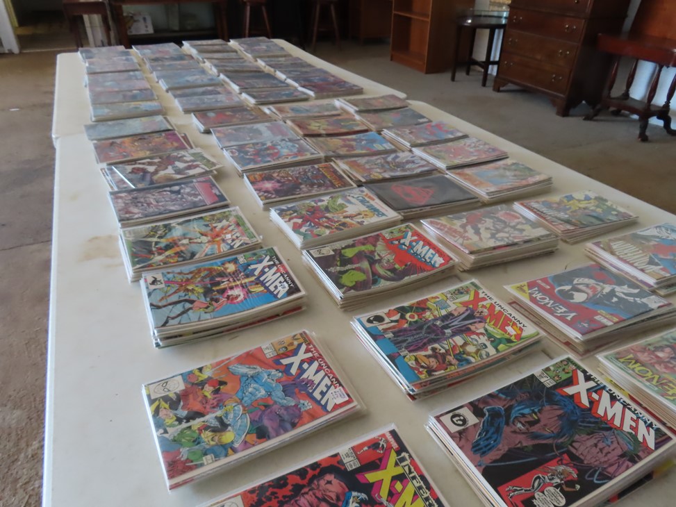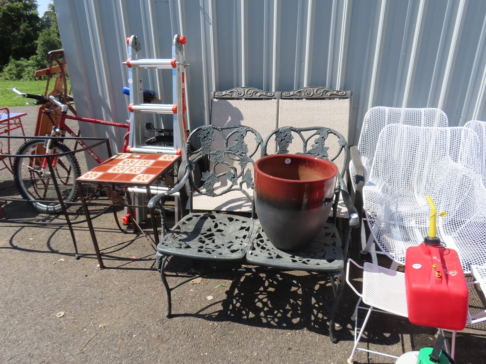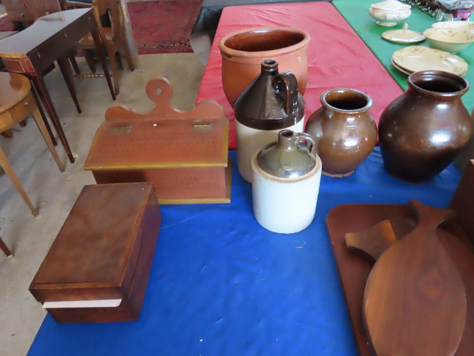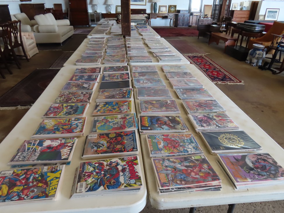 MORE: Old cane seat wheelchair; Nice old candlestick wall phone; Unusual crank churn; Tripod; Pair of Bose speakers; Bose radio; Cane holder with lots of unusual canes; Horse collar; Copper buckets with iron handles; Primitive lang-handled dipping bucket; Guitar in case; Fender amp; Harmonica; Old beaded child’s moccasin; Brass pineapple; Binoculars; Od Doctor’s bag & contents; Middle Eastern knife in stone encrusted sheath; Chinese lunch carrier with red and gold finish; Cloisonné censer; Brass candlesticks; Brass horse statue; Brass shoehorn; Russian lacquer box; Brass teapot with 6 cups on round tray; Leather covered decanters; Wooden candlesticks; Brass mortar & pestle; Stone & art glass ashtrays; Wooden wall carvings; Tiny brass animals; Twisted stem wooden candlesticks; Oster Kitchen Center mixer with accessories; Blender jar; Food Slicer; Cast iron corn-stick pans; Cast iron griddle; Cutco set; Enameled cast iron cookware; Cookie molds; Copper tray; Cloisonné egg; Fine & costume jewelry; Patio furniture; Jacks; Gas & water cans; Folding ladder; Bicycle; Garden pot; Metal garden seats; Lounge chairs; Tile top outdoor table; Porch rockers; Glass top outdoor table; Stoneware crock labeled 3 by E.S. & B. Newbrighton PA; More labeled stoneware pickling crocks; Stoneware jugs; Stoneware vases with Albany slip glaze; Wooden boxes; Steins; Canister set; Horsehead bookends; Wooden serving tray; Decoys; Metal bookends; Rock sample; Clock; Wooden bowls &more carvings; Lady nutcracker; Old cameras & accessories; Garden seats; Masks; Cast iron Clydesdale delivery wagon toy; Virginia Metalcrafter’s brass key in box; Tables of Comic Books! X-Men; Turok; Spider-man; Wolverine; Justice; Ghost Rider; Advance Comics; Wizard; Star Wars & Lots, lots more! Collectible trading cards; Star Wars cards; Sealed packages; and MUCH more!!