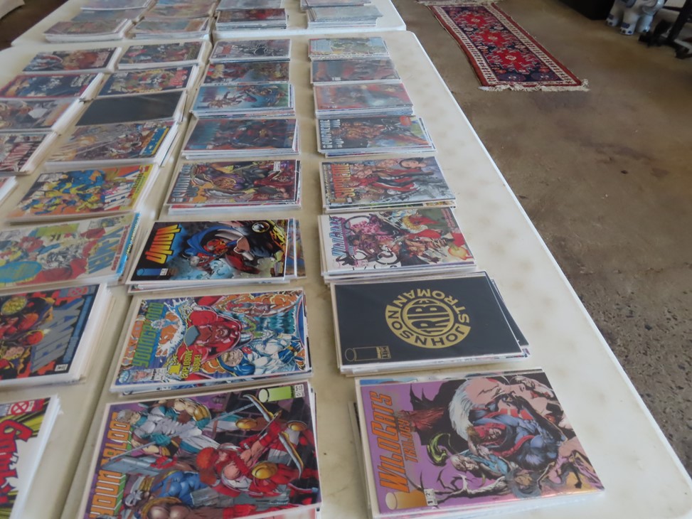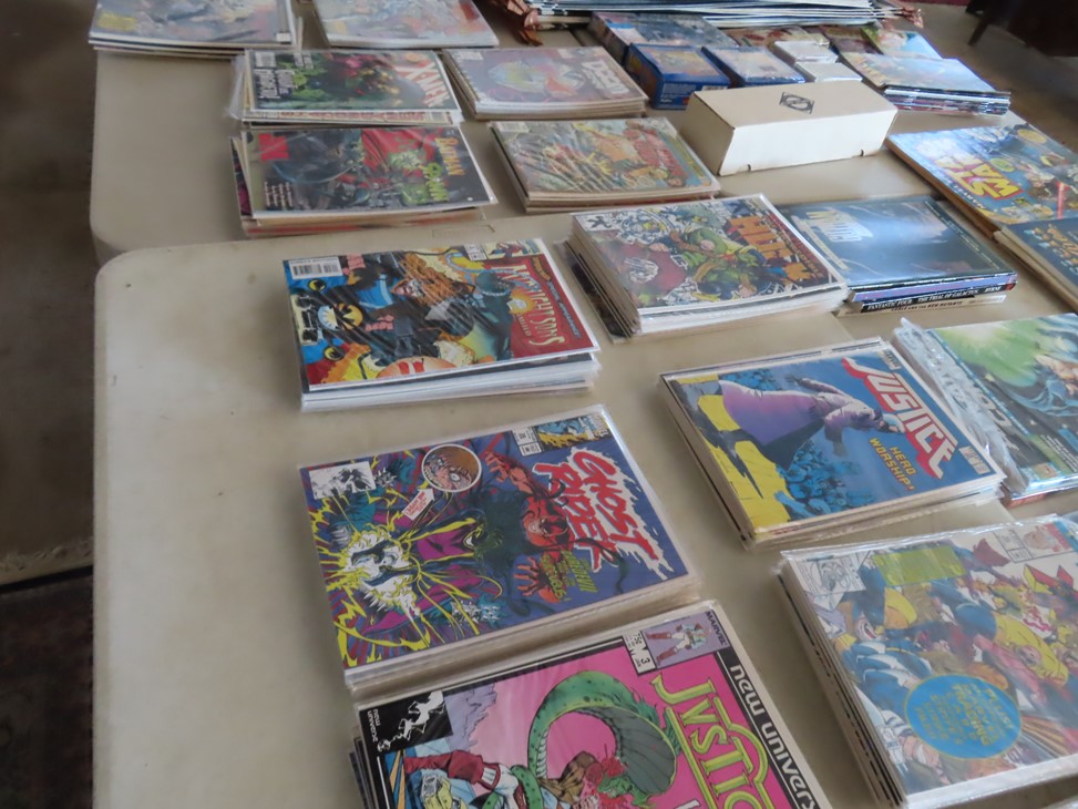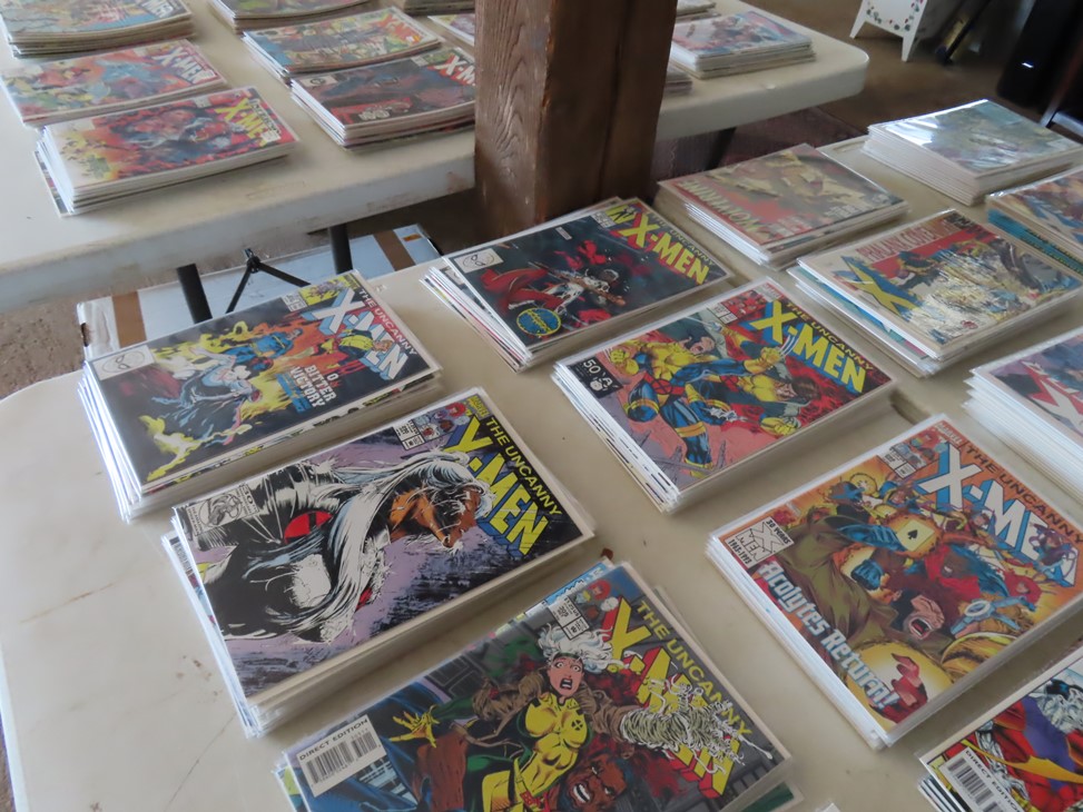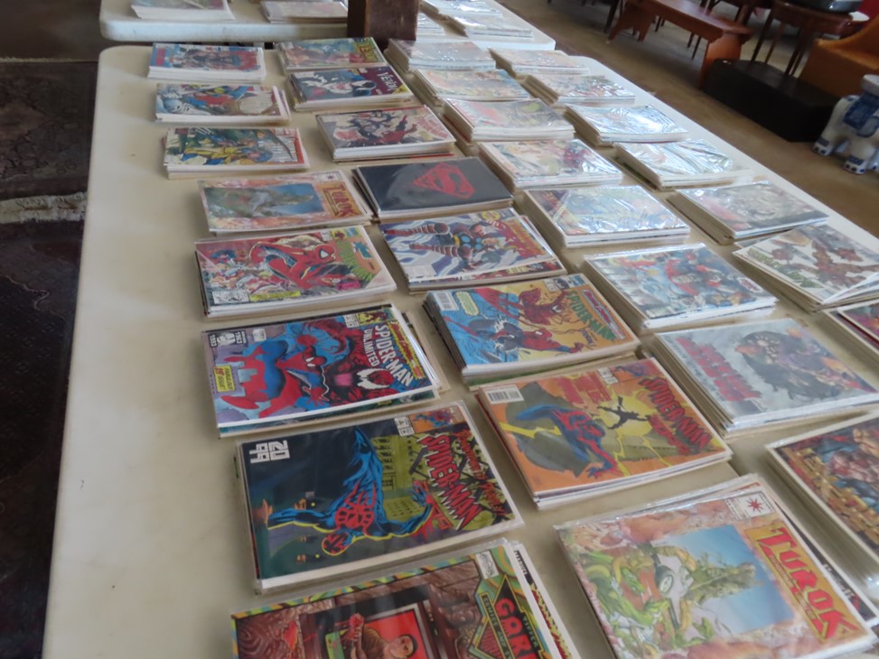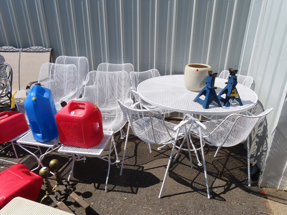 MORE: Old cane seat wheelchair; Nice old candlestick wall phone; Unusual crank churn; Tripod; Pair of Bose speakers; Bose radio; Cane holder with lots of unusual canes; Horse collar; Copper buckets with iron handles; Primitive lang-handled dipping bucket; Guitar in case; Fender amp; Harmonica; Old beaded child’s moccasin; Brass pineapple; Binoculars; Od Doctor’s bag & contents; Middle Eastern knife in stone encrusted sheath; Chinese lunch carrier with red and gold finish; Cloisonné censer; Brass candlesticks; Brass horse statue; Brass shoehorn; Russian lacquer box; Brass teapot with 6 cups on round tray; Leather covered decanters; Wooden candlesticks; Brass mortar & pestle; Stone & art glass ashtrays; Wooden wall carvings; Tiny brass animals; Twisted stem wooden candlesticks; Oster Kitchen Center mixer with accessories; Blender jar; Food Slicer; Cast iron corn-stick pans; Cast iron griddle; Cutco set; Enameled cast iron cookware; Cookie molds; Copper tray; Cloisonné egg; Fine & costume jewelry; Patio furniture; Jacks; Gas & water cans; Folding ladder; Bicycle; Garden pot; Metal garden seats; Lounge chairs; Tile top outdoor table; Porch rockers; Glass top outdoor table; Stoneware crock labeled 3 by E.S. & B. Newbrighton PA; More labeled stoneware pickling crocks; Stoneware jugs; Stoneware vases with Albany slip glaze; Wooden boxes; Steins; Canister set; Horsehead bookends; Wooden serving tray; Decoys; Metal bookends; Rock sample; Clock; Wooden bowls &more carvings; Lady nutcracker; Old cameras & accessories; Garden seats; Masks; Cast iron Clydesdale delivery wagon toy; Virginia Metalcrafter’s brass key in box; Tables of Comic Books! X-Men; Turok; Spider-man; Wolverine; Justice; Ghost Rider; Advance Comics; Wizard; Star Wars & Lots, lots more! Collectible trading cards; Star Wars cards; Sealed packages; and MUCH more!!