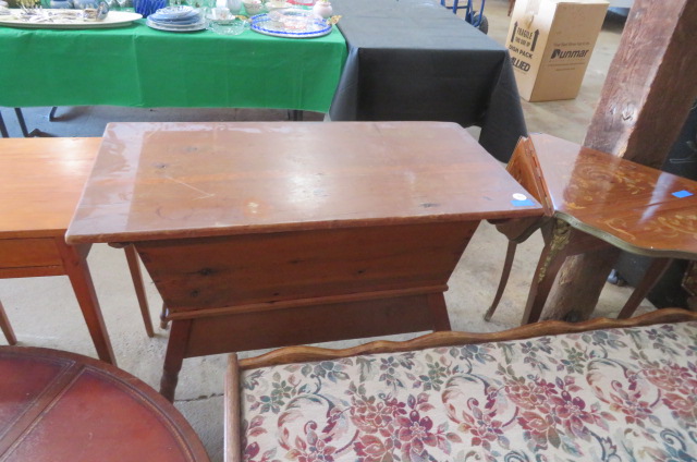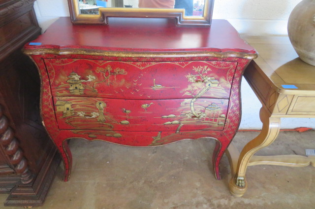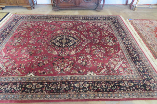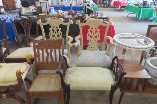 FURNISHINGS: Step-back cupboard with armorial crest painted on glass doors, barley twist columns and intricate carvings; Super nice old blanket box with dovetail corners and two drawers; Small dough box with lid; Large dough box with lid; Good old gateleg table; Step-back china cabinet; Flip top server; Drop leaf table and chairs; Wonderful Empire dresser with cradle mirror; Corner cabinet; Living room table set-sofa table, end table pair and coffee table; Bedroom set; Small Oriental apothecary chest; Another nice wardrobe; Outdoor furniture; Pair of Victorian marble top tables; Morris chair; Horseshoe shaped coffee table with leather drop and drop end panels; Nice pair of upholstered chairs with pillows; Cane bottom chair pair; Bellows; Corner chair with winged bird carved arms; Wood pedestal; Small table with drawer; Lots of small tables; Baker sideboard with curved front and inlay; Pair of white leather loveseats with electronic controls; Bombe’ chest painted red with oriental scenes in gold; Pair of blue leather recliners; Drop leaf dining table; Round bookcase with leather accents; Brazier; Barstool; Small blanket box; Metal side table; Pair of ebonized chairs with gold accents; End tables; Several chair pairs; Small bench; White painted round side table with glass top; Small chest; Cedar chest; Patio furniture; Iconic 60’s blonde bedroom chest and dresser with mirror; Red painted cabinet with glass doors; Good chest of drawers with fancy inlay; Small cabinet; Wardrobe with mirror; Primitive ladder display piece; 6 tier leaning shelf in box; Piecrust edge side table; Pedestal; Small footstool; Rocking chair; Glass top coffee table; Floor vases; Bench with gold lion head finials and paw feet; Room screen; Leather sofa and loveseat; Grandfather clock; Lingerie chests; Tall wardrobe with shelves; Figural turkey stained glass lamp; Crystal lamps; Oriental ceramic table lamps; Metal lamp with painted glass shade with beads; Lamp with custard glass shade; Really nice wall mirrors! Ornate mirror with gilded frame; Shield shaped wall mirrors; Rectangular mirror; More mirrors; Metal student lamp; Good oriental carpets and rugs; Room sized rugs and much, much more!