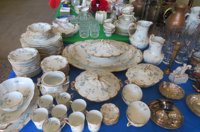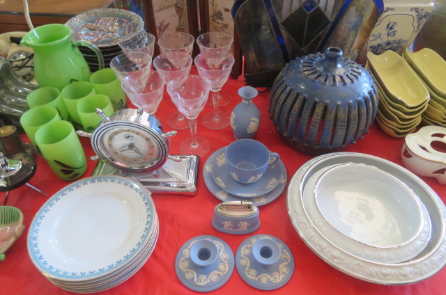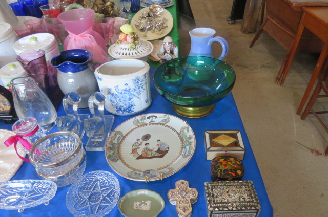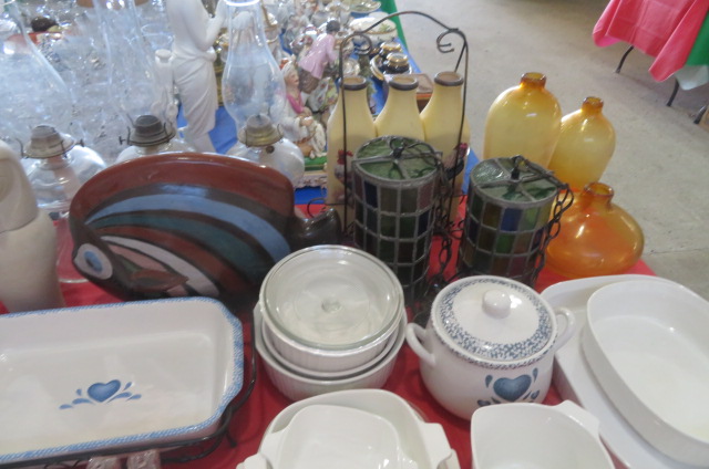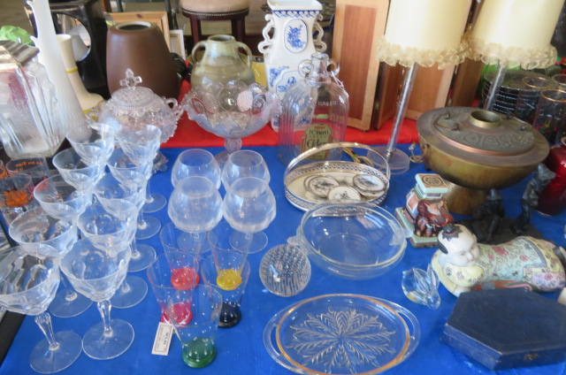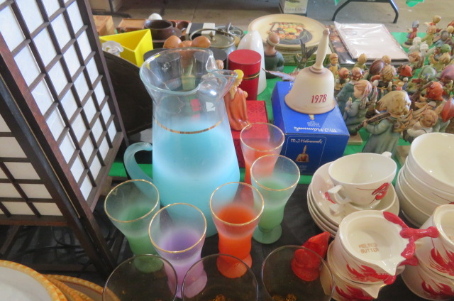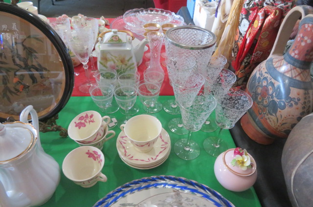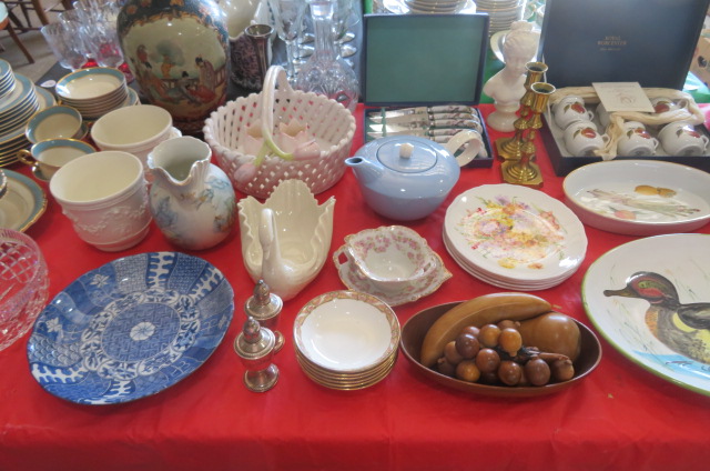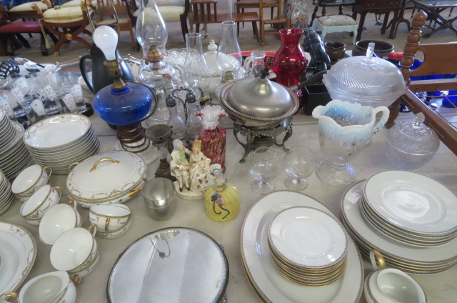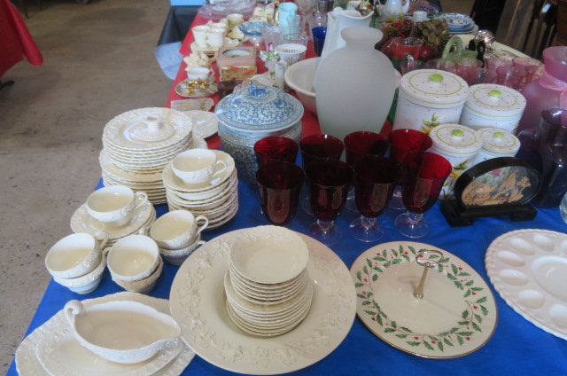 CHINA AND GLASS: Several nice Haviland Limoges dinnerware sets; Large Oriental vases; Dozens of Hummels; Planters; Large ceramic studio vase; Toby mug; Bennington pitcher; More figural pitchers; Native American pottery; Teapots; Spill vase; Wedgwood; Lenox; Blue & white china; Steak knife set with ceramic handles in box; Belleek; Ginger jar with lid; Tureens; Collectible teacups & saucers; Tirschenreuth Bavarian dinnerware set-Studio 4179 Handpainted; Foo dogs; Pottery pig bank; Old Ivory ‘Edmonton’ china; Noritake ‘The Sahara’ dinnerware set; Minton’s ‘Princess’; Tirschenruetter dinnerware set; Denby English pottery set; Wedgwood Queen’s Ware set; Lobster decorated dinnerware set; Head rest; Royal Worchester Evesham; Washbowl & pitcher; Egg plate; Pitchers; Demitasse set; Platters & plates; Corning ware; Bed warmer; Crystal candelabras; Hurricane shades; Crystal bowls; Crystal stemware with red bases; Crystal goblets; Red glass; Iridescent glass globe; Multi-colored frosted pitcher and glasses set; Red hobnail glass basket with ruffled edge; Fairy light; Cobalt tumblers; Art glass vase; Paperweight; Polka dot glasses; Reamer; Pitcher and tumblers set; Fenton carnival glass plate set; Carnival glass vase; Lusterware tea set; Etched glassware; Glass squirrel bookends; Cordials; Green glass bowl with brass base; Pyrex; Bowls; Candlewick; Cobalt and lots more!