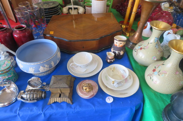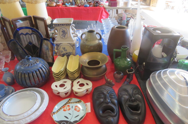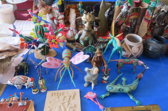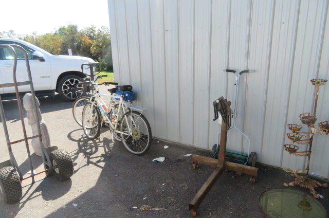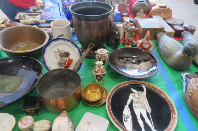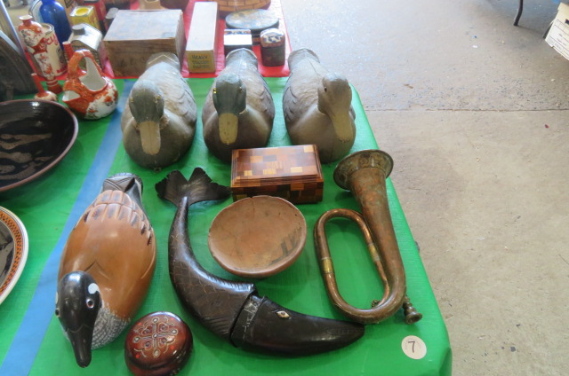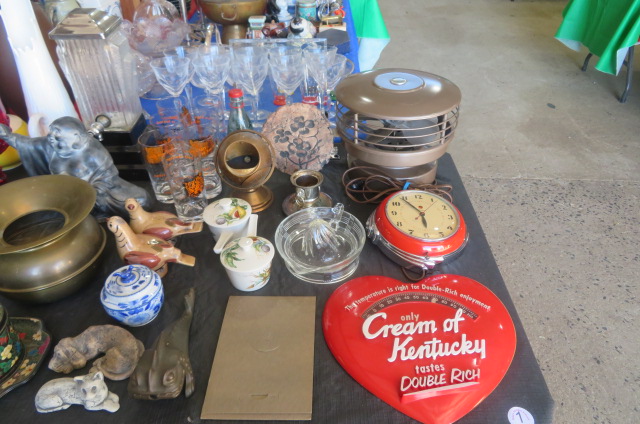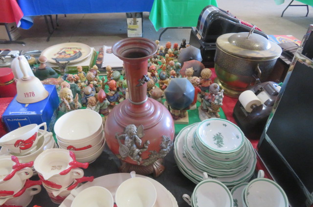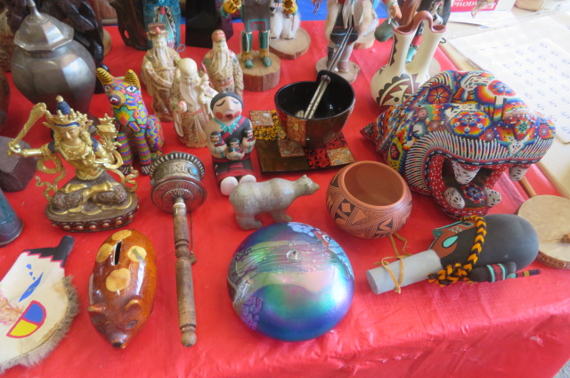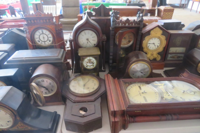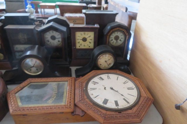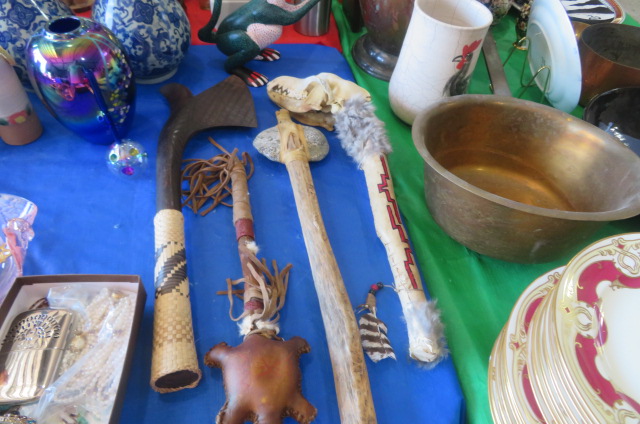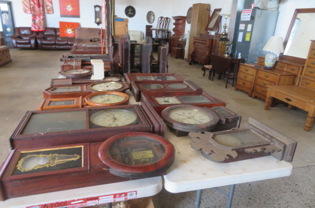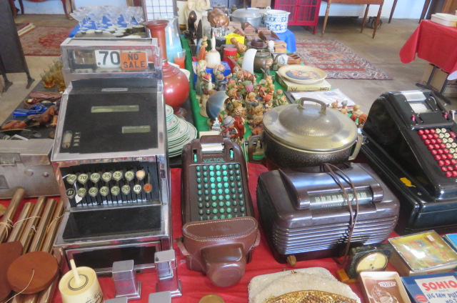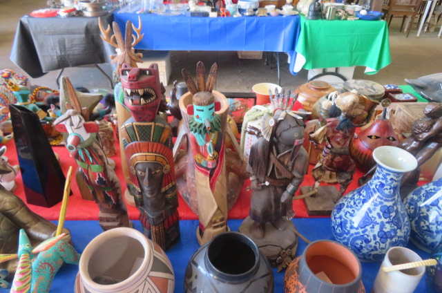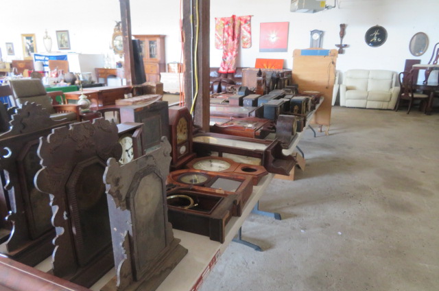MORE: Numerous nice large Kachinas-could be some sleepers here! Very nice Kimono; Copper ham boiler; Copper pitcher with lid; Copper ewer; Brass teapot; Brass candlestand; Candlesticks; Woodenware; Wood vase; Wood leaf dish; Camel saddles; Brass bookends; Wooden fruit in bowl; Sandalwood carving in box; Prayer wheel; Vase with metal adornments; Advertising pieces; Dutch Smokers cigars, Clabber girl; Colgan’s mustard; Sloan’s liniment; Carved duck decoys; Brass hunting horn; Copper pot; Seashells; Trinket boxes; Sad iron; Hummels and Hummel go-withs; Wooden boxes; Steak knife sets; Marble eggs; Old floor fan; Pipe rests; Table lighters of all kinds; Smokeless ashtray; Pipes; Match holders; Ashtrays; More pipe rests; Old office machinery; Old cash register; Old radio; Old accounting machine; Old camera; Wind chimes; More lighters; Beaded purses; Sohio jigsaw puzzle; Stadium checkers game in box; Buddha lighter; Pincherette ashtrays; Bossuns style decoration; Cloisonne; Small clocks; Art Deco cigarette holders; Art Deco lighters; Hand grenade lighter; Windmill lighter; Art glass lighter; Cream of Kentucky ad; Reamer; Terrier bookends; Table of hammered aluminum ware; Trays; Baskets; Ladles; Sugar & creamer on tray; bowls & more; Brass candlesticks; Candle snuffer; Engine hoist; Dolly; Bicycles; Iron plant stand; Tables full of more clocks! Kitchen clocks; Mantel clocks; Wall clocks with visible pendulums; Marble clocks; Brass & glass clock; Ceramic clock case; Calendar clocks; Clock parts; Metal case clocks; Figural clocks; Cuckoo clock & lots more!