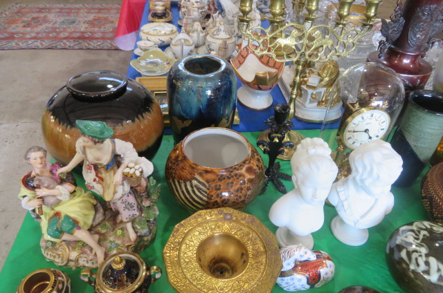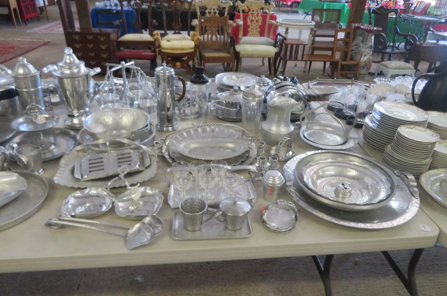 SILVER & ART: Sterling & silver-plate: Small trays; S&P shakers; Spoons; Salts; Vase, Candlesticks; Butter dome; Large vase; Creamer & more; Some really good statues! Painting of Flamenco dancer; Terrier artworks; Stained glass panel; Large decorated metal tray; Stone inlaid plaque; Ethnic carving; Seagulls in flight original paintings; Busts; Bronze lovers; Shiva statue; Carved bear and much, much more!