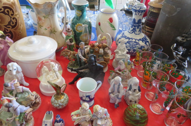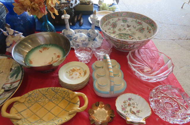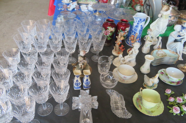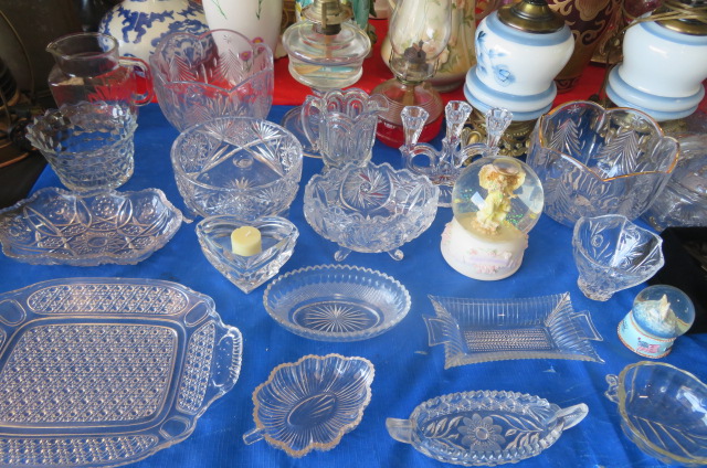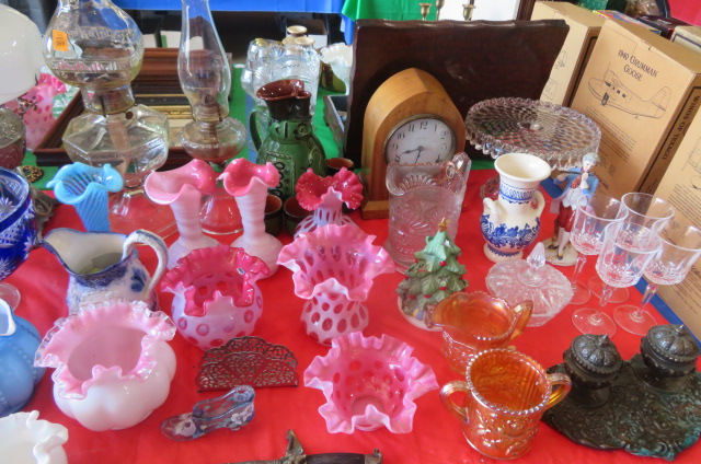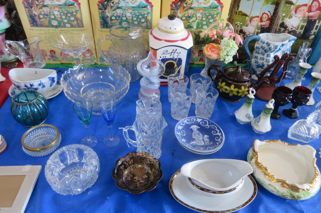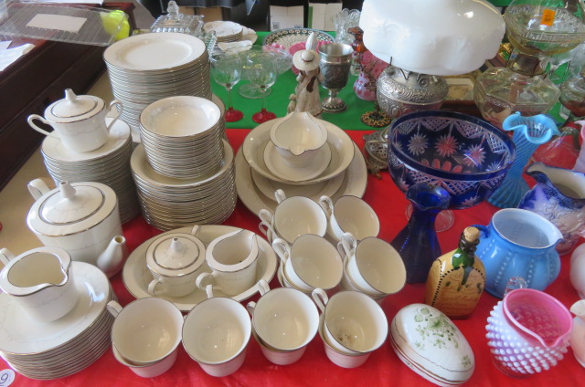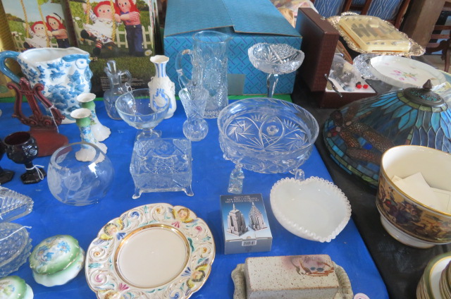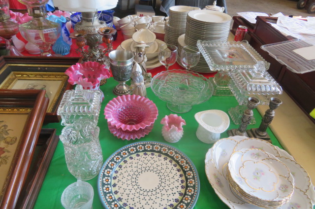 CHINA & GLASS: Fine china dinnerware; China platters; Large Chinese bowl; Dresser set with tray, powder jar & 2 barber bottles; Royal Doulton; Blue & white salt box; Blue & white pitcher; Ginger jars; Hummels; Collectible teacups & saucers; Figurines; Teapot; Butter dish; Candlesticks; S&P shakers; Gravy boats; Cookie jar; Studio pottery; Waterford! Beautiful crystal stemware sets; Crystal clock; Crystal crosses; Blue cut to clear chalice; Cased glass pitchers; Art glass; Carnival glass; Sugar & creamer sets; Cake stands; Marmalade jar; Divided dishes; Frosted pink candlesticks; Crystal bowls; Cake plate with dome; Fenton Silver-crest leaf dish & ruffled edge basket; Cruet; Candlesticks; Rose bowl; Pitchers; Decanter set; Cordials and More!