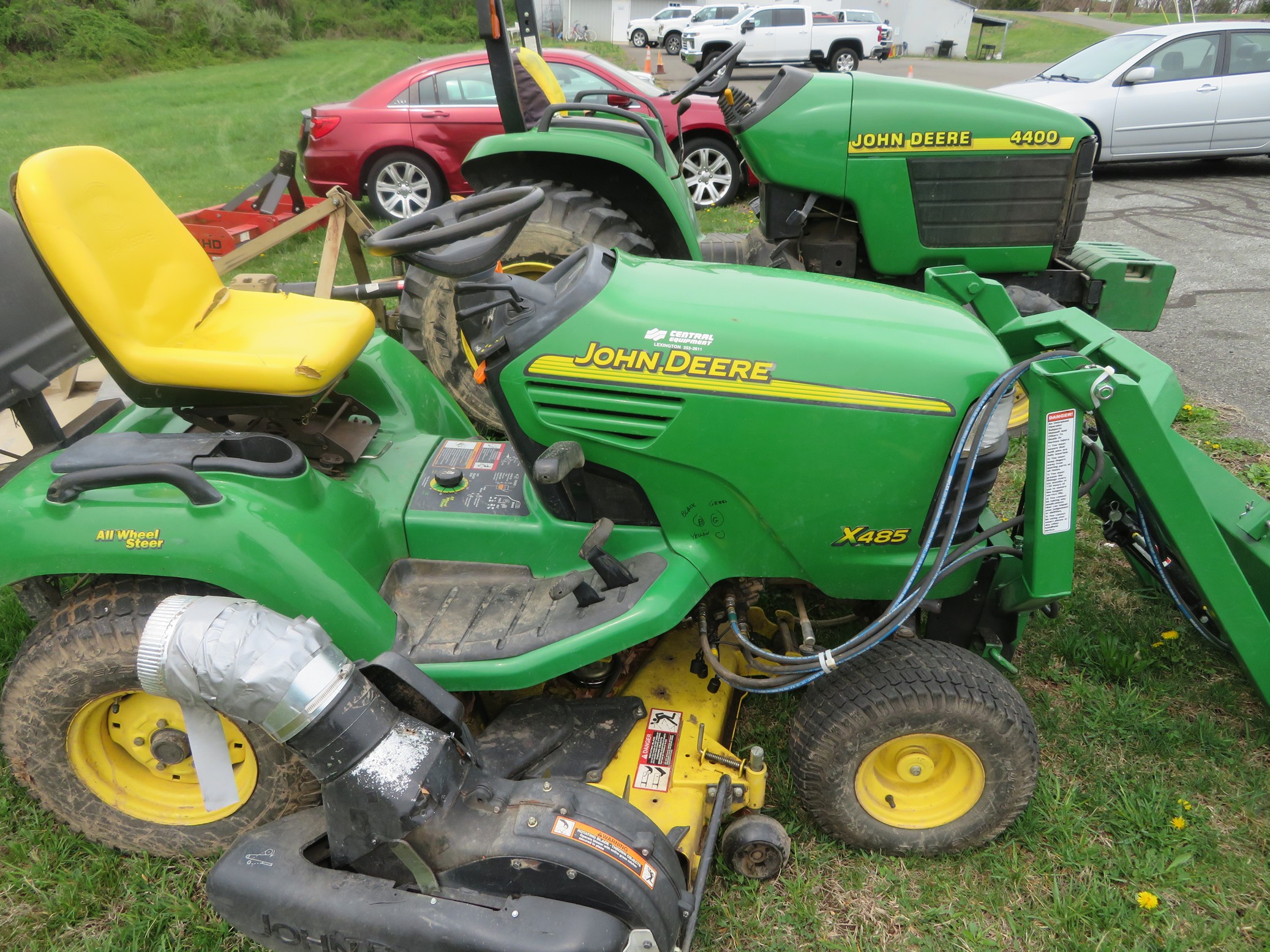 4. John Deere XC485 Tractor with front-end loader, belly mower, and bagger attachment. All-wheel steer. 1,349 Hours