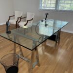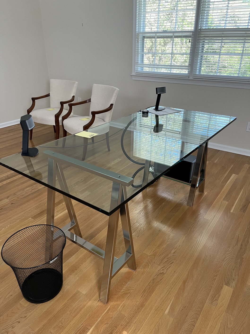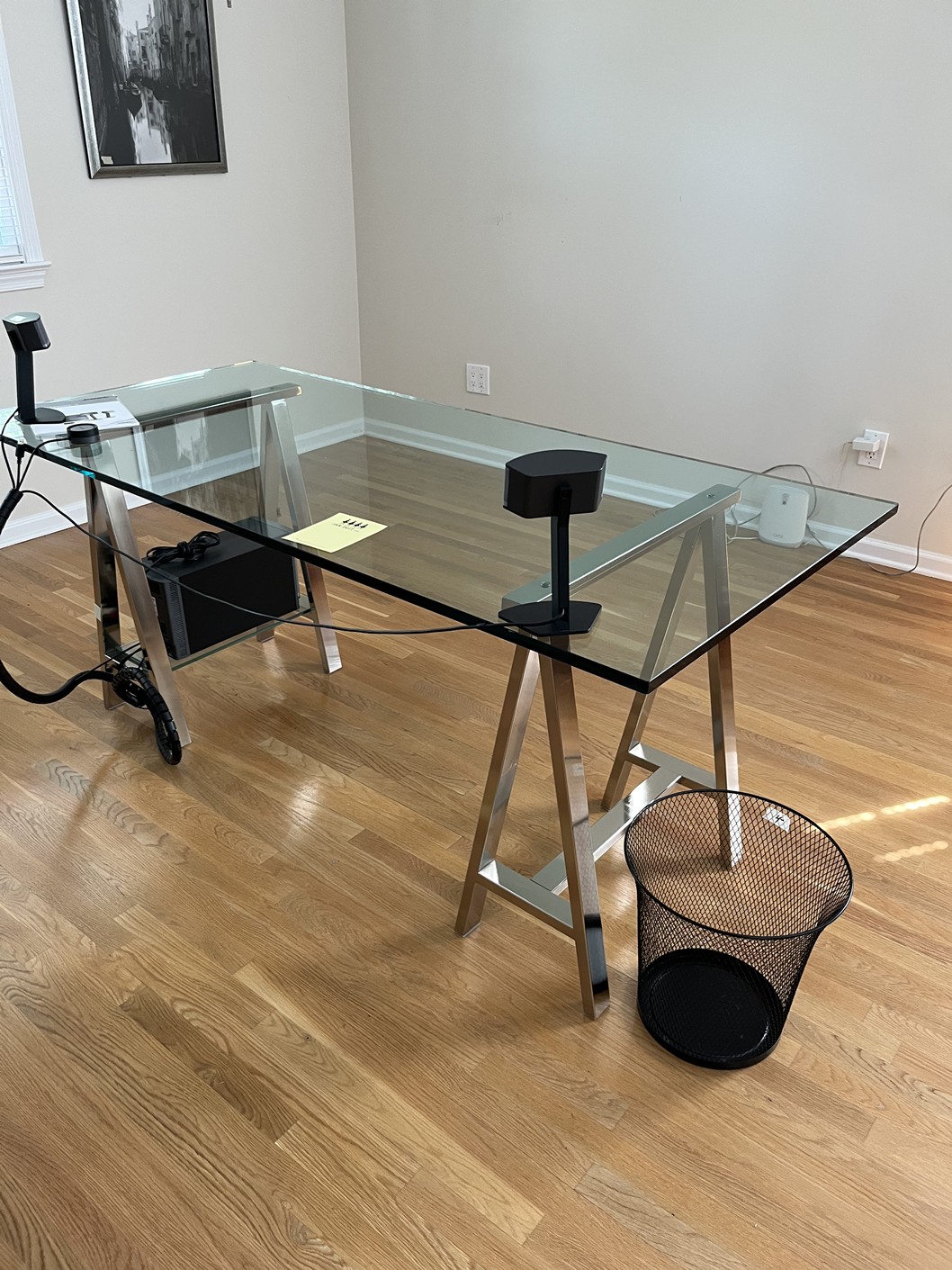 - Glass Top Desk Polished Nickel Sawhorse Campaign Table 72 in