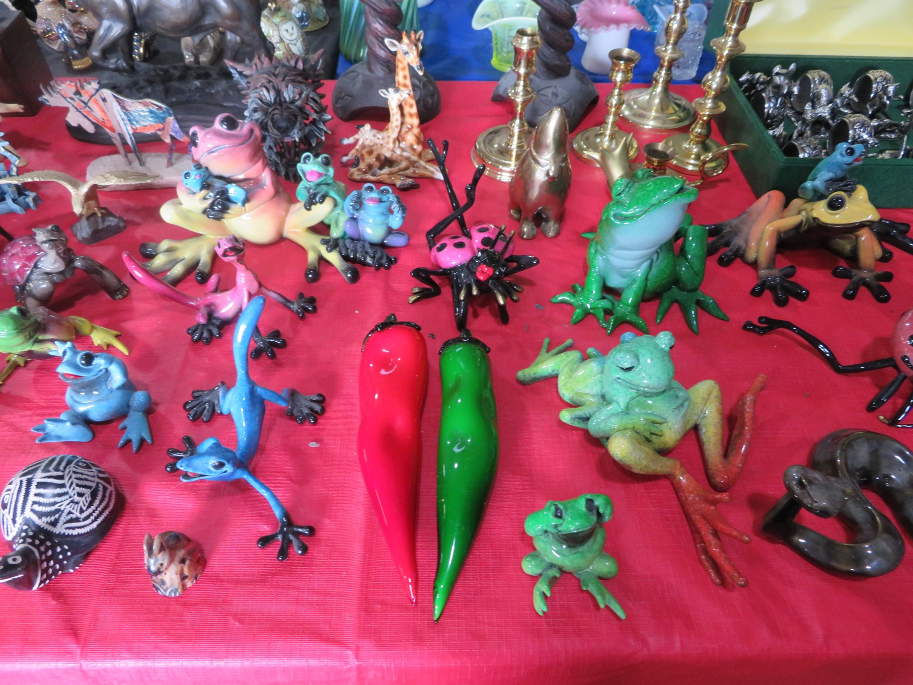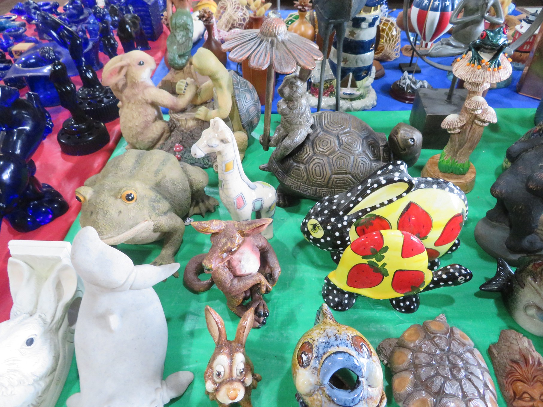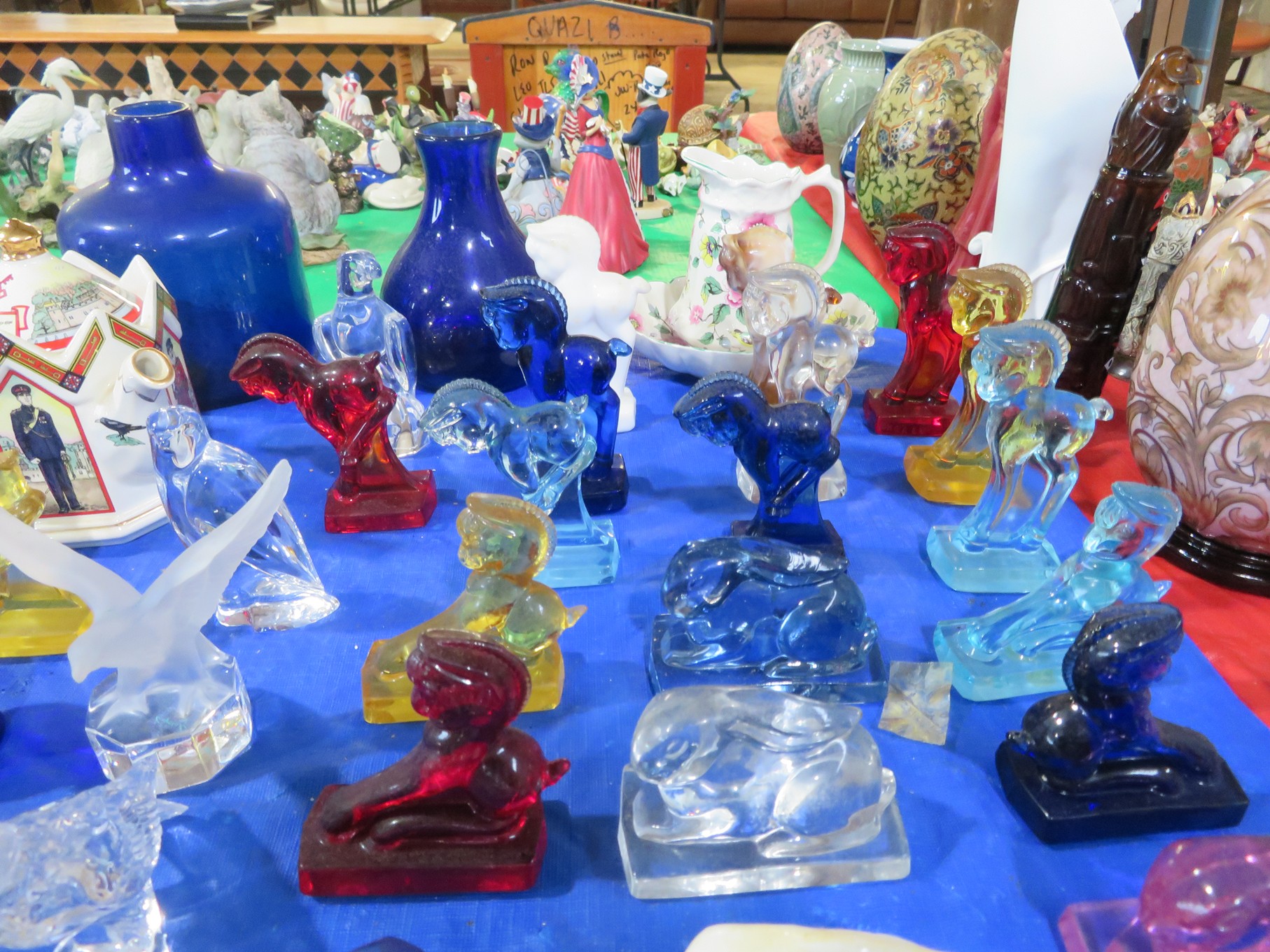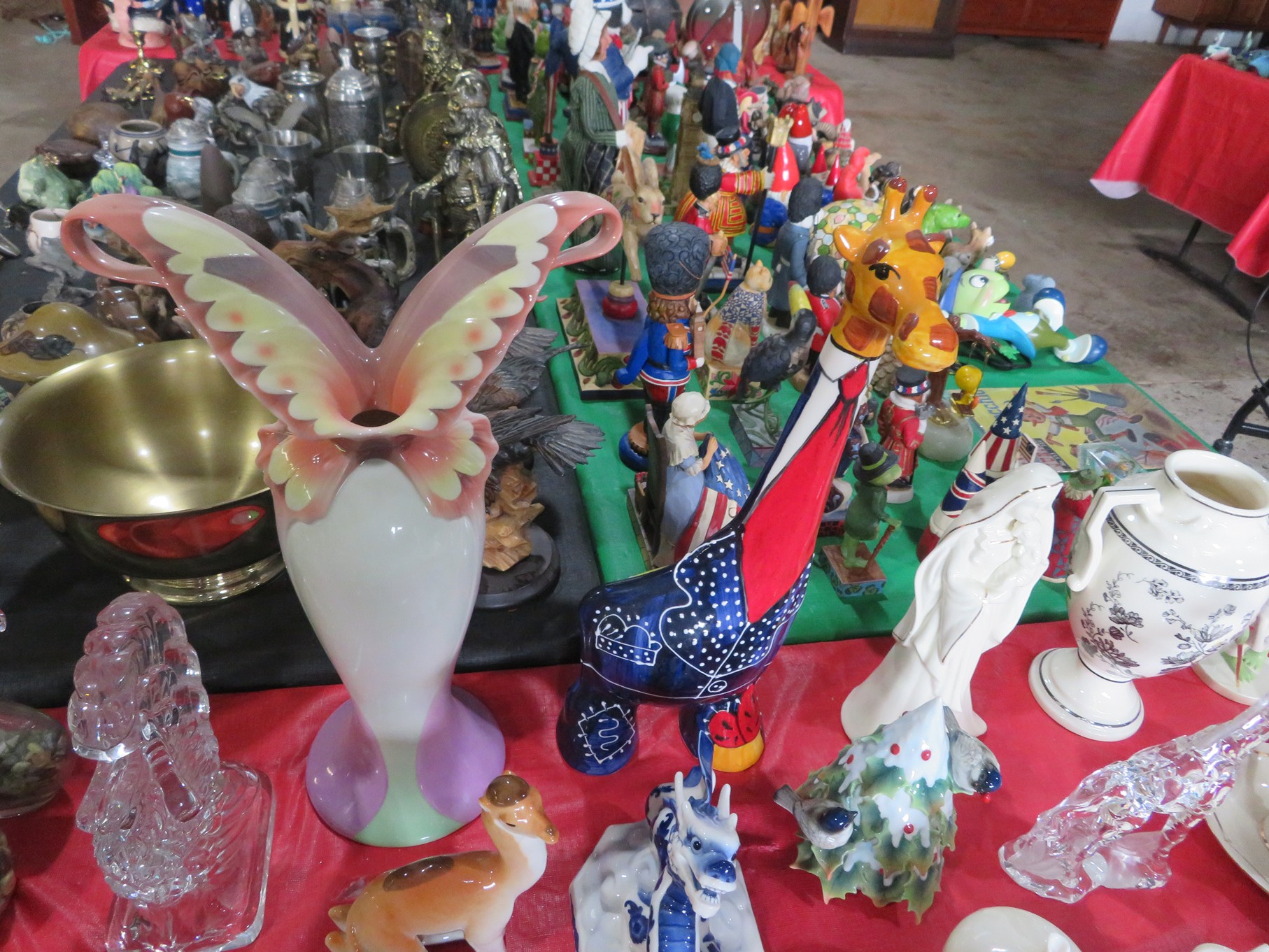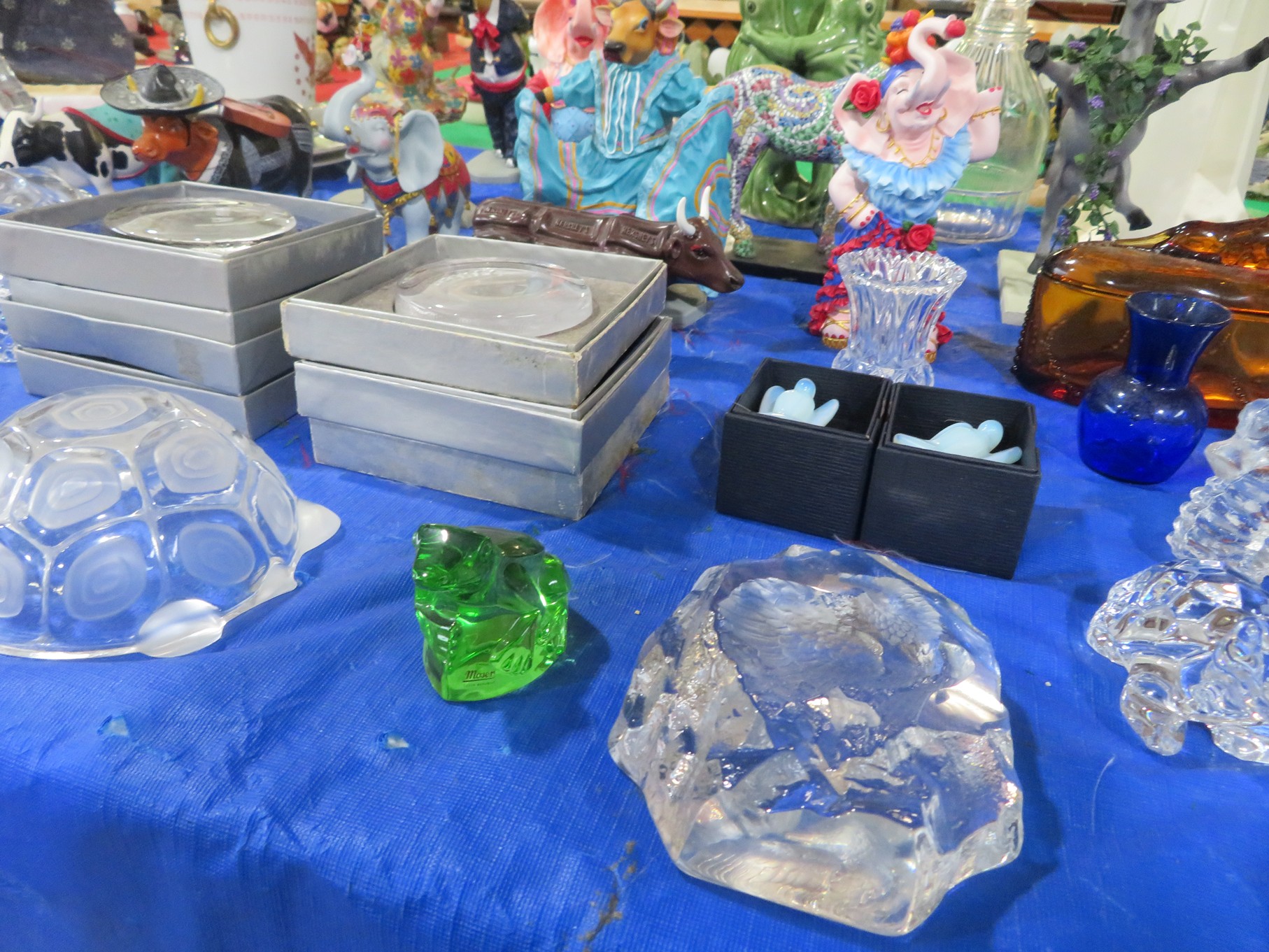 BACCARAT, STEUBEN, FENTON & MORE: Steuben turtle paperweight; Waterford frog; Fenton Hat vases in myriad sizes, shapes & colors; Cornucopias; Ruffled edge Silvercrest bowl; Red spread wing eagle; Bells and more; Baccarat; Clear Crystal, Colored and Art Glass Really unusual lion on nest in amber; Rabbits; Panther; Eagles; Turtles; Octopus; Red & green chili peppers; Cornucopias; Horse; Butterfly; Perfume bottles; Strawberry; Colts; Birds; Paperweights; Dozens of cobalt pieces and so much more! Depression Green S&P shakers; Yellow candelabra; Yellow candlesticks; Yellow cornucopias and more.; MORE Super China, Glass & Collectibles Incredible 3 piece white dragon set; Tremendous Franz vase with butterfly shaped top; Franz bowl; Dragon candlesticks; Candleholders; Trinket boxes; Pin dishes; Tiny vases; Franklin Mint coffee set with sugar & creamer; Porcelain foo dogs; Planters on stands; Oriental vases; Elephant figures; Pembroke Corgi; Owls; Water buffalo; Jar with giraffes; Lidded ginger jar with 3D dolphins; Eagles; Rose Famille bowl; Decorated ovoid shapes; Dancers; Wall pockets; Jardinia Harmony Ball Kingdom lidded cachepots; Rinconada boxes with inserts, figures & nameplate; Lenox cartoon characters, animals & figures; Oriental plates & bowls; Green dragon decorated egg; Gold over green decanter set; Mud men figures; Noritake ‘Phyllis’ dinnerware set; Large collection of Forest Green glassware; Spongeware pottery in red & blue; Studio pottery; Wedgwood ‘Florentine’ dinnerware set; Jan Richardson, Windy Meadows Rosebrier Cottage, Made in Maryland, signed & numbered; Leone Kuhne Kachinas; Kitty’s Critters frogs; Goebel bird with hat; Dalzell Leaping dolphins statue; Neil Eyre signed & numbered Chameleons, Lizards, & more; Kitty’s Critters Ladybugs; Set of 7 Immortals figures; Harmony Kingdom; Enameled tiger trinket box with insert; Neiman Marcus turtle & rabbit on base; Royal Haeger vase with label; McCoy Dutch shoes planter; Heisey pink horse statue; Turov giraffe in a suit, rabbit & turtle; Villeroy & Boch; Swarovski; Jim Shore figurines and more!