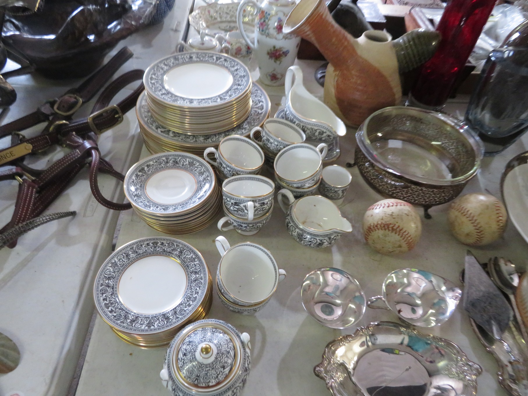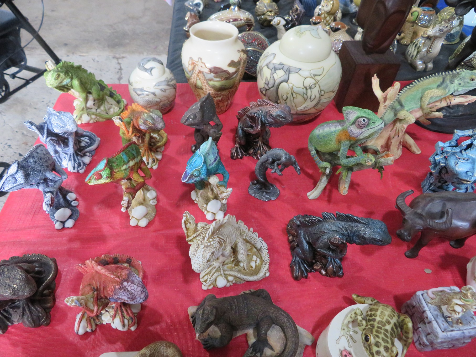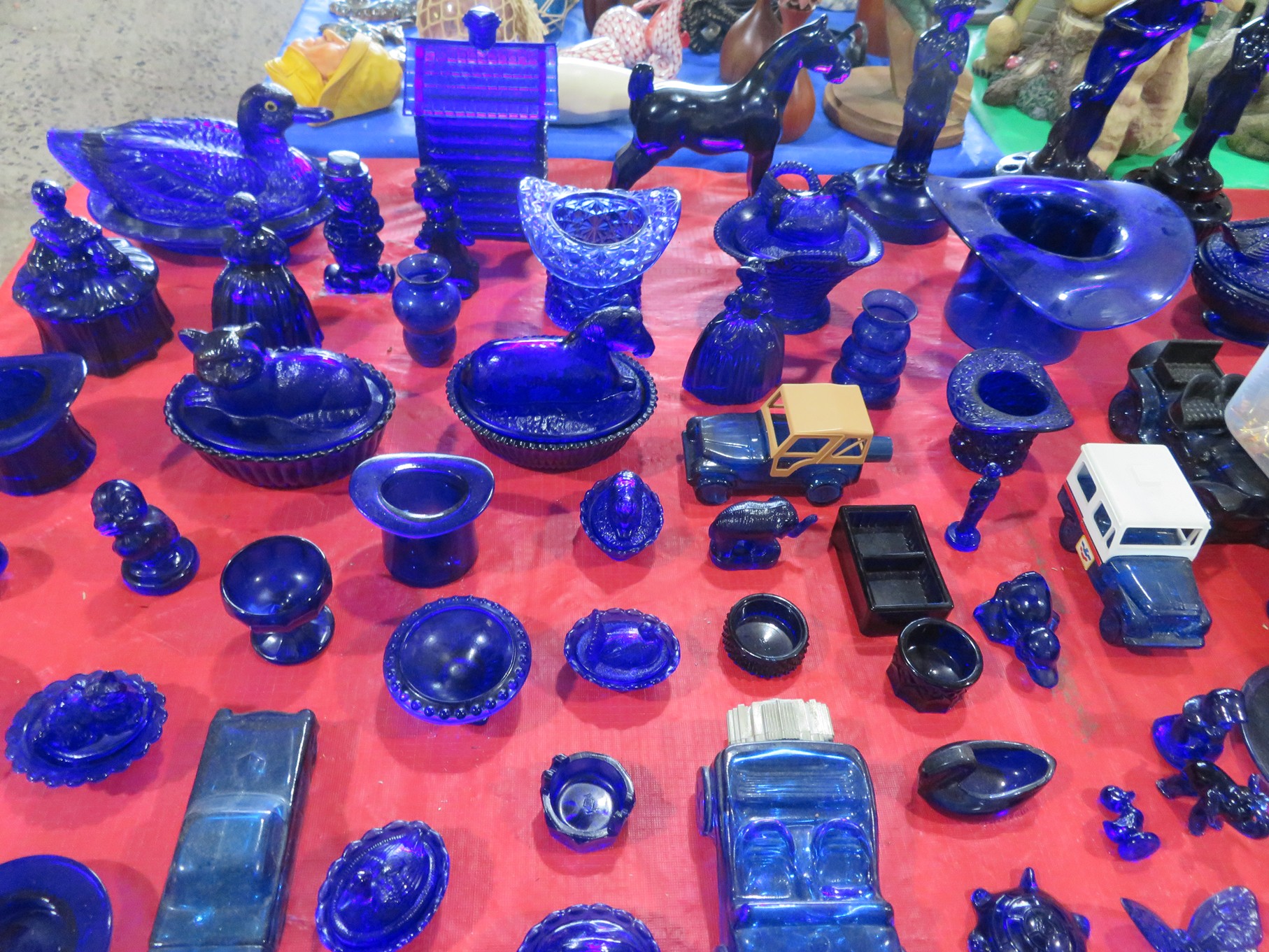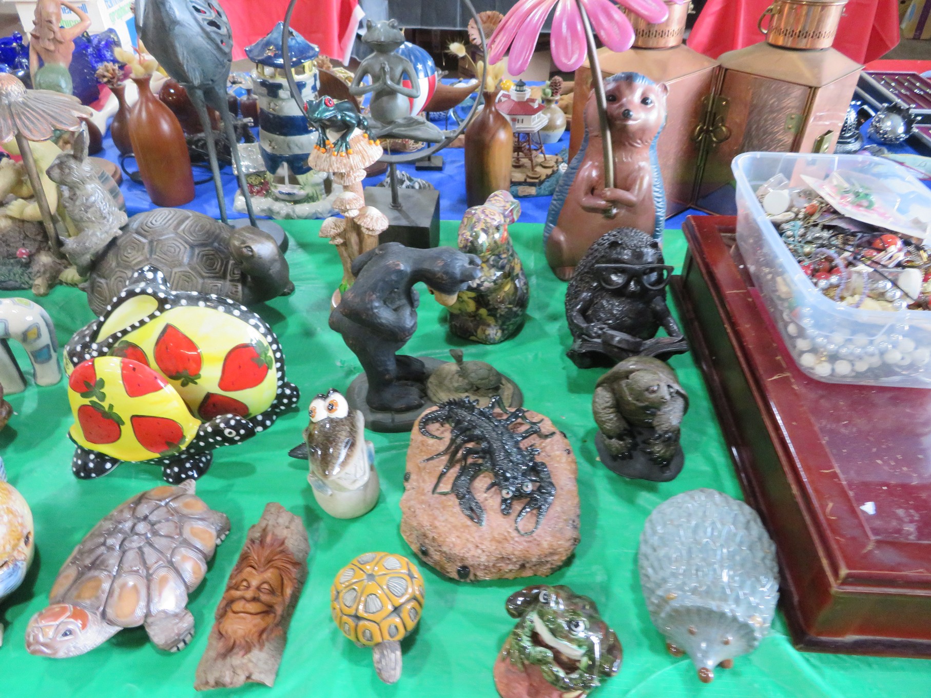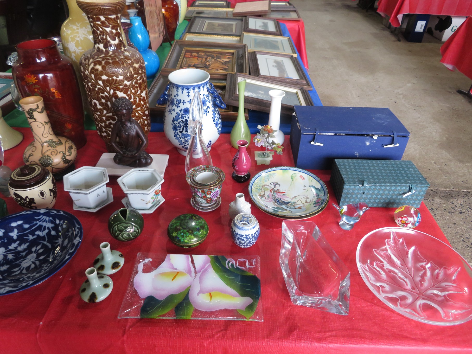 BACCARAT, STEUBEN, FENTON & MORE: Steuben turtle paperweight; Waterford frog; Fenton Hat vases in myriad sizes, shapes & colors; Cornucopias; Ruffled edge Silvercrest bowl; Red spread wing eagle; Bells and more; Baccarat; Clear Crystal, Colored and Art Glass Really unusual lion on nest in amber; Rabbits; Panther; Eagles; Turtles; Octopus; Red & green chili peppers; Cornucopias; Horse; Butterfly; Perfume bottles; Strawberry; Colts; Birds; Paperweights; Dozens of cobalt pieces and so much more! Depression Green S&P shakers; Yellow candelabra; Yellow candlesticks; Yellow cornucopias and more.; MORE Super China, Glass & Collectibles Incredible 3 piece white dragon set; Tremendous Franz vase with butterfly shaped top; Franz bowl; Dragon candlesticks; Candleholders; Trinket boxes; Pin dishes; Tiny vases; Franklin Mint coffee set with sugar & creamer; Porcelain foo dogs; Planters on stands; Oriental vases; Elephant figures; Pembroke Corgi; Owls; Water buffalo; Jar with giraffes; Lidded ginger jar with 3D dolphins; Eagles; Rose Famille bowl; Decorated ovoid shapes; Dancers; Wall pockets; Jardinia Harmony Ball Kingdom lidded cachepots; Rinconada boxes with inserts, figures & nameplate; Lenox cartoon characters, animals & figures; Oriental plates & bowls; Green dragon decorated egg; Gold over green decanter set; Mud men figures; Noritake ‘Phyllis’ dinnerware set; Large collection of Forest Green glassware; Spongeware pottery in red & blue; Studio pottery; Wedgwood ‘Florentine’ dinnerware set; Jan Richardson, Windy Meadows Rosebrier Cottage, Made in Maryland, signed & numbered; Leone Kuhne Kachinas; Kitty’s Critters frogs; Goebel bird with hat; Dalzell Leaping dolphins statue; Neil Eyre signed & numbered Chameleons, Lizards, & more; Kitty’s Critters Ladybugs; Set of 7 Immortals figures; Harmony Kingdom; Enameled tiger trinket box with insert; Neiman Marcus turtle & rabbit on base; Royal Haeger vase with label; McCoy Dutch shoes planter; Heisey pink horse statue; Turov giraffe in a suit, rabbit & turtle; Villeroy & Boch; Swarovski; Jim Shore figurines and more!