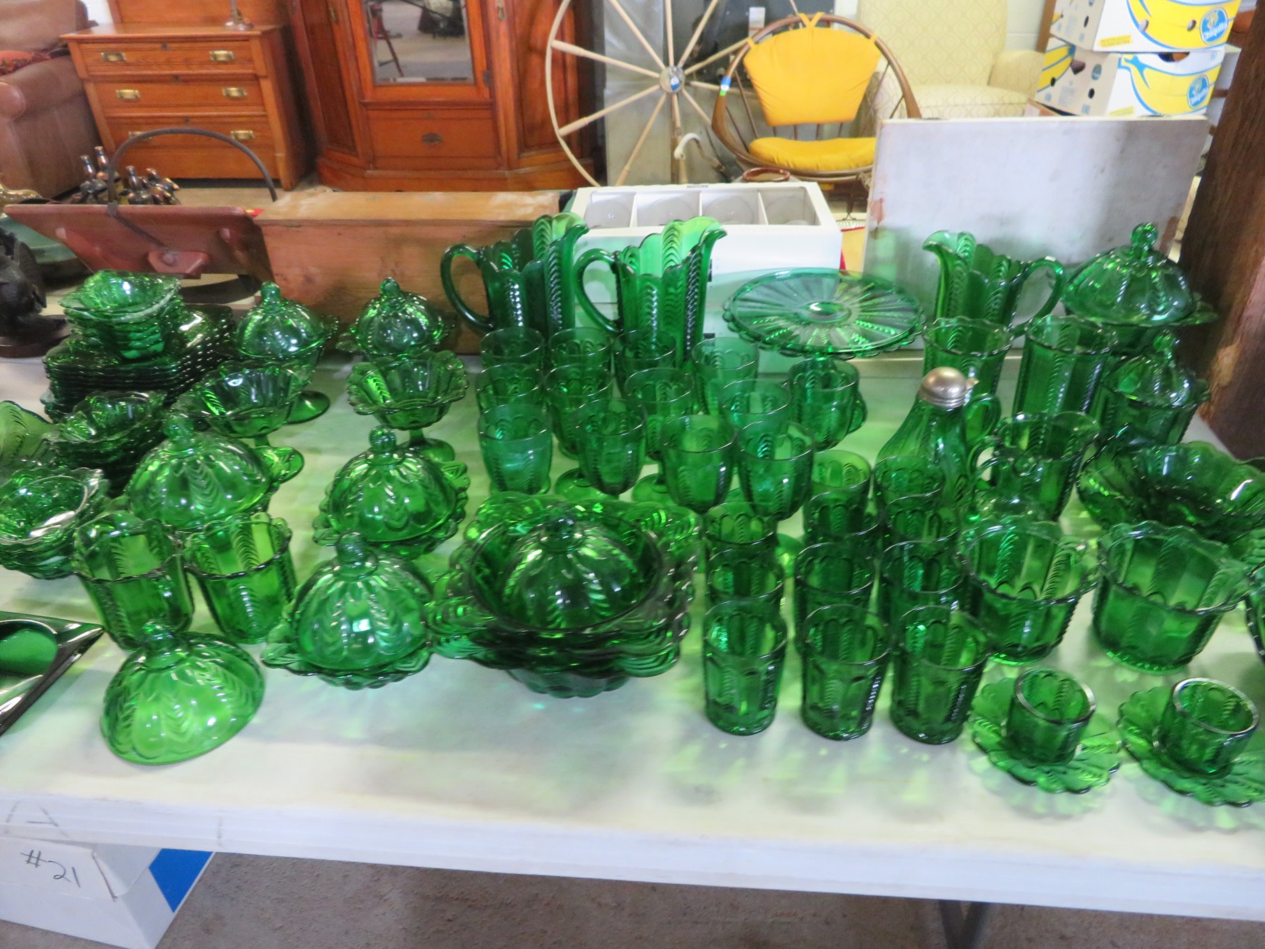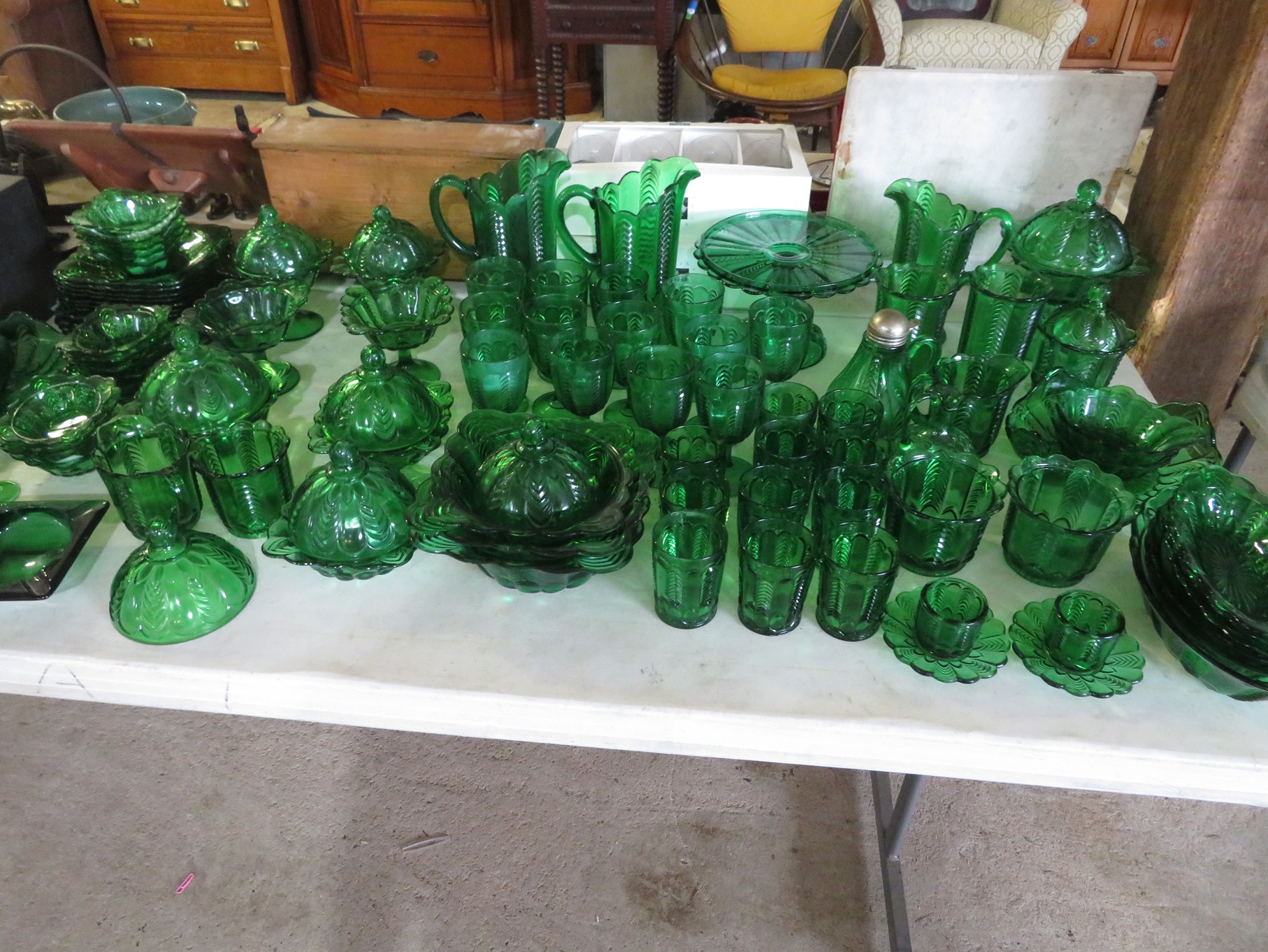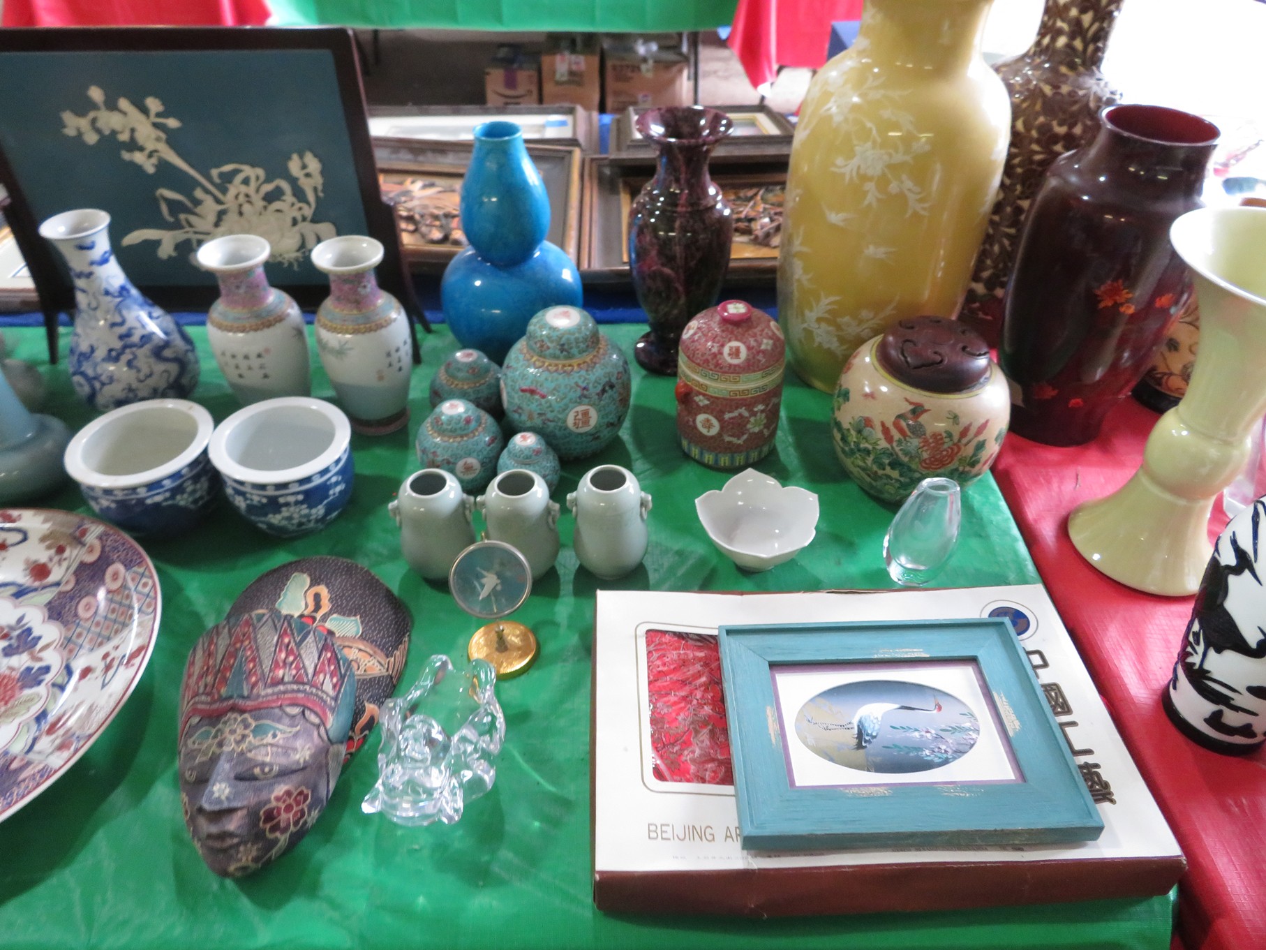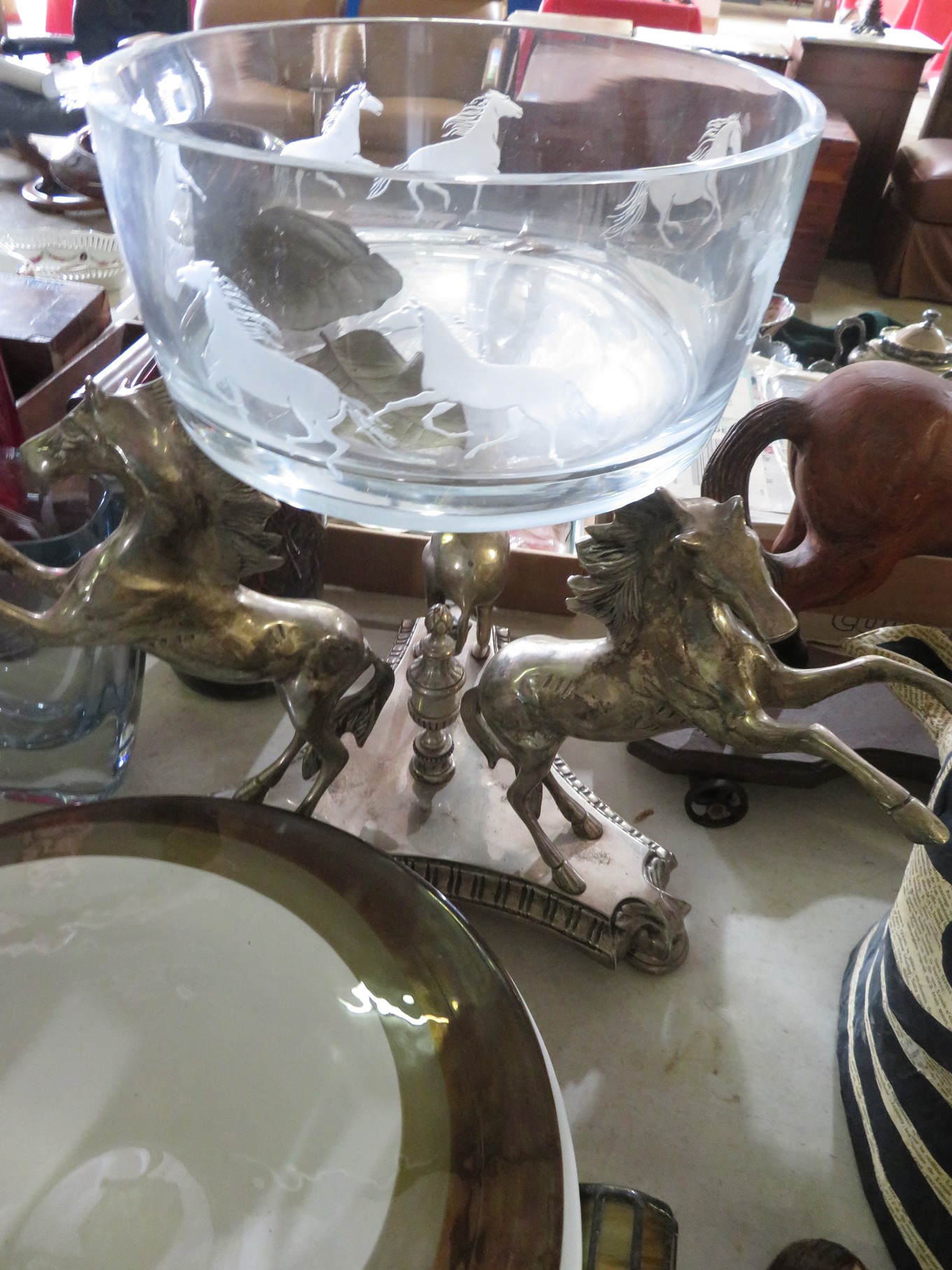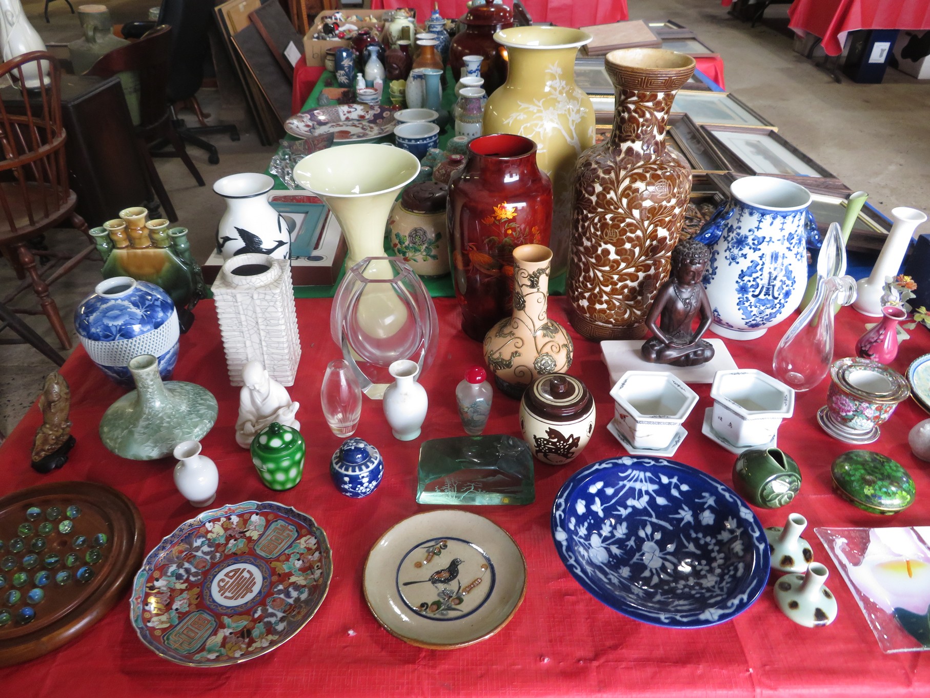 BACCARAT, STEUBEN, FENTON & MORE: Steuben turtle paperweight; Waterford frog; Fenton Hat vases in myriad sizes, shapes & colors; Cornucopias; Ruffled edge Silvercrest bowl; Red spread wing eagle; Bells and more; Baccarat; Clear Crystal, Colored and Art Glass Really unusual lion on nest in amber; Rabbits; Panther; Eagles; Turtles; Octopus; Red & green chili peppers; Cornucopias; Horse; Butterfly; Perfume bottles; Strawberry; Colts; Birds; Paperweights; Dozens of cobalt pieces and so much more! Depression Green S&P shakers; Yellow candelabra; Yellow candlesticks; Yellow cornucopias and more.; MORE Super China, Glass & Collectibles Incredible 3 piece white dragon set; Tremendous Franz vase with butterfly shaped top; Franz bowl; Dragon candlesticks; Candleholders; Trinket boxes; Pin dishes; Tiny vases; Franklin Mint coffee set with sugar & creamer; Porcelain foo dogs; Planters on stands; Oriental vases; Elephant figures; Pembroke Corgi; Owls; Water buffalo; Jar with giraffes; Lidded ginger jar with 3D dolphins; Eagles; Rose Famille bowl; Decorated ovoid shapes; Dancers; Wall pockets; Jardinia Harmony Ball Kingdom lidded cachepots; Rinconada boxes with inserts, figures & nameplate; Lenox cartoon characters, animals & figures; Oriental plates & bowls; Green dragon decorated egg; Gold over green decanter set; Mud men figures; Noritake ‘Phyllis’ dinnerware set; Large collection of Forest Green glassware; Spongeware pottery in red & blue; Studio pottery; Wedgwood ‘Florentine’ dinnerware set; Jan Richardson, Windy Meadows Rosebrier Cottage, Made in Maryland, signed & numbered; Leone Kuhne Kachinas; Kitty’s Critters frogs; Goebel bird with hat; Dalzell Leaping dolphins statue; Neil Eyre signed & numbered Chameleons, Lizards, & more; Kitty’s Critters Ladybugs; Set of 7 Immortals figures; Harmony Kingdom; Enameled tiger trinket box with insert; Neiman Marcus turtle & rabbit on base; Royal Haeger vase with label; McCoy Dutch shoes planter; Heisey pink horse statue; Turov giraffe in a suit, rabbit & turtle; Villeroy & Boch; Swarovski; Jim Shore figurines and more!