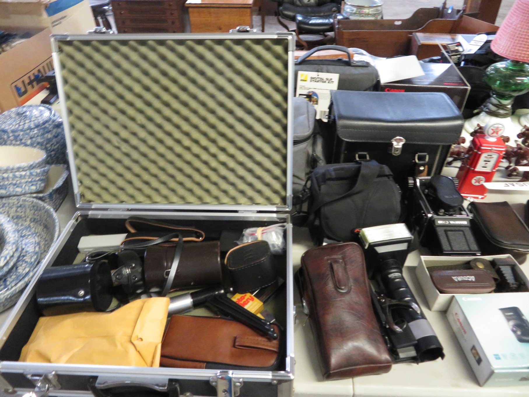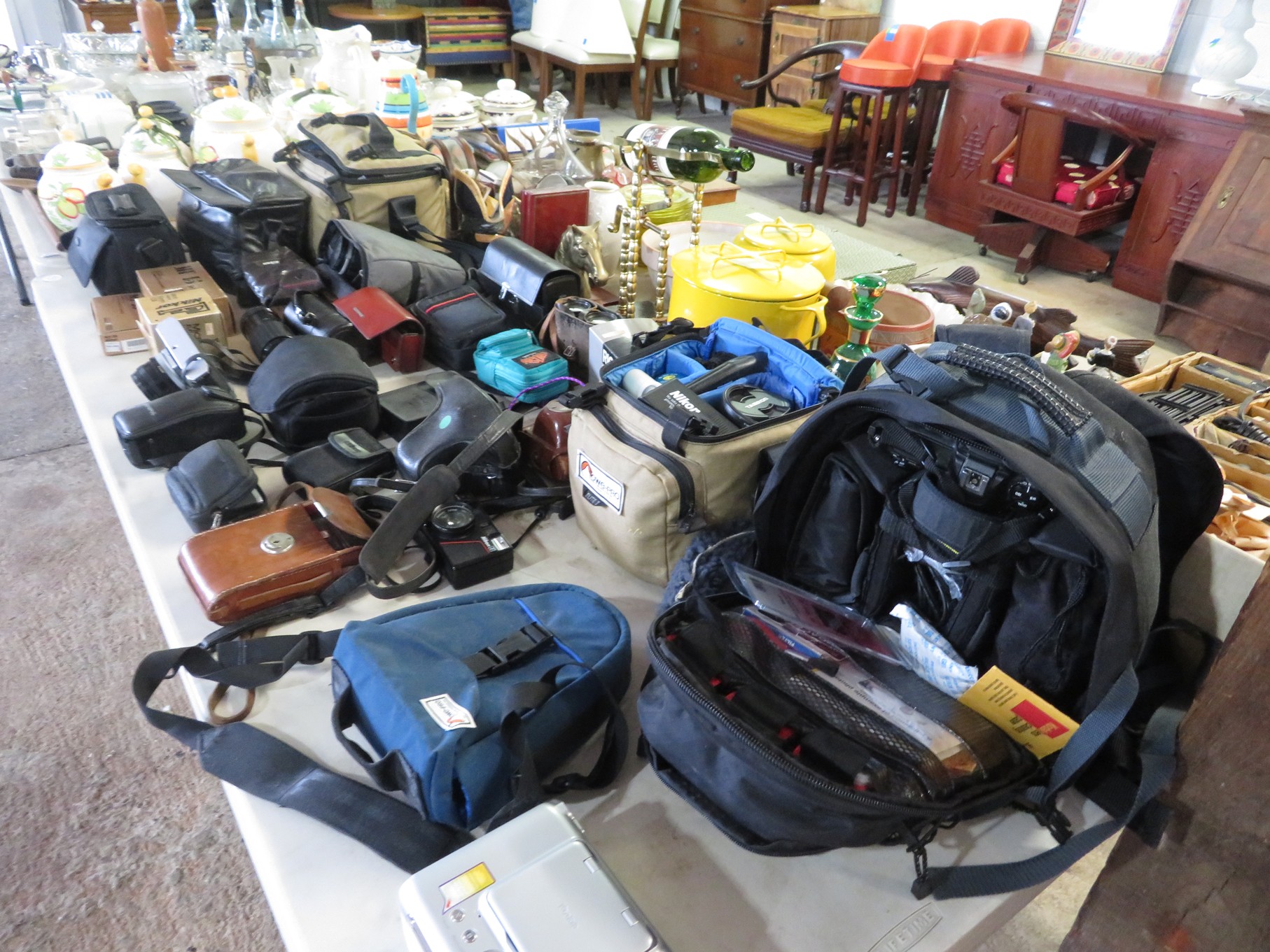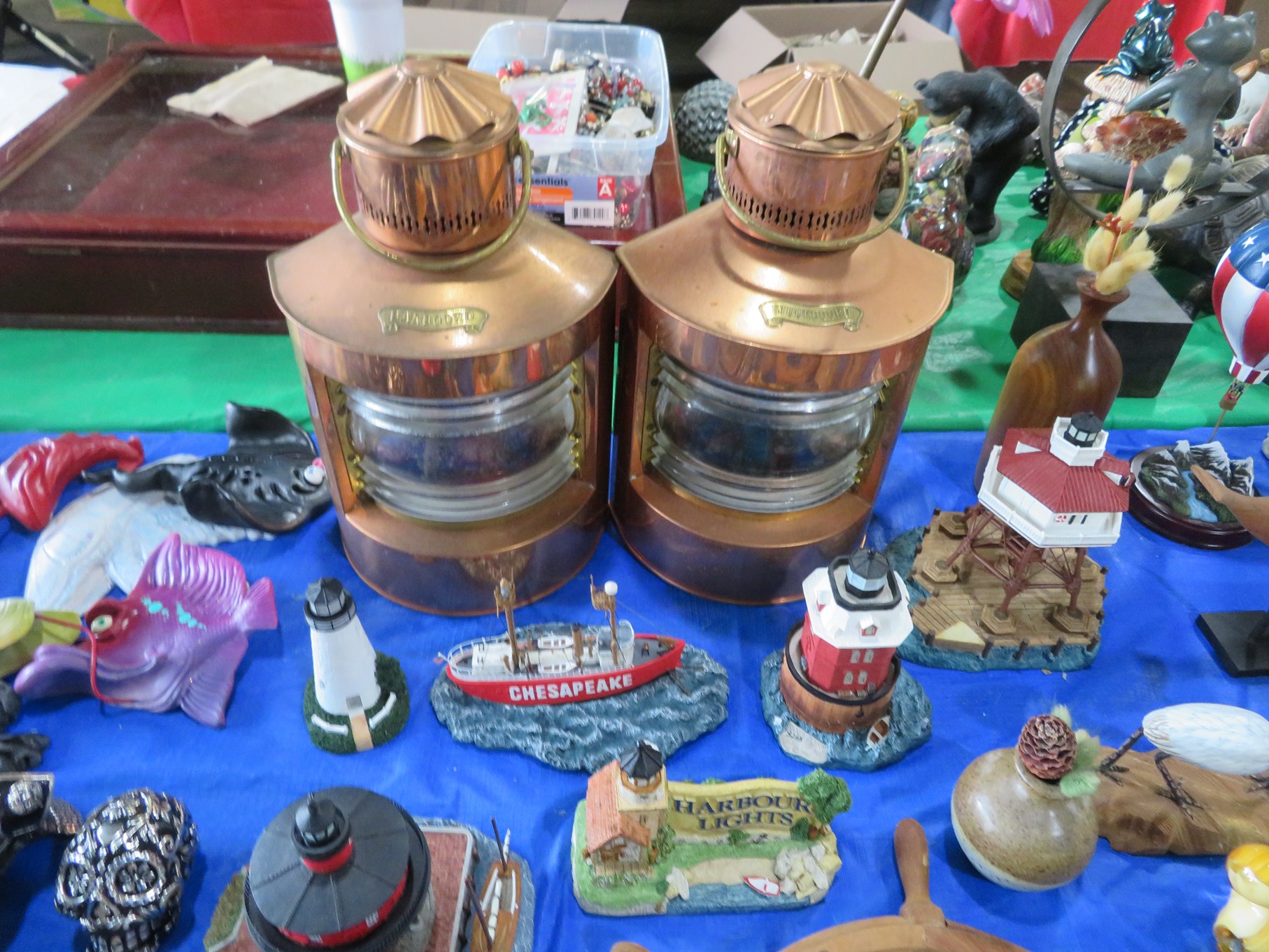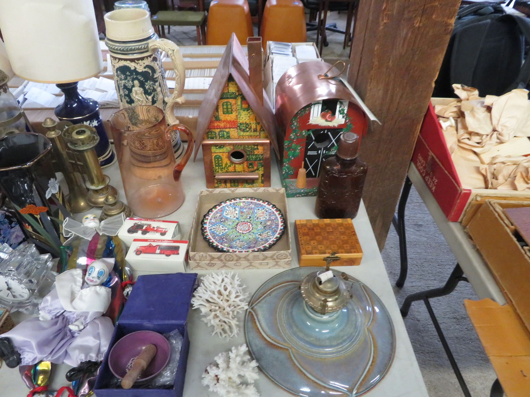 MORE: Duck Decoys; Chair with tractor seat, wagon wheel base and horseshoe arms & back; Slab of petrified wood; Ship’s wheel; Hallmark Gold Crown sign; Hames; Made Rite Bread wooden shipping box; Acoustic guitar; Garden seat; Tables of boxes of sports cards and collectible trading cards; Bird houses; Keepsake boxes; Crstal clock; Sea coral specimens; Toy RR cars, track and more; Old baseballs; Ox yoke; Dansk yellow fondue pot & stock pot with lid; Mixing bowl set; Copper colanders; Brass horsehead bookends; Wall mounted coffee grinders; Snuff bottle; Foo dogs; Cloisonne vases; Pepsi-Cola glasses; Steins; Egyptian figures; Prisms; Tassels; Fishing floats; Nautical decorator accents; Ship’s wheel clock; Octopus lamp; Copper ship’s lanterns; Lighthouses; Pinocchio comic book; Dresser set in box; Lots of old cameras & accessories; Nikkor; Lenses; Bags; Camera bodies; Ricoh; Canon Rebel EOS; Canon PowerShot; Olympia; Bushnell binoculars; Stereo-viewers with cards; Old black View Master viewer; Fine and costume jewelry; Much Much More!