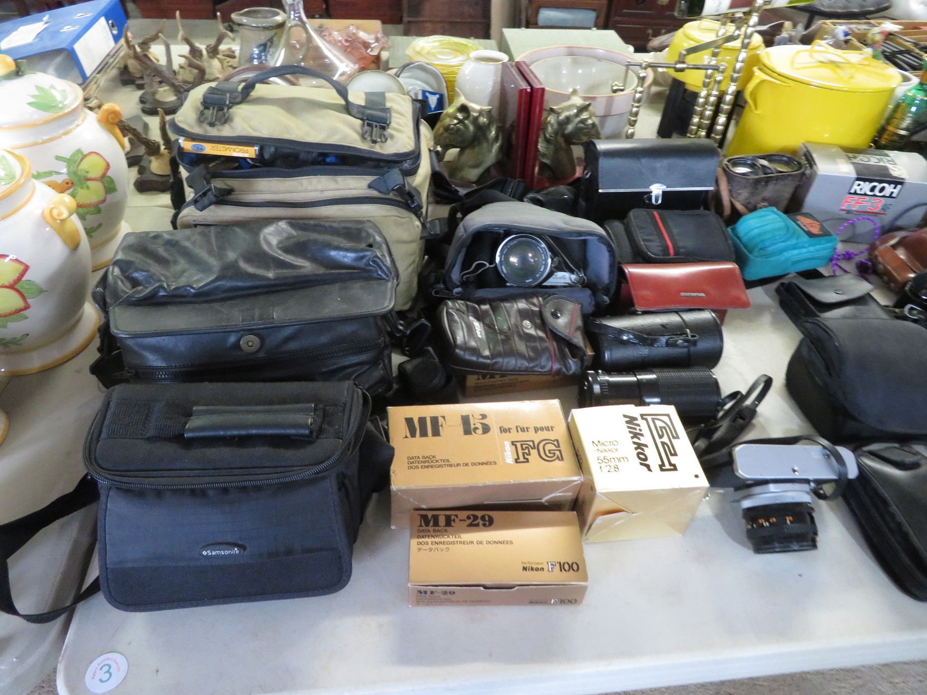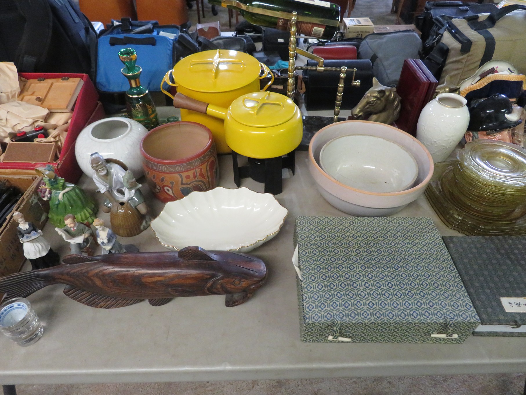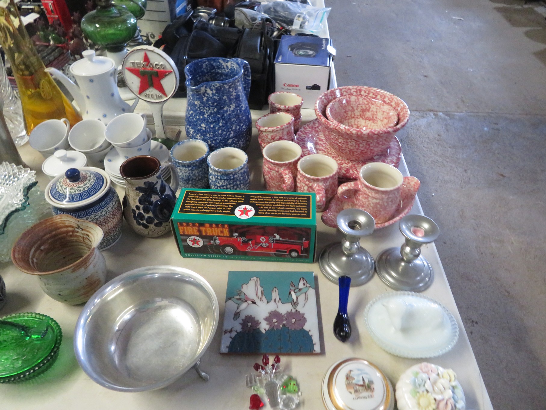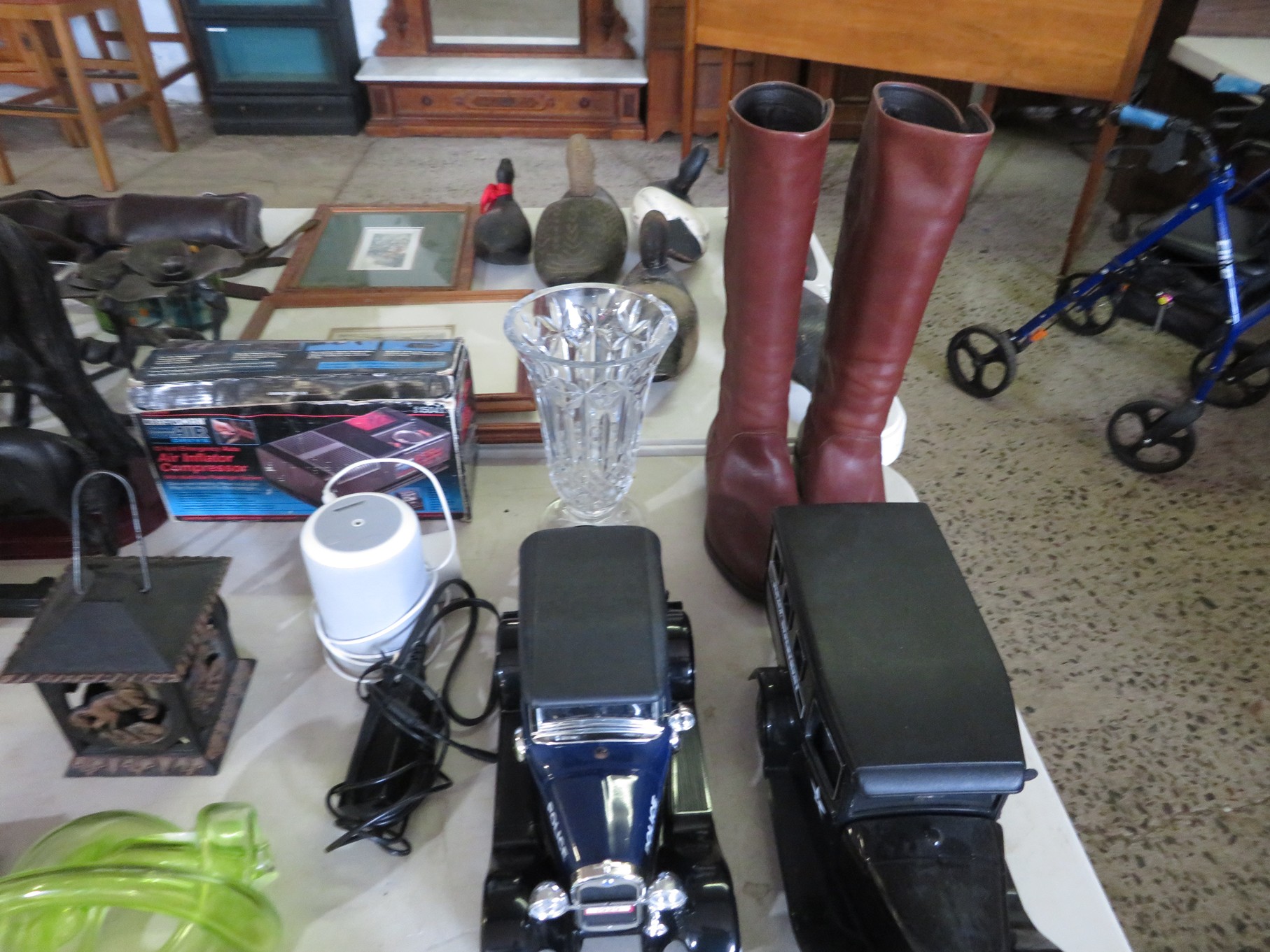 MORE: Duck Decoys; Chair with tractor seat, wagon wheel base and horseshoe arms & back; Slab of petrified wood; Ship’s wheel; Hallmark Gold Crown sign; Hames; Made Rite Bread wooden shipping box; Acoustic guitar; Garden seat; Tables of boxes of sports cards and collectible trading cards; Bird houses; Keepsake boxes; Crstal clock; Sea coral specimens; Toy RR cars, track and more; Old baseballs; Ox yoke; Dansk yellow fondue pot & stock pot with lid; Mixing bowl set; Copper colanders; Brass horsehead bookends; Wall mounted coffee grinders; Snuff bottle; Foo dogs; Cloisonne vases; Pepsi-Cola glasses; Steins; Egyptian figures; Prisms; Tassels; Fishing floats; Nautical decorator accents; Ship’s wheel clock; Octopus lamp; Copper ship’s lanterns; Lighthouses; Pinocchio comic book; Dresser set in box; Lots of old cameras & accessories; Nikkor; Lenses; Bags; Camera bodies; Ricoh; Canon Rebel EOS; Canon PowerShot; Olympia; Bushnell binoculars; Stereo-viewers with cards; Old black View Master viewer; Fine and costume jewelry; Much Much More!