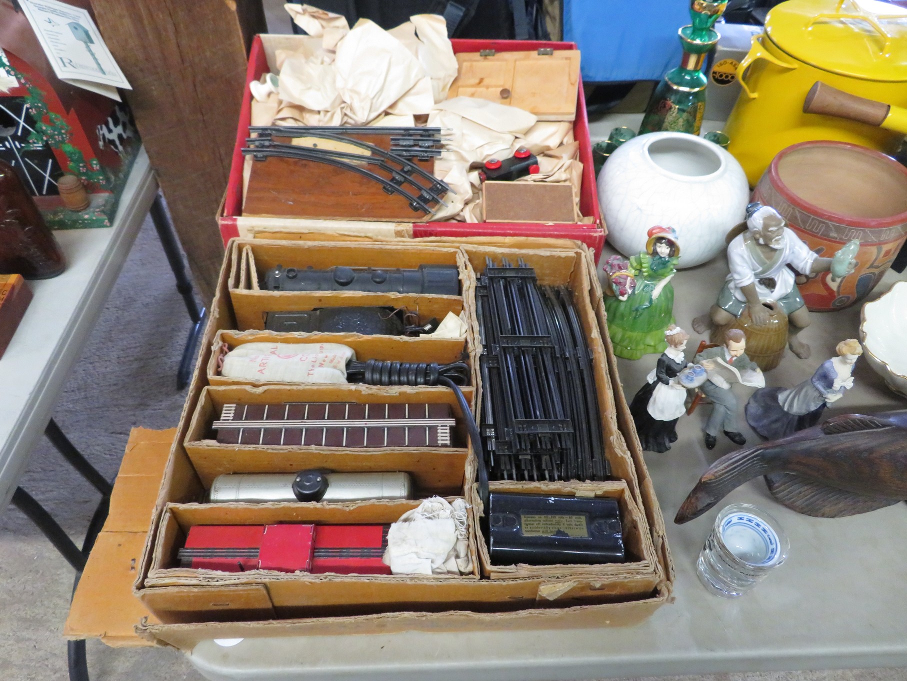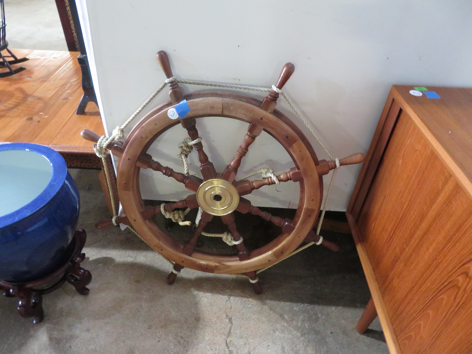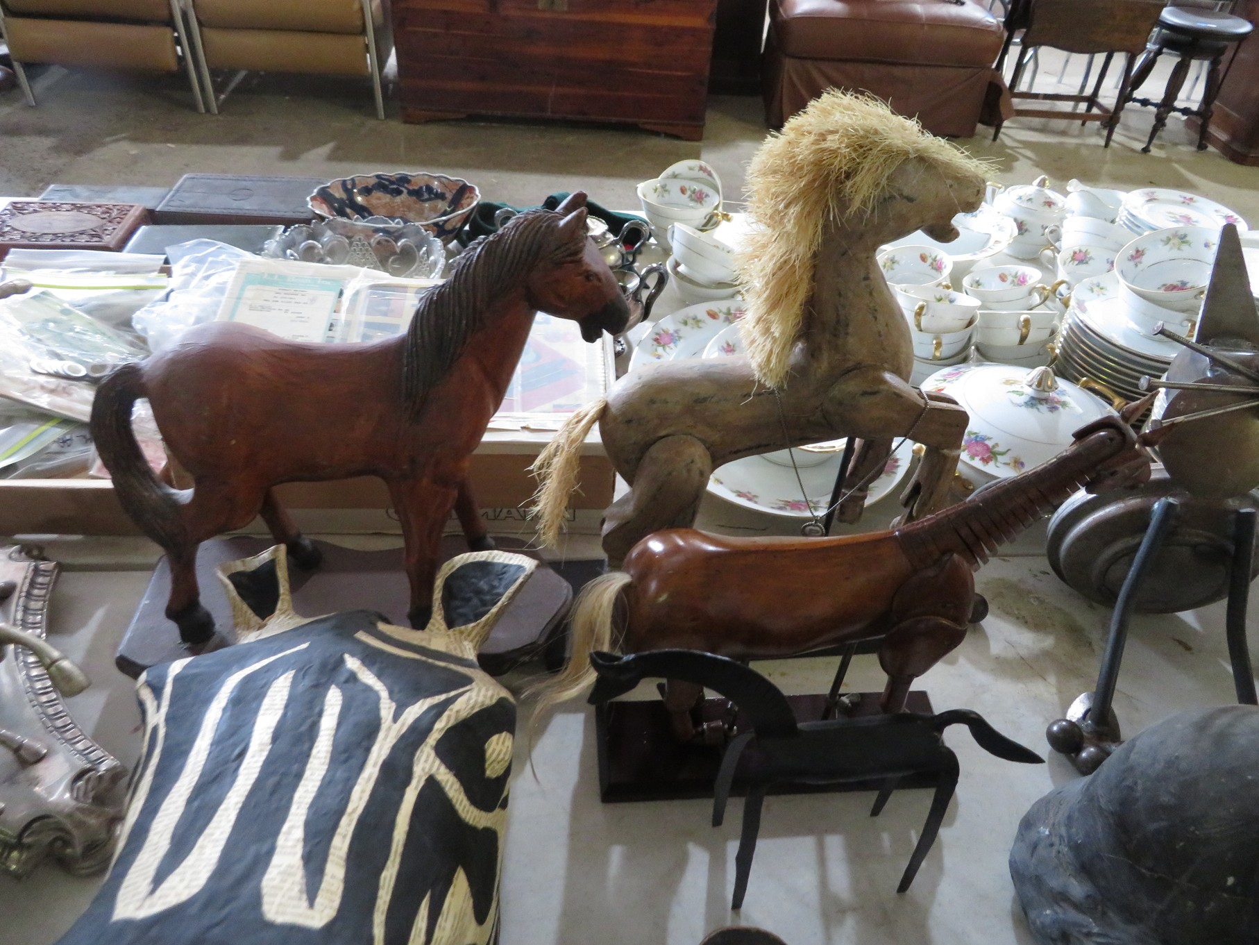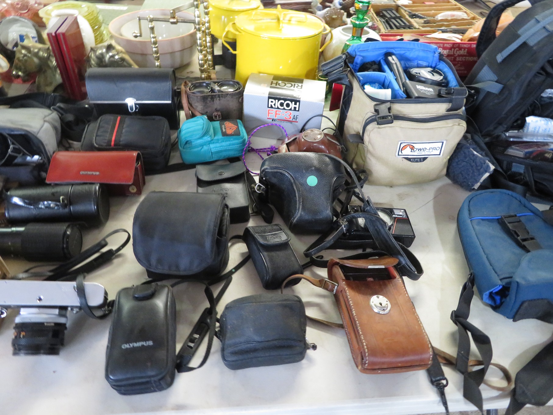 MORE: Duck Decoys; Chair with tractor seat, wagon wheel base and horseshoe arms & back; Slab of petrified wood; Ship’s wheel; Hallmark Gold Crown sign; Hames; Made Rite Bread wooden shipping box; Acoustic guitar; Garden seat; Tables of boxes of sports cards and collectible trading cards; Bird houses; Keepsake boxes; Crstal clock; Sea coral specimens; Toy RR cars, track and more; Old baseballs; Ox yoke; Dansk yellow fondue pot & stock pot with lid; Mixing bowl set; Copper colanders; Brass horsehead bookends; Wall mounted coffee grinders; Snuff bottle; Foo dogs; Cloisonne vases; Pepsi-Cola glasses; Steins; Egyptian figures; Prisms; Tassels; Fishing floats; Nautical decorator accents; Ship’s wheel clock; Octopus lamp; Copper ship’s lanterns; Lighthouses; Pinocchio comic book; Dresser set in box; Lots of old cameras & accessories; Nikkor; Lenses; Bags; Camera bodies; Ricoh; Canon Rebel EOS; Canon PowerShot; Olympia; Bushnell binoculars; Stereo-viewers with cards; Old black View Master viewer; Fine and costume jewelry; Much Much More!