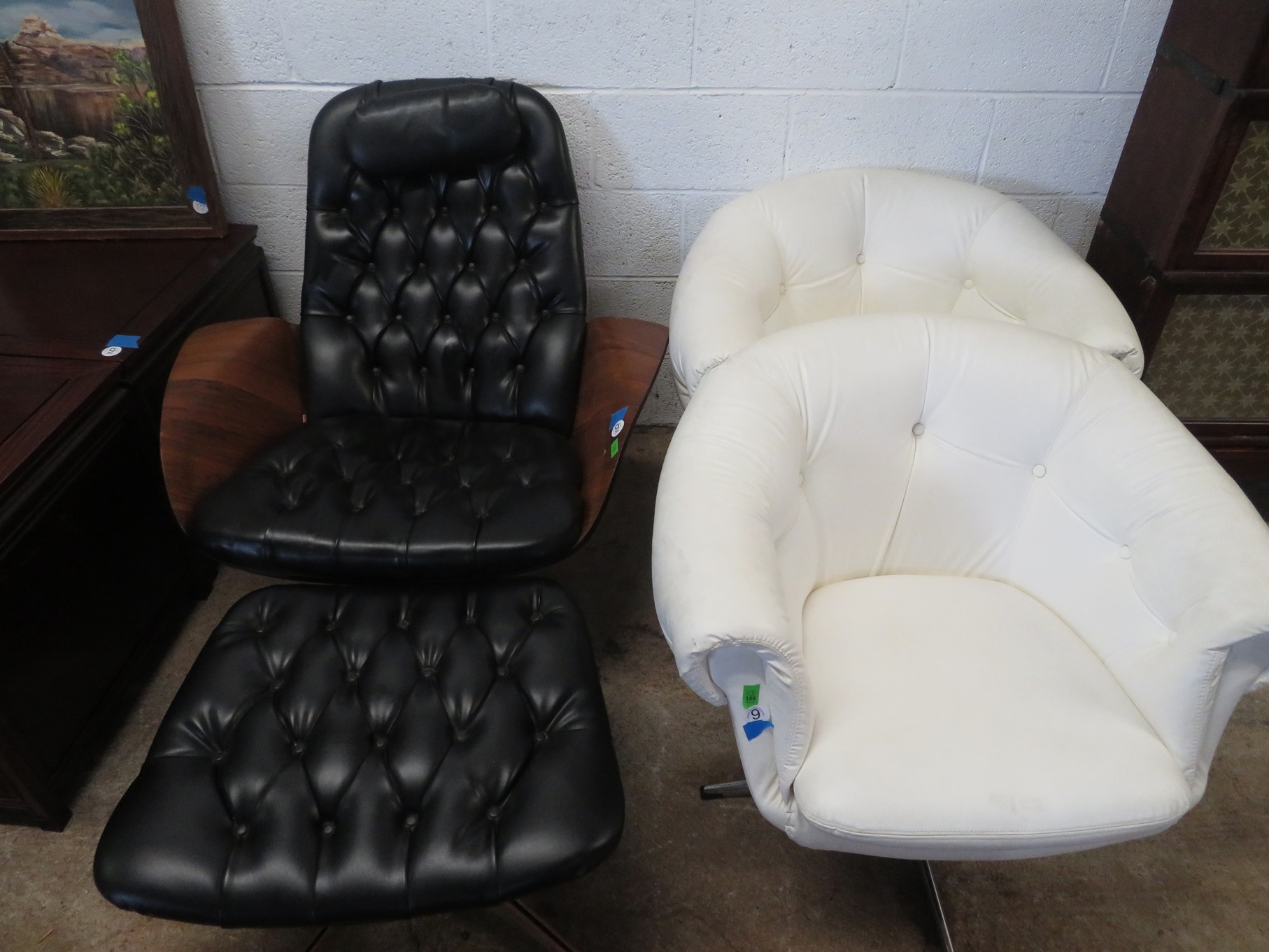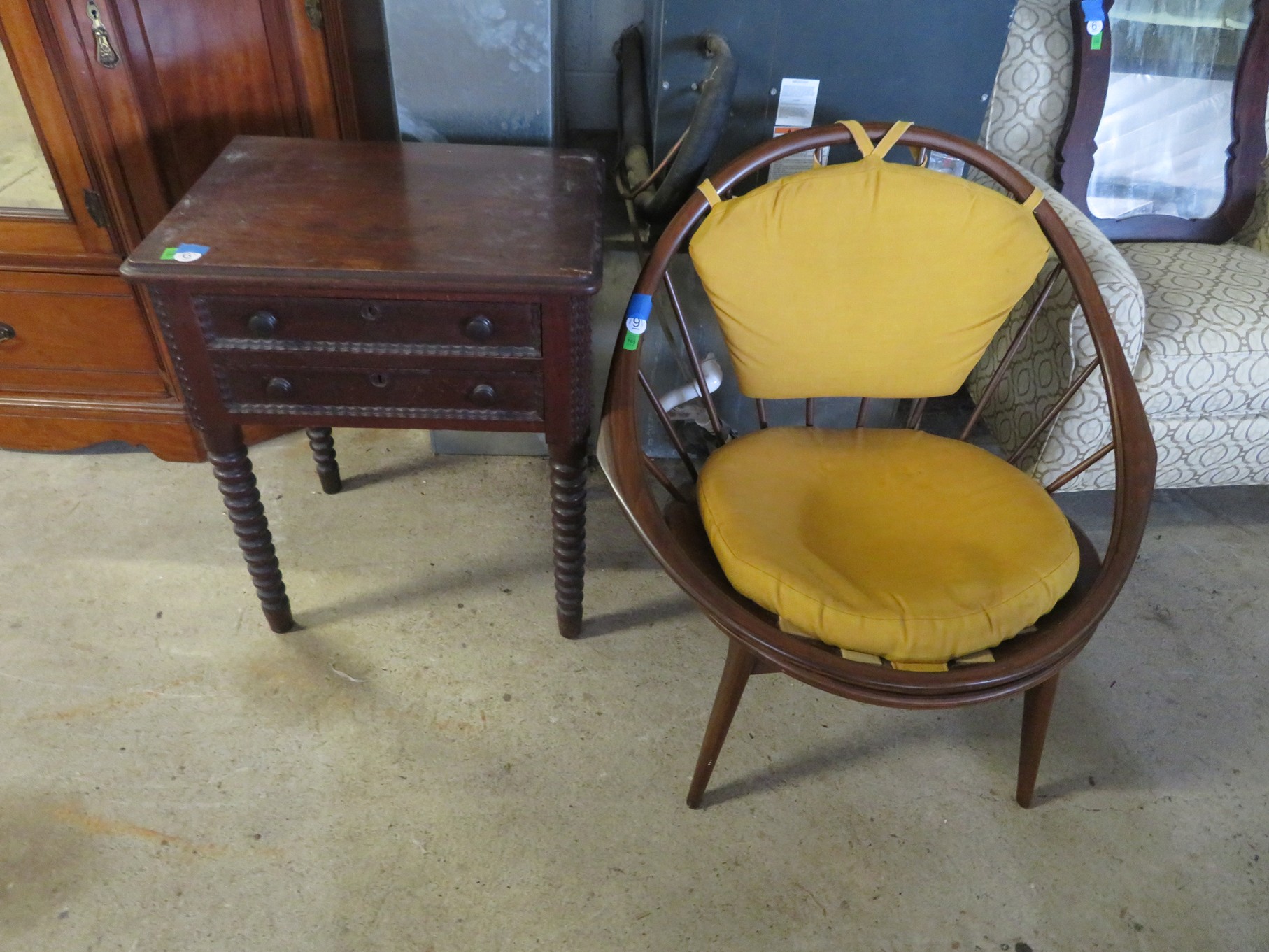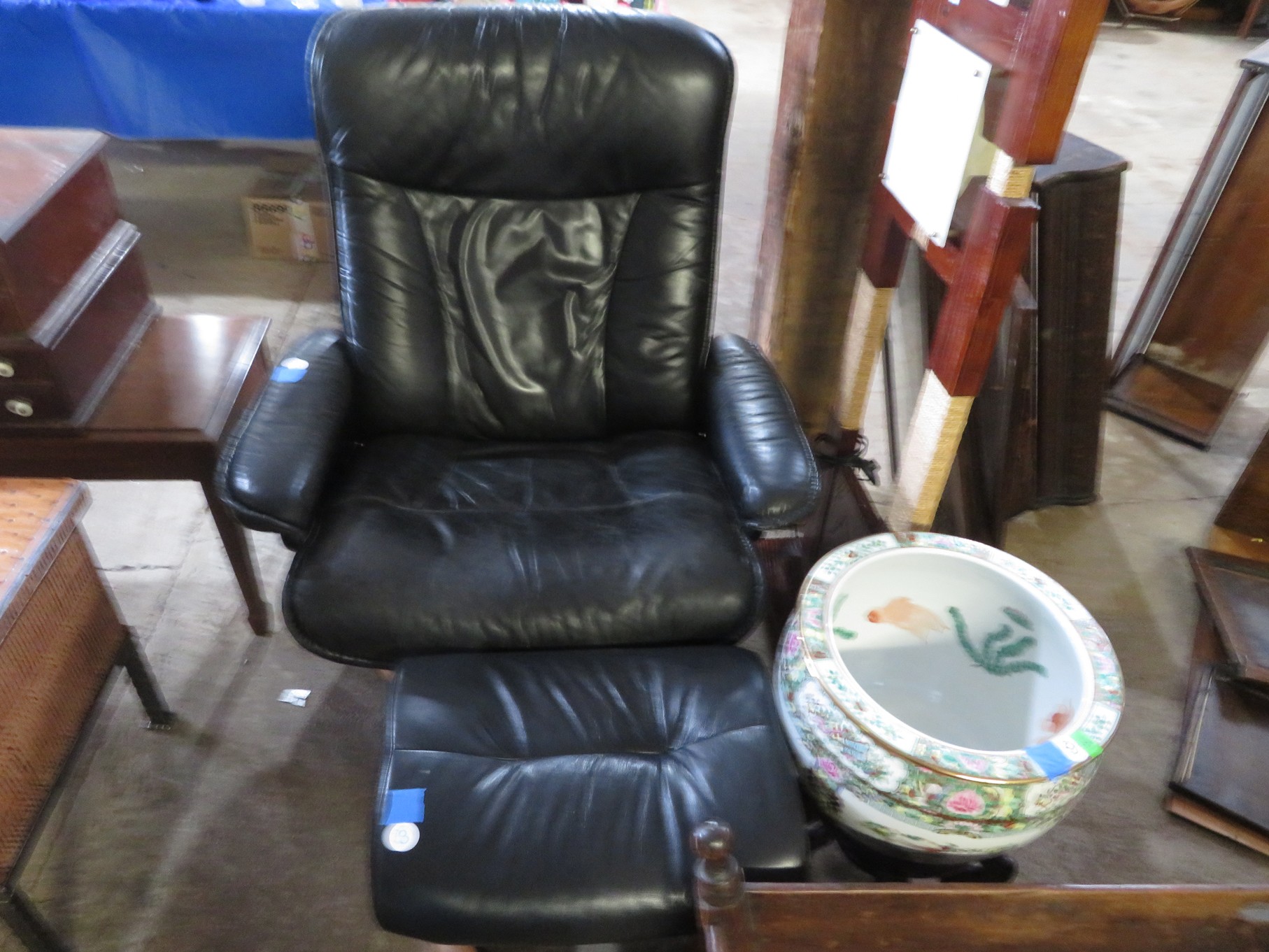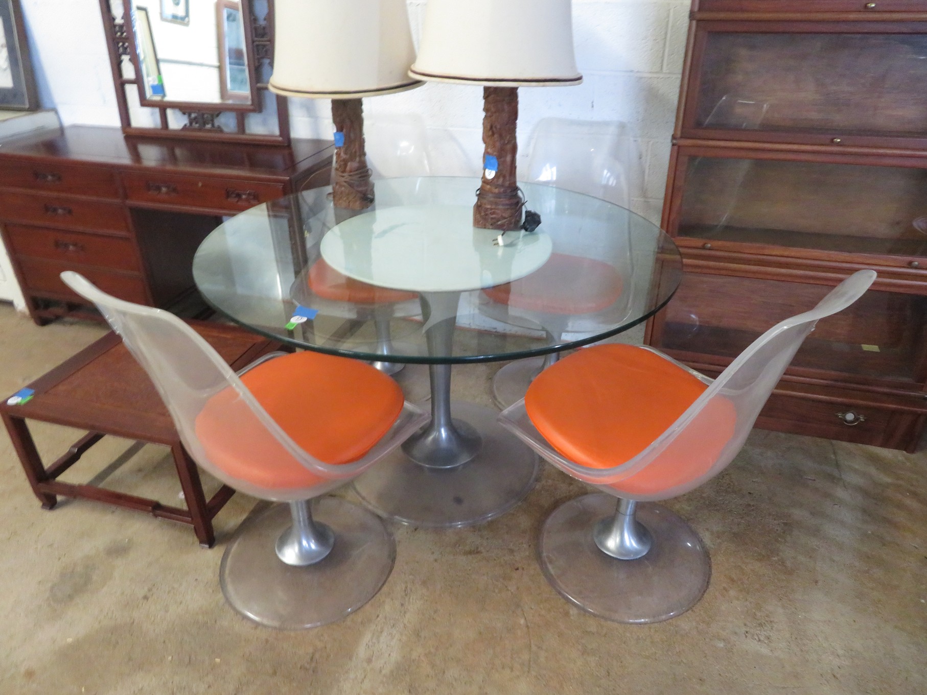 FURNITURE AND FURNISHINGS: MCM Furniture! Fine dining table with 4 chairs; Round tulip base table with 4 matching chairs; Fantastic buffet with display top; Lockable server with double flip out top leaves; Floor lamp; Eames style easy chair with shaped wooden arms & matching ottoman; Pair of white leather club chairs; Buffet with floating display top; Pair of chrome frame easy chairs; Chrome bar seats with red tops; Stressless style chairs & ottomans; Armchair; Footstools; End tables; Magnificent marble top mirrored dresser with candle stands and drop pulls; Hall pier mirror with drawer & marble shelf; Sugar chest; 4 section stacking bookcase with flip down secretary section; 5 section stacking bookcase; Pair of matching 3 cushion leather sofas; Leather love seat; Large corner cabinet with double 8 pane doors of double blind doors; Cabinet with old white paint; Nice jelly cupboard with carved wood pulls; Another nice 5 section & base stacking bookcase; Pedestal side table; Piano stool; Martha Washington sewing cabinet; Flat top trunk; Old wooden high chair; Lots of chairs; Bench with drawer; Umbrella holder; Floor vase; Pottery base oil lamp; Double glass door bookcase; 3 section stacking bookcase; Golden oak dresser with mirror; 6 drawer spool cabinet; Unusually shaped armoire with mirror; Double drawer side table with twist legs; Cedar blanket box; Marble top cabinet; Side tables; Marble insert top plant stand; Drop leaf side table; Large ottoman; 4 drawer spool cabinet; Rolling office chair; Stacking bookcase on legs; Awesome pair of blue fishbowl planters on bases; Reverse painted clock; Hanging cabinet; Brass candelabra; Furniture with Chinese medallion decoration! Blanket box; Chest of drawers, nightstand pair & matching dresser; Another Oriental motif dresser with matching nightstands; Wooden plant holder with galvanized insert; Chair with Chinese medallion upholstery; Desk and chair with medallions; Triple panel oriental scene screen; Large fishbowl planter on base; Leather sofa; Floor cradle; Tiffany style table lamps; Heavily carved wooden table lamps; Pair of white with yellow flowers table lamps; Mantel clock; Mesh office chair; Curved seat bench; Fern stand; Painted cabinet; Wooden box; Room screens; Pair of interesting metal cylinder with handles table lamps; Striped children’s toy chest; Matching striped painted wall mirror; Bar seat trio; Pair of armchairs; Teak outdoor table and chairs; Teak bench and side table; 4 wrought iron chairs; Pair of rattan look lounge chairs with cushions; Patio table with 4 chairs; Huge planters; Marble table and 4 seats; Glass top outdoor tables and much more!