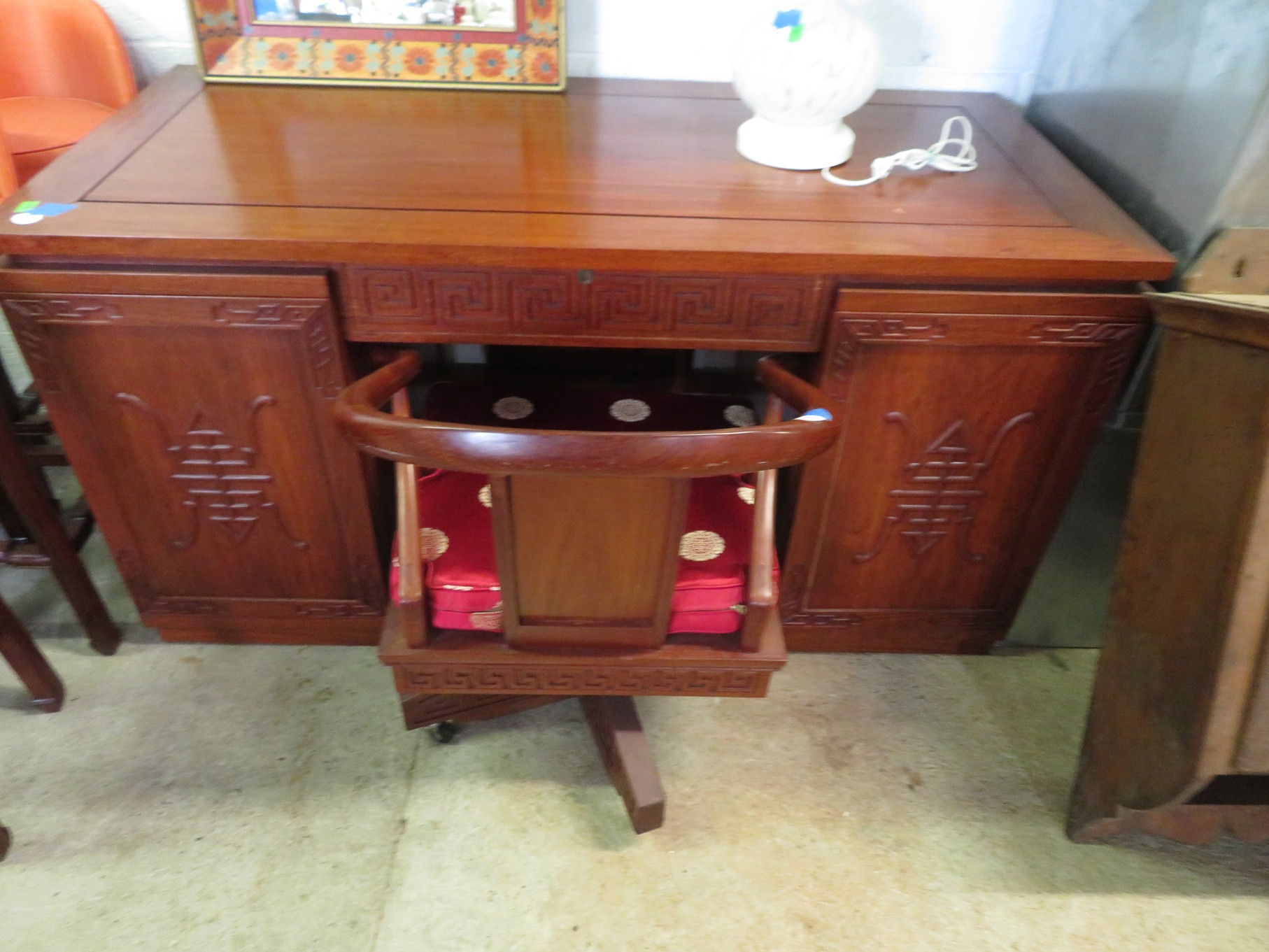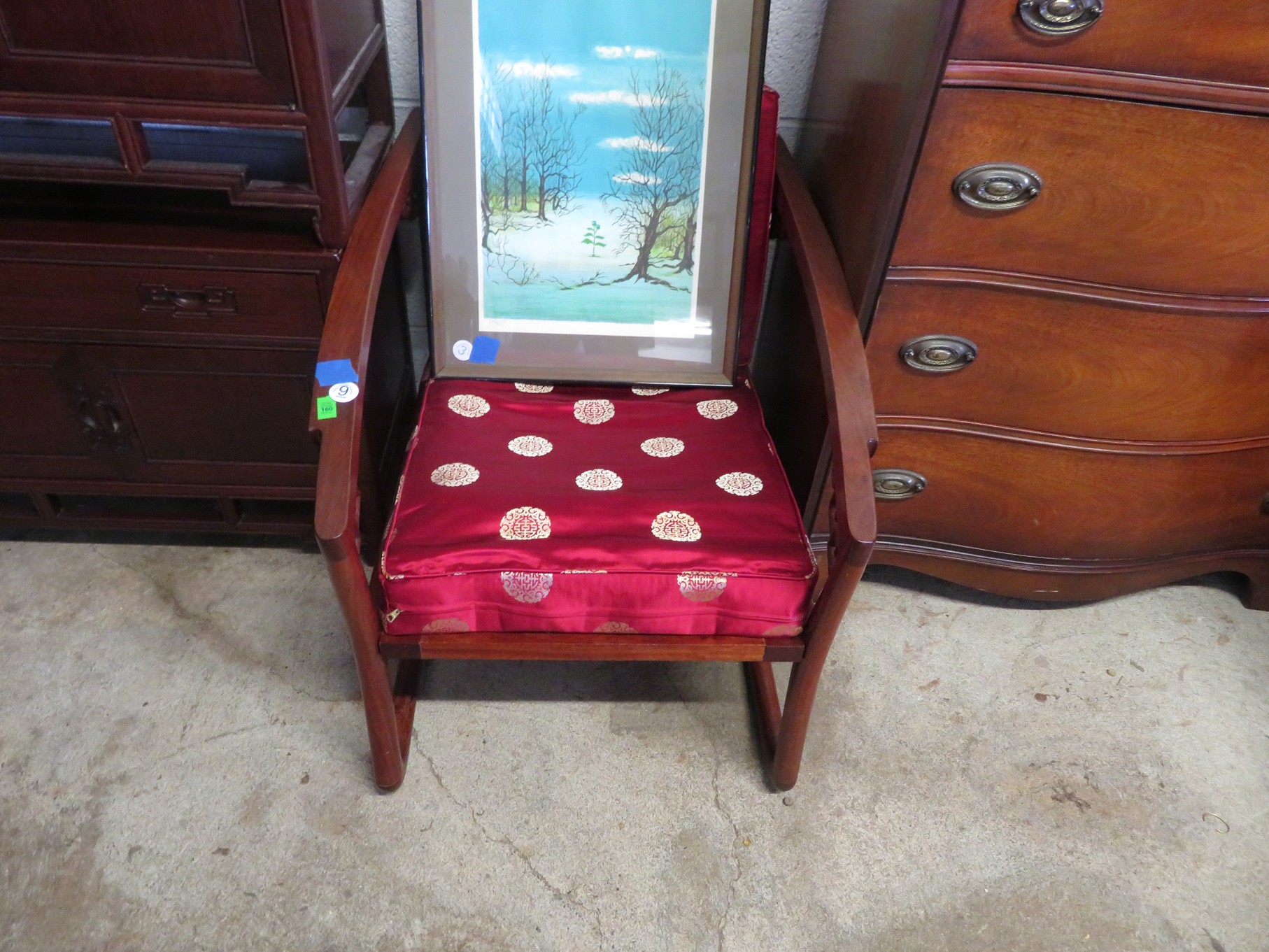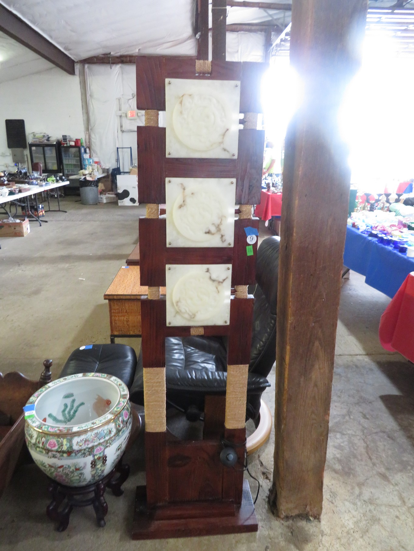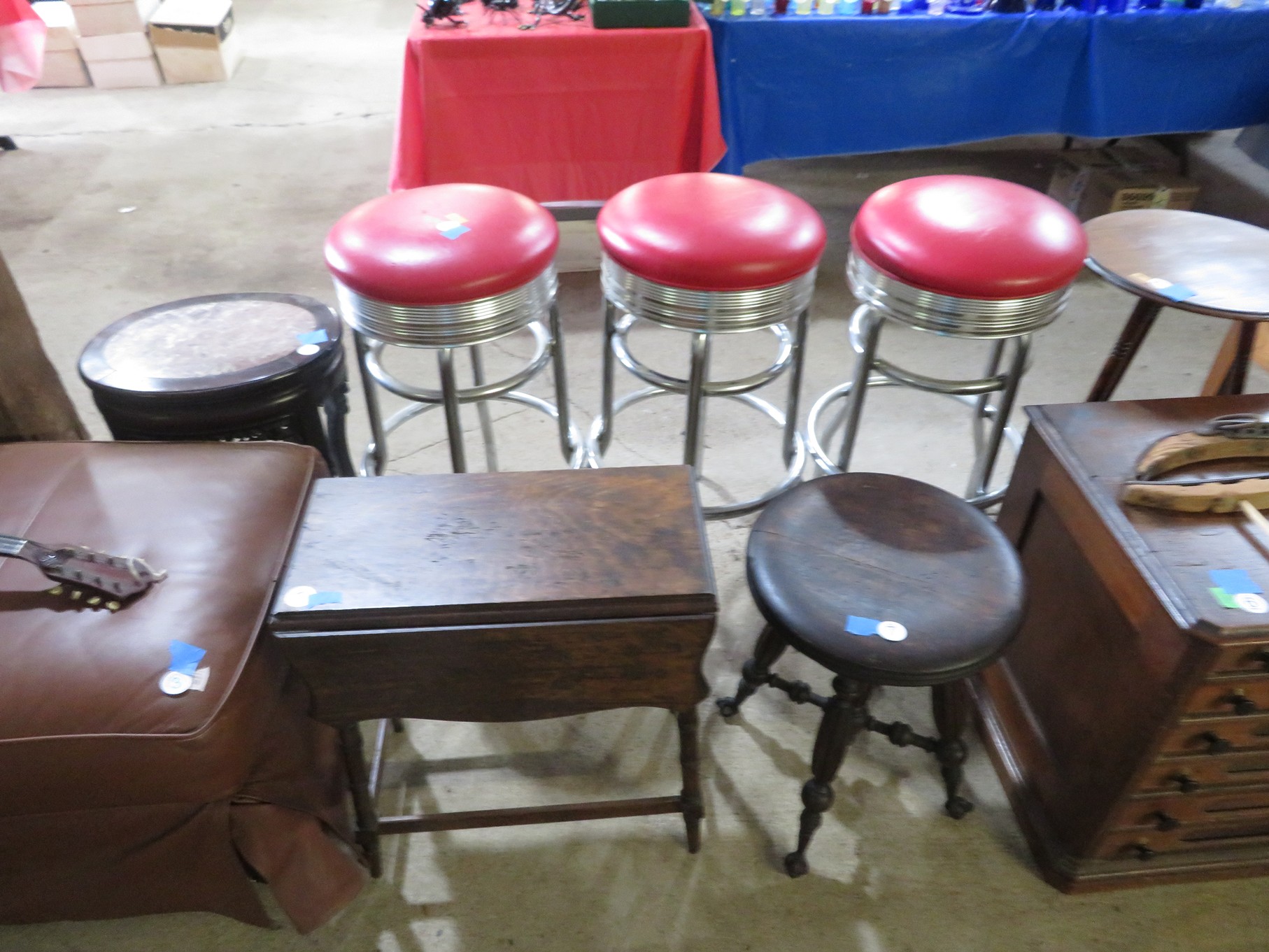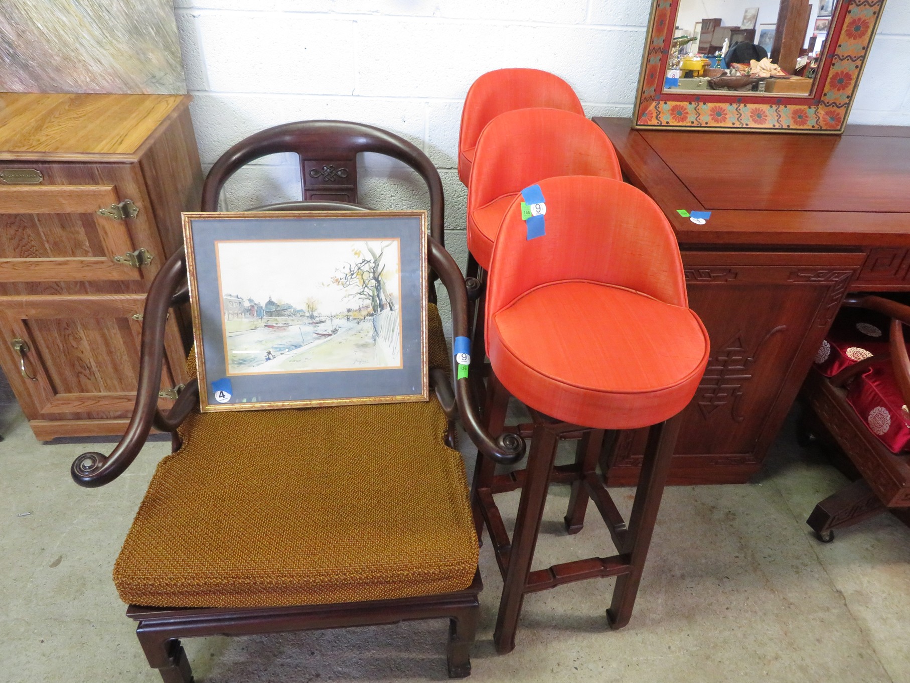 FURNITURE AND FURNISHINGS: MCM Furniture! Fine dining table with 4 chairs; Round tulip base table with 4 matching chairs; Fantastic buffet with display top; Lockable server with double flip out top leaves; Floor lamp; Eames style easy chair with shaped wooden arms & matching ottoman; Pair of white leather club chairs; Buffet with floating display top; Pair of chrome frame easy chairs; Chrome bar seats with red tops; Stressless style chairs & ottomans; Armchair; Footstools; End tables; Magnificent marble top mirrored dresser with candle stands and drop pulls; Hall pier mirror with drawer & marble shelf; Sugar chest; 4 section stacking bookcase with flip down secretary section; 5 section stacking bookcase; Pair of matching 3 cushion leather sofas; Leather love seat; Large corner cabinet with double 8 pane doors of double blind doors; Cabinet with old white paint; Nice jelly cupboard with carved wood pulls; Another nice 5 section & base stacking bookcase; Pedestal side table; Piano stool; Martha Washington sewing cabinet; Flat top trunk; Old wooden high chair; Lots of chairs; Bench with drawer; Umbrella holder; Floor vase; Pottery base oil lamp; Double glass door bookcase; 3 section stacking bookcase; Golden oak dresser with mirror; 6 drawer spool cabinet; Unusually shaped armoire with mirror; Double drawer side table with twist legs; Cedar blanket box; Marble top cabinet; Side tables; Marble insert top plant stand; Drop leaf side table; Large ottoman; 4 drawer spool cabinet; Rolling office chair; Stacking bookcase on legs; Awesome pair of blue fishbowl planters on bases; Reverse painted clock; Hanging cabinet; Brass candelabra; Furniture with Chinese medallion decoration! Blanket box; Chest of drawers, nightstand pair & matching dresser; Another Oriental motif dresser with matching nightstands; Wooden plant holder with galvanized insert; Chair with Chinese medallion upholstery; Desk and chair with medallions; Triple panel oriental scene screen; Large fishbowl planter on base; Leather sofa; Floor cradle; Tiffany style table lamps; Heavily carved wooden table lamps; Pair of white with yellow flowers table lamps; Mantel clock; Mesh office chair; Curved seat bench; Fern stand; Painted cabinet; Wooden box; Room screens; Pair of interesting metal cylinder with handles table lamps; Striped children’s toy chest; Matching striped painted wall mirror; Bar seat trio; Pair of armchairs; Teak outdoor table and chairs; Teak bench and side table; 4 wrought iron chairs; Pair of rattan look lounge chairs with cushions; Patio table with 4 chairs; Huge planters; Marble table and 4 seats; Glass top outdoor tables and much more!