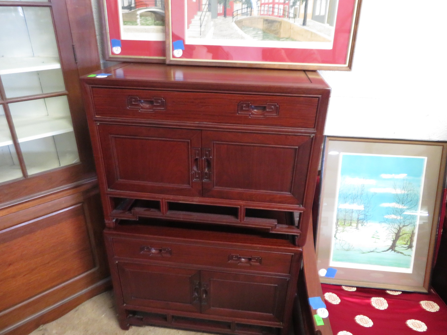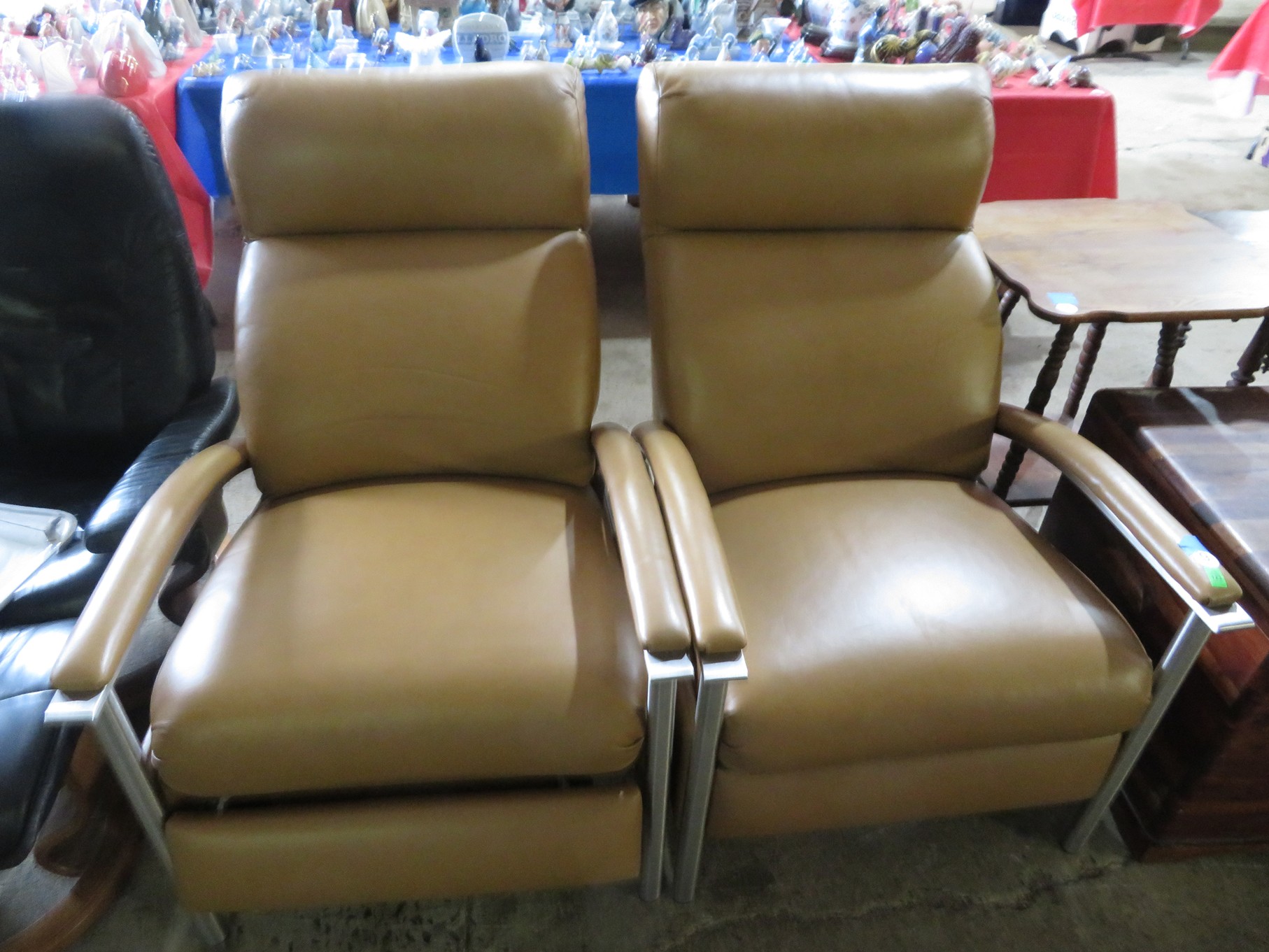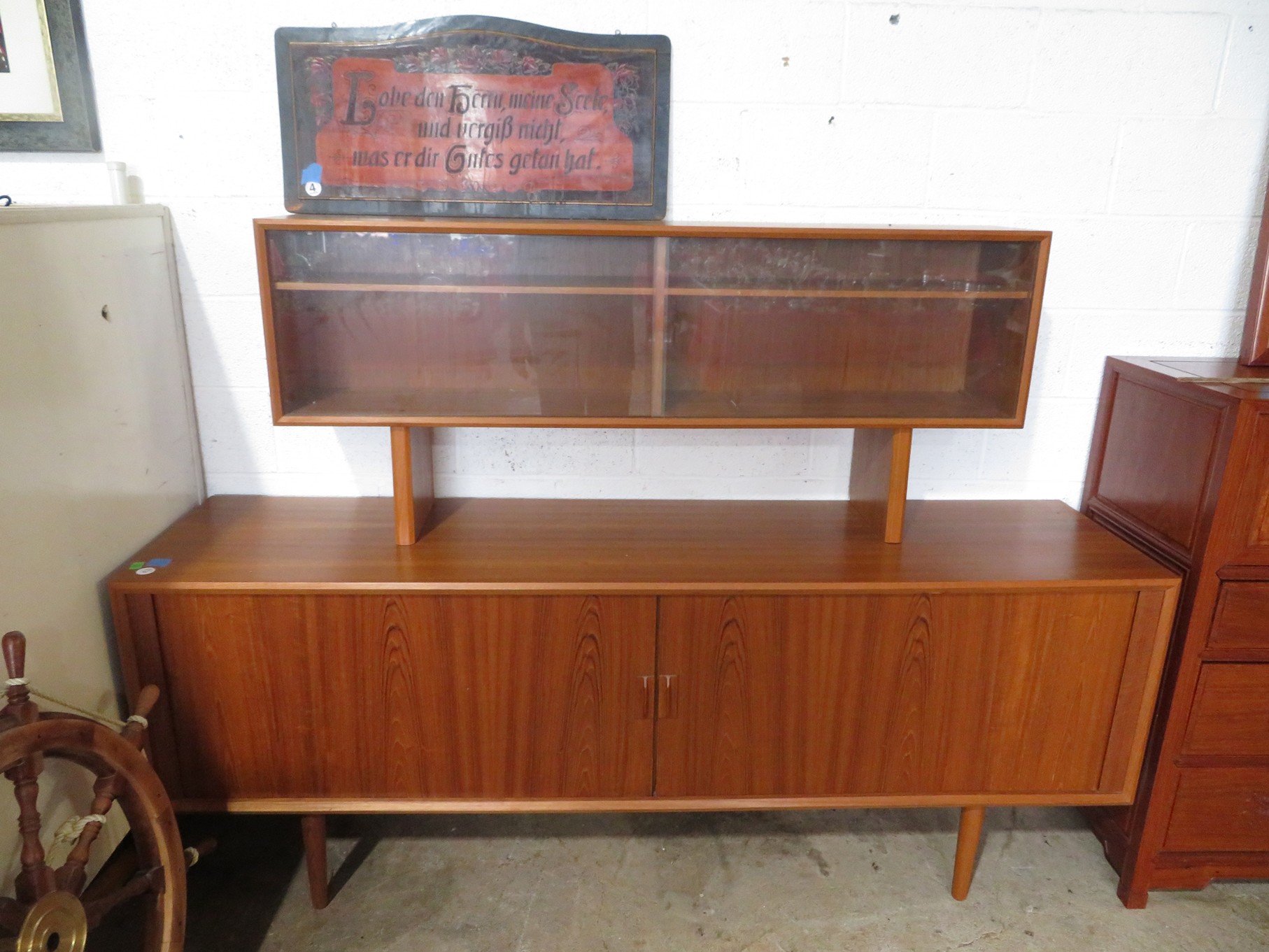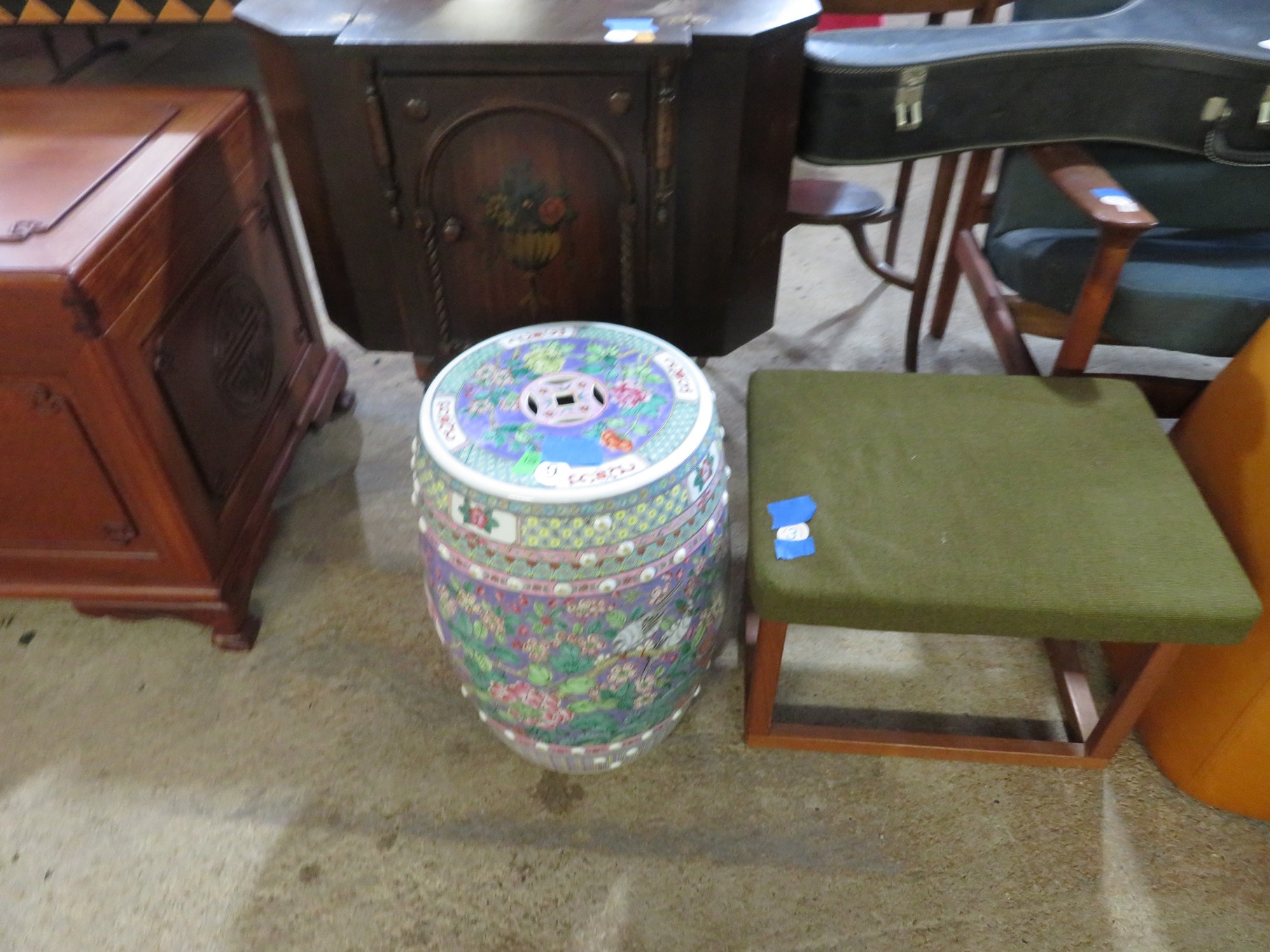 FURNITURE AND FURNISHINGS: MCM Furniture! Fine dining table with 4 chairs; Round tulip base table with 4 matching chairs; Fantastic buffet with display top; Lockable server with double flip out top leaves; Floor lamp; Eames style easy chair with shaped wooden arms & matching ottoman; Pair of white leather club chairs; Buffet with floating display top; Pair of chrome frame easy chairs; Chrome bar seats with red tops; Stressless style chairs & ottomans; Armchair; Footstools; End tables; Magnificent marble top mirrored dresser with candle stands and drop pulls; Hall pier mirror with drawer & marble shelf; Sugar chest; 4 section stacking bookcase with flip down secretary section; 5 section stacking bookcase; Pair of matching 3 cushion leather sofas; Leather love seat; Large corner cabinet with double 8 pane doors of double blind doors; Cabinet with old white paint; Nice jelly cupboard with carved wood pulls; Another nice 5 section & base stacking bookcase; Pedestal side table; Piano stool; Martha Washington sewing cabinet; Flat top trunk; Old wooden high chair; Lots of chairs; Bench with drawer; Umbrella holder; Floor vase; Pottery base oil lamp; Double glass door bookcase; 3 section stacking bookcase; Golden oak dresser with mirror; 6 drawer spool cabinet; Unusually shaped armoire with mirror; Double drawer side table with twist legs; Cedar blanket box; Marble top cabinet; Side tables; Marble insert top plant stand; Drop leaf side table; Large ottoman; 4 drawer spool cabinet; Rolling office chair; Stacking bookcase on legs; Awesome pair of blue fishbowl planters on bases; Reverse painted clock; Hanging cabinet; Brass candelabra; Furniture with Chinese medallion decoration! Blanket box; Chest of drawers, nightstand pair & matching dresser; Another Oriental motif dresser with matching nightstands; Wooden plant holder with galvanized insert; Chair with Chinese medallion upholstery; Desk and chair with medallions; Triple panel oriental scene screen; Large fishbowl planter on base; Leather sofa; Floor cradle; Tiffany style table lamps; Heavily carved wooden table lamps; Pair of white with yellow flowers table lamps; Mantel clock; Mesh office chair; Curved seat bench; Fern stand; Painted cabinet; Wooden box; Room screens; Pair of interesting metal cylinder with handles table lamps; Striped children’s toy chest; Matching striped painted wall mirror; Bar seat trio; Pair of armchairs; Teak outdoor table and chairs; Teak bench and side table; 4 wrought iron chairs; Pair of rattan look lounge chairs with cushions; Patio table with 4 chairs; Huge planters; Marble table and 4 seats; Glass top outdoor tables and much more!