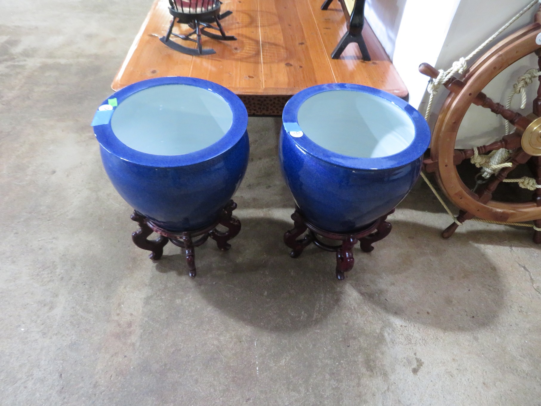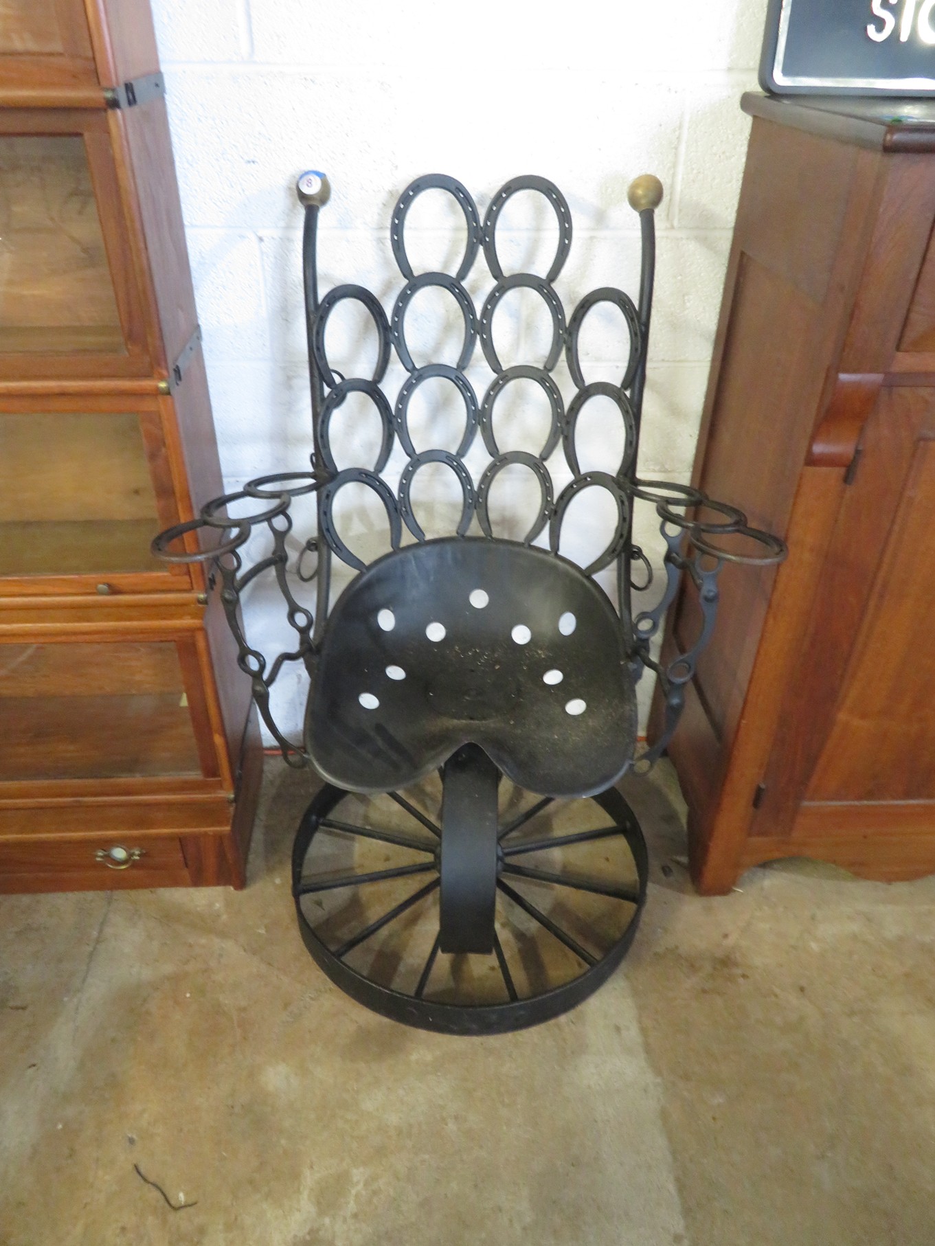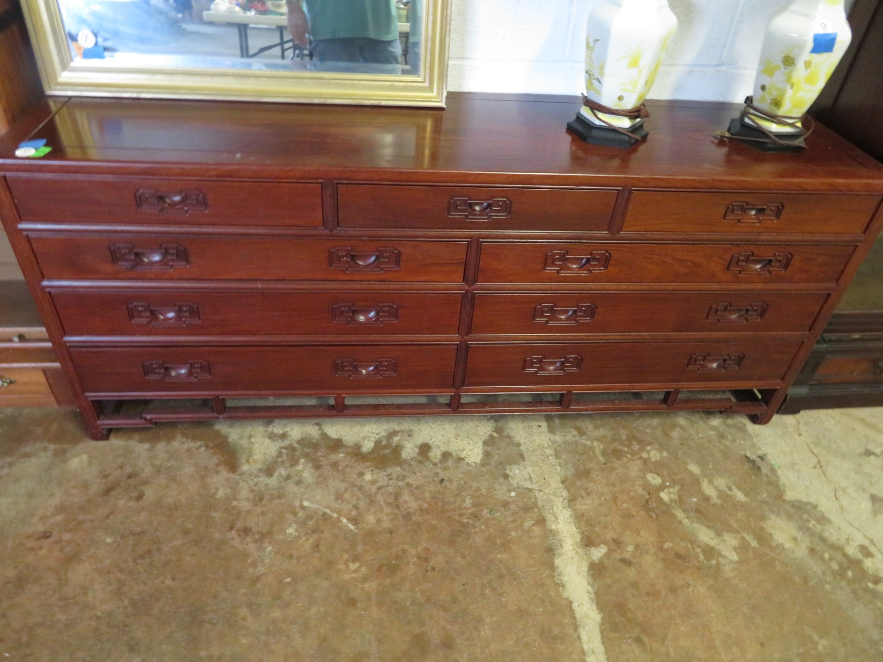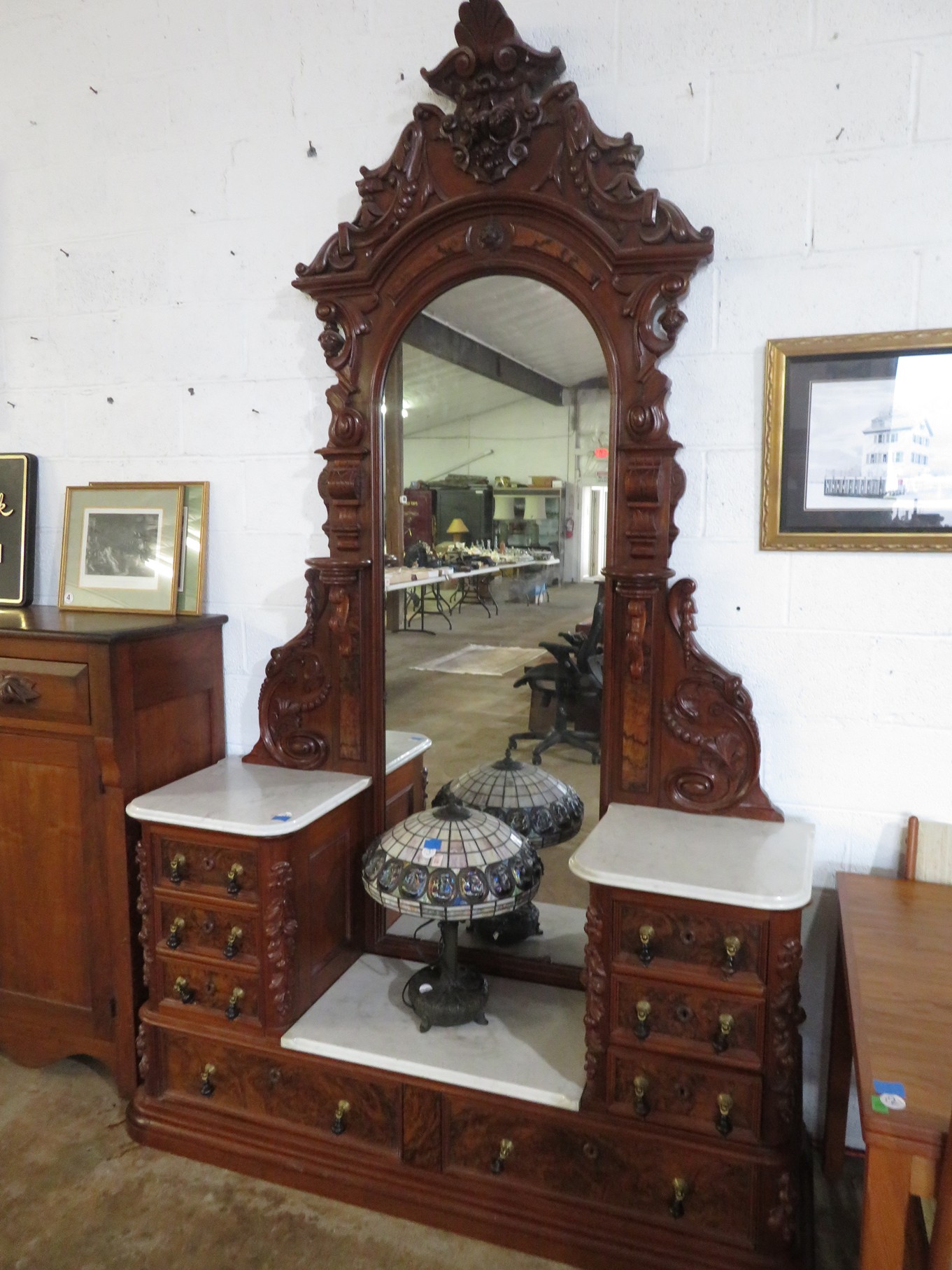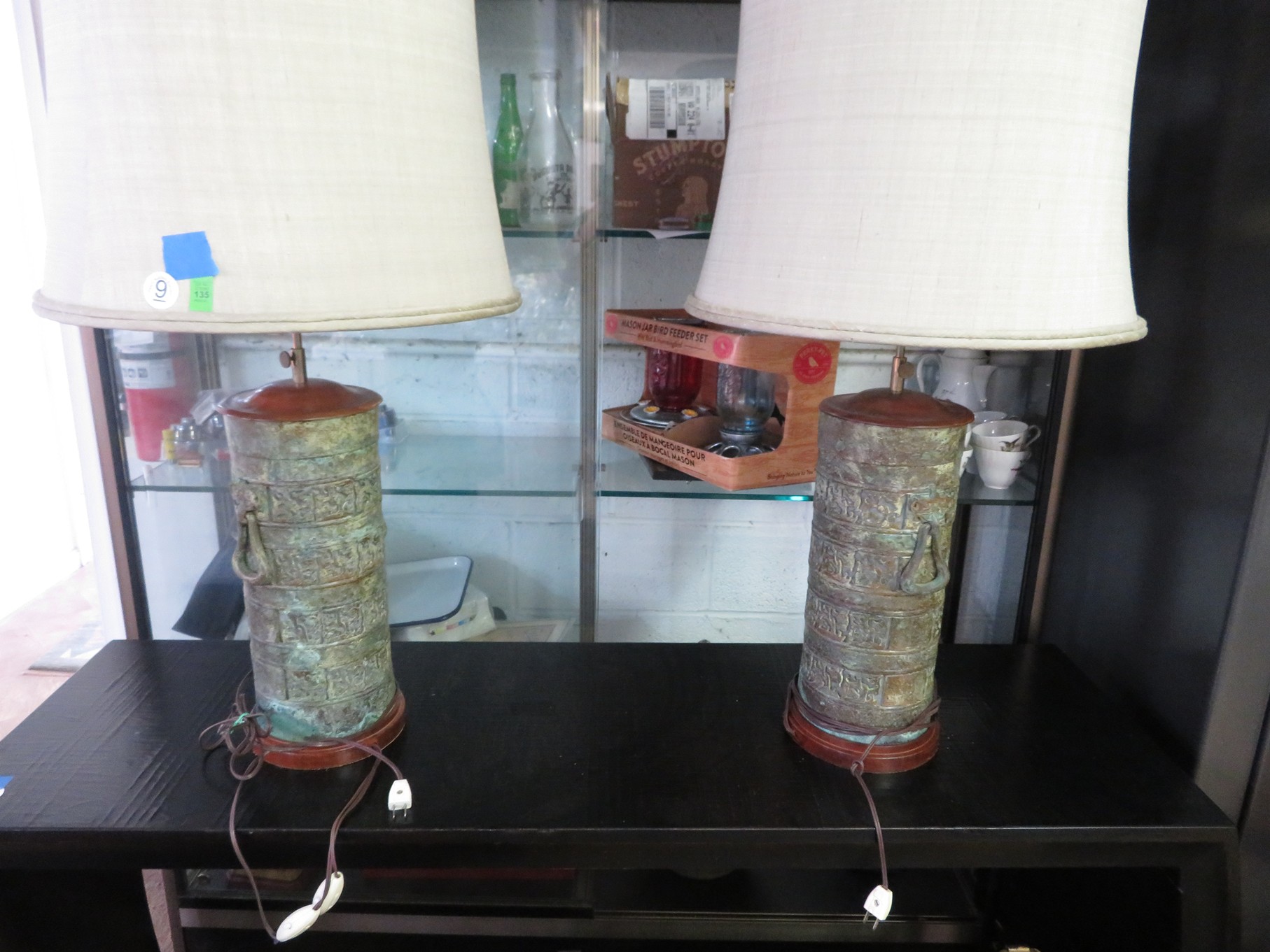 FURNITURE AND FURNISHINGS: MCM Furniture! Fine dining table with 4 chairs; Round tulip base table with 4 matching chairs; Fantastic buffet with display top; Lockable server with double flip out top leaves; Floor lamp; Eames style easy chair with shaped wooden arms & matching ottoman; Pair of white leather club chairs; Buffet with floating display top; Pair of chrome frame easy chairs; Chrome bar seats with red tops; Stressless style chairs & ottomans; Armchair; Footstools; End tables; Magnificent marble top mirrored dresser with candle stands and drop pulls; Hall pier mirror with drawer & marble shelf; Sugar chest; 4 section stacking bookcase with flip down secretary section; 5 section stacking bookcase; Pair of matching 3 cushion leather sofas; Leather love seat; Large corner cabinet with double 8 pane doors of double blind doors; Cabinet with old white paint; Nice jelly cupboard with carved wood pulls; Another nice 5 section & base stacking bookcase; Pedestal side table; Piano stool; Martha Washington sewing cabinet; Flat top trunk; Old wooden high chair; Lots of chairs; Bench with drawer; Umbrella holder; Floor vase; Pottery base oil lamp; Double glass door bookcase; 3 section stacking bookcase; Golden oak dresser with mirror; 6 drawer spool cabinet; Unusually shaped armoire with mirror; Double drawer side table with twist legs; Cedar blanket box; Marble top cabinet; Side tables; Marble insert top plant stand; Drop leaf side table; Large ottoman; 4 drawer spool cabinet; Rolling office chair; Stacking bookcase on legs; Awesome pair of blue fishbowl planters on bases; Reverse painted clock; Hanging cabinet; Brass candelabra; Furniture with Chinese medallion decoration! Blanket box; Chest of drawers, nightstand pair & matching dresser; Another Oriental motif dresser with matching nightstands; Wooden plant holder with galvanized insert; Chair with Chinese medallion upholstery; Desk and chair with medallions; Triple panel oriental scene screen; Large fishbowl planter on base; Leather sofa; Floor cradle; Tiffany style table lamps; Heavily carved wooden table lamps; Pair of white with yellow flowers table lamps; Mantel clock; Mesh office chair; Curved seat bench; Fern stand; Painted cabinet; Wooden box; Room screens; Pair of interesting metal cylinder with handles table lamps; Striped children’s toy chest; Matching striped painted wall mirror; Bar seat trio; Pair of armchairs; Teak outdoor table and chairs; Teak bench and side table; 4 wrought iron chairs; Pair of rattan look lounge chairs with cushions; Patio table with 4 chairs; Huge planters; Marble table and 4 seats; Glass top outdoor tables and much more!