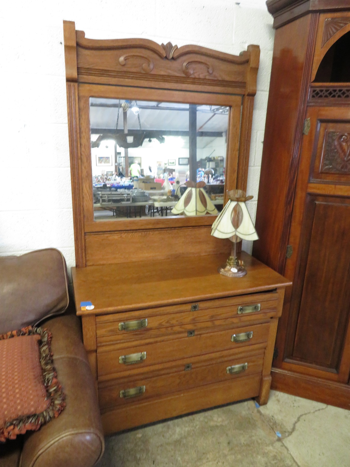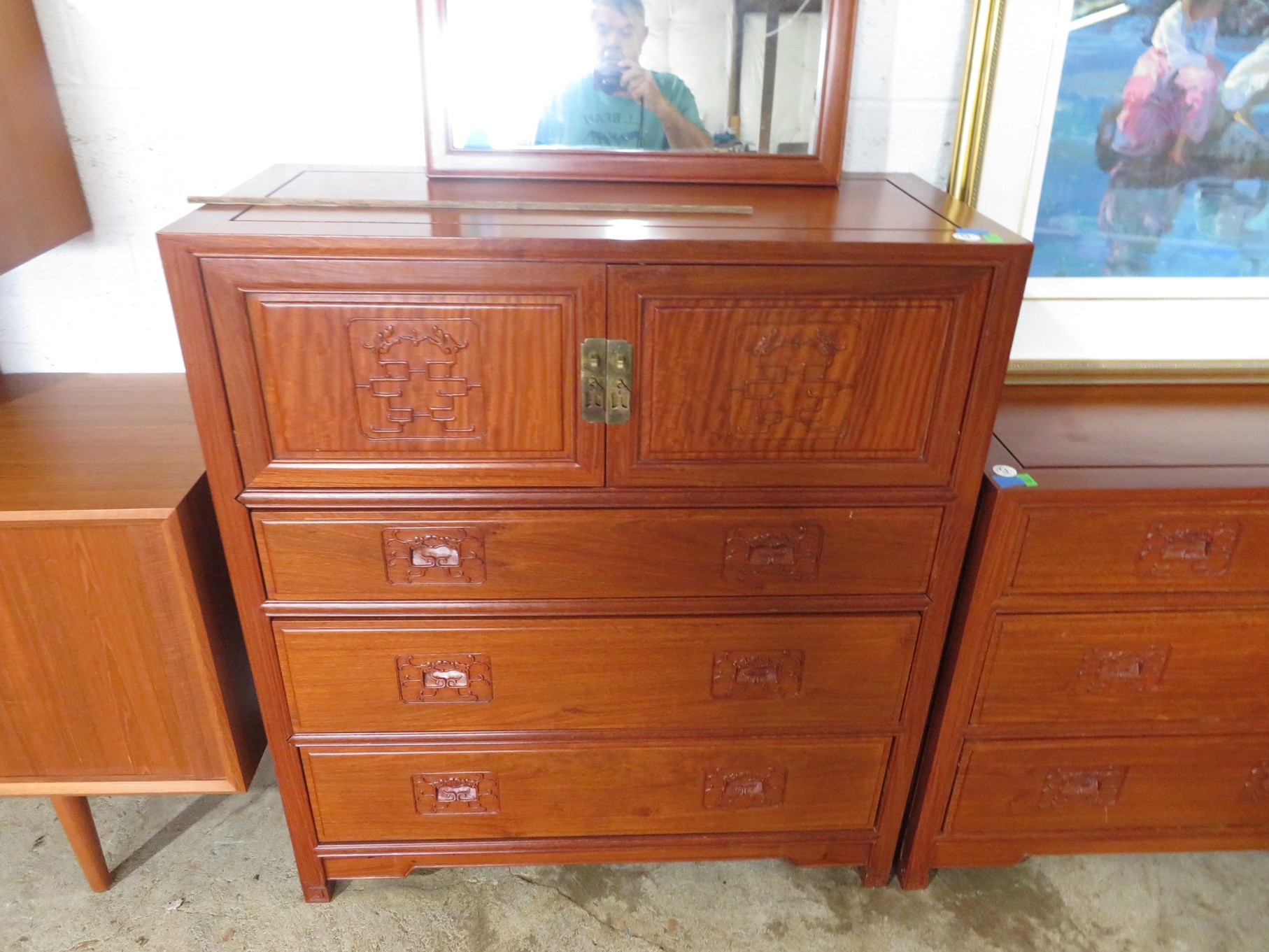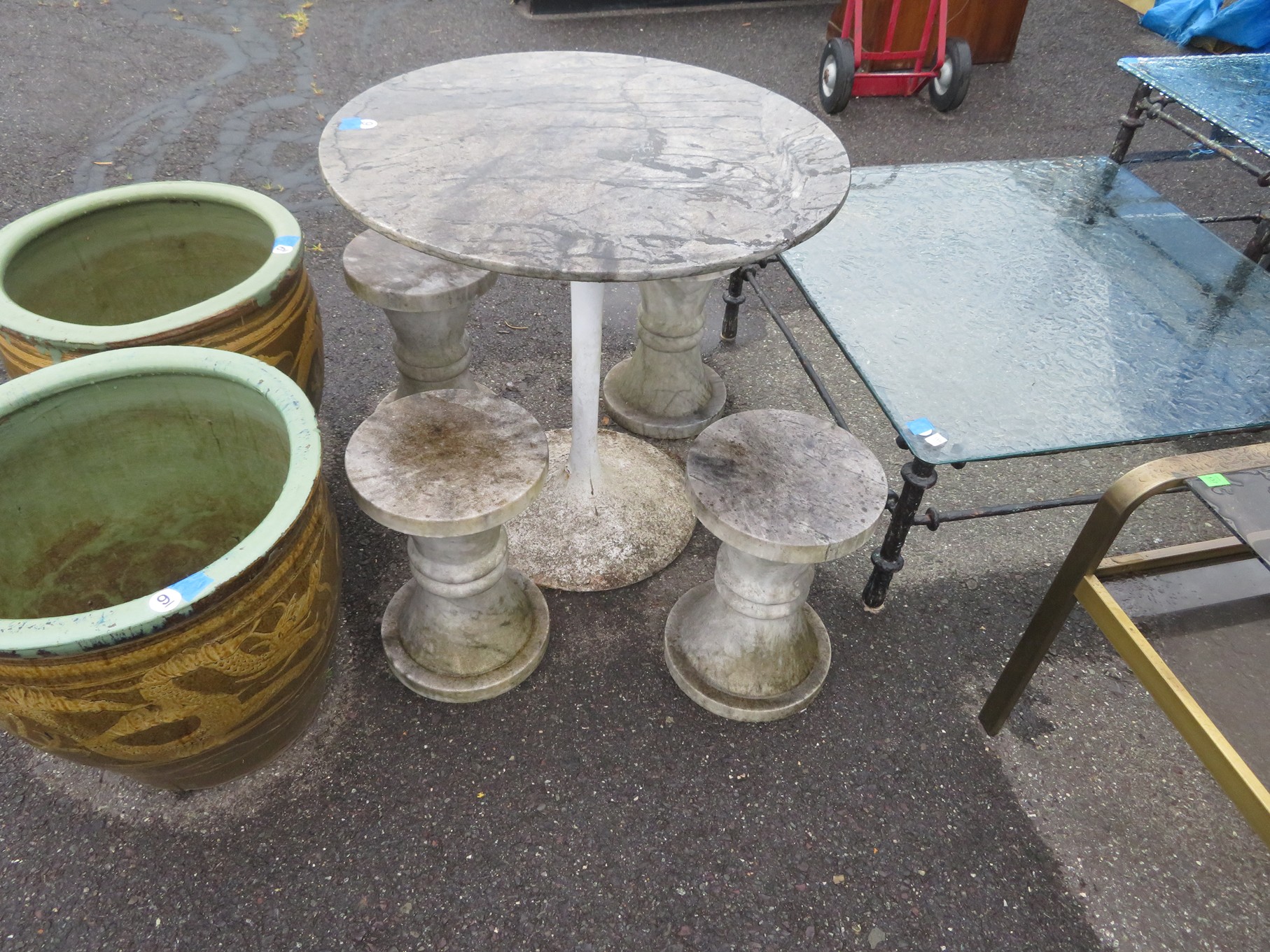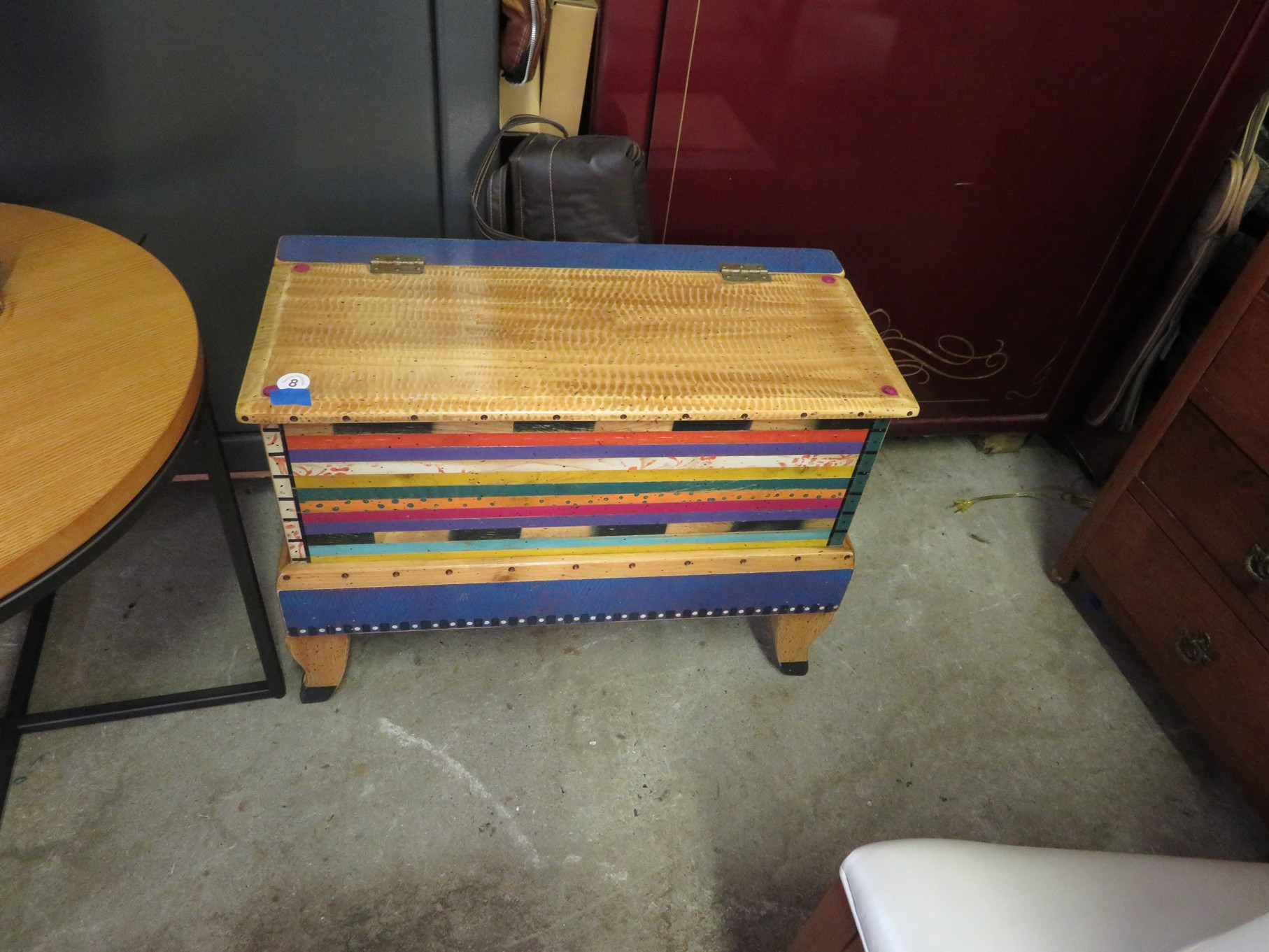 FURNITURE AND FURNISHINGS: MCM Furniture! Fine dining table with 4 chairs; Round tulip base table with 4 matching chairs; Fantastic buffet with display top; Lockable server with double flip out top leaves; Floor lamp; Eames style easy chair with shaped wooden arms & matching ottoman; Pair of white leather club chairs; Buffet with floating display top; Pair of chrome frame easy chairs; Chrome bar seats with red tops; Stressless style chairs & ottomans; Armchair; Footstools; End tables; Magnificent marble top mirrored dresser with candle stands and drop pulls; Hall pier mirror with drawer & marble shelf; Sugar chest; 4 section stacking bookcase with flip down secretary section; 5 section stacking bookcase; Pair of matching 3 cushion leather sofas; Leather love seat; Large corner cabinet with double 8 pane doors of double blind doors; Cabinet with old white paint; Nice jelly cupboard with carved wood pulls; Another nice 5 section & base stacking bookcase; Pedestal side table; Piano stool; Martha Washington sewing cabinet; Flat top trunk; Old wooden high chair; Lots of chairs; Bench with drawer; Umbrella holder; Floor vase; Pottery base oil lamp; Double glass door bookcase; 3 section stacking bookcase; Golden oak dresser with mirror; 6 drawer spool cabinet; Unusually shaped armoire with mirror; Double drawer side table with twist legs; Cedar blanket box; Marble top cabinet; Side tables; Marble insert top plant stand; Drop leaf side table; Large ottoman; 4 drawer spool cabinet; Rolling office chair; Stacking bookcase on legs; Awesome pair of blue fishbowl planters on bases; Reverse painted clock; Hanging cabinet; Brass candelabra; Furniture with Chinese medallion decoration! Blanket box; Chest of drawers, nightstand pair & matching dresser; Another Oriental motif dresser with matching nightstands; Wooden plant holder with galvanized insert; Chair with Chinese medallion upholstery; Desk and chair with medallions; Triple panel oriental scene screen; Large fishbowl planter on base; Leather sofa; Floor cradle; Tiffany style table lamps; Heavily carved wooden table lamps; Pair of white with yellow flowers table lamps; Mantel clock; Mesh office chair; Curved seat bench; Fern stand; Painted cabinet; Wooden box; Room screens; Pair of interesting metal cylinder with handles table lamps; Striped children’s toy chest; Matching striped painted wall mirror; Bar seat trio; Pair of armchairs; Teak outdoor table and chairs; Teak bench and side table; 4 wrought iron chairs; Pair of rattan look lounge chairs with cushions; Patio table with 4 chairs; Huge planters; Marble table and 4 seats; Glass top outdoor tables and much more!