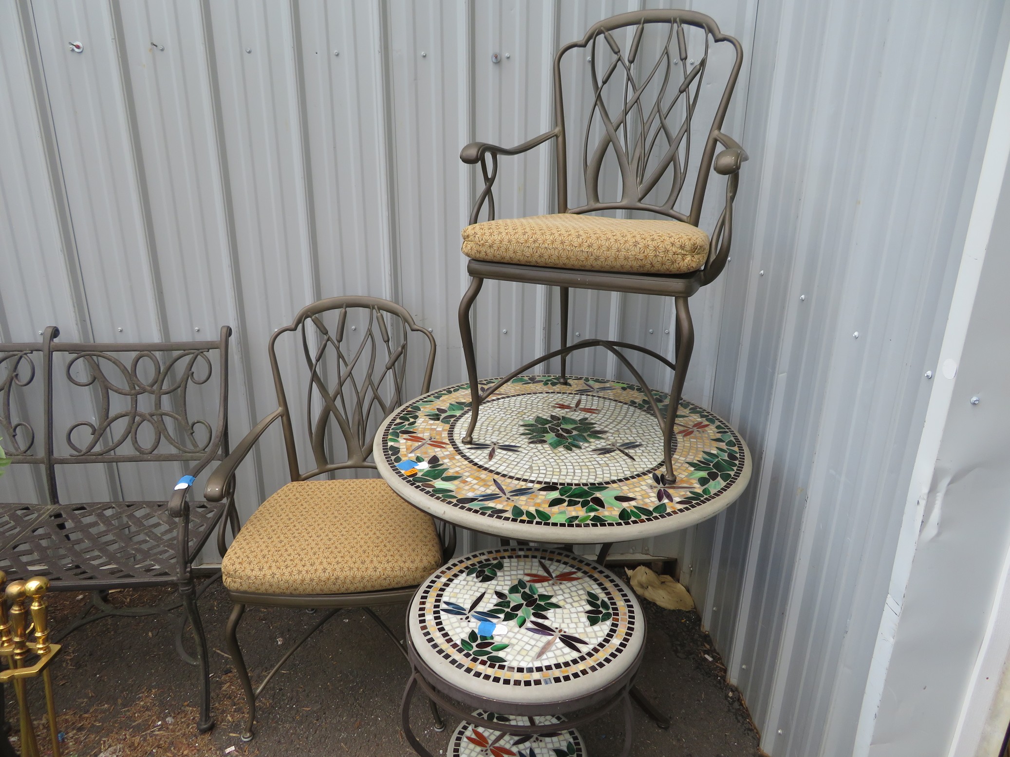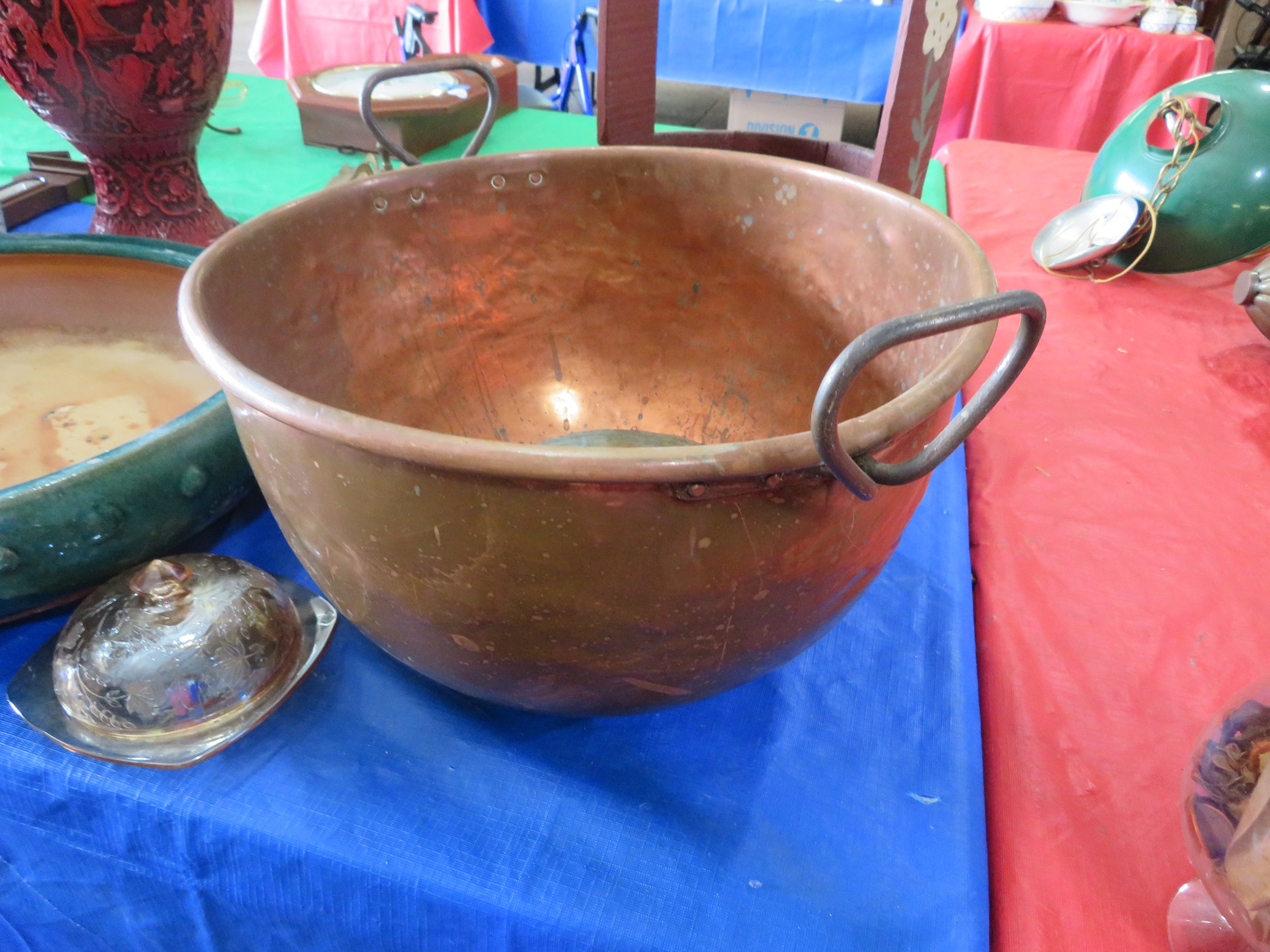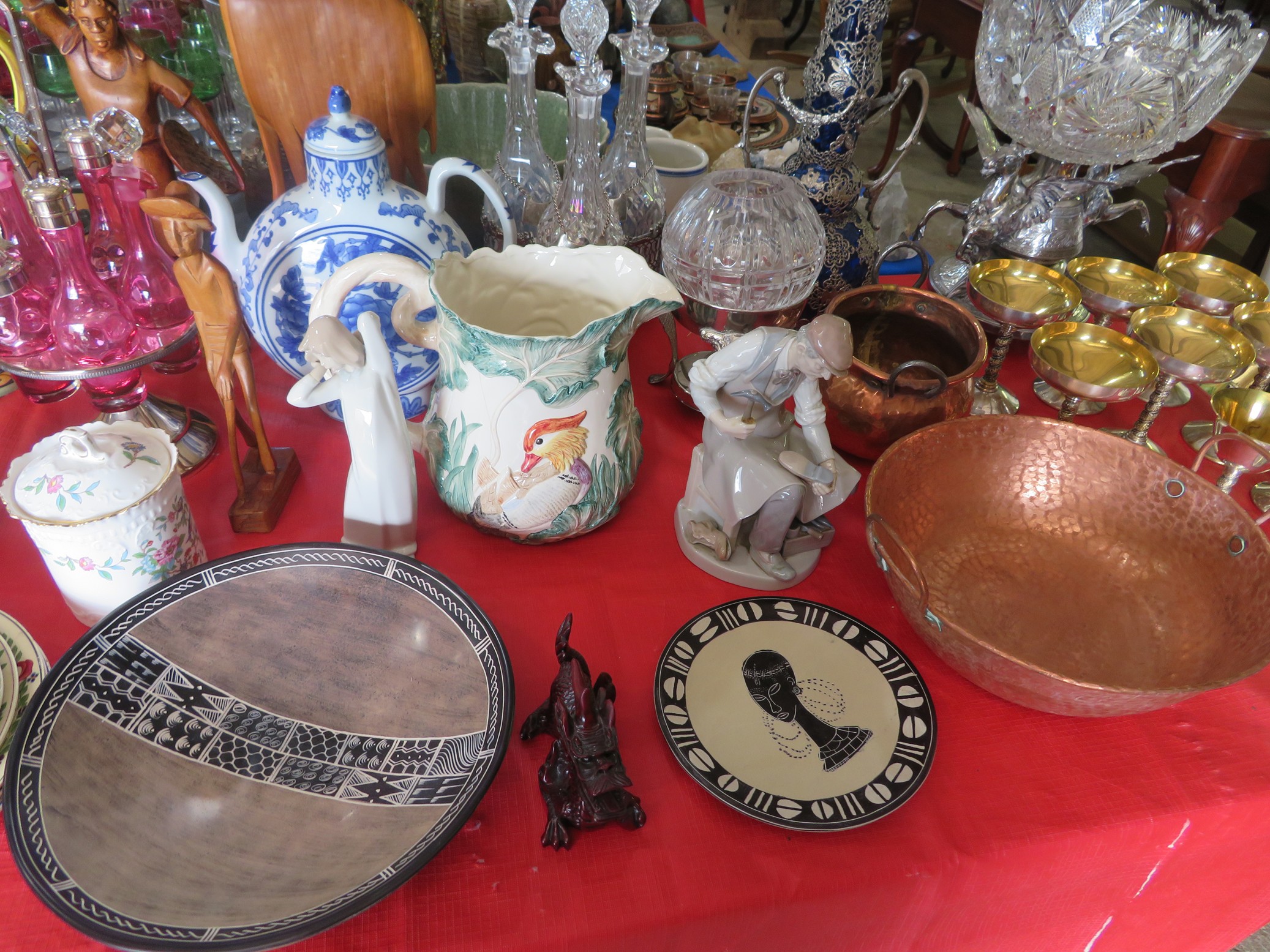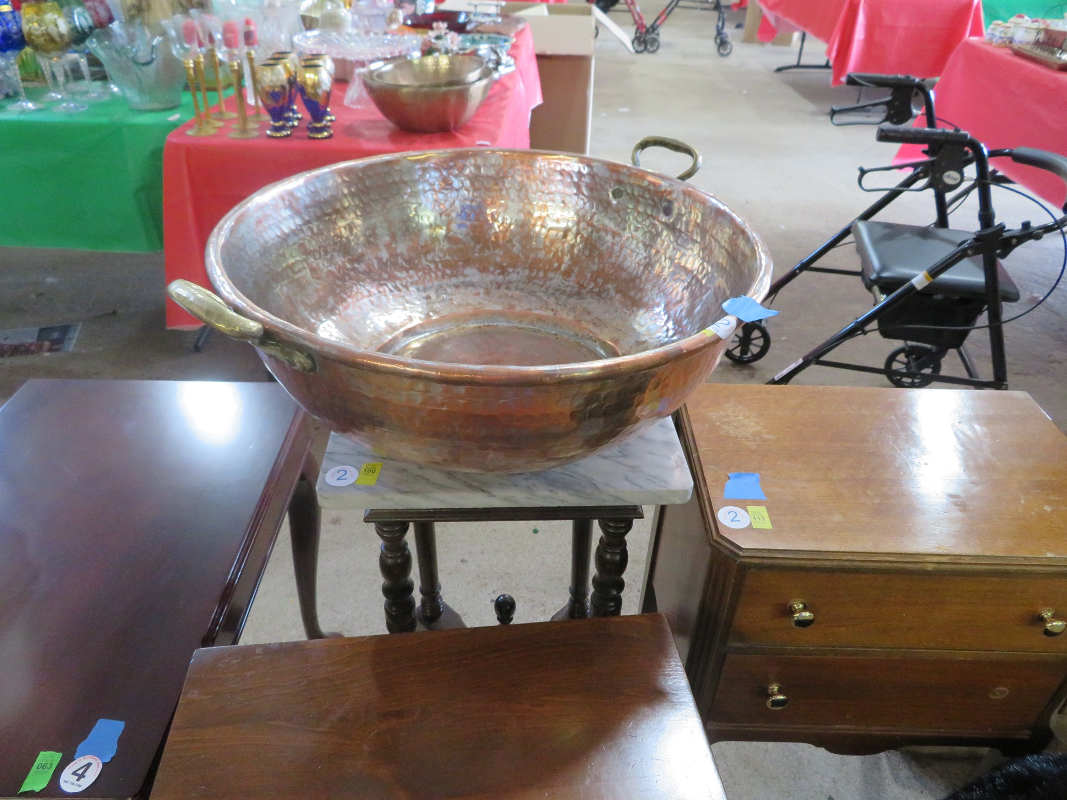 MORE: Set of mounted longhorns; Globe; Huge hammered copper bowl with brass handles; Huge hammered copper floor urn on base; Metal compartmentalized flower seller’s bucket; Brass floor candlestands; Large copper bowl with handles; Large cinnabar vase; Barometer; More copper bowls; Basket of fairy figures; Decorative boxes; Cheese tins; Stone vases; Decorated gourd; Crystal specimens; Bose radio; Coffee set on tray; Bookends; Binoculars; Insulator lamp; Smoking pipe; Cameras lenses & filters; Stein; Stone cherry tree; Wrought iron outdoor furniture; Tile top tables; Garden bench; Patio sets; Metal outdoor tables; Cast iron garden seats, tables & planters; Concrete planter; Bell with cradle; Garden art; more to come!
