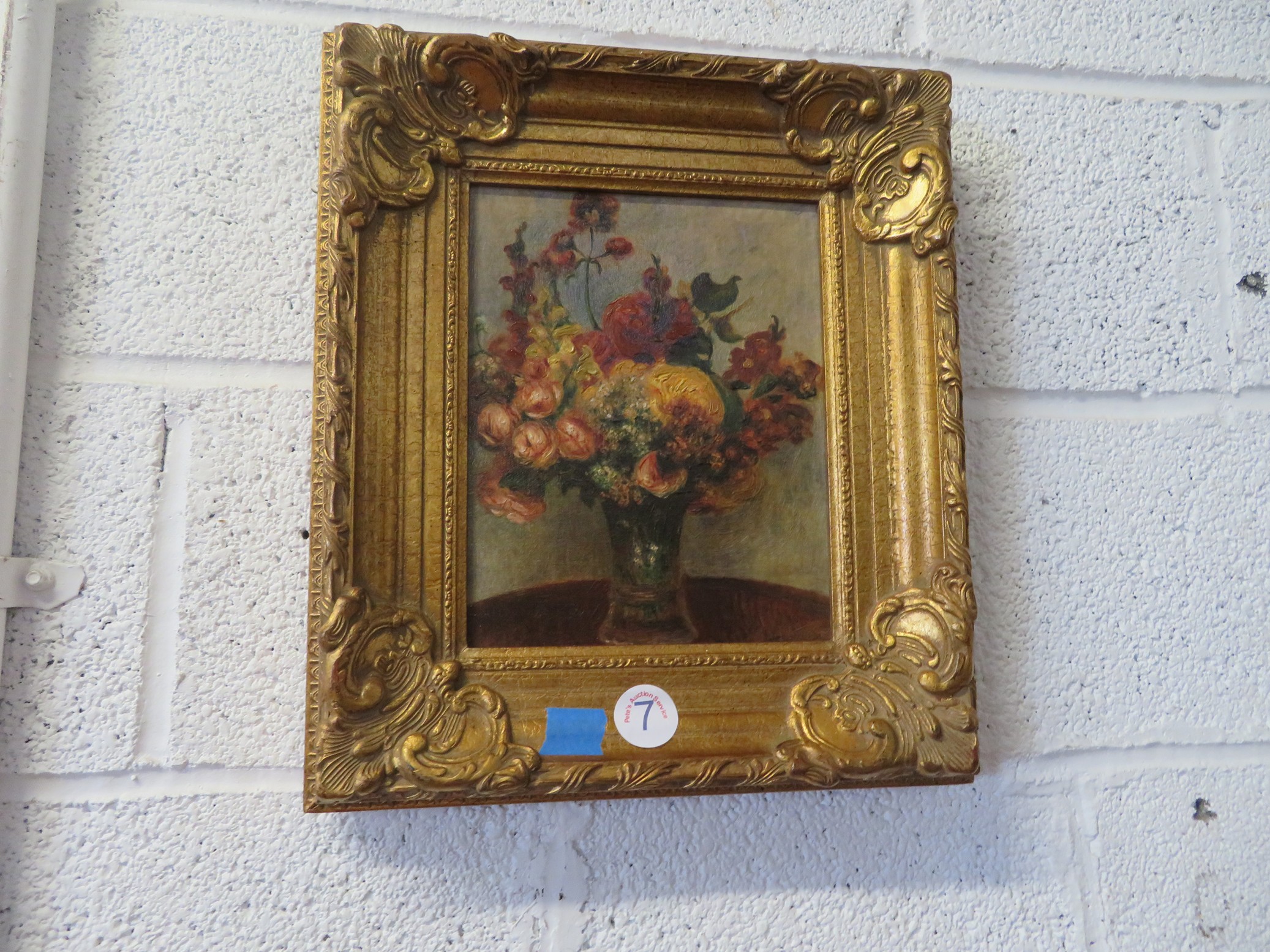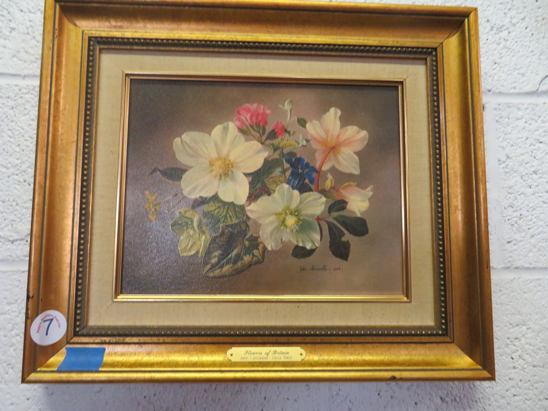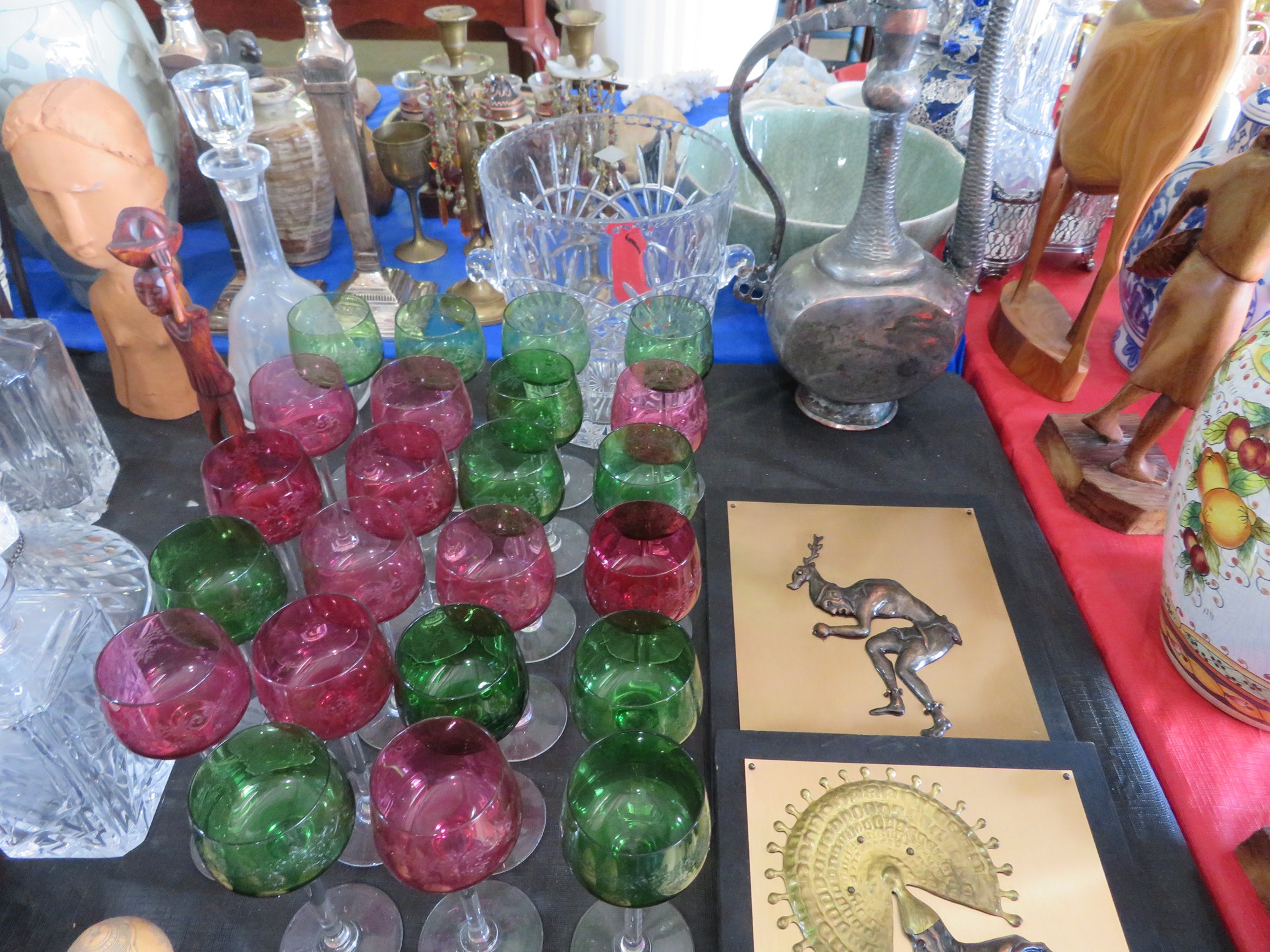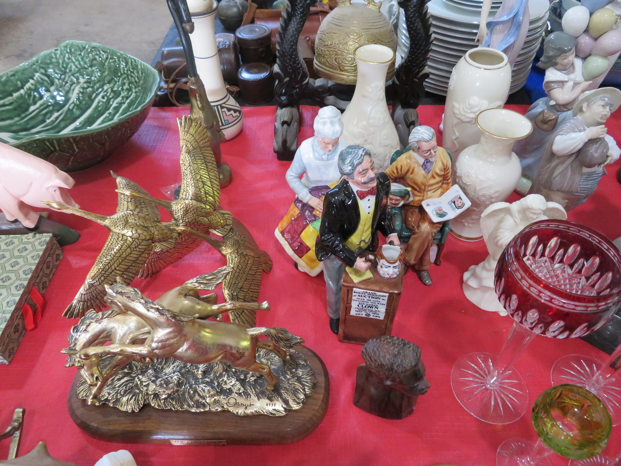 ART & METALS: Impressionist sailboats & houses signed painting; Flowers of Britain by John Lancaster, ca. 1960; Colorful painting of wall; Steamships in port artwork; Abstract; Mediterranean seaside; Floral art; Lake edge artwork; Vase of roses still life; Dog portraits; Stained glass panel; More signed artworks; Prints; More ship artworks; Painting of peonies; Sheep in pasture; Large abstract; Small bust; Figurines; Carved wooden figures; Buddha; Elephant carving & statue collection; Face plaques; Flatware in case; Metal foo dog pair; Brass rocking horse candlestick; Pig; Metal flying geese statue; Running horses statue; Pair of 4 arm candelabras; Butter dome; Silver rim coaster; Silver goblet set; Silver champagne cups; Cobalt bulbous vase with silver overlay; Crystal centerpiece bowl on silver rearing horse base; Metal vases; Brass candlesticks; Silver trays; Compote; Rabbit triple condiment holder; Rabbit bowl server & more!