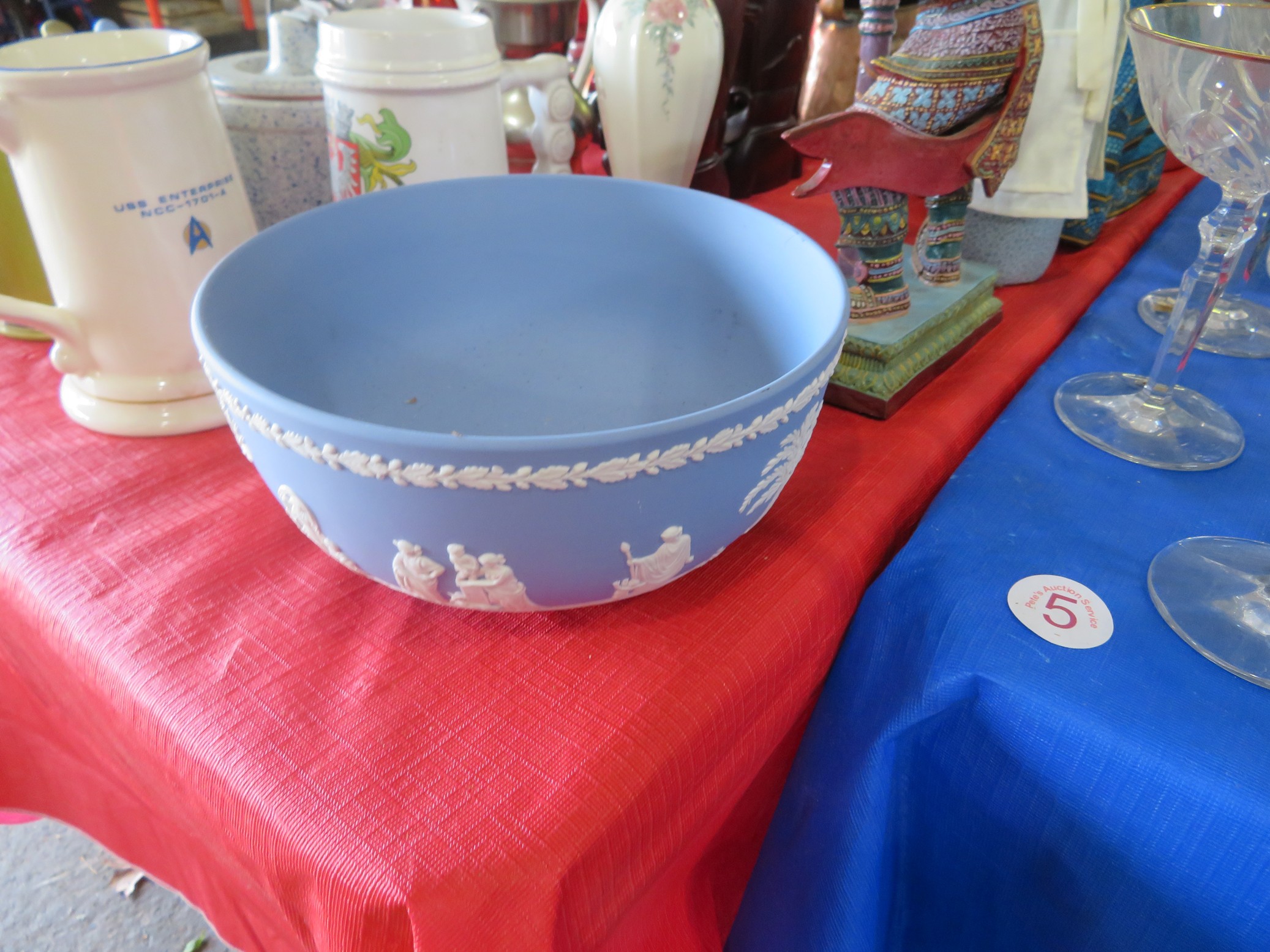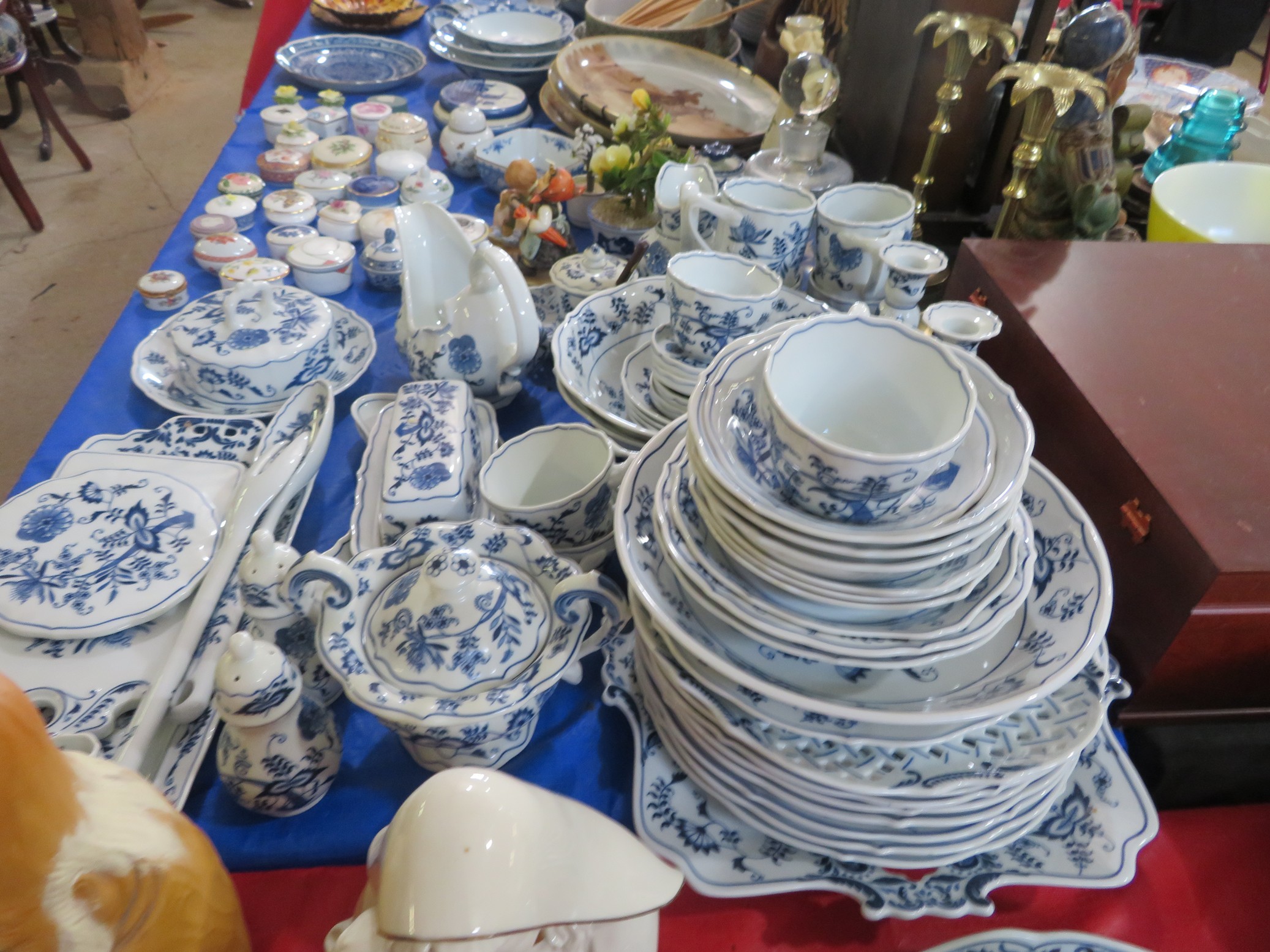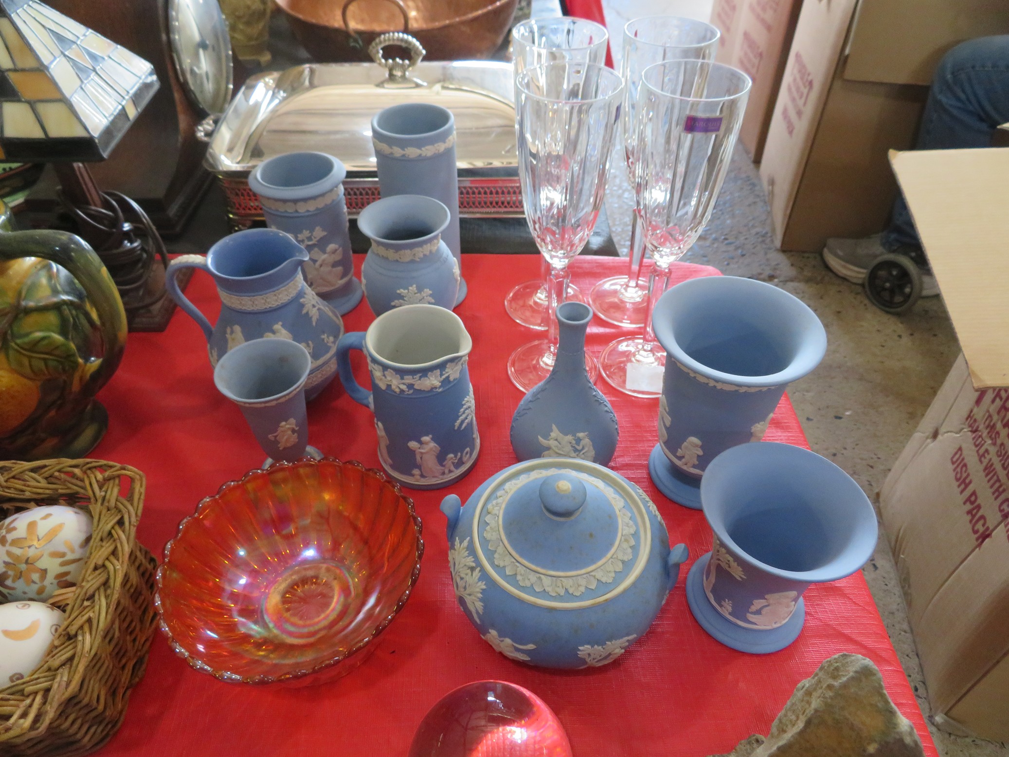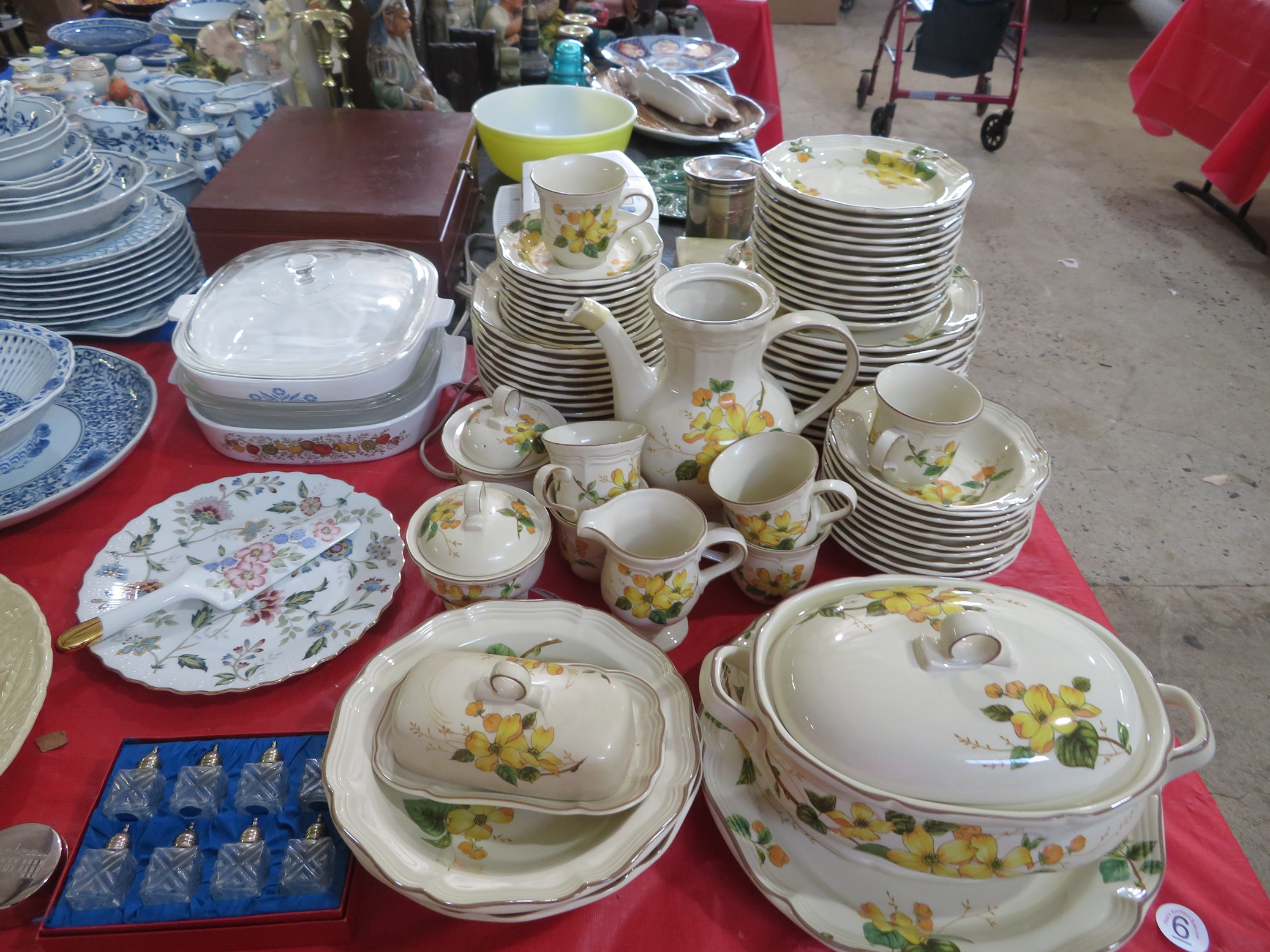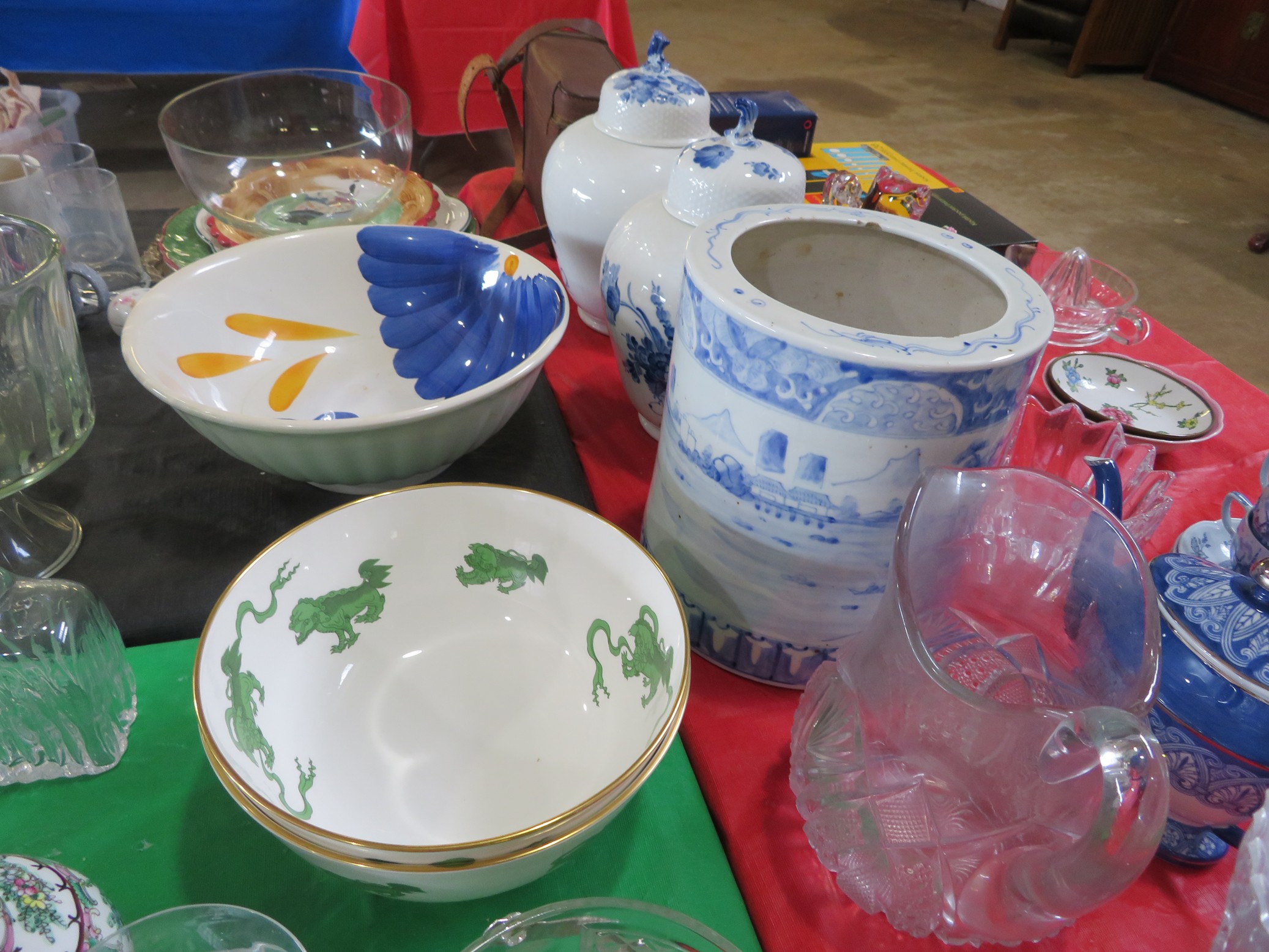 CHINA & GLASS: Wedgwood Jasperware in light & dark blue, green & rose; Large set of Blue Onion with unusual pieces; Lladro statues; Lenox; Royal Doulton; Cabbage leaf bowl; Oriental mud man; Basket of flowers; Ceramic candlesticks; Bird figures; Gold rim tray; Blue & white teapot; Large lidded urn; Decorated ovoid shape on base; Small blue & white vase; Decorative plates; Delft; Hummels; Teapots; Studio pottery; Lots of trinket boxes; Pfaltzgraff dinnerware set with yellow flowers; Oriental plates, vases & bowls; Gold rim bowls decorated with green foo dogs; Ginger jars; Capodimonte flowers; Holly tidbit server; Steins; Colored cut to clear goblets in multiple sizes; Beautiful cobalt bulbous vase with silver overlay; Triple decanters in holder; Crystal bowl over silver warmer; Waterford; Ruby & crystal condiment set in holder; Lots of crystal decanters; Red & green goblets set; Candlesticks; Carnival glass bowl; Champagne flutes; Individual salts in box; Corning ware casseroles; Yellow Pyrex bowl; Crystal pitcher; Swan; Art glass; Cruets; Cake plate; Stein; Ice bucket; Enameled glass vases; Perfume; Knife rest; Crystal bowls; Bell; Biscuit jar; Baskets; Butter dish and more!