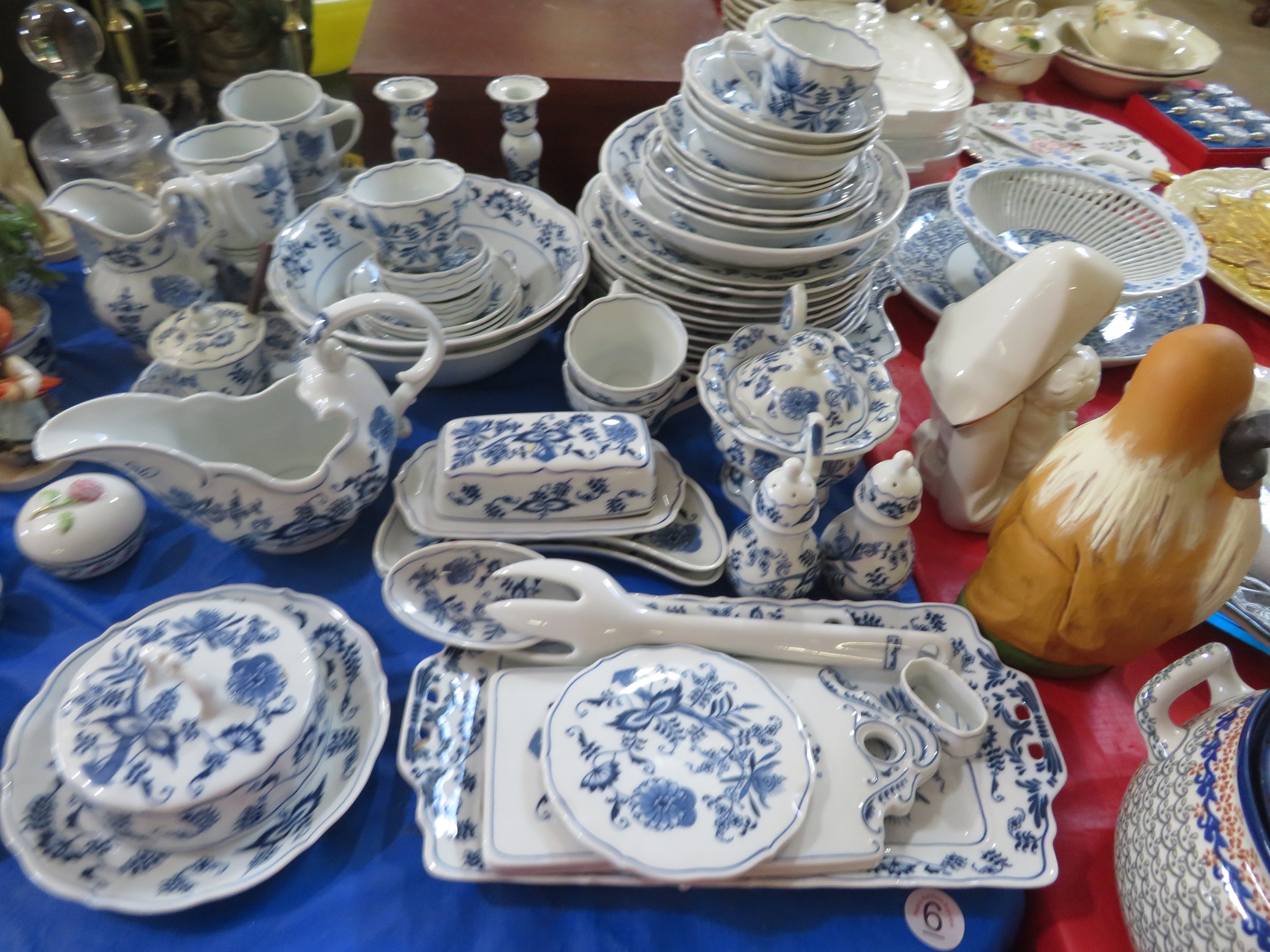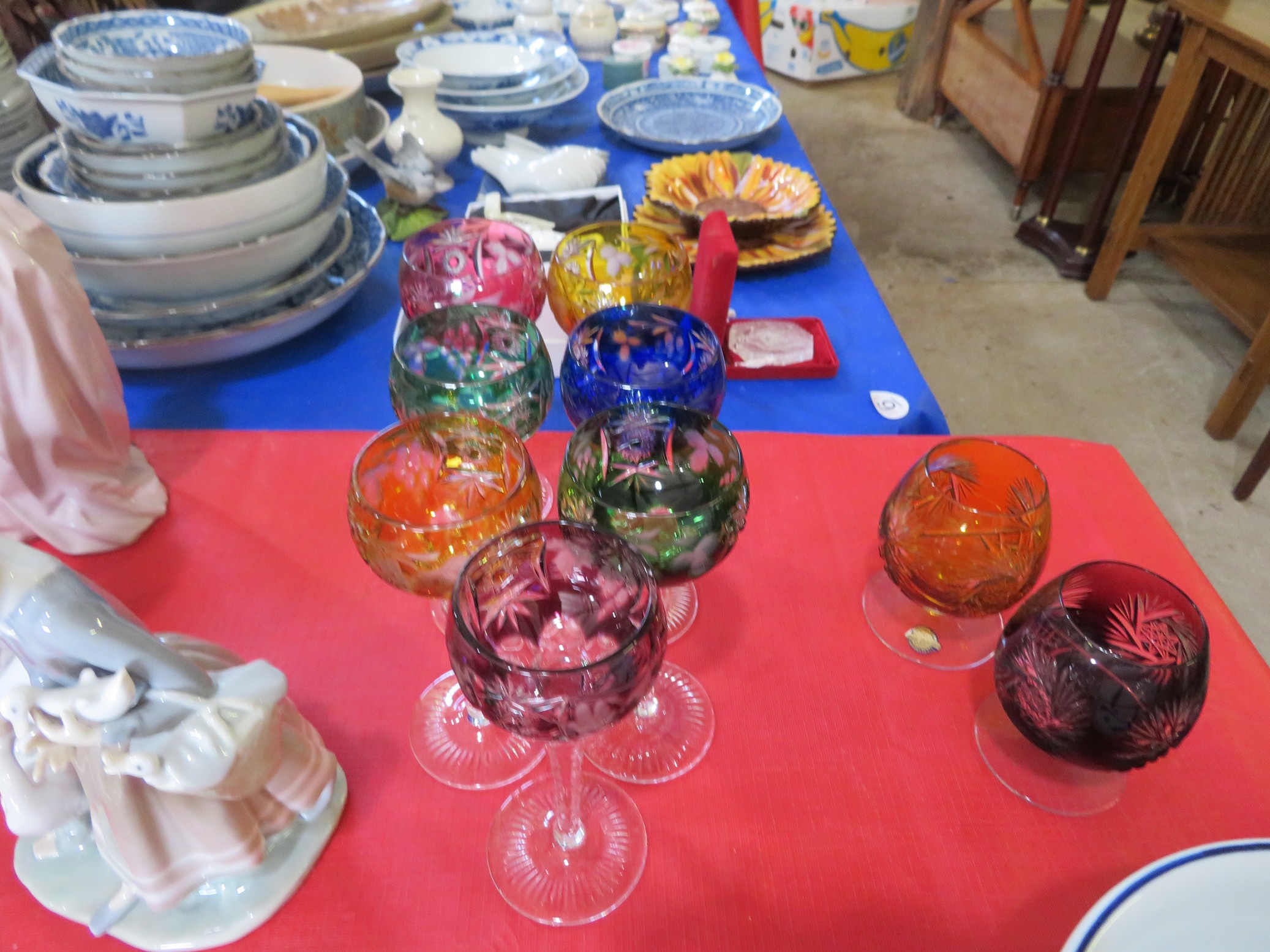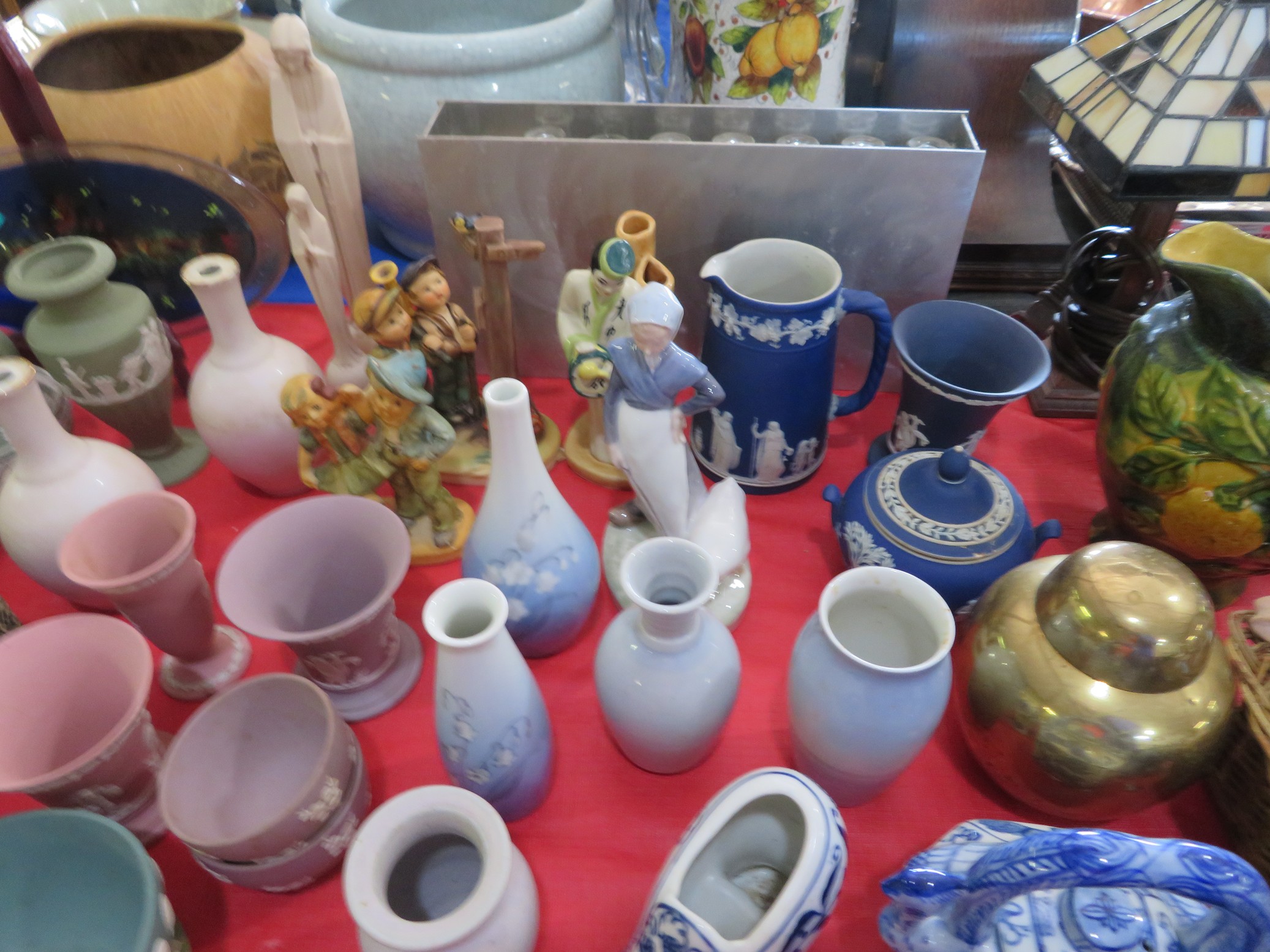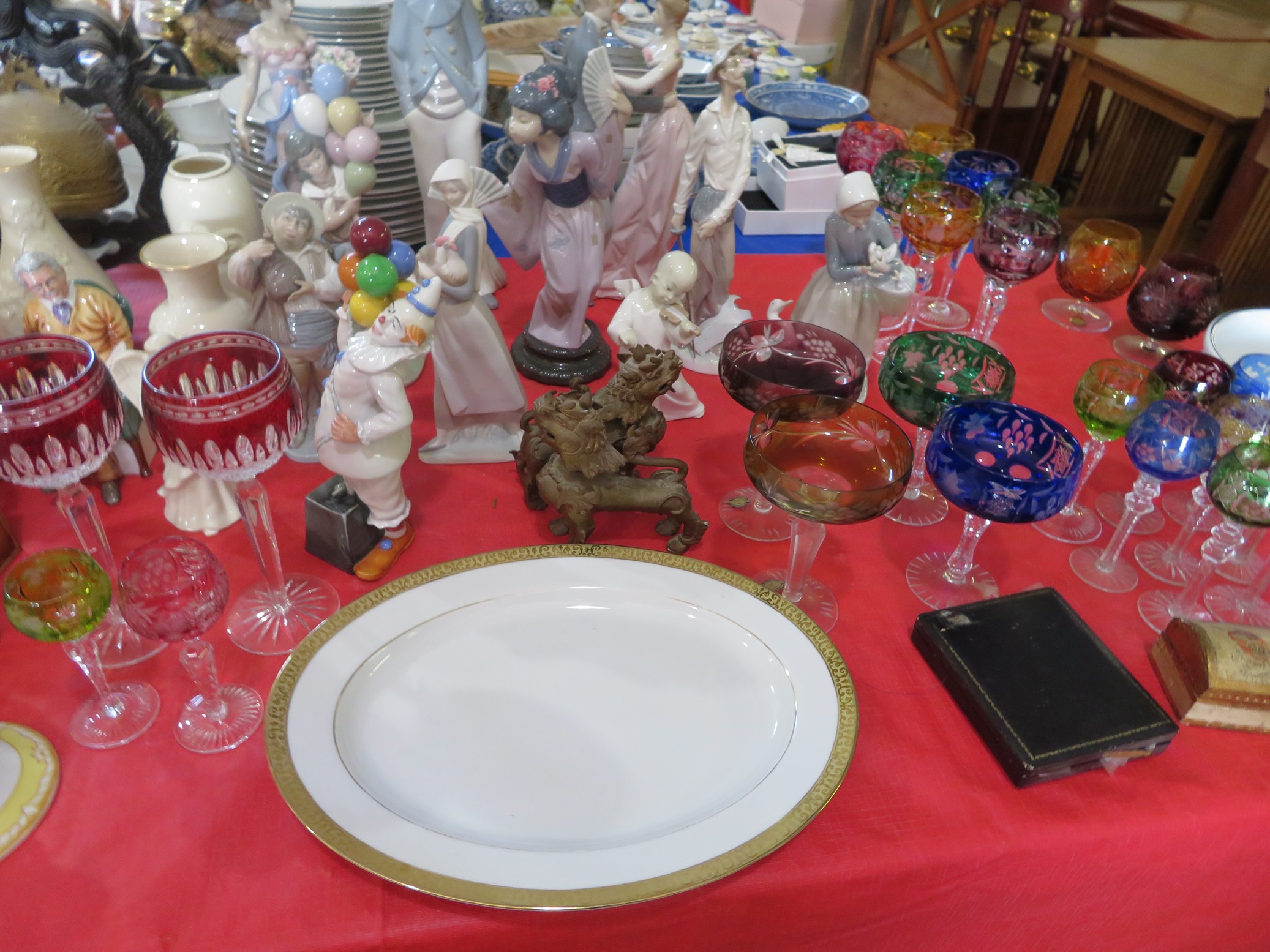 CHINA & GLASS: Wedgwood Jasperware in light & dark blue, green & rose; Large set of Blue Onion with unusual pieces; Lladro statues; Lenox; Royal Doulton; Cabbage leaf bowl; Oriental mud man; Basket of flowers; Ceramic candlesticks; Bird figures; Gold rim tray; Blue & white teapot; Large lidded urn; Decorated ovoid shape on base; Small blue & white vase; Decorative plates; Delft; Hummels; Teapots; Studio pottery; Lots of trinket boxes; Pfaltzgraff dinnerware set with yellow flowers; Oriental plates, vases & bowls; Gold rim bowls decorated with green foo dogs; Ginger jars; Capodimonte flowers; Holly tidbit server; Steins; Colored cut to clear goblets in multiple sizes; Beautiful cobalt bulbous vase with silver overlay; Triple decanters in holder; Crystal bowl over silver warmer; Waterford; Ruby & crystal condiment set in holder; Lots of crystal decanters; Red & green goblets set; Candlesticks; Carnival glass bowl; Champagne flutes; Individual salts in box; Corning ware casseroles; Yellow Pyrex bowl; Crystal pitcher; Swan; Art glass; Cruets; Cake plate; Stein; Ice bucket; Enameled glass vases; Perfume; Knife rest; Crystal bowls; Bell; Biscuit jar; Baskets; Butter dish and more!