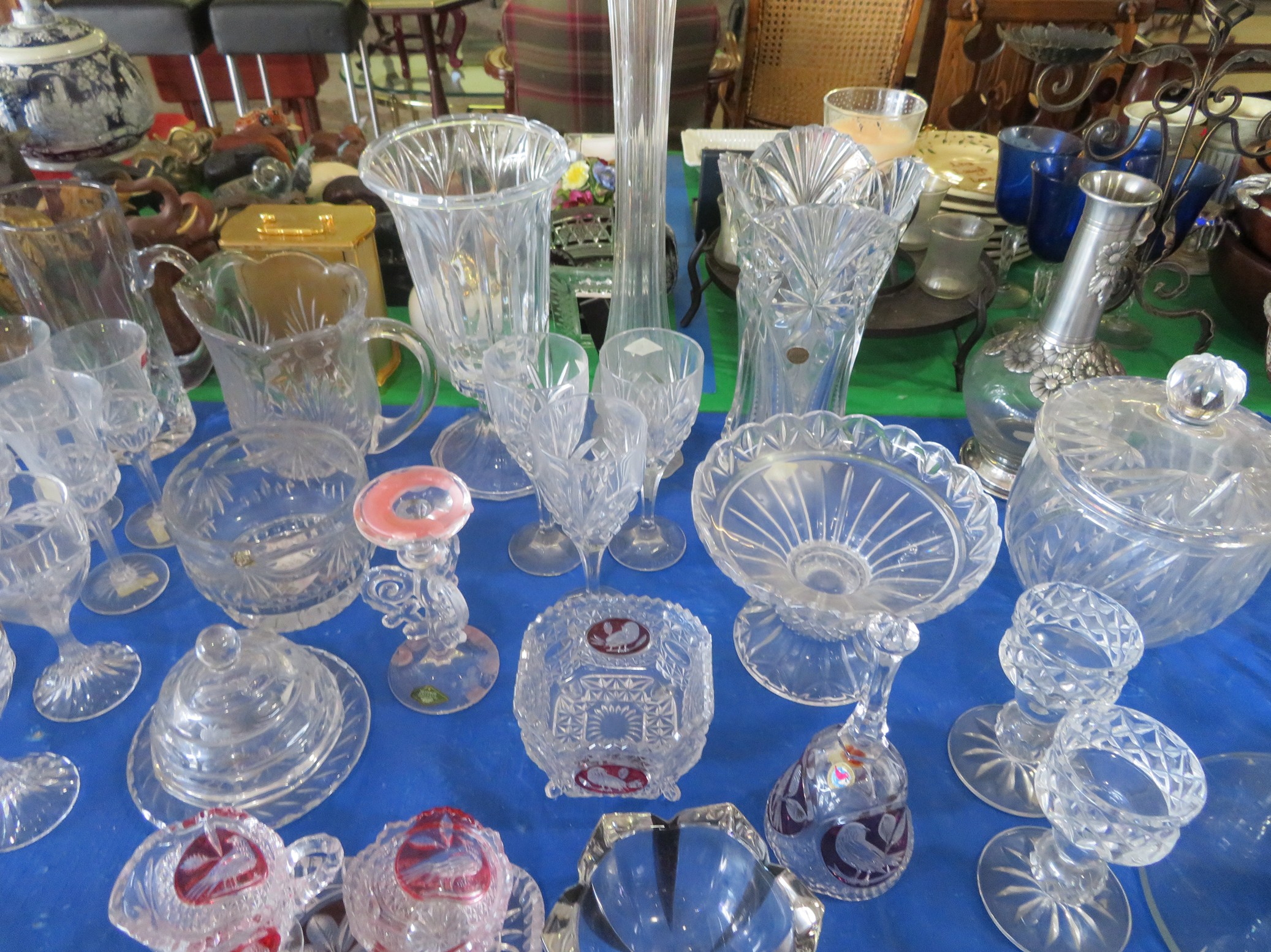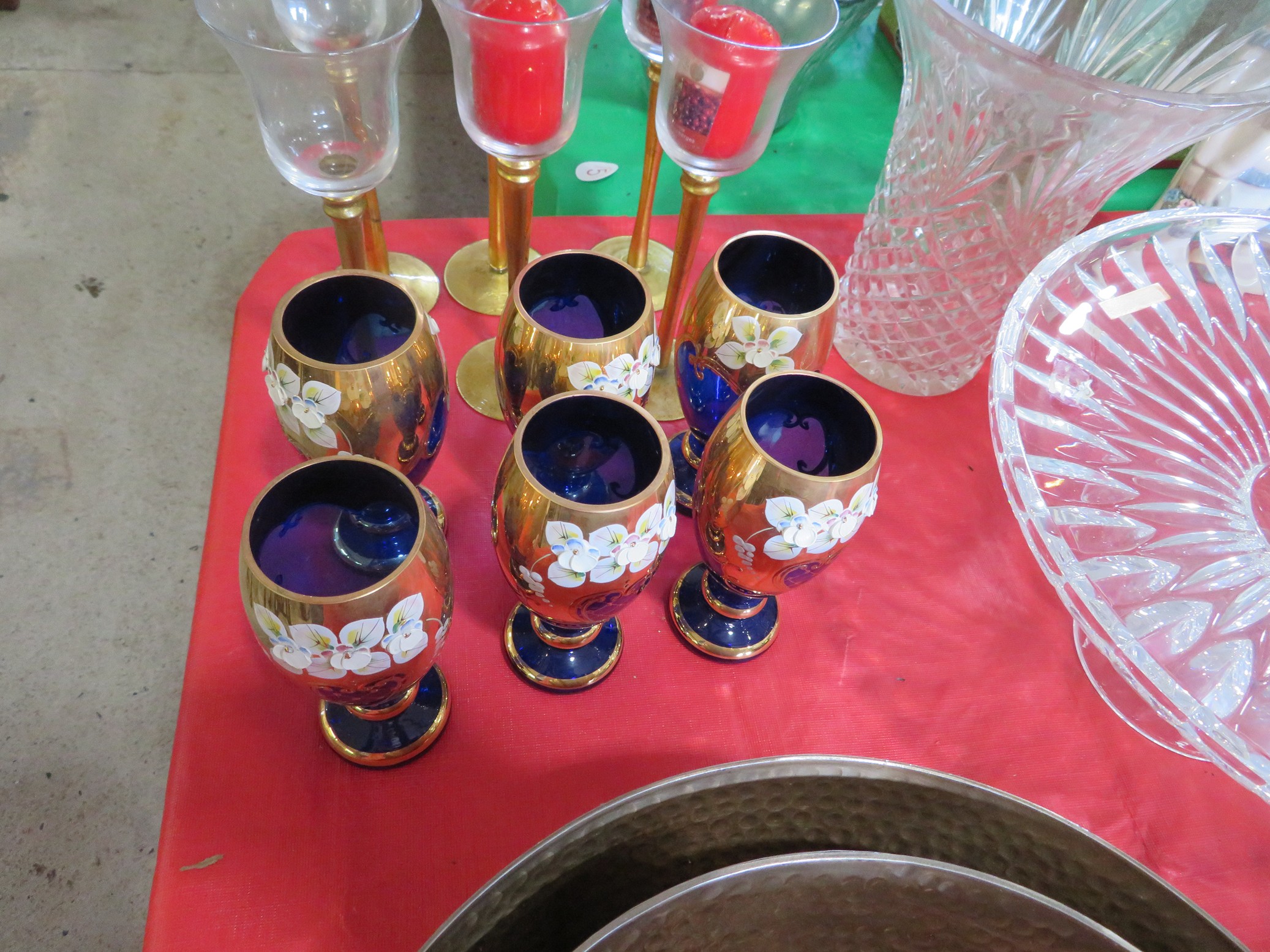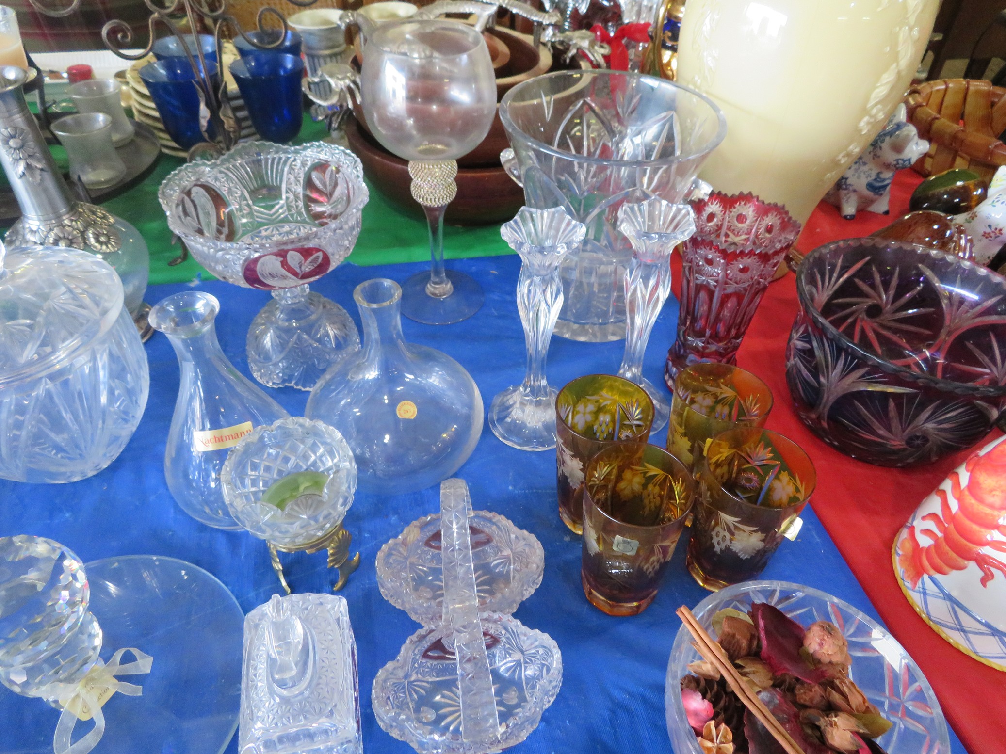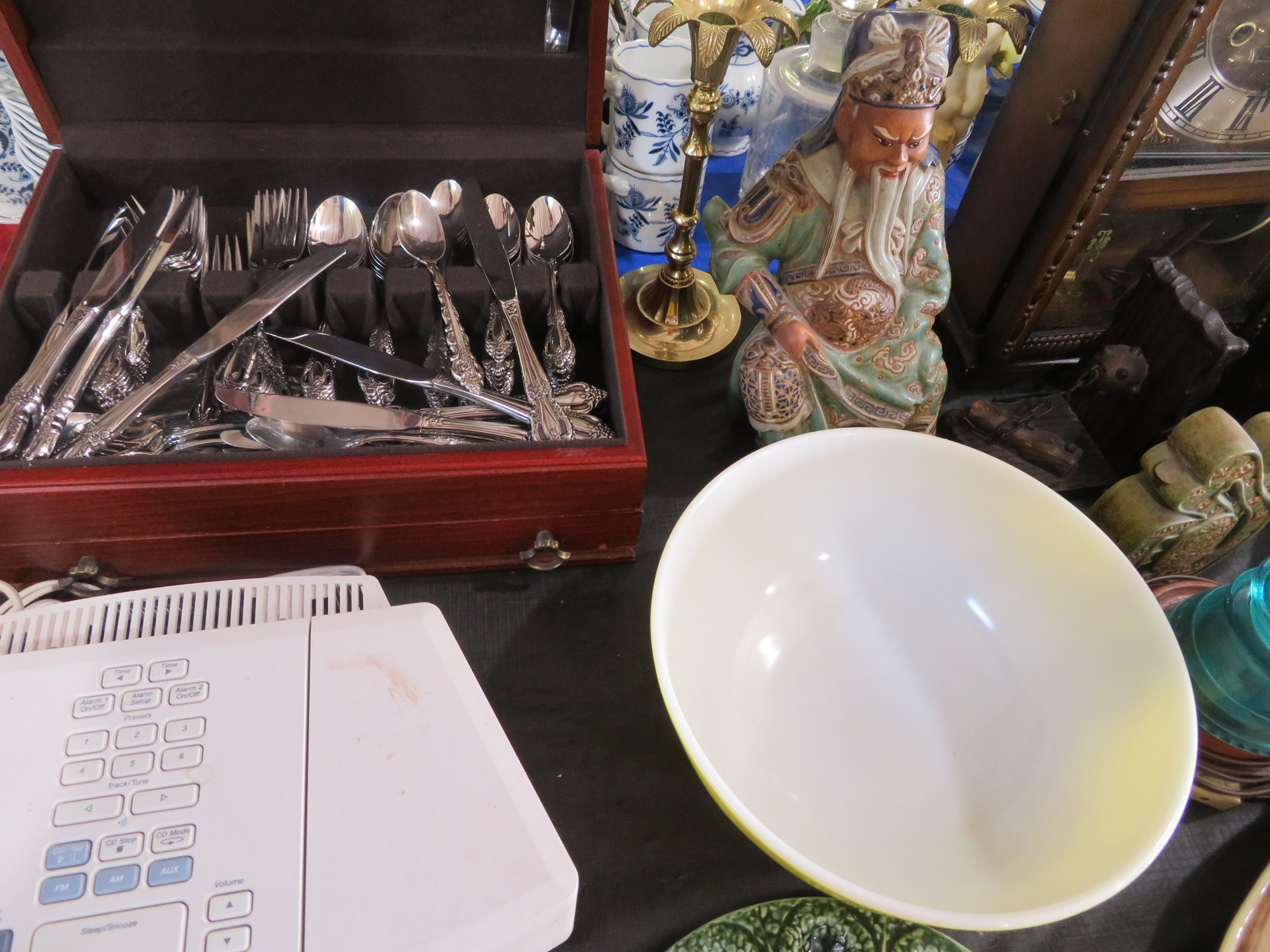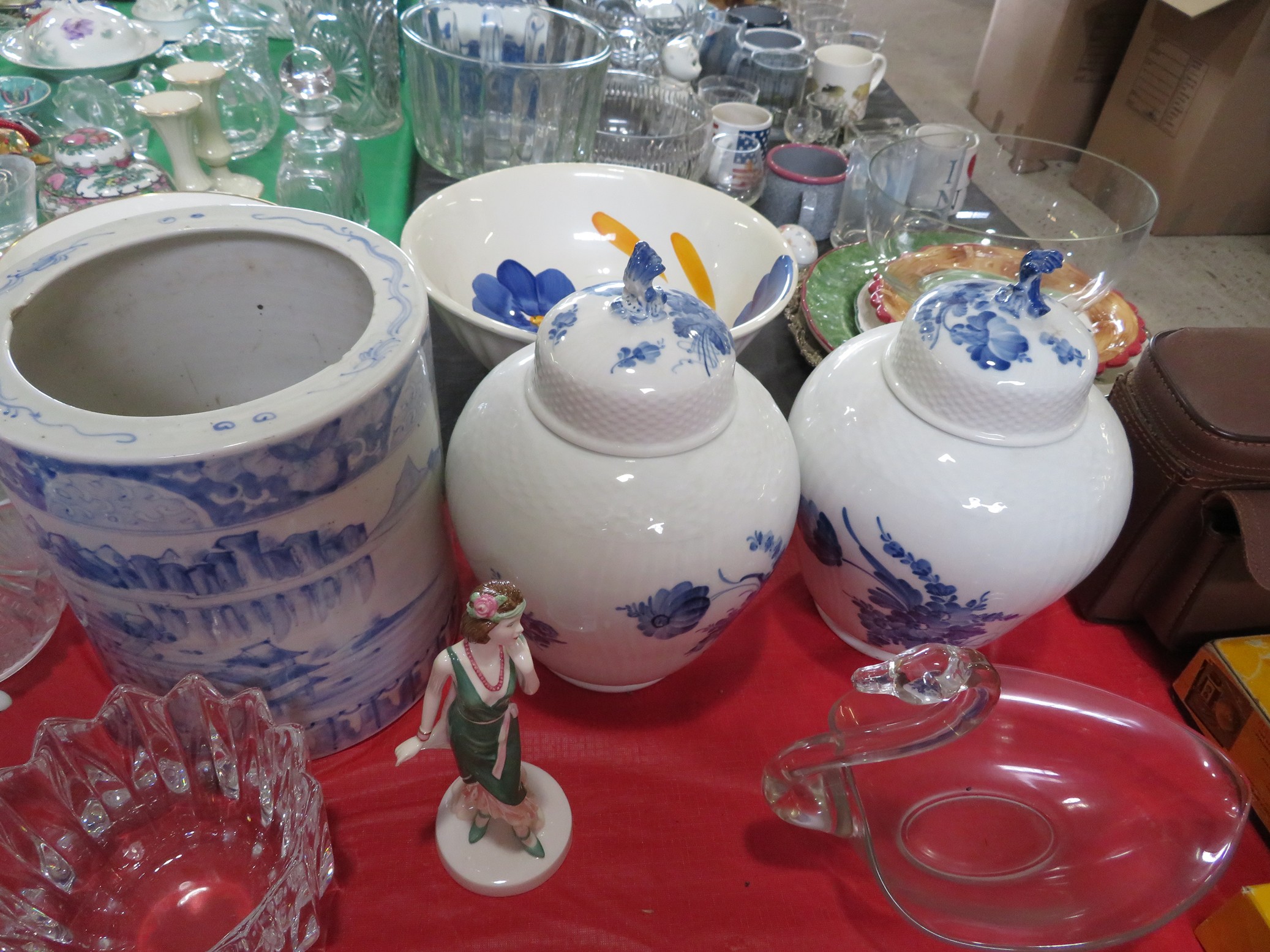 CHINA & GLASS: Wedgwood Jasperware in light & dark blue, green & rose; Large set of Blue Onion with unusual pieces; Lladro statues; Lenox; Royal Doulton; Cabbage leaf bowl; Oriental mud man; Basket of flowers; Ceramic candlesticks; Bird figures; Gold rim tray; Blue & white teapot; Large lidded urn; Decorated ovoid shape on base; Small blue & white vase; Decorative plates; Delft; Hummels; Teapots; Studio pottery; Lots of trinket boxes; Pfaltzgraff dinnerware set with yellow flowers; Oriental plates, vases & bowls; Gold rim bowls decorated with green foo dogs; Ginger jars; Capodimonte flowers; Holly tidbit server; Steins; Colored cut to clear goblets in multiple sizes; Beautiful cobalt bulbous vase with silver overlay; Triple decanters in holder; Crystal bowl over silver warmer; Waterford; Ruby & crystal condiment set in holder; Lots of crystal decanters; Red & green goblets set; Candlesticks; Carnival glass bowl; Champagne flutes; Individual salts in box; Corning ware casseroles; Yellow Pyrex bowl; Crystal pitcher; Swan; Art glass; Cruets; Cake plate; Stein; Ice bucket; Enameled glass vases; Perfume; Knife rest; Crystal bowls; Bell; Biscuit jar; Baskets; Butter dish and more!